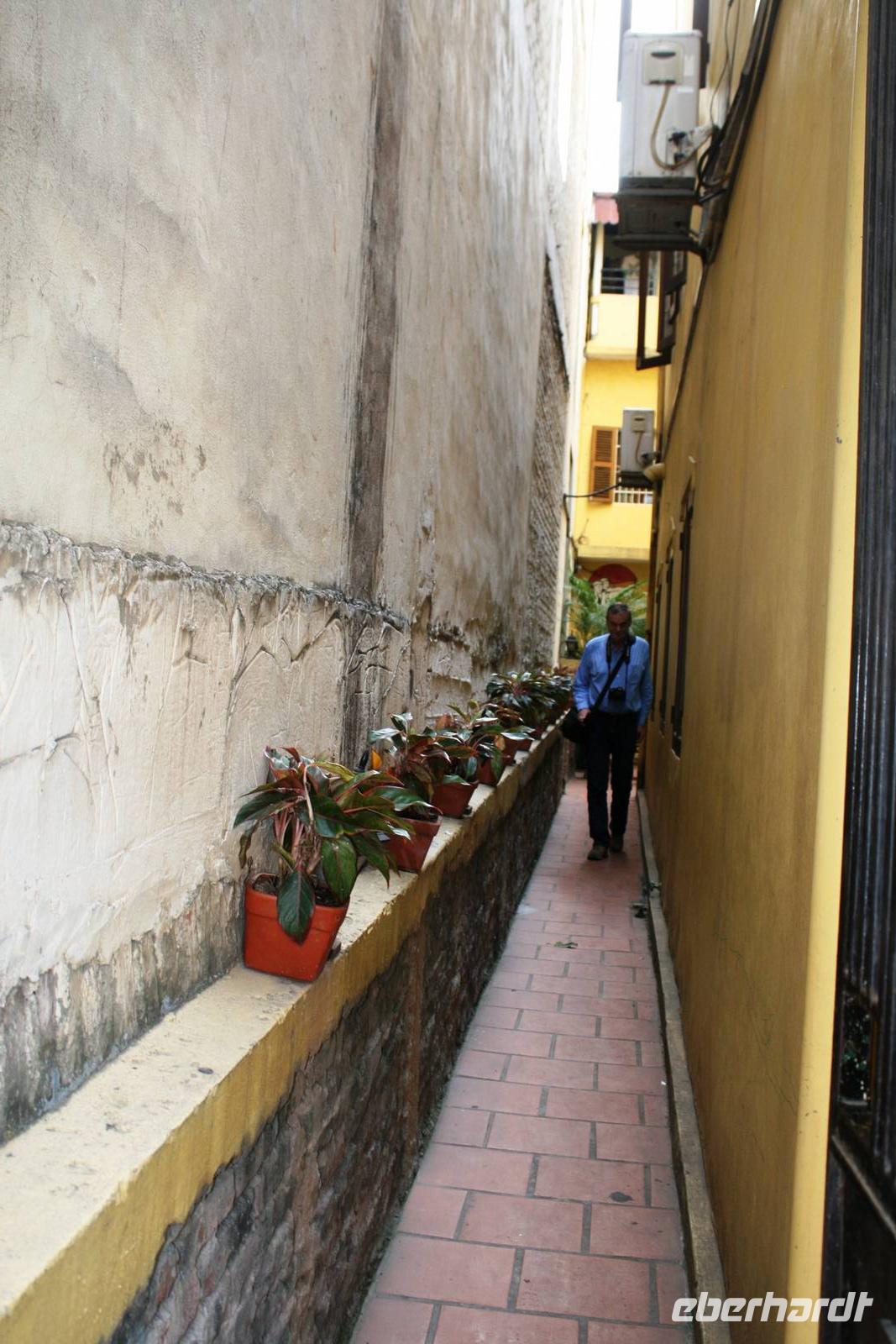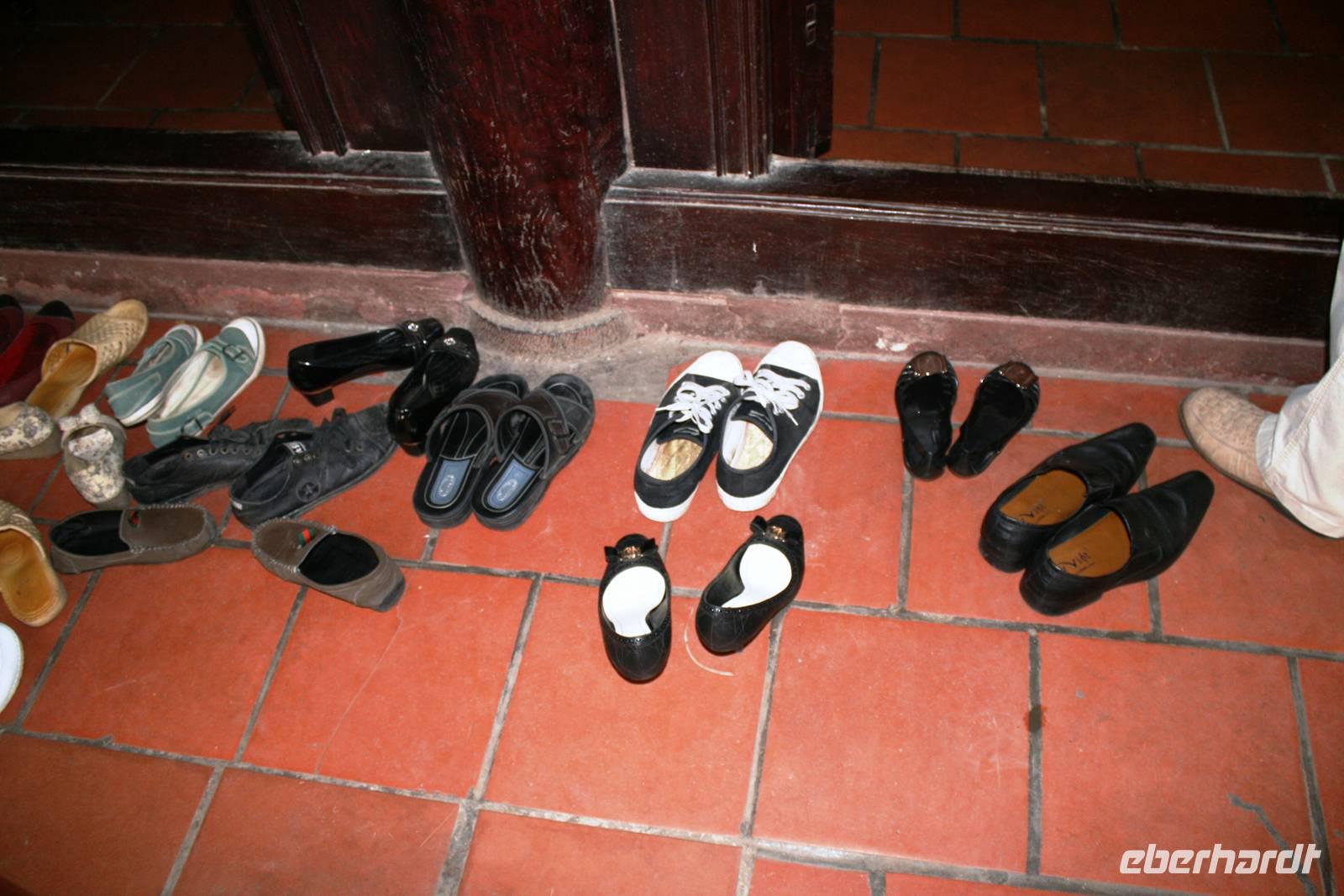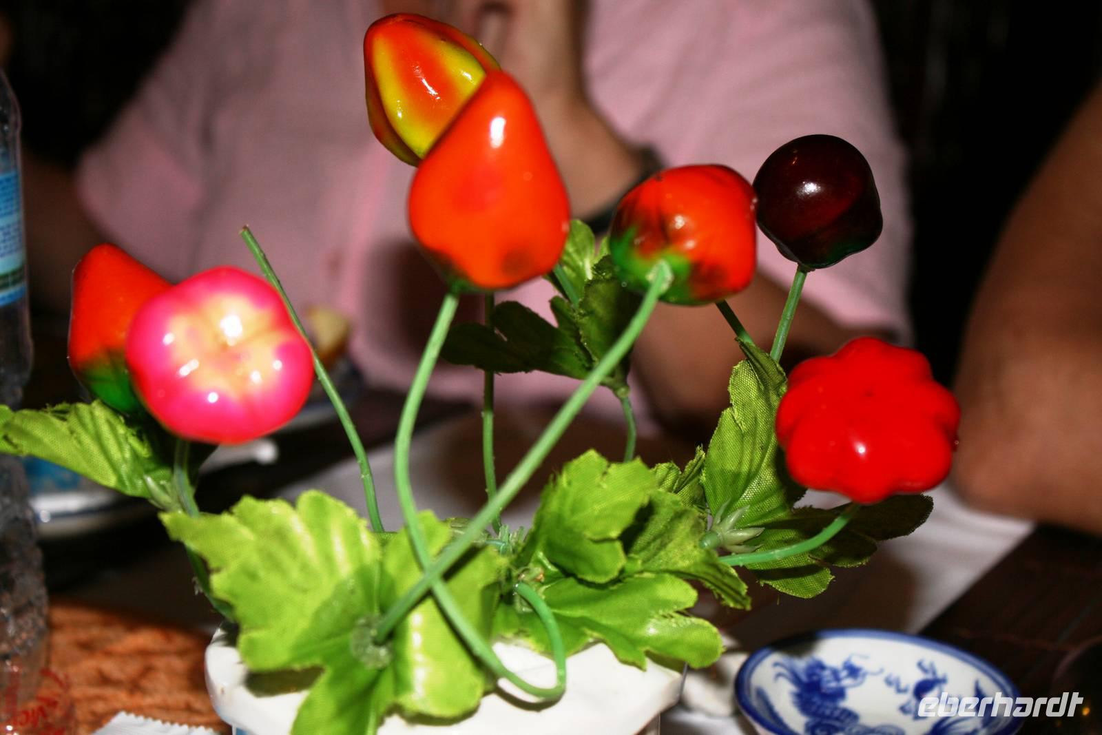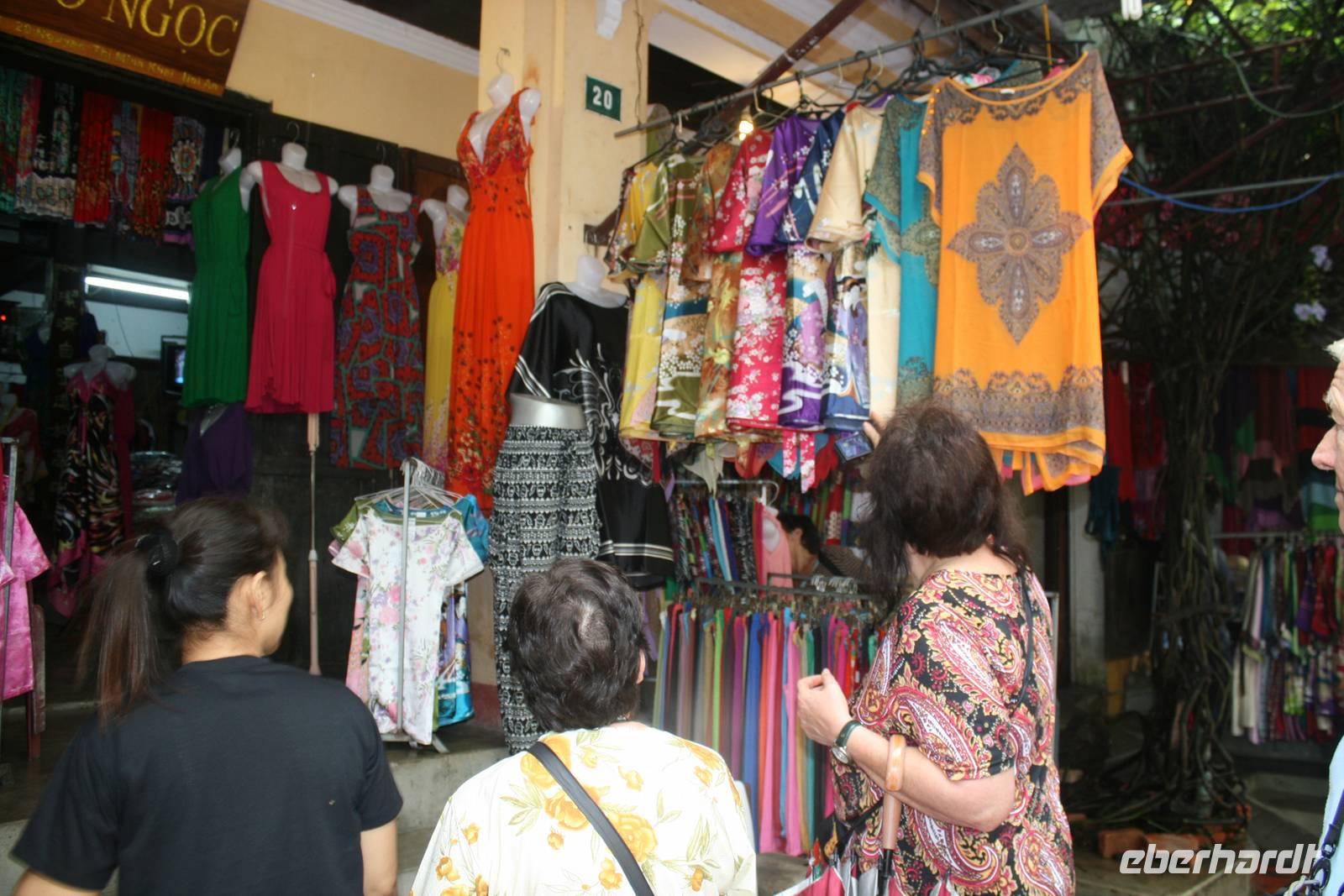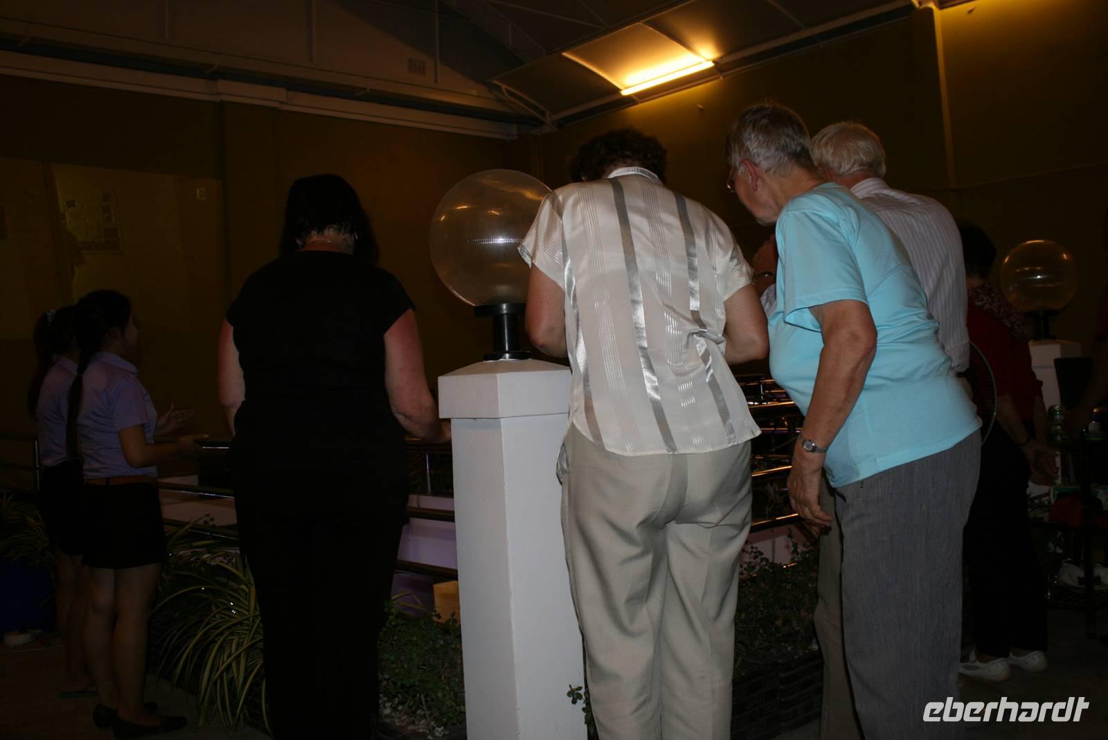 Nach Sonnenaufgang nahmen wir ein kleines Frühstückchen ein und unsere Dschunkenfahrt ging weiter. Später fuhren wir mit dem Tender in die Luang-Bucht und stiegen auf Ruderboote um. Nur ein kleiner Durchbruch in der umschließenden Felswand war unsere Einfahrt in die Lagune: Natur pur mit grünbewachsenen Felsen, fremdartigen Geräuschen und putzigen Äffchen, die keine Scheu zeigten und sich begierig auf unsere Bananen stürzten. An diesem Morgen hatten sich die unzähligen Dschunken fein gemacht und ihre rostbraunen Segel aufgezogen. Zurück an Bord erwartete uns ein ausgiebiger Brunch, der nix zu wünschen übrig ließ. Die Sonne war hervor gekommen und so genossen wir die Rückfahrt an Deck. Faszinierend, wie im Laufe von Jahrmillionen diese landschaftliche Pracht entstand. Innerhalb geschützter Buchten sehen wir kleine, schwimmende Dörfer. Die Menschen leben das ganze Jahr hier und haben sich der Natur angepasst. Laut Onkel Ot gibt es 1996 Inseln in der Ha Long Bucht. Wir glauben ihm das mal, obwohl wir sie nicht gezählt haben. Viele Insel haben fantasievolle Namen, die sie nach ihren Formen erhalten haben. Wir haben auch noch passende Namensvorschläge. Am Mittag verabschiedeten wir uns von dieser beeindruckende Naturlandschaft und fuhren mit dem Bus nach Hanoi zurück. Unterwegs besichtigten wir eine Perlenzuchtstation und erfrischten uns bei fruchtigen Leckereien wie Ananas mit Chilisalz und Babybananen. Wir besuchten einen alten Friedhof, wo uns Ot über die Bestattungsrituale aufklärte und durchstöberten das ABC-Center nach Souveniren. Am Flughafen Hanoi verabschiedeten wir uns von Ot und checkten für den Flug nach Hue ein. Keiner ahnte zu diesem Zeitpunkt, dass wir uns noch an diesem Abend wiedersehen. Später im Sicherheitsbereich, wir warteten bereits auf das Boarding, ereilte uns die Nachricht, dass alle Flüge von und nach Hue wegen Sturm gecancelt waren. Also Ot und Bus wieder an den Flughafen bestellt und Koffer geholt. In der Zwischenzeit hatte sich unsere Agentur um ein neues Hotel gekümmert, so dass wir die Nacht nicht auf dem Flughafen verbringen mußten. Ot und Annett bemühten sich unterdessen bei Vietnam Airlines, um verbindliche Infos für den Flug am nächsten Tag, doch mehr als Warteliste war nicht drin. In Stand By Position fuhren wir zum Hotel nach Hanoi und checkten 21 Uhr schnell ein. Anschließend ging fast die gesamte Gruppe noch aus! Im benachbarten Restaurant liessen wir den Tag bei Pasta ausklingen und Eberhardt spendierte Freigetränke.