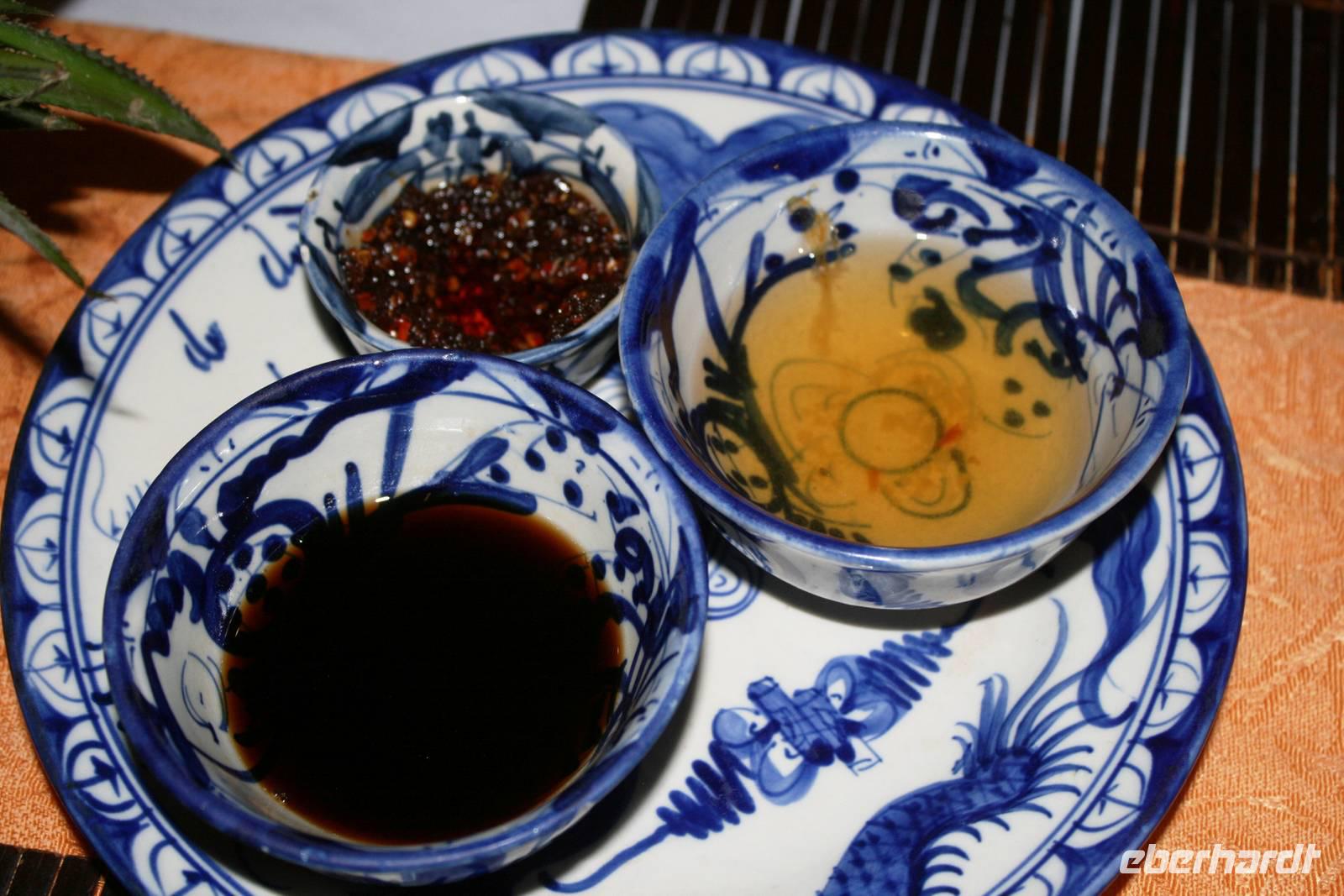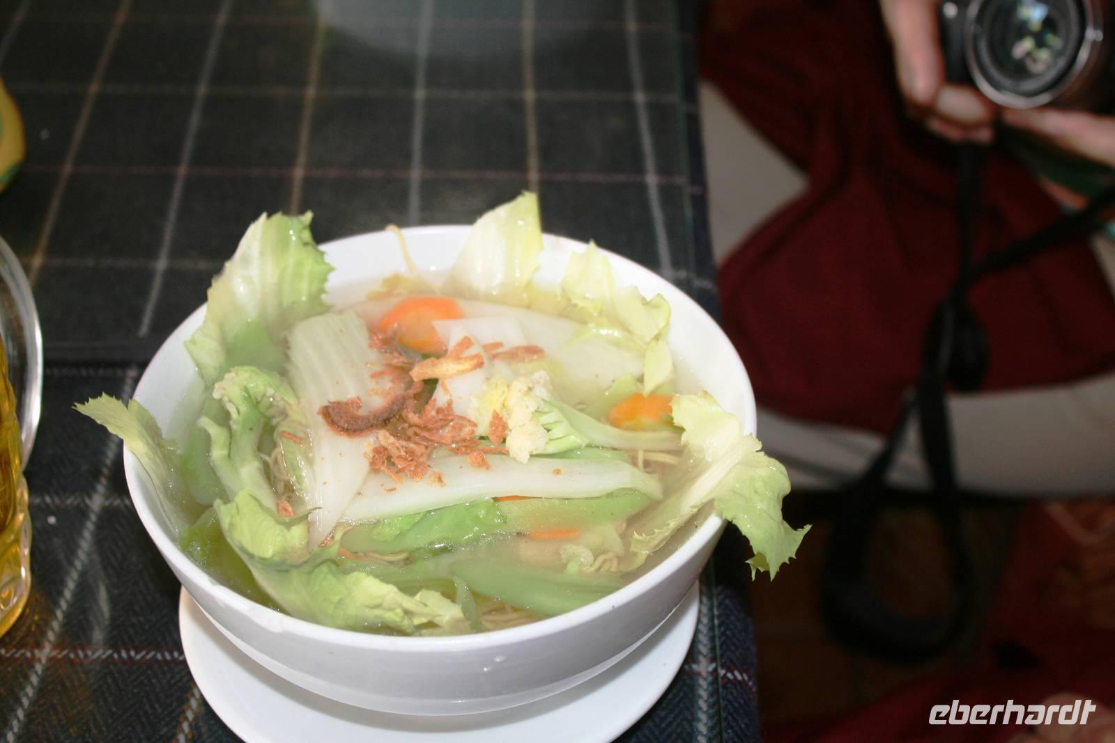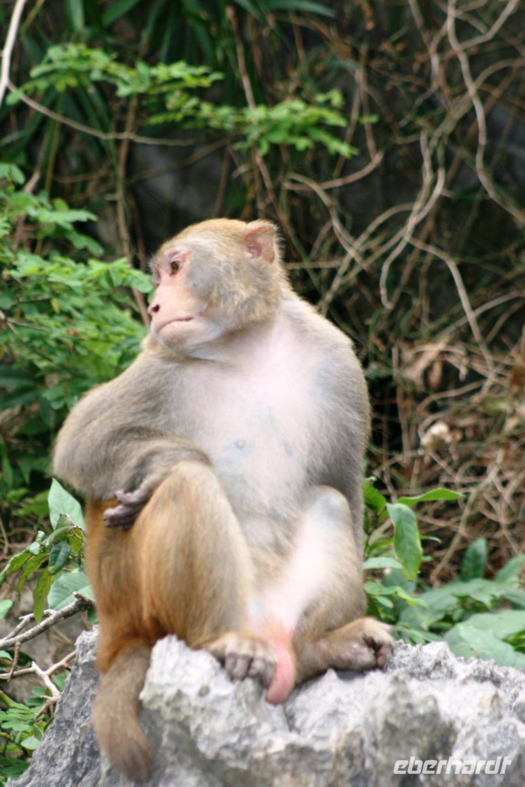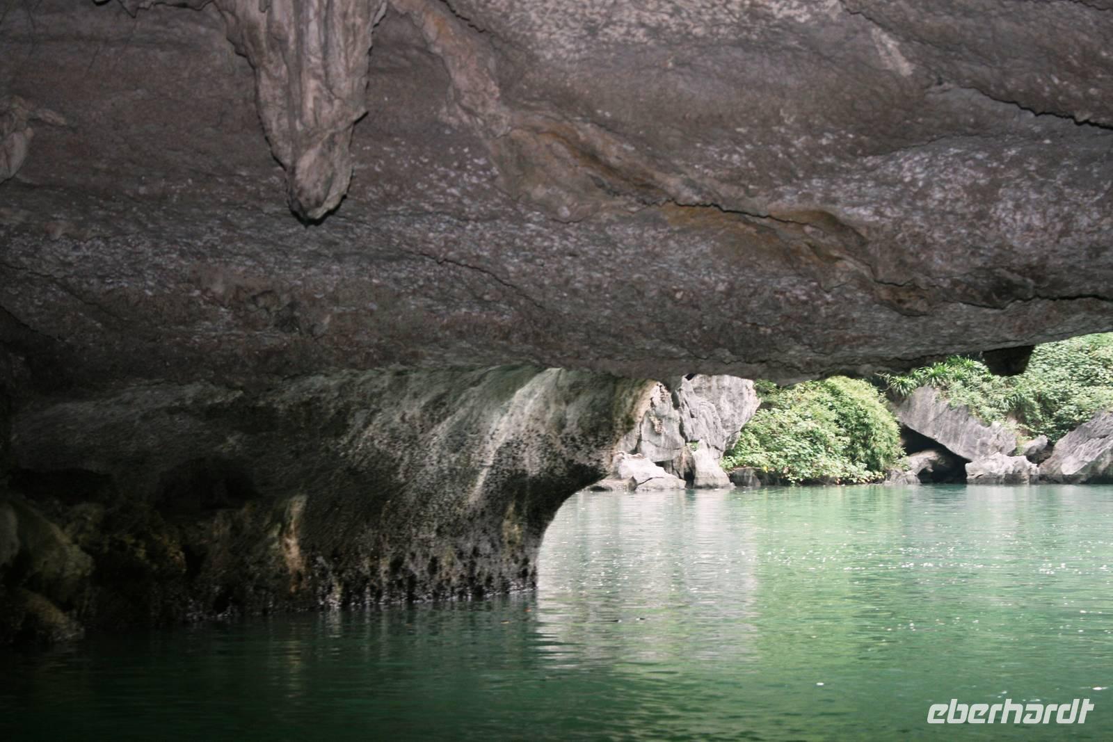Nach Sonnenaufgang nahmen wir ein kleines Frühstückchen ein und unsere Dschunkenfahrt ging weiter. Später fuhren wir mit dem Tender in die Luang-Bucht und stiegen auf Ruderboote um. Nur ein kleiner Durchbruch in der umschließenden Felswand war unsere Einfahrt in die Lagune: Natur pur mit grünbewachsenen Felsen, fremdartigen Geräuschen und putzigen Äffchen, die keine Scheu zeigten und sich begierig auf unsere Bananen stürzten. An diesem Morgen hatten sich die unzähligen Dschunken fein gemacht und ihre rostbraunen Segel aufgezogen. Zurück an Bord erwartete uns ein ausgiebiger Brunch, der nix zu wünschen übrig ließ. Die Sonne war hervor gekommen und so genossen wir die Rückfahrt an Deck. Faszinierend, wie im Laufe von Jahrmillionen diese landschaftliche Pracht entstand. Innerhalb geschützter Buchten sehen wir kleine, schwimmende Dörfer. Die Menschen leben das ganze Jahr hier und haben sich der Natur angepasst. Laut Onkel Ot gibt es 1996 Inseln in der Ha Long Bucht. Wir glauben ihm das mal, obwohl wir sie nicht gezählt haben. Viele Insel haben fantasievolle Namen, die sie nach ihren Formen erhalten haben. Wir haben auch noch passende Namensvorschläge. Am Mittag verabschiedeten wir uns von dieser beeindruckende Naturlandschaft und fuhren mit dem Bus nach Hanoi zurück. Unterwegs besichtigten wir eine Perlenzuchtstation und erfrischten uns bei fruchtigen Leckereien wie Ananas mit Chilisalz und Babybananen. Wir besuchten einen alten Friedhof, wo uns Ot über die Bestattungsrituale aufklärte und durchstöberten das ABC-Center nach Souveniren. Am Flughafen Hanoi verabschiedeten wir uns von Ot und checkten für den Flug nach Hue ein. Keiner ahnte zu diesem Zeitpunkt, dass wir uns noch an diesem Abend wiedersehen. Später im Sicherheitsbereich, wir warteten bereits auf das Boarding, ereilte uns die Nachricht, dass alle Flüge von und nach Hue wegen Sturm gecancelt waren. Also Ot und Bus wieder an den Flughafen bestellt und Koffer geholt. In der Zwischenzeit hatte sich unsere Agentur um ein neues Hotel gekümmert, so dass wir die Nacht nicht auf dem Flughafen verbringen mußten. Ot und Annett bemühten sich unterdessen bei Vietnam Airlines, um verbindliche Infos für den Flug am nächsten Tag, doch mehr als Warteliste war nicht drin. In Stand By Position fuhren wir zum Hotel nach Hanoi und checkten 21 Uhr schnell ein. Anschließend ging fast die gesamte Gruppe noch aus! Im benachbarten Restaurant liessen wir den Tag bei Pasta ausklingen und Eberhardt spendierte Freigetränke.