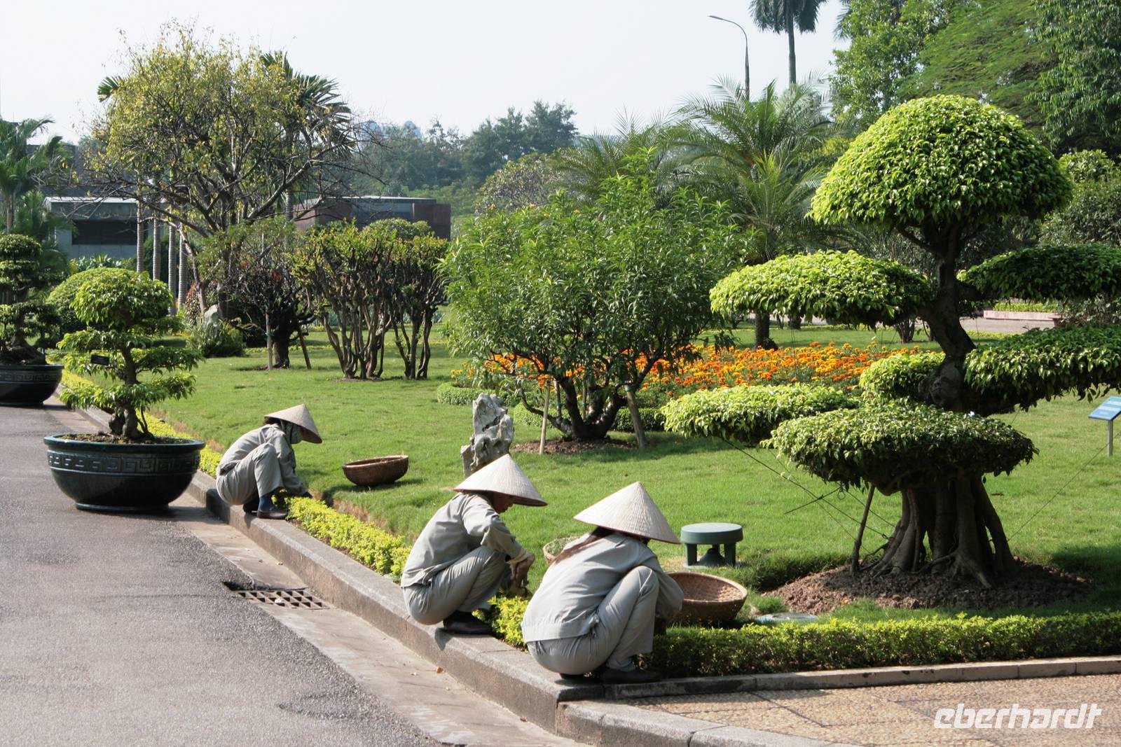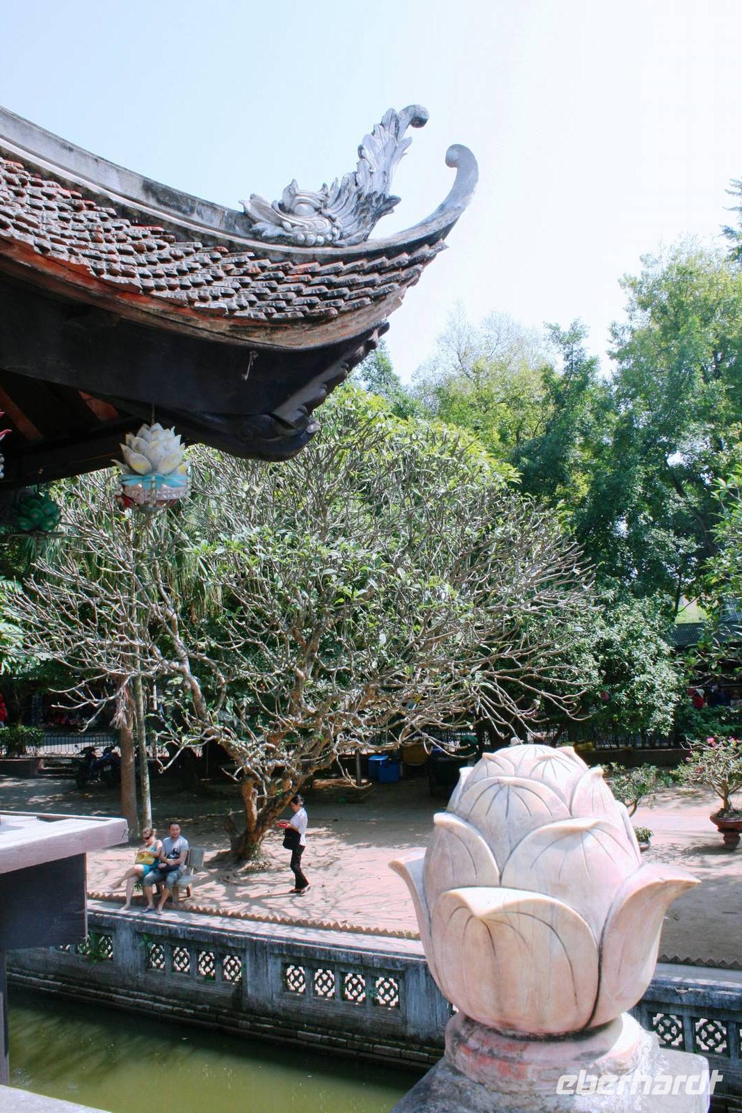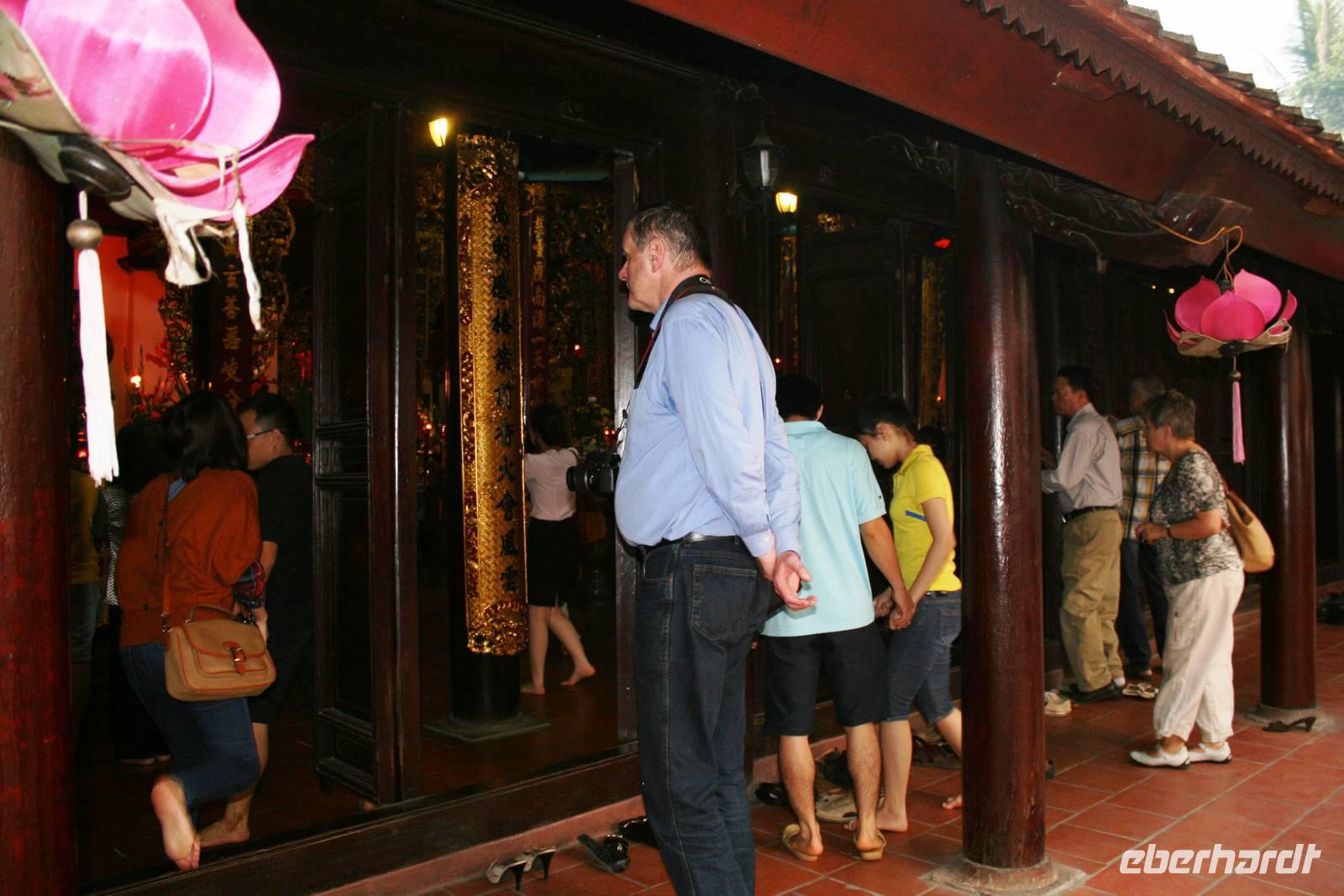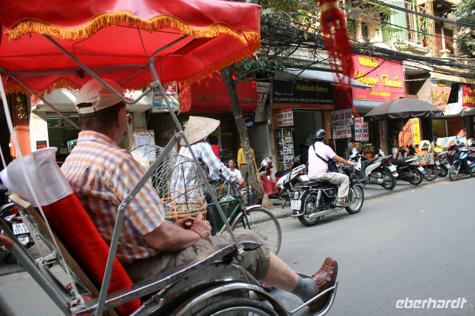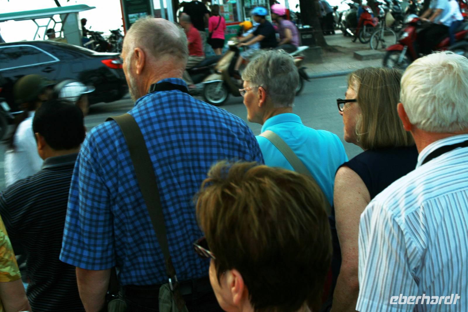 Mit einem reichhaltigem Frühstück waren wir gestärkt, um die alte und neue Hauptstadt Vietnams näher kennenzulernen. Bevor wir in den Bus stiegen, erprobten sich einige Gäste im Kurs "Mornig Business" und erhandelten preiswerte Souvenire. Nun konnte es endlich losgehen: Hanoi, wir kommen! Zunächst beobachteten wir vom Bus das lebhafte Treiben auf den Strassen von Hanoi und bewunderten unseren Busfahrer, der uns sicher durch das asiatische Strassenchaos chauffierte. Gefühlte 1.000 Mopeds, teilweise mit 5 Mitfahrern und prall bepackt mit Allerlei fuhren an uns vorbei, in den Garküchen am Straßenrand wurde gefrühstückt und auf den vielen Märkten eifrig gefeilscht. Das Wirrwarr der unzähligen Stromkabel gab uns Rätsel auf. Wie man in den schmalen, nach oben schießenden Röhrenhäuser, die an den Seiten keine Fenster haben, leben kann, war uns ebenso fremd. Lustig fanden wir die Freiluft Frisöre, die in den Morgendstunden auf Kundschaft warteten. Am Ho Chi Minh Mausoleum stiegen wir aus und gingen zu Fuß weiter. Wir spazierten durch den Park des Präsidentenpalast zum Pfahlhaus von Onkel Ho. Im Garten vor dem Haus entdeckten wir Pomelos, die wie dicke "Klopse" an zierlichen Bäumen wuchsen. Unweit befindet sich die Ein-Säulen-Pagode, die wir besichtigten. Sie gehört zu den meistbesuchten Sakralbauten Hanois. Der Legende nach soll im Traum einem kinderlosen König die Göttin der Barmherzigheit erschienen sein und ihm auf einer Lotosblüte sitzend einen Sohn überreicht haben. Kurze Zeit später wurde der König wirklich Vater eines Sohnes und aus Dankbarkeit errichtete er die Pagode in Form einer Lotusblüte. Auch heute noch pilgern viele Buddhisten zur Pagode und opfern der Göttin, damit sich ihr Kinderwunsch erfüllt. Legenden und Sagen werden uns auf dieser Reise weiter begleiten, denn sie sind untrennbar mit der Geschichte verbunden. Weiter ging es zur Van Mieu-Pagode, dem Literaturtempel, der zu Ehren des Philosophen Konfuzius errichtet wurde. Die wunderschöne Anlage ist nicht nur das konfuzianische Hauptheiligtum, sondern auch erste Universität Vietnams. Onkel Ot erzählte uns Interessantes über den Literaturtempel und dessen Geschichte. Wir erfuhren, dass Schildkröten als ein Symbol für langes Leben und Kraft gelten. So ist es nicht verwunderlich, dass wir hier viele herausgeputzte, gut gelaunte Studenten und Schüler antrafen, die ihren erfolgreichen Abschluss traditionell feierten. Anschließend mußten wir unsere vielen Eindrücke erst mal verarbeiten und pausierten in einem kleinem Restaurant, wo wir freundlich bedient wurden und lecker zu Mittag assen. Das Restaurant ist gleichzeitig Schule und Bildungsprojekt, wo Mädchen aus ärmeren Familien eine Ausbildung erhalten. Dass dies für die Mädchen eine besondere Ehre und keine Selbstverständlichkeit ist, spürten wir an der Herzlichkeit sofort. Anschließend fuhren wir ins Zentrum zurück. Hier unternahmen wir eine spannende Rikschafahrt durch die Gassen der Altstadt. Am Anfang waren wir nicht ganz entspannt, da Busse, Mopeds und vollbeladene Fahrräder unsere Wege kreuzten, aber noch einigen Minuten hatten wir uns daran gewöhnt und genoßen die Fahrt. Unser nächstes Ziel war der Hoan Kiem See (Schwertsee). Die Sage von der goldenen Schildkröte mit dem Schwert, die auch heute noch im See wohnen soll, kennt jeder Vietnamese und nun auch wir. Über eine kleine, rote Holzbrücke gelangten wir zum Jadebergtempel, der sich auf einer kleinen Insel im Schwertsee befindet. Danach besuchten wir eine Aufführung des zentralen Wasserpuppentheaters, welches in Vietnam eine uralte Tradition hat. Dargestellt wurden das bäuerliche Leben und Götterlegenden, wobei die studierten Akteure, welche die hölzernen, bis zu 5 kg schweren Puppen steuern, die ganze Zeit bis zu den Hüften im Wasser stehen mußten. Den Tag beschloß ein schmackhaftes Abendessen im Garten des Restaurant Le Tonkin und der obligatorische Reisschnaps.
