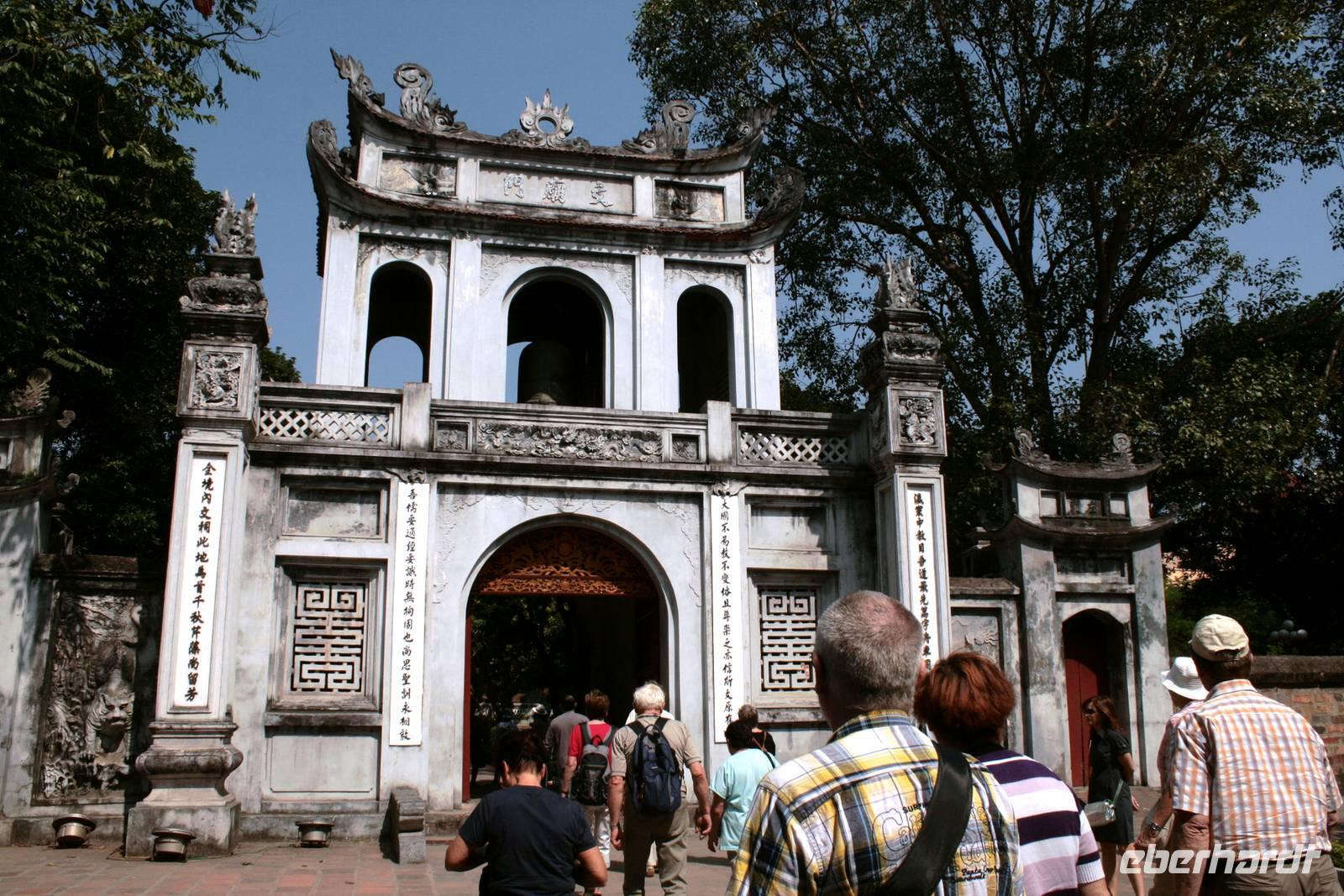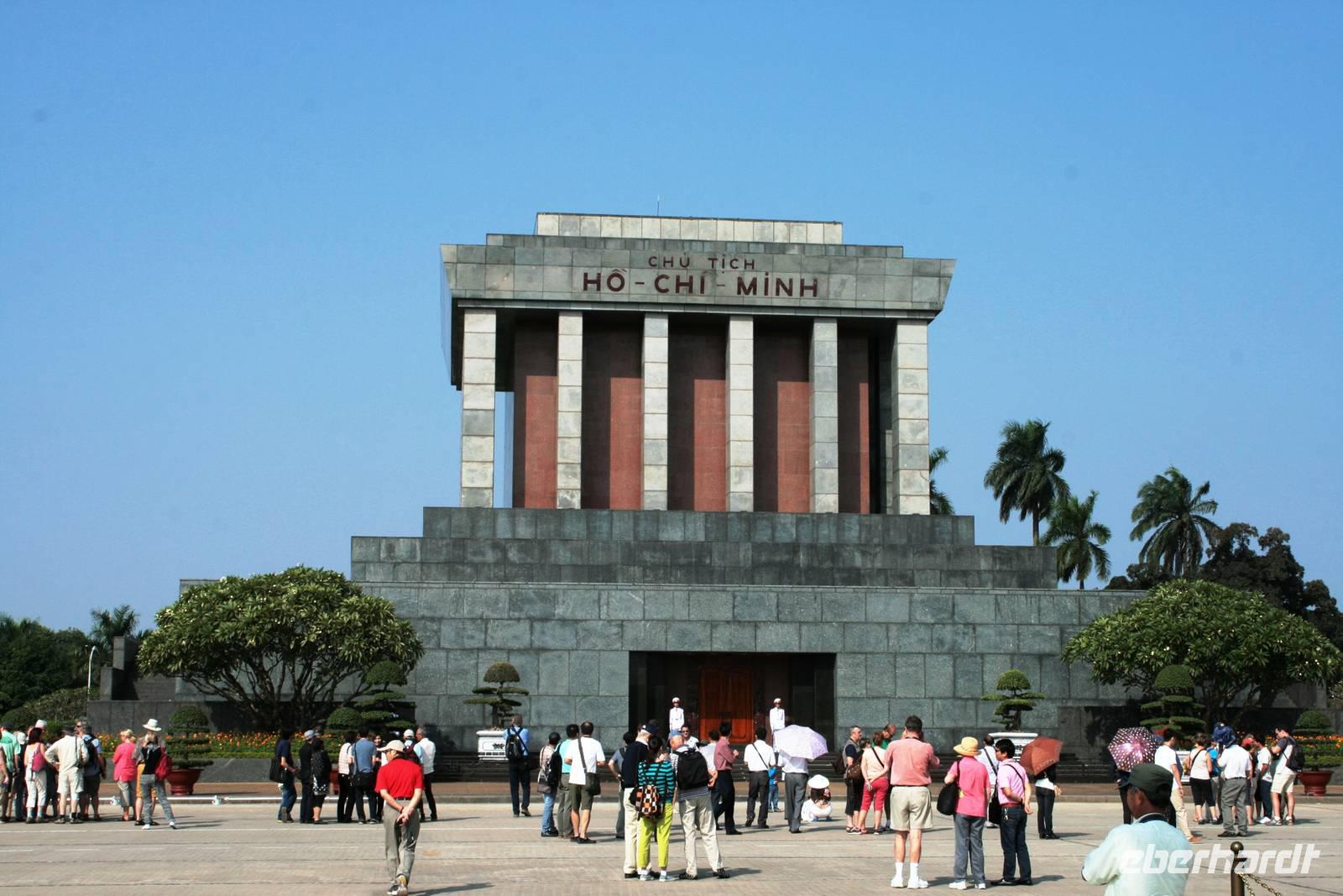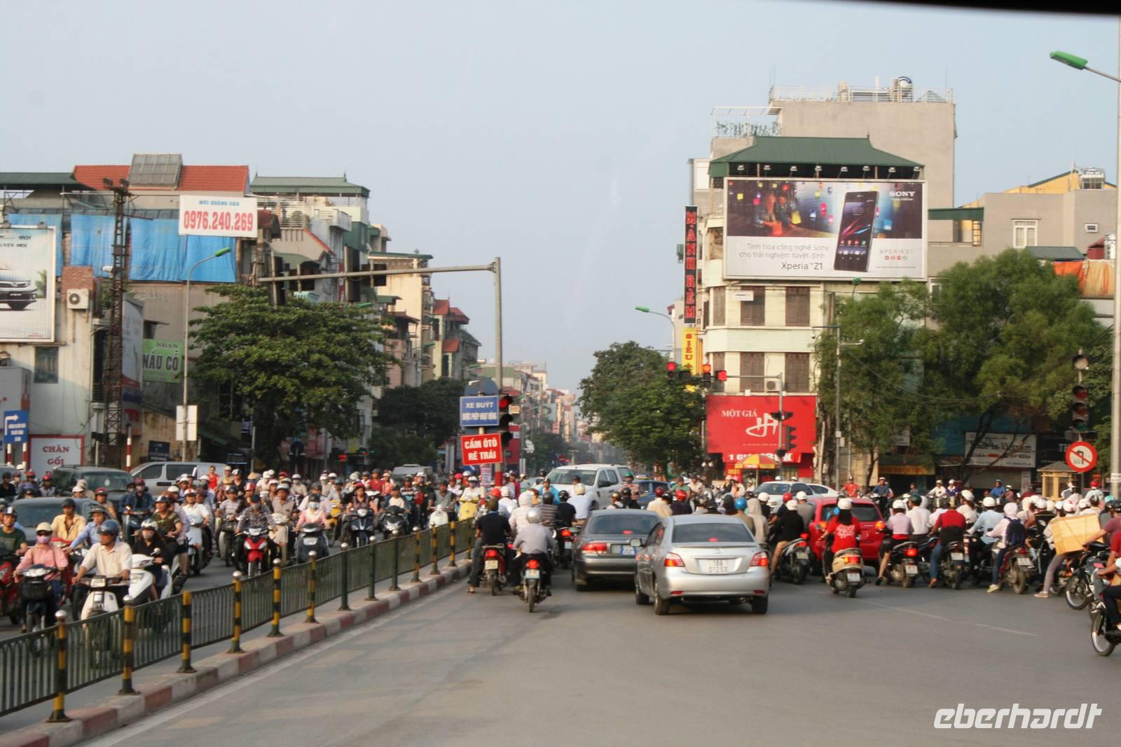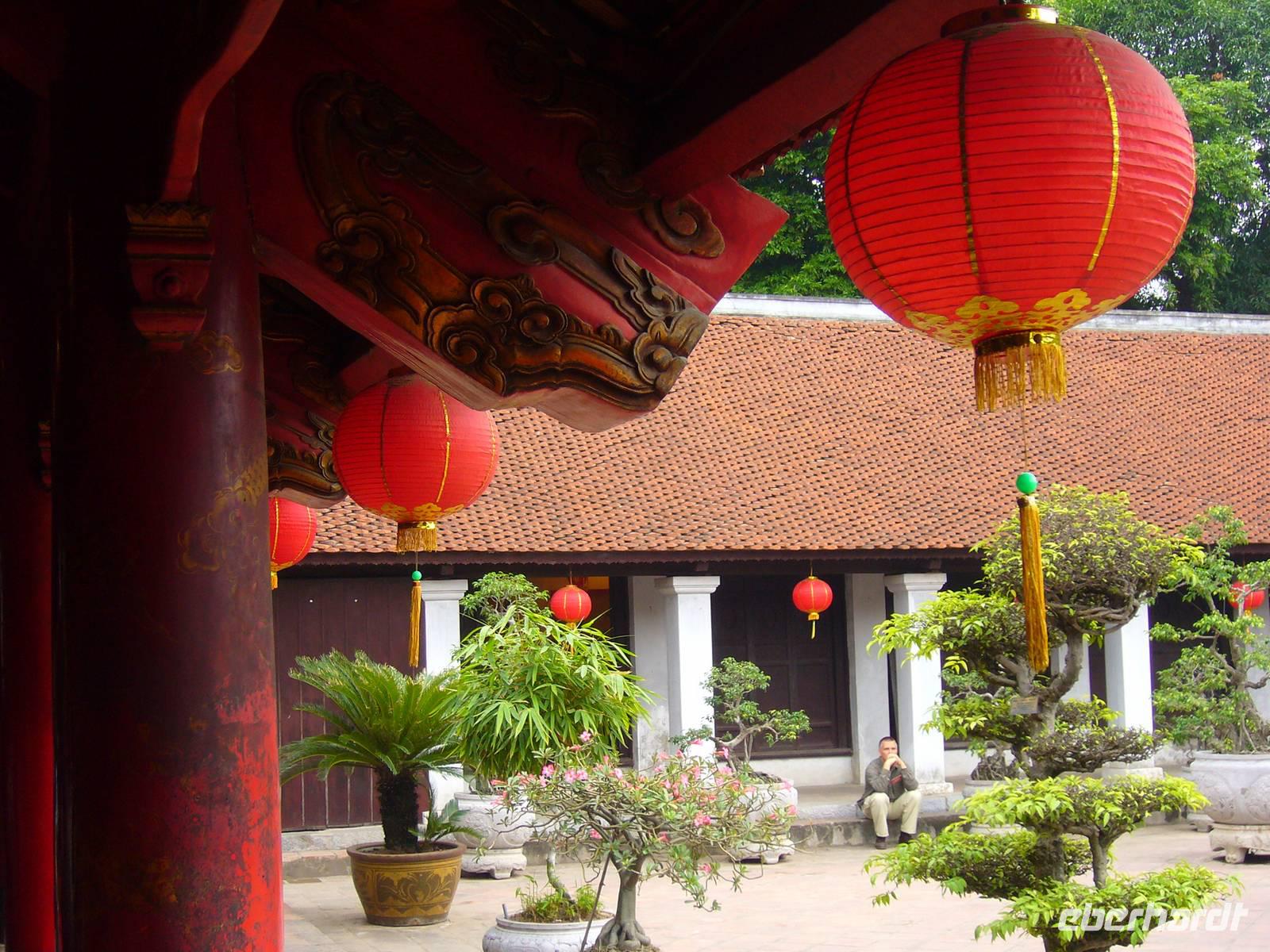 Mit einem reichhaltigem Frühstück waren wir gestärkt, um die alte und neue Hauptstadt Vietnams näher kennenzulernen. Bevor wir in den Bus stiegen, erprobten sich einige Gäste im Kurs "Mornig Business" und erhandelten preiswerte Souvenire. Nun konnte es endlich losgehen: Hanoi, wir kommen! Zunächst beobachteten wir vom Bus das lebhafte Treiben auf den Strassen von Hanoi und bewunderten unseren Busfahrer, der uns sicher durch das asiatische Strassenchaos chauffierte. Gefühlte 1.000 Mopeds, teilweise mit 5 Mitfahrern und prall bepackt mit Allerlei fuhren an uns vorbei, in den Garküchen am Straßenrand wurde gefrühstückt und auf den vielen Märkten eifrig gefeilscht. Das Wirrwarr der unzähligen Stromkabel gab uns Rätsel auf. Wie man in den schmalen, nach oben schießenden Röhrenhäuser, die an den Seiten keine Fenster haben, leben kann, war uns ebenso fremd. Lustig fanden wir die Freiluft Frisöre, die in den Morgendstunden auf Kundschaft warteten. Am Ho Chi Minh Mausoleum stiegen wir aus und gingen zu Fuß weiter. Wir spazierten durch den Park des Präsidentenpalast zum Pfahlhaus von Onkel Ho. Im Garten vor dem Haus entdeckten wir Pomelos, die wie dicke "Klopse" an zierlichen Bäumen wuchsen. Unweit befindet sich die Ein-Säulen-Pagode, die wir besichtigten. Sie gehört zu den meistbesuchten Sakralbauten Hanois. Der Legende nach soll im Traum einem kinderlosen König die Göttin der Barmherzigheit erschienen sein und ihm auf einer Lotosblüte sitzend einen Sohn überreicht haben. Kurze Zeit später wurde der König wirklich Vater eines Sohnes und aus Dankbarkeit errichtete er die Pagode in Form einer Lotusblüte. Auch heute noch pilgern viele Buddhisten zur Pagode und opfern der Göttin, damit sich ihr Kinderwunsch erfüllt. Legenden und Sagen werden uns auf dieser Reise weiter begleiten, denn sie sind untrennbar mit der Geschichte verbunden. Weiter ging es zur Van Mieu-Pagode, dem Literaturtempel, der zu Ehren des Philosophen Konfuzius errichtet wurde. Die wunderschöne Anlage ist nicht nur das konfuzianische Hauptheiligtum, sondern auch erste Universität Vietnams. Onkel Ot erzählte uns Interessantes über den Literaturtempel und dessen Geschichte. Wir erfuhren, dass Schildkröten als ein Symbol für langes Leben und Kraft gelten. So ist es nicht verwunderlich, dass wir hier viele herausgeputzte, gut gelaunte Studenten und Schüler antrafen, die ihren erfolgreichen Abschluss traditionell feierten. Anschließend mußten wir unsere vielen Eindrücke erst mal verarbeiten und pausierten in einem kleinem Restaurant, wo wir freundlich bedient wurden und lecker zu Mittag assen. Das Restaurant ist gleichzeitig Schule und Bildungsprojekt, wo Mädchen aus ärmeren Familien eine Ausbildung erhalten. Dass dies für die Mädchen eine besondere Ehre und keine Selbstverständlichkeit ist, spürten wir an der Herzlichkeit sofort. Anschließend fuhren wir ins Zentrum zurück. Hier unternahmen wir eine spannende Rikschafahrt durch die Gassen der Altstadt. Am Anfang waren wir nicht ganz entspannt, da Busse, Mopeds und vollbeladene Fahrräder unsere Wege kreuzten, aber noch einigen Minuten hatten wir uns daran gewöhnt und genoßen die Fahrt. Unser nächstes Ziel war der Hoan Kiem See (Schwertsee). Die Sage von der goldenen Schildkröte mit dem Schwert, die auch heute noch im See wohnen soll, kennt jeder Vietnamese und nun auch wir. Über eine kleine, rote Holzbrücke gelangten wir zum Jadebergtempel, der sich auf einer kleinen Insel im Schwertsee befindet. Danach besuchten wir eine Aufführung des zentralen Wasserpuppentheaters, welches in Vietnam eine uralte Tradition hat. Dargestellt wurden das bäuerliche Leben und Götterlegenden, wobei die studierten Akteure, welche die hölzernen, bis zu 5 kg schweren Puppen steuern, die ganze Zeit bis zu den Hüften im Wasser stehen mußten. Den Tag beschloß ein schmackhaftes Abendessen im Garten des Restaurant Le Tonkin und der obligatorische Reisschnaps.