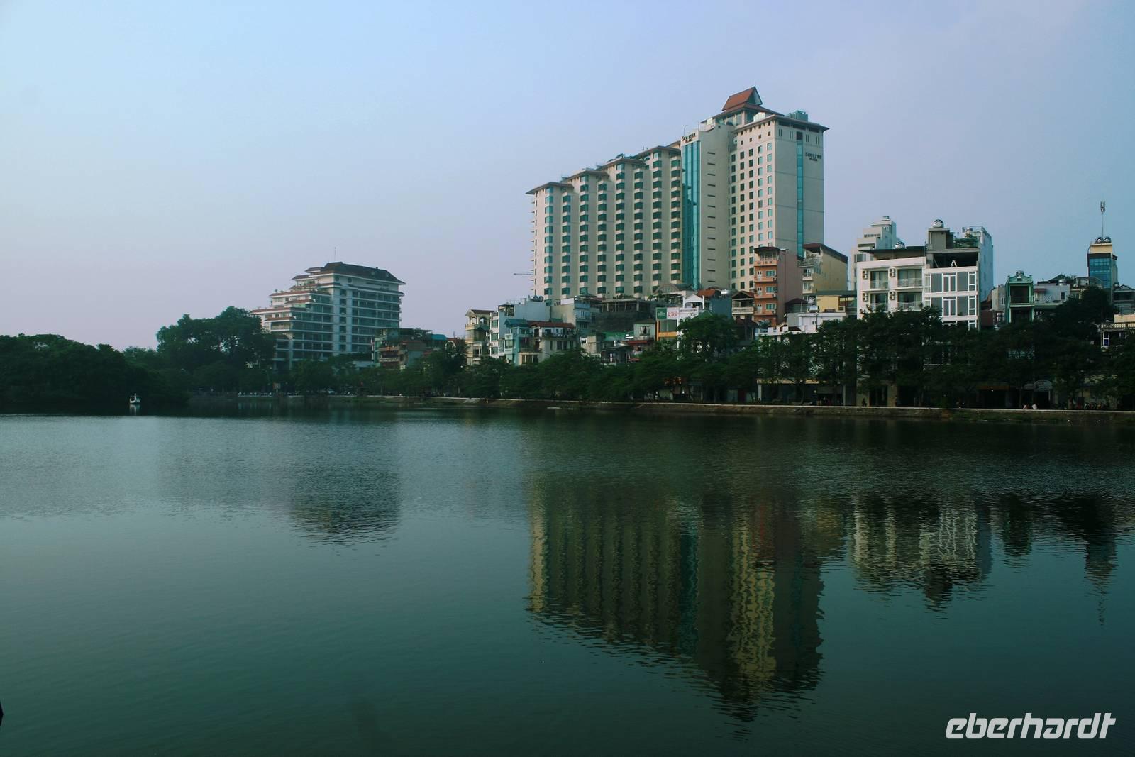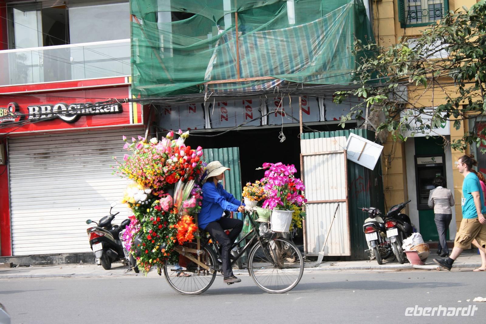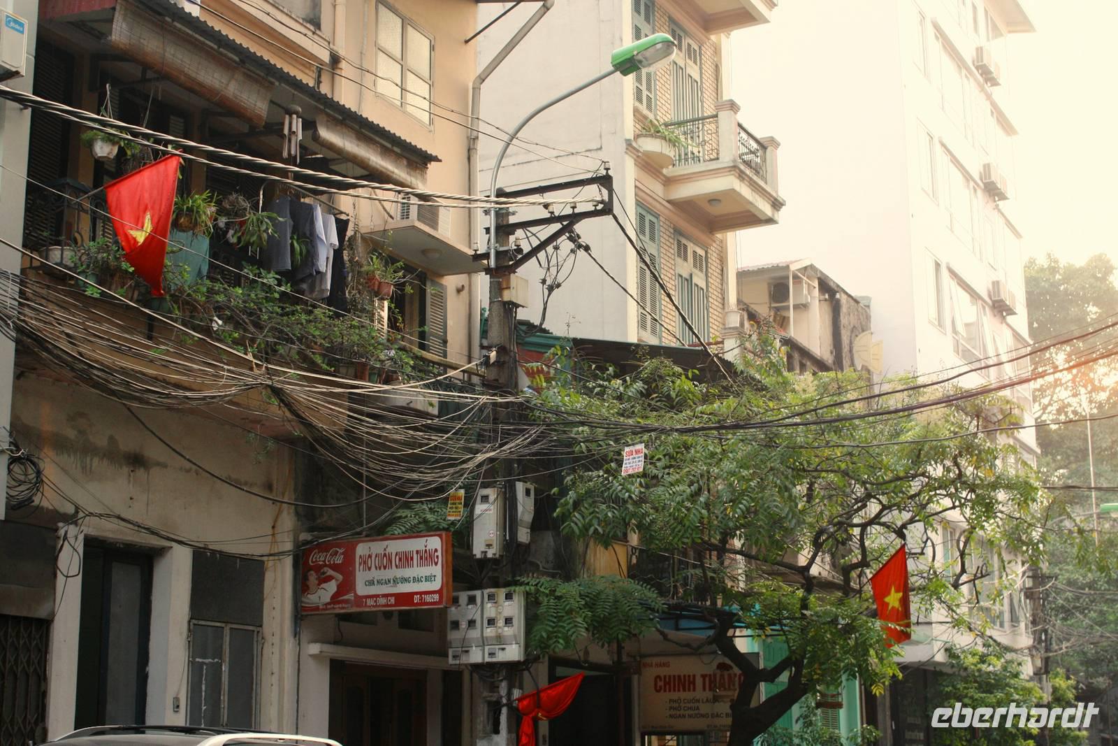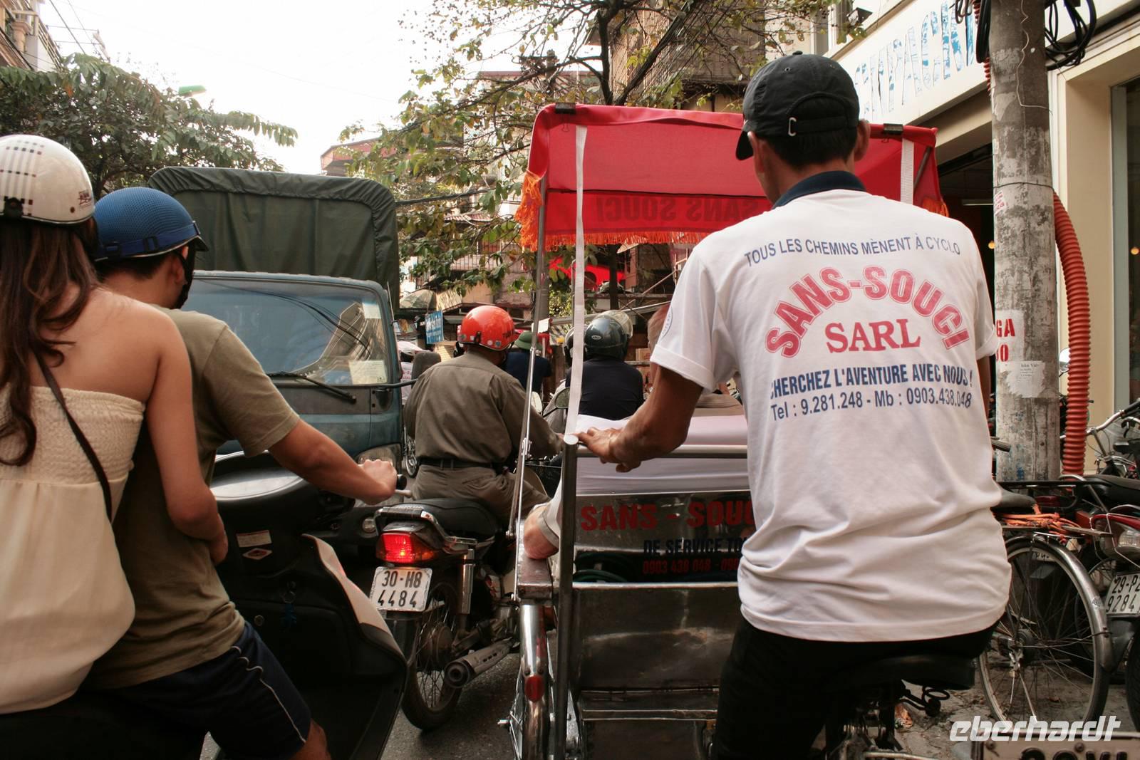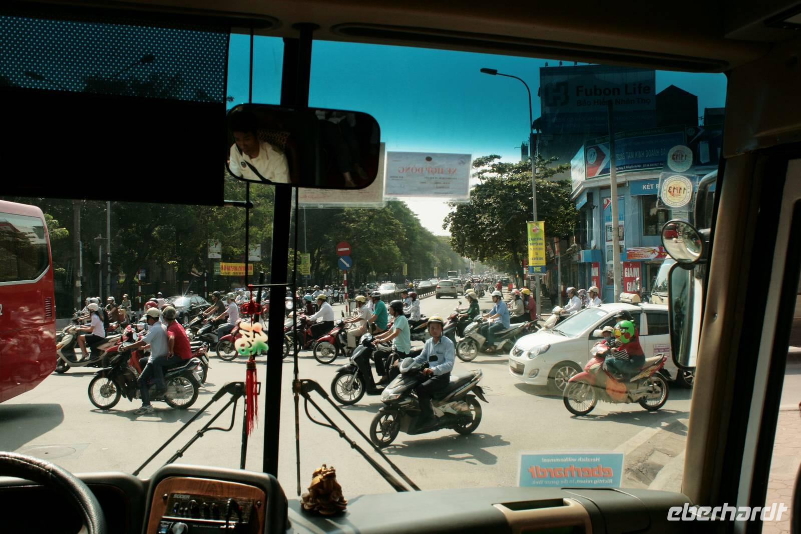 Mit einem reichhaltigem Frühstück waren wir gestärkt, um die alte und neue Hauptstadt Vietnams näher kennenzulernen. Bevor wir in den Bus stiegen, erprobten sich einige Gäste im Kurs "Mornig Business" und erhandelten preiswerte Souvenire. Nun konnte es endlich losgehen: Hanoi, wir kommen! Zunächst beobachteten wir vom Bus das lebhafte Treiben auf den Strassen von Hanoi und bewunderten unseren Busfahrer, der uns sicher durch das asiatische Strassenchaos chauffierte. Gefühlte 1.000 Mopeds, teilweise mit 5 Mitfahrern und prall bepackt mit Allerlei fuhren an uns vorbei, in den Garküchen am Straßenrand wurde gefrühstückt und auf den vielen Märkten eifrig gefeilscht. Das Wirrwarr der unzähligen Stromkabel gab uns Rätsel auf. Wie man in den schmalen, nach oben schießenden Röhrenhäuser, die an den Seiten keine Fenster haben, leben kann, war uns ebenso fremd. Lustig fanden wir die Freiluft Frisöre, die in den Morgendstunden auf Kundschaft warteten. Am Ho Chi Minh Mausoleum stiegen wir aus und gingen zu Fuß weiter. Wir spazierten durch den Park des Präsidentenpalast zum Pfahlhaus von Onkel Ho. Im Garten vor dem Haus entdeckten wir Pomelos, die wie dicke "Klopse" an zierlichen Bäumen wuchsen. Unweit befindet sich die Ein-Säulen-Pagode, die wir besichtigten. Sie gehört zu den meistbesuchten Sakralbauten Hanois. Der Legende nach soll im Traum einem kinderlosen König die Göttin der Barmherzigheit erschienen sein und ihm auf einer Lotosblüte sitzend einen Sohn überreicht haben. Kurze Zeit später wurde der König wirklich Vater eines Sohnes und aus Dankbarkeit errichtete er die Pagode in Form einer Lotusblüte. Auch heute noch pilgern viele Buddhisten zur Pagode und opfern der Göttin, damit sich ihr Kinderwunsch erfüllt. Legenden und Sagen werden uns auf dieser Reise weiter begleiten, denn sie sind untrennbar mit der Geschichte verbunden. Weiter ging es zur Van Mieu-Pagode, dem Literaturtempel, der zu Ehren des Philosophen Konfuzius errichtet wurde. Die wunderschöne Anlage ist nicht nur das konfuzianische Hauptheiligtum, sondern auch erste Universität Vietnams. Onkel Ot erzählte uns Interessantes über den Literaturtempel und dessen Geschichte. Wir erfuhren, dass Schildkröten als ein Symbol für langes Leben und Kraft gelten. So ist es nicht verwunderlich, dass wir hier viele herausgeputzte, gut gelaunte Studenten und Schüler antrafen, die ihren erfolgreichen Abschluss traditionell feierten. Anschließend mußten wir unsere vielen Eindrücke erst mal verarbeiten und pausierten in einem kleinem Restaurant, wo wir freundlich bedient wurden und lecker zu Mittag assen. Das Restaurant ist gleichzeitig Schule und Bildungsprojekt, wo Mädchen aus ärmeren Familien eine Ausbildung erhalten. Dass dies für die Mädchen eine besondere Ehre und keine Selbstverständlichkeit ist, spürten wir an der Herzlichkeit sofort. Anschließend fuhren wir ins Zentrum zurück. Hier unternahmen wir eine spannende Rikschafahrt durch die Gassen der Altstadt. Am Anfang waren wir nicht ganz entspannt, da Busse, Mopeds und vollbeladene Fahrräder unsere Wege kreuzten, aber noch einigen Minuten hatten wir uns daran gewöhnt und genoßen die Fahrt. Unser nächstes Ziel war der Hoan Kiem See (Schwertsee). Die Sage von der goldenen Schildkröte mit dem Schwert, die auch heute noch im See wohnen soll, kennt jeder Vietnamese und nun auch wir. Über eine kleine, rote Holzbrücke gelangten wir zum Jadebergtempel, der sich auf einer kleinen Insel im Schwertsee befindet. Danach besuchten wir eine Aufführung des zentralen Wasserpuppentheaters, welches in Vietnam eine uralte Tradition hat. Dargestellt wurden das bäuerliche Leben und Götterlegenden, wobei die studierten Akteure, welche die hölzernen, bis zu 5 kg schweren Puppen steuern, die ganze Zeit bis zu den Hüften im Wasser stehen mußten. Den Tag beschloß ein schmackhaftes Abendessen im Garten des Restaurant Le Tonkin und der obligatorische Reisschnaps.