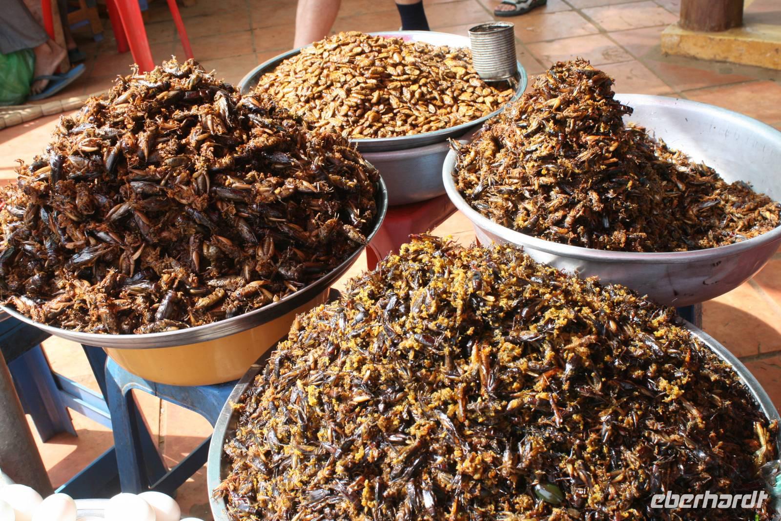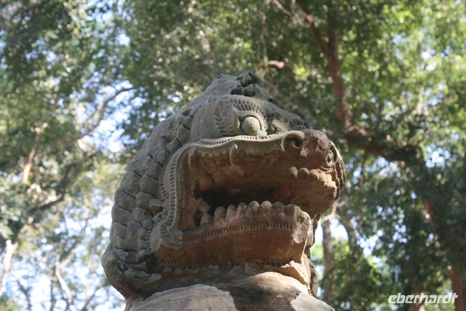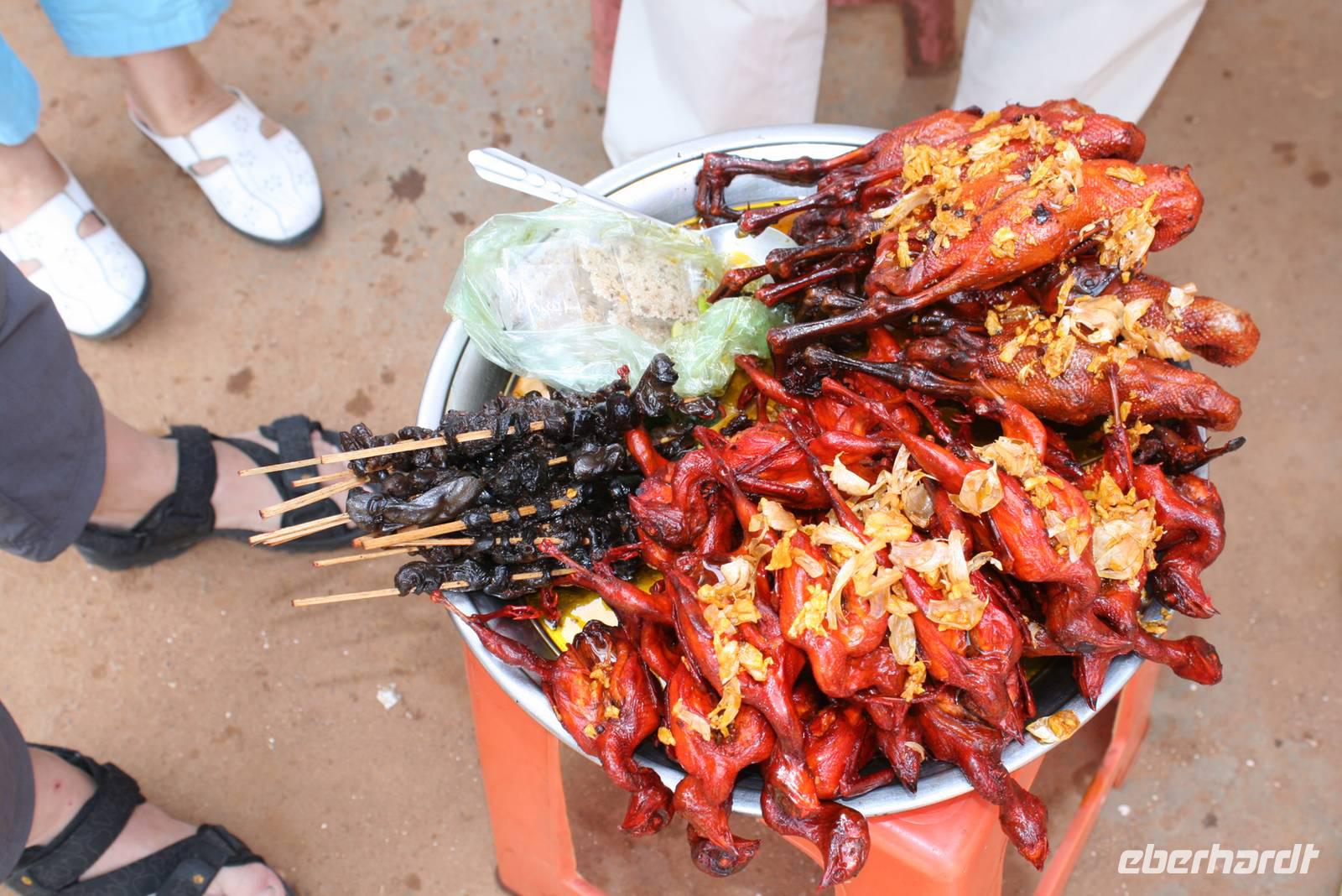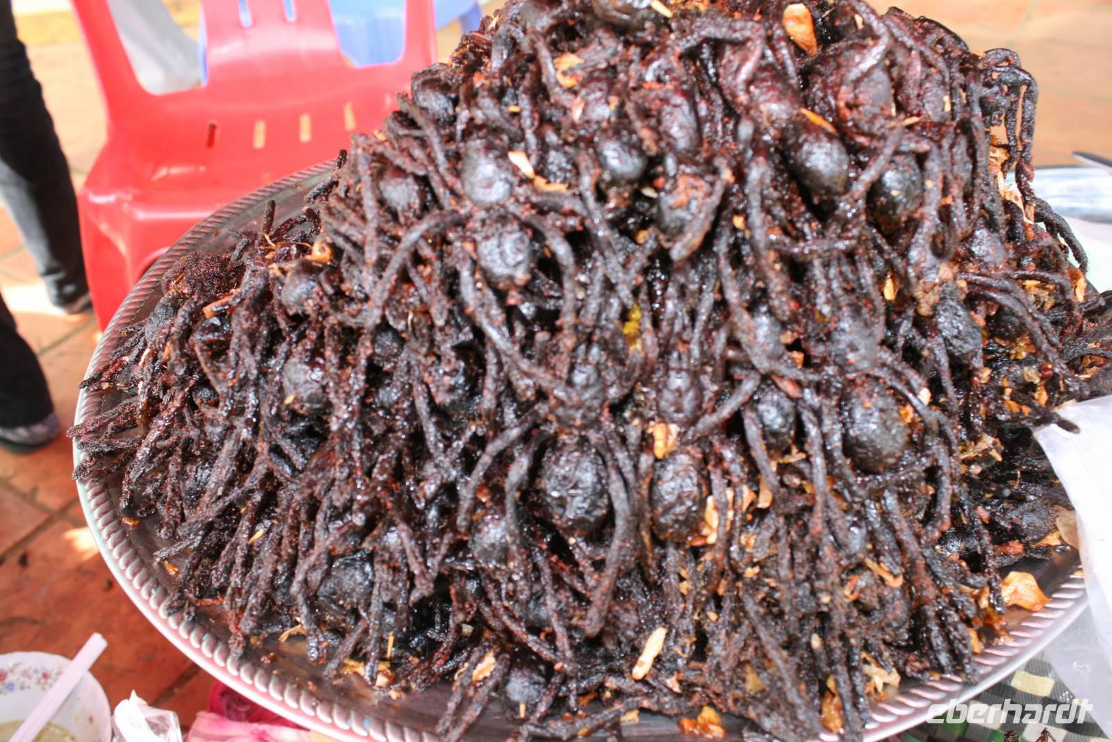 Heute verliessen wir die Hauptstadt Kambodschas und wurden von unserem neuen Guide Minh Thol begrüßt. Über 300 km lagen vor uns, doch uns wurde nicht langweilig. Während der Busfahrt erzählte uns Minh Thol viel Interessantes und Wissenswertes über Land und Leute. Bei Skone besuchten wir den bekannten Spinnenmarkt, wo diverse fritierte oder gebratene Krabbeltiere feil geboten bekam. Ungewöhnlich für unsere Augen und noch ungewöhnlicher für unsere Gaumen. Doch die Neugier war stärker! Mutig, mutig: einige Gäste liessen sich von einer lebendigen Spinne bekrabbeln und andere probierten krosse Spinnenbeine. Eine besondere Erfahrung und es schmeckte nicht mal schlecht. Die acht Spinnenbeine teilten wir brüderlich und desinfizierten anschließend unsere Mägen mit Mekong Whisky. Unterwegs stoppen wir noch mehrere Male und hatten so die Gelegenheit, eine kleine Dorfgemeinschaft zu besuchen und auch bei den Steinmetzen in Santouk vorbeizuschauen. Später erhielten wir einen ersten Eindruck vom Riesenreich Angkor, als wir die ca. 700 Jahre alte Naga Brücke zu Fuß überquerten. Unser Bus durfte nicht hinüber, sondern mußte einen kleinen Umweg fahren und nahm uns am anderen Ende wieder auf. Am Abend erreichten wir Siem Reap. Bevor wir im Hotel eincheckten, fuhren wir gleich zum Abendessen. Nach diesem erlebnisreichen Tag fielen wir in unsere Betten und freuten uns auf morgen.