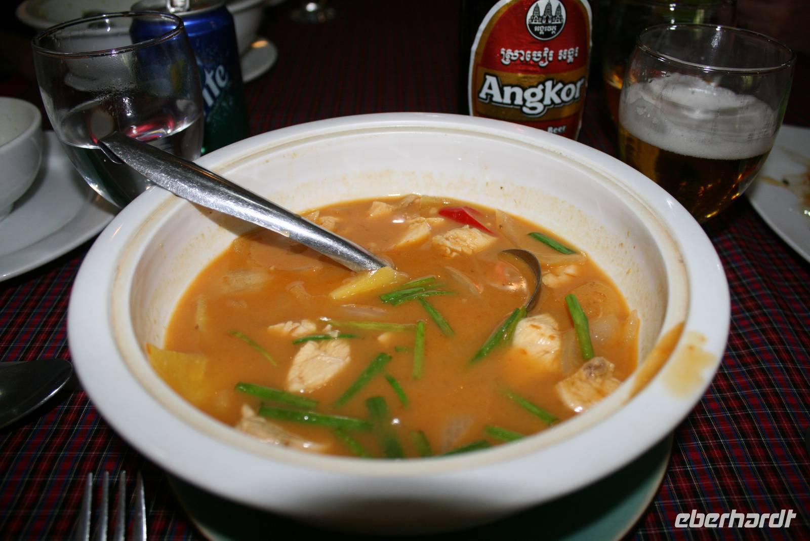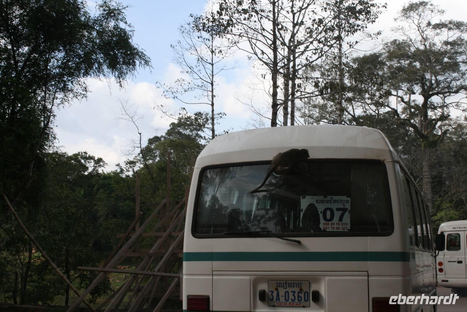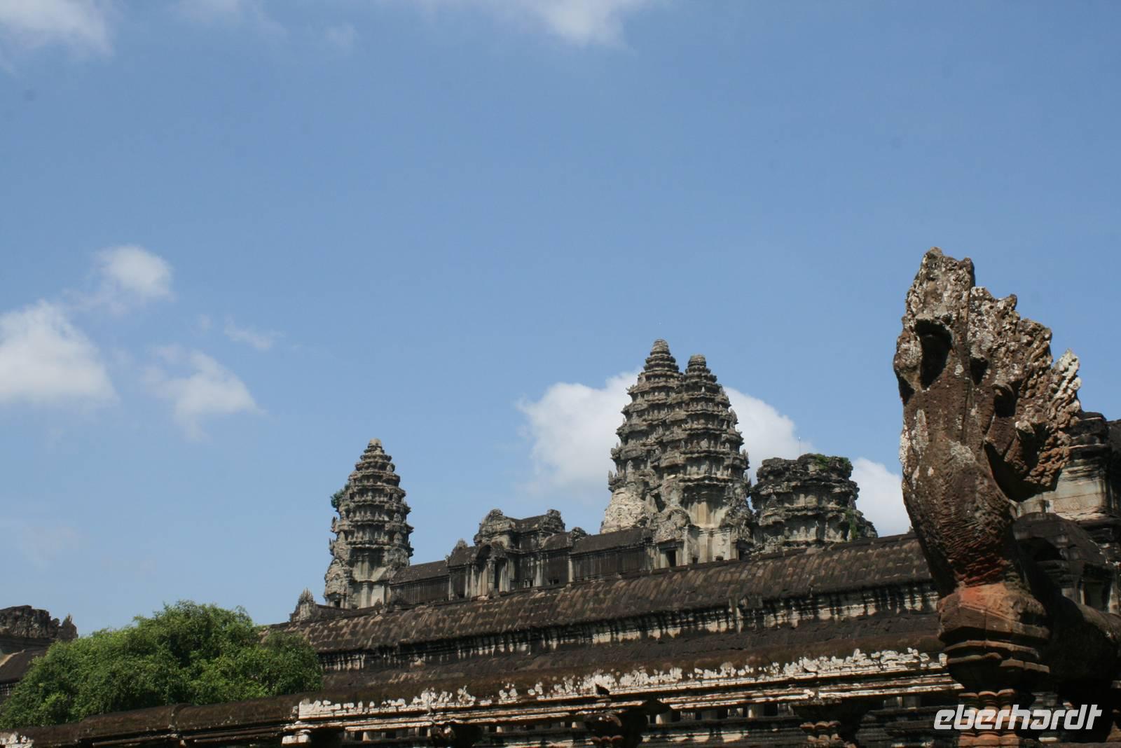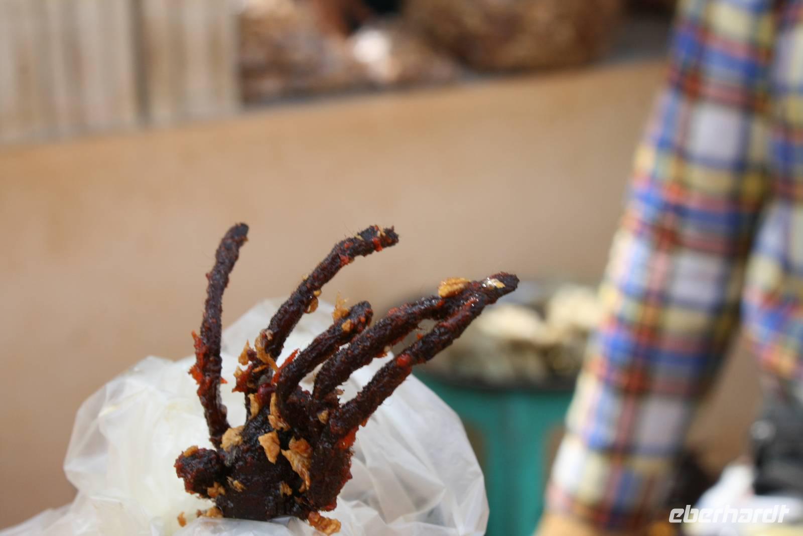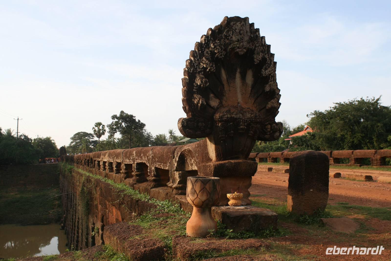 Heute verliessen wir die Hauptstadt Kambodschas und wurden von unserem neuen Guide Minh Thol begrüßt. Über 300 km lagen vor uns, doch uns wurde nicht langweilig. Während der Busfahrt erzählte uns Minh Thol viel Interessantes und Wissenswertes über Land und Leute. Bei Skone besuchten wir den bekannten Spinnenmarkt, wo diverse fritierte oder gebratene Krabbeltiere feil geboten bekam. Ungewöhnlich für unsere Augen und noch ungewöhnlicher für unsere Gaumen. Doch die Neugier war stärker! Mutig, mutig: einige Gäste liessen sich von einer lebendigen Spinne bekrabbeln und andere probierten krosse Spinnenbeine. Eine besondere Erfahrung und es schmeckte nicht mal schlecht. Die acht Spinnenbeine teilten wir brüderlich und desinfizierten anschließend unsere Mägen mit Mekong Whisky. Unterwegs stoppen wir noch mehrere Male und hatten so die Gelegenheit, eine kleine Dorfgemeinschaft zu besuchen und auch bei den Steinmetzen in Santouk vorbeizuschauen. Später erhielten wir einen ersten Eindruck vom Riesenreich Angkor, als wir die ca. 700 Jahre alte Naga Brücke zu Fuß überquerten. Unser Bus durfte nicht hinüber, sondern mußte einen kleinen Umweg fahren und nahm uns am anderen Ende wieder auf. Am Abend erreichten wir Siem Reap. Bevor wir im Hotel eincheckten, fuhren wir gleich zum Abendessen. Nach diesem erlebnisreichen Tag fielen wir in unsere Betten und freuten uns auf morgen.