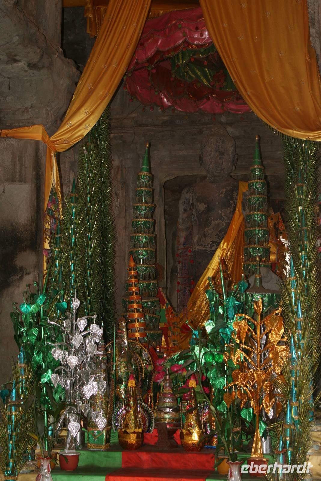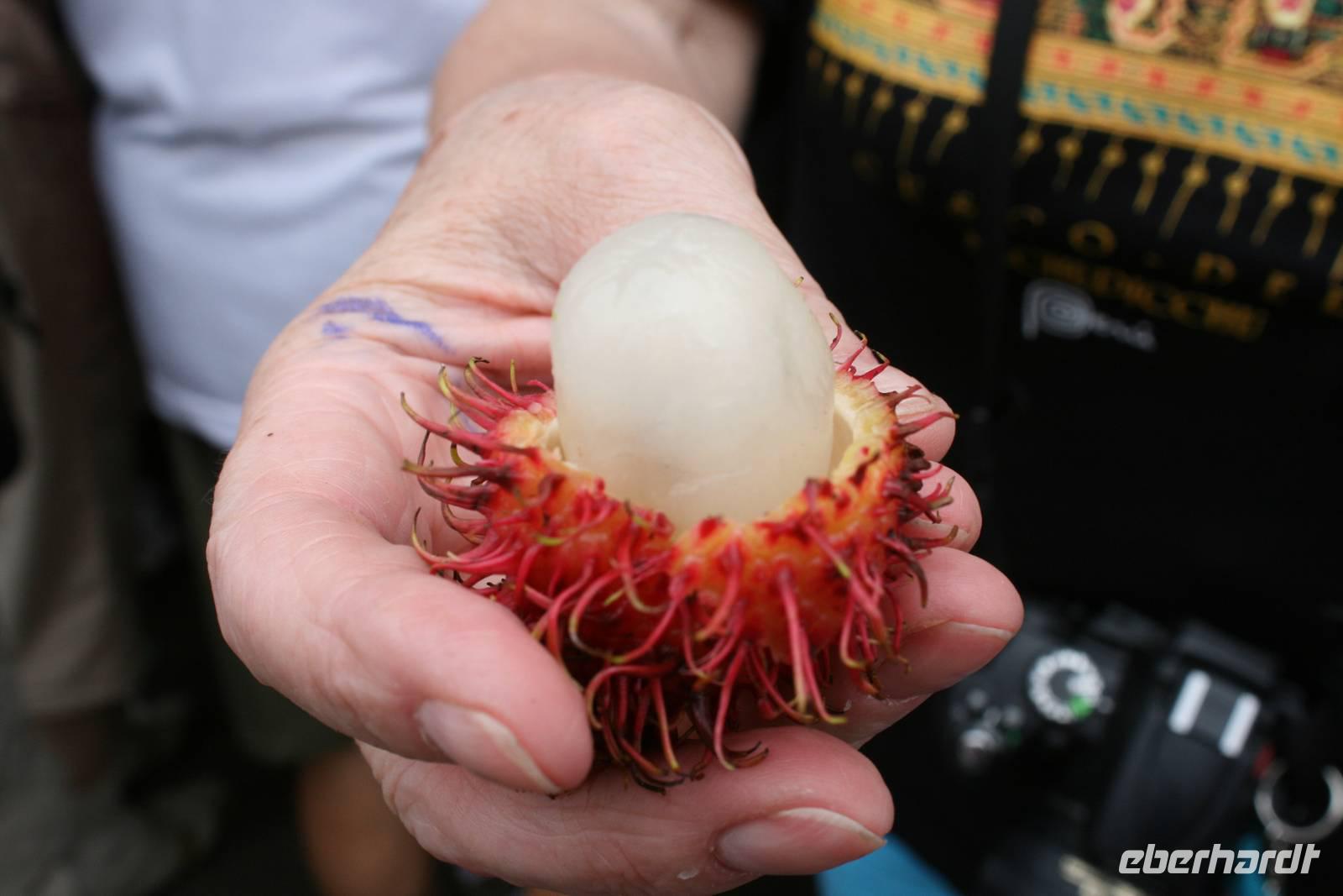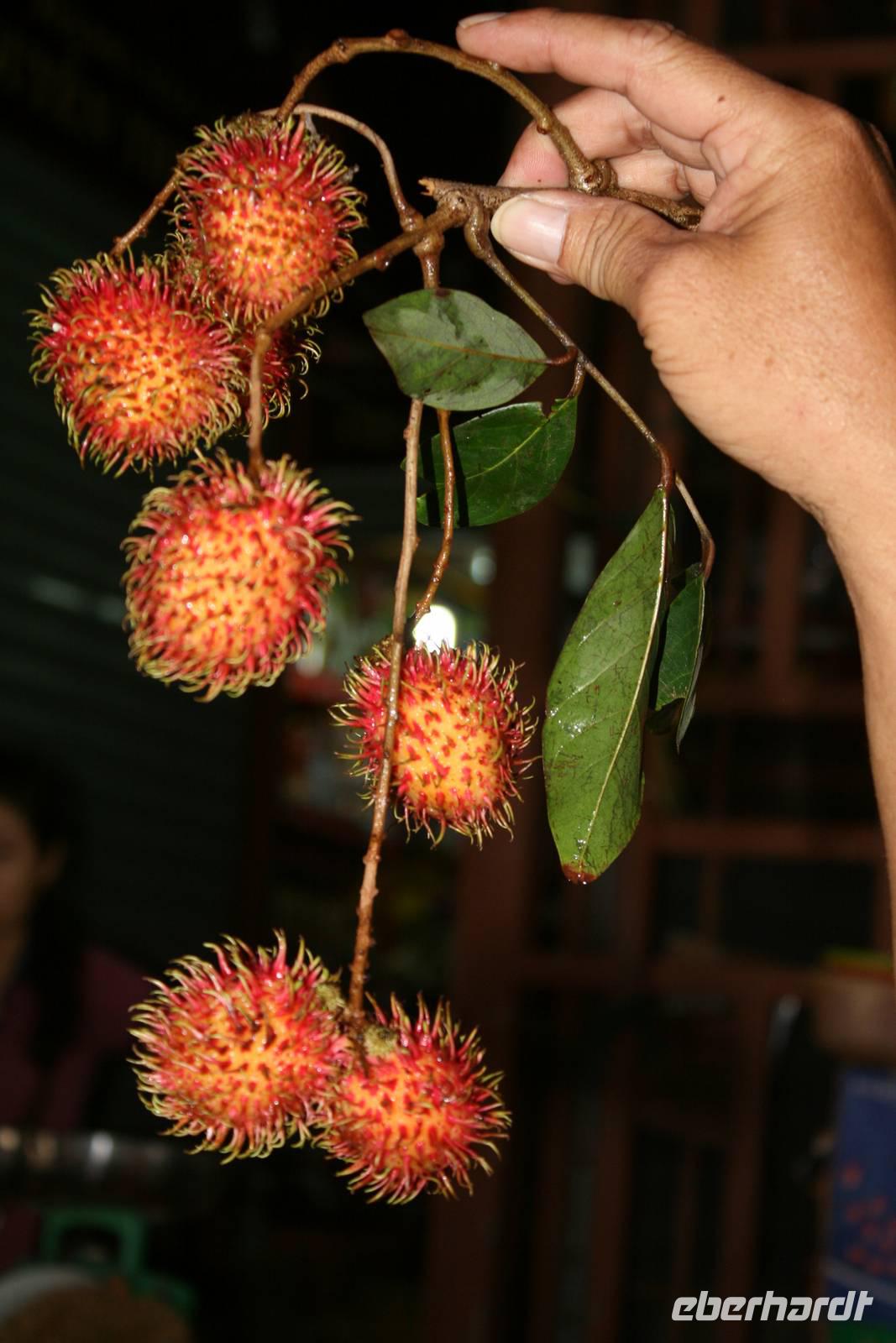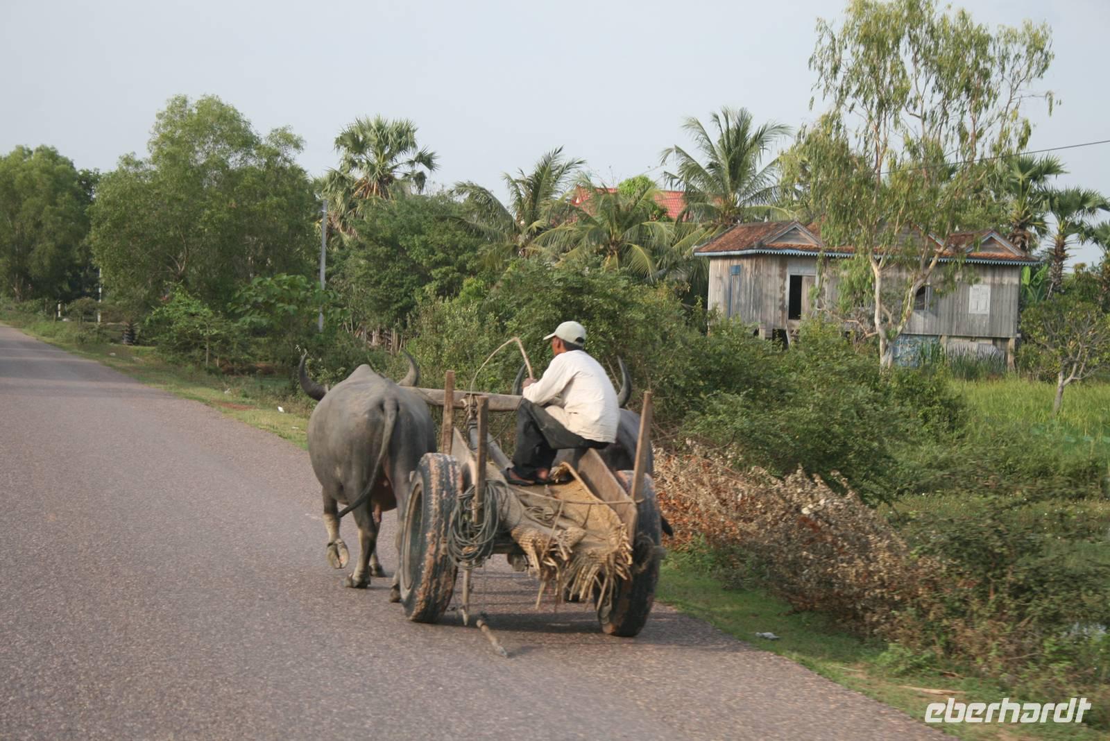 Heute verliessen wir die Hauptstadt Kambodschas und wurden von unserem neuen Guide Minh Thol begrüßt. Über 300 km lagen vor uns, doch uns wurde nicht langweilig. Während der Busfahrt erzählte uns Minh Thol viel Interessantes und Wissenswertes über Land und Leute. Bei Skone besuchten wir den bekannten Spinnenmarkt, wo diverse fritierte oder gebratene Krabbeltiere feil geboten bekam. Ungewöhnlich für unsere Augen und noch ungewöhnlicher für unsere Gaumen. Doch die Neugier war stärker! Mutig, mutig: einige Gäste liessen sich von einer lebendigen Spinne bekrabbeln und andere probierten krosse Spinnenbeine. Eine besondere Erfahrung und es schmeckte nicht mal schlecht. Die acht Spinnenbeine teilten wir brüderlich und desinfizierten anschließend unsere Mägen mit Mekong Whisky. Unterwegs stoppen wir noch mehrere Male und hatten so die Gelegenheit, eine kleine Dorfgemeinschaft zu besuchen und auch bei den Steinmetzen in Santouk vorbeizuschauen. Später erhielten wir einen ersten Eindruck vom Riesenreich Angkor, als wir die ca. 700 Jahre alte Naga Brücke zu Fuß überquerten. Unser Bus durfte nicht hinüber, sondern mußte einen kleinen Umweg fahren und nahm uns am anderen Ende wieder auf. Am Abend erreichten wir Siem Reap. Bevor wir im Hotel eincheckten, fuhren wir gleich zum Abendessen. Nach diesem erlebnisreichen Tag fielen wir in unsere Betten und freuten uns auf morgen.