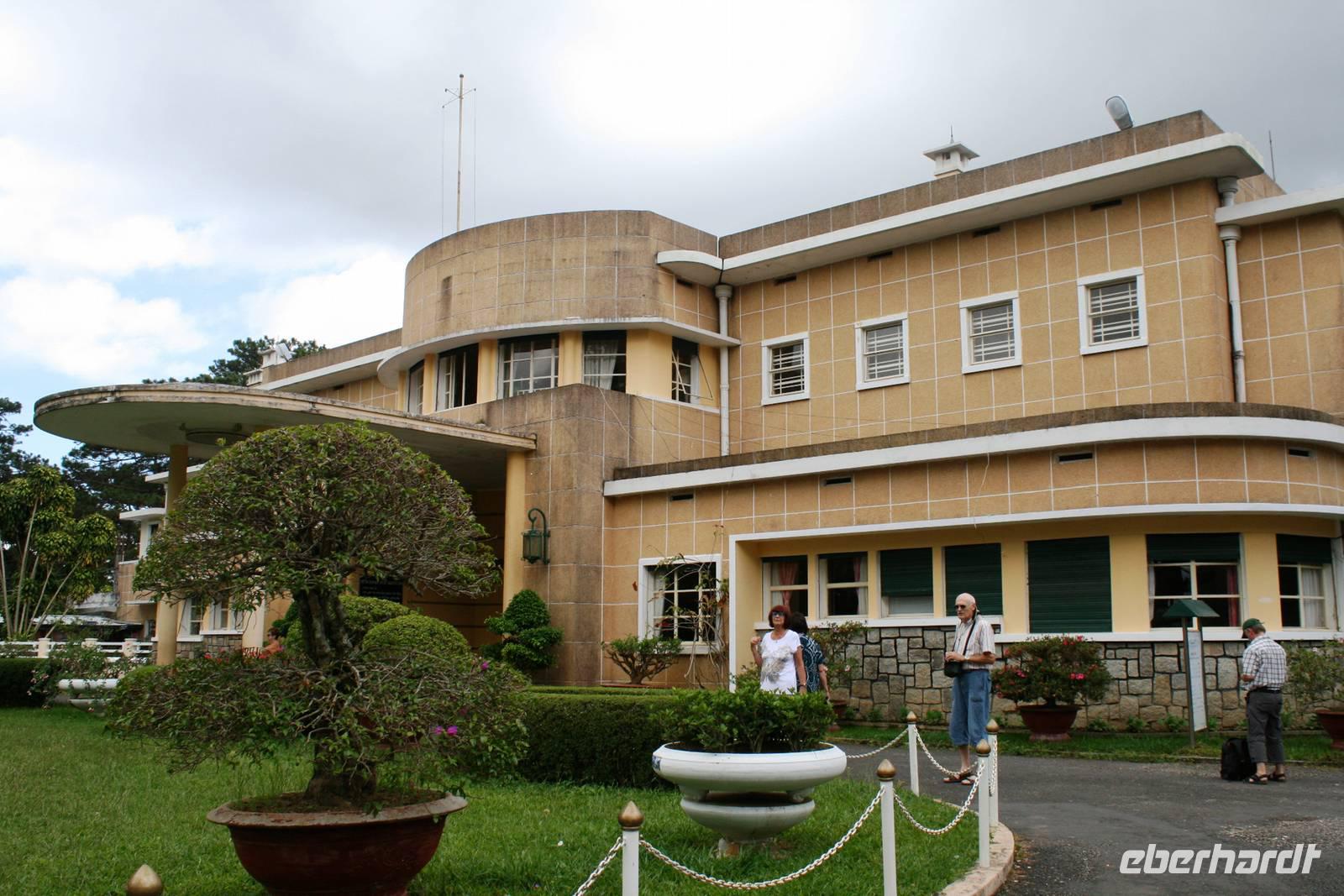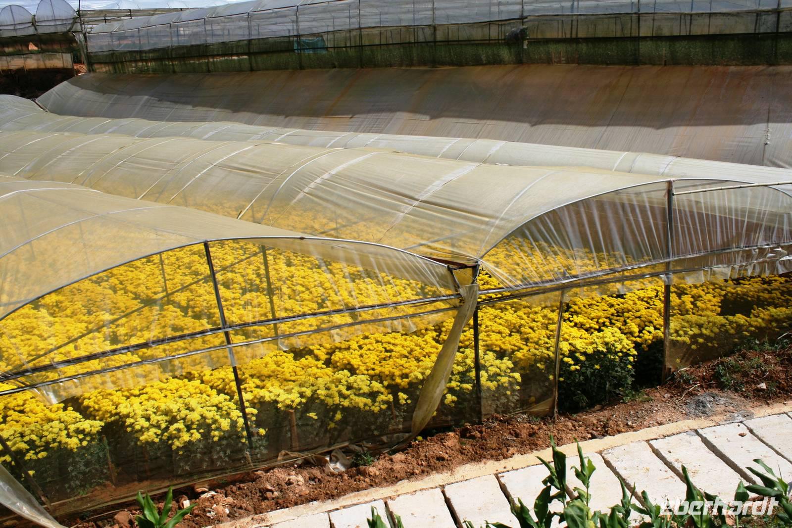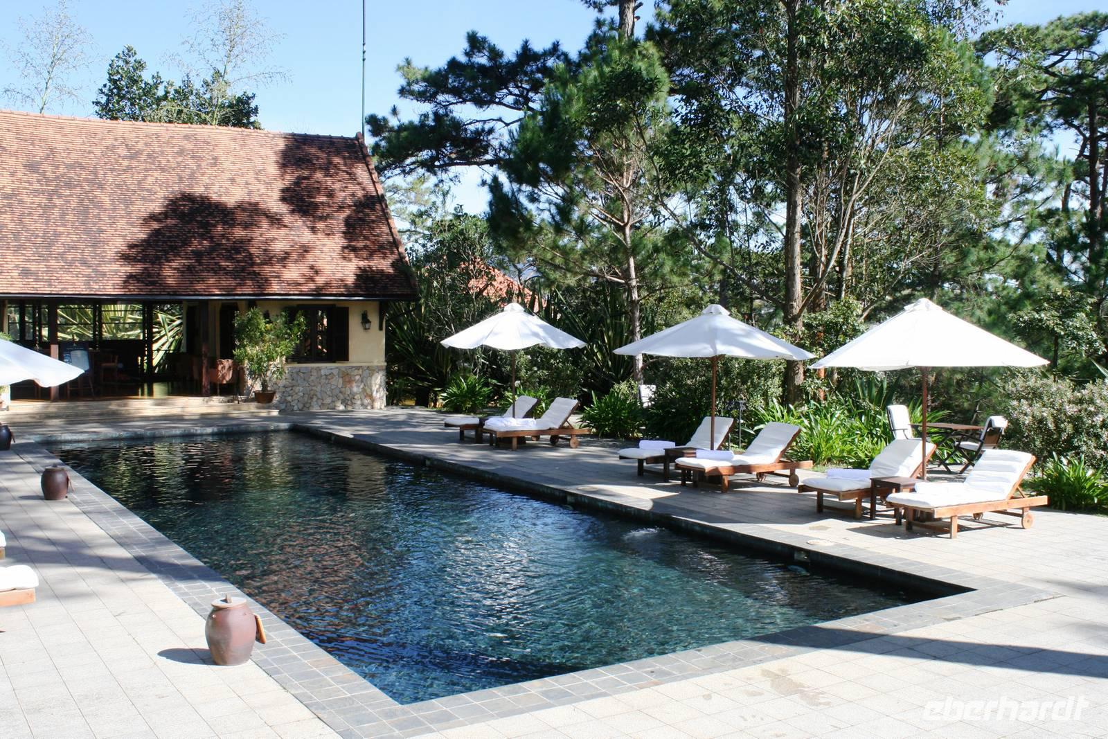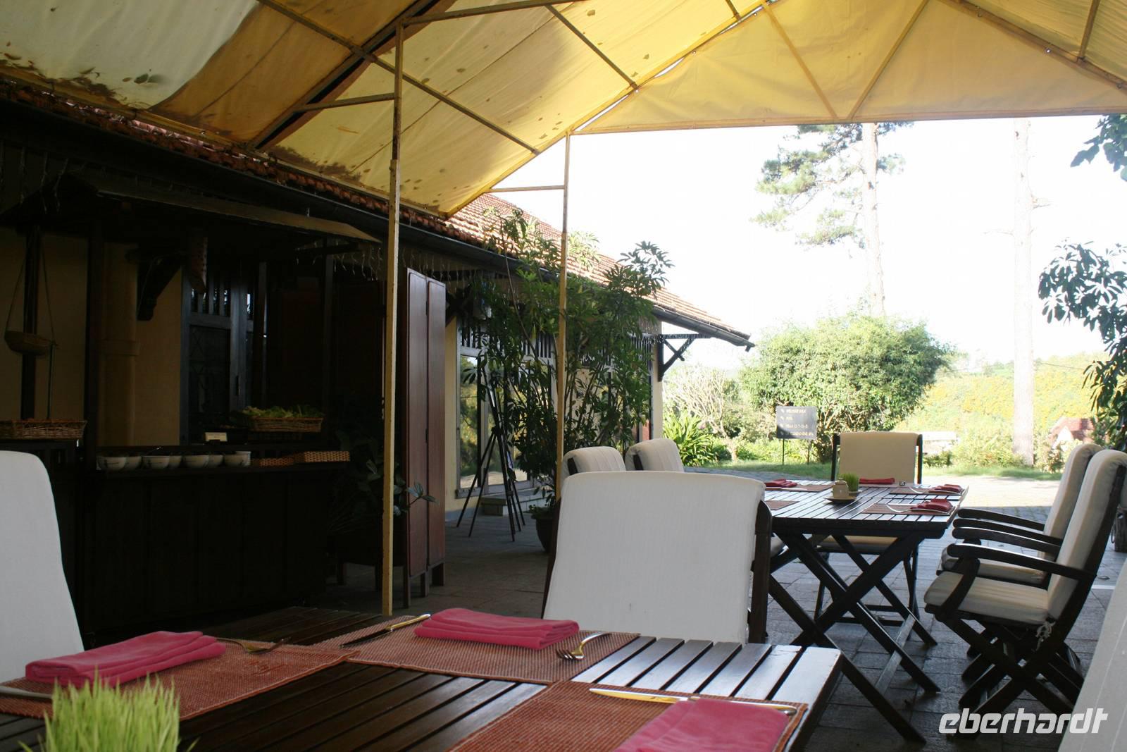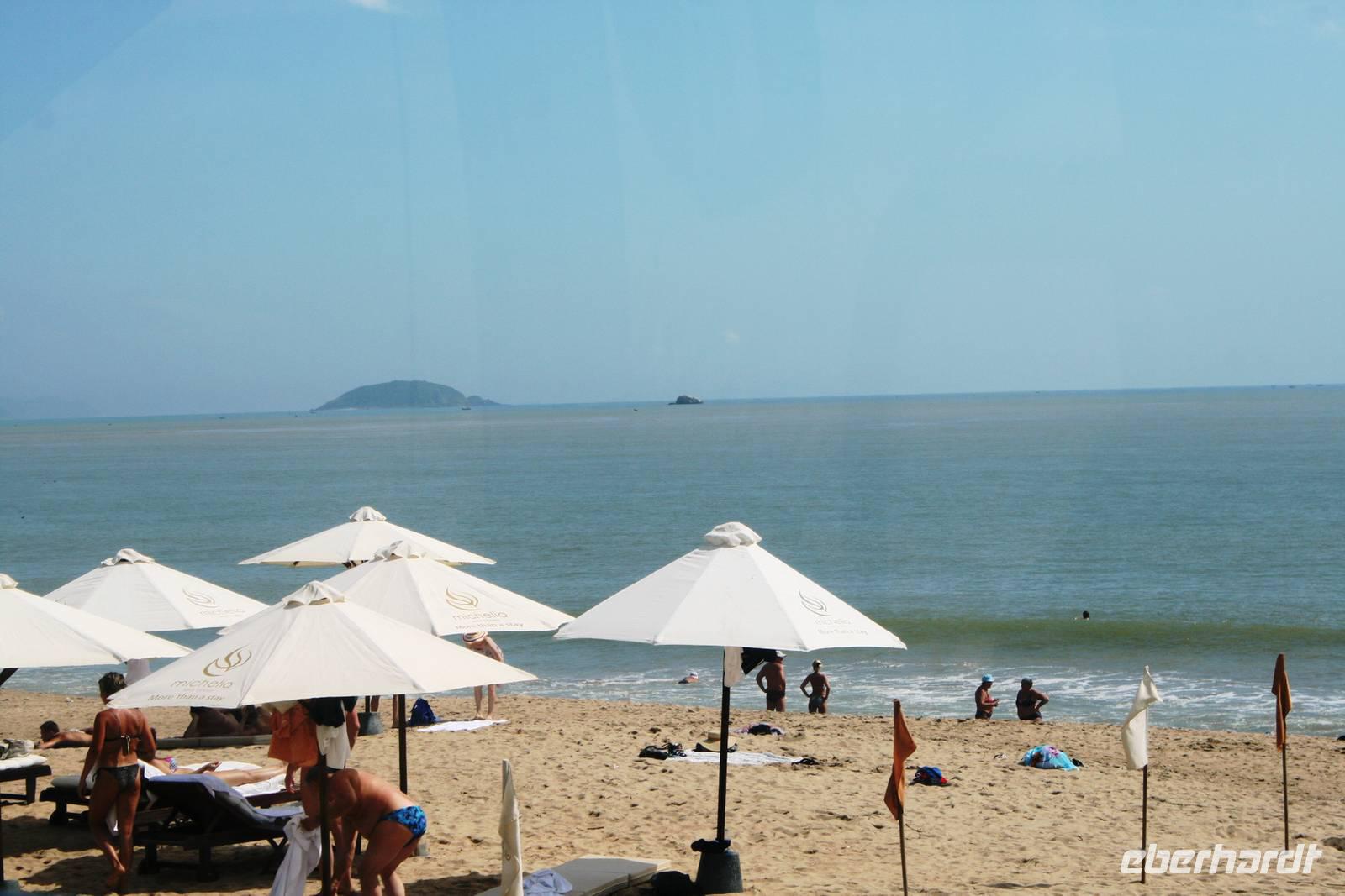 Kurz nach 7 Uhr startete Annett zum "Weckruf". Alle hatten, besser als gedacht, die Nacht überstanden. 8 Uhr fuhren wir in Nha Trang ein und eine strahlende Huong (unsere neue Reiseleiterin) und viel Sonnenschein begrüßten uns. In einem Hotel an der Strandpromenade konnten wir uns ein wenig frisch machen und am großen Buffet bedienen. Der Kaffee war dabei das Wichtigste. Gegenüber befindet sich der lange, belebte Sandstrand, der gesäumt wird von unzähligen Hotels. Irritiert bemerkten wir, dass viele Vietnamesen russisch sprechen. Kein Wunder, Nha Trang ist seit einigen Jahren Badehochburg reicher, russischer Touristen. Gern wären wir mal kurz ins Meer gesprungen, aber unsere Reise ging weiter. Wir besichtigten den berühmten hinduistischen Cham-Tempel Po Nagar, der zwischen 7. und 12. Jhd. erbaut wurde und der Mutter- und Schutzgöttin gewidmet ist. Von hier oben hat man einen schönen Blick auf Nha Trang. Die Hitze machte vielen bereits am Morgen zu schaffen. Von Norden nach Süden wir es ja immer wärmer. Deshalb entschieden wir, auf den Besuch der Long Son Pagode und deren weissen Buddha (der nur über viele, viele Stufen erreichbar ist) zu verzichten und später als Ersatz die Vinh Trang Pagode mit ihren 3 weissen Buddhas in My Tho zu besuchen. So fuhren wir im klimatisierten Bus weiter, denn eine etwas längere Fahrt ins zentrale Hochland in die Heimat des Volkes der Lats, mußte heute noch geschafft werden. Auf der neuen Strasse, deren Strecke kürzer ist, ging es relativ zügig voran. Bis auf ca. 1.600 m mußten wir noch hinauf. Die Vegetation wurde waldreicher und das Klima angenehmer. Unterwegs fuhren wir an Kaffeeplantagen, Pinienwälder und Dörfern ethnischer Minderheiten vorbei und pausierten in einem gemütlichen Cafe am Fluss. Wer wollte, konnte seinen starken Kaffee mit süßer Kondensmilch "hängend" genießen. Da Lat, die „Stadt des ewigen Frühlings" kündigte sich schon von Weitem an: Endlose Gewächshäuser, deren Plastikdächer kaum Platz für anderes lassen. Da Lat ist zweifelsohne DAS Zentrum für Blumen-, Gemüse- und Obstanbau. Am frühen Nachmittag erreichten wir Da Lat und erfreuten uns an den angenehmen Temperaturen. Nach einem späten Mittagessen und ein wenig freier Zeit fuhren wir zum wunderschönen Hotelresort Ana Mandara Da Lat, wo wir durch ein Upgrate in originalen Kolonialvillen die nächsten 2 Tage wohnen durften. Das Resort befindet sich einer weitläufigen, sehr gepflegten Parkanlage an einem Berg. Zu unseren Villen wurden wir wie einst die Kolonialherren chauffiert. Das schmackhafte Abendessen genossen wir im Restaurant des Hotels.