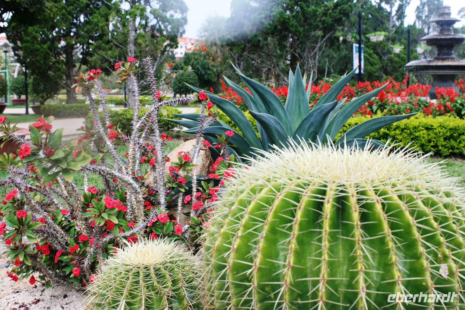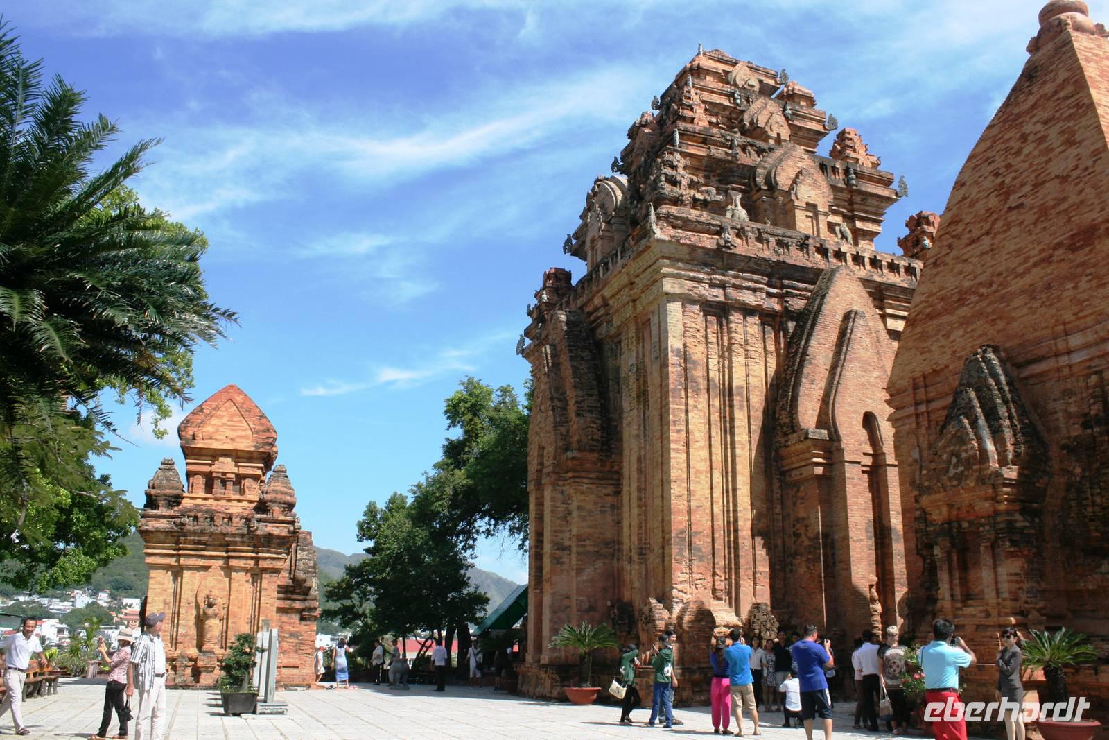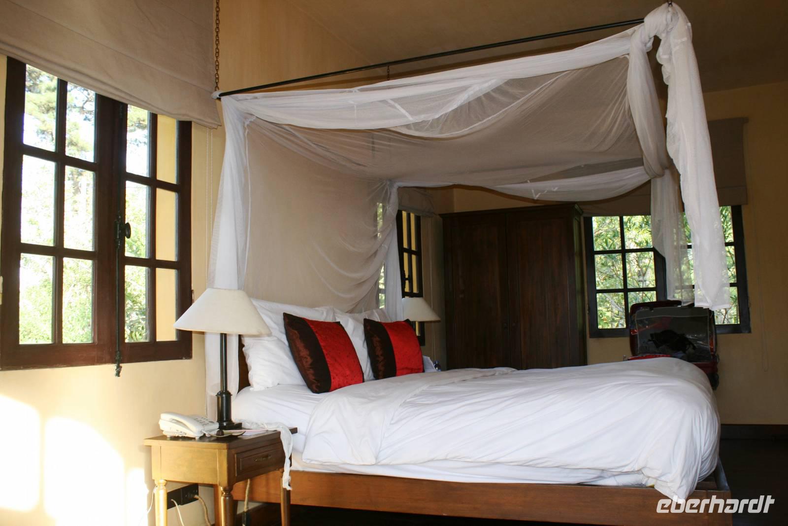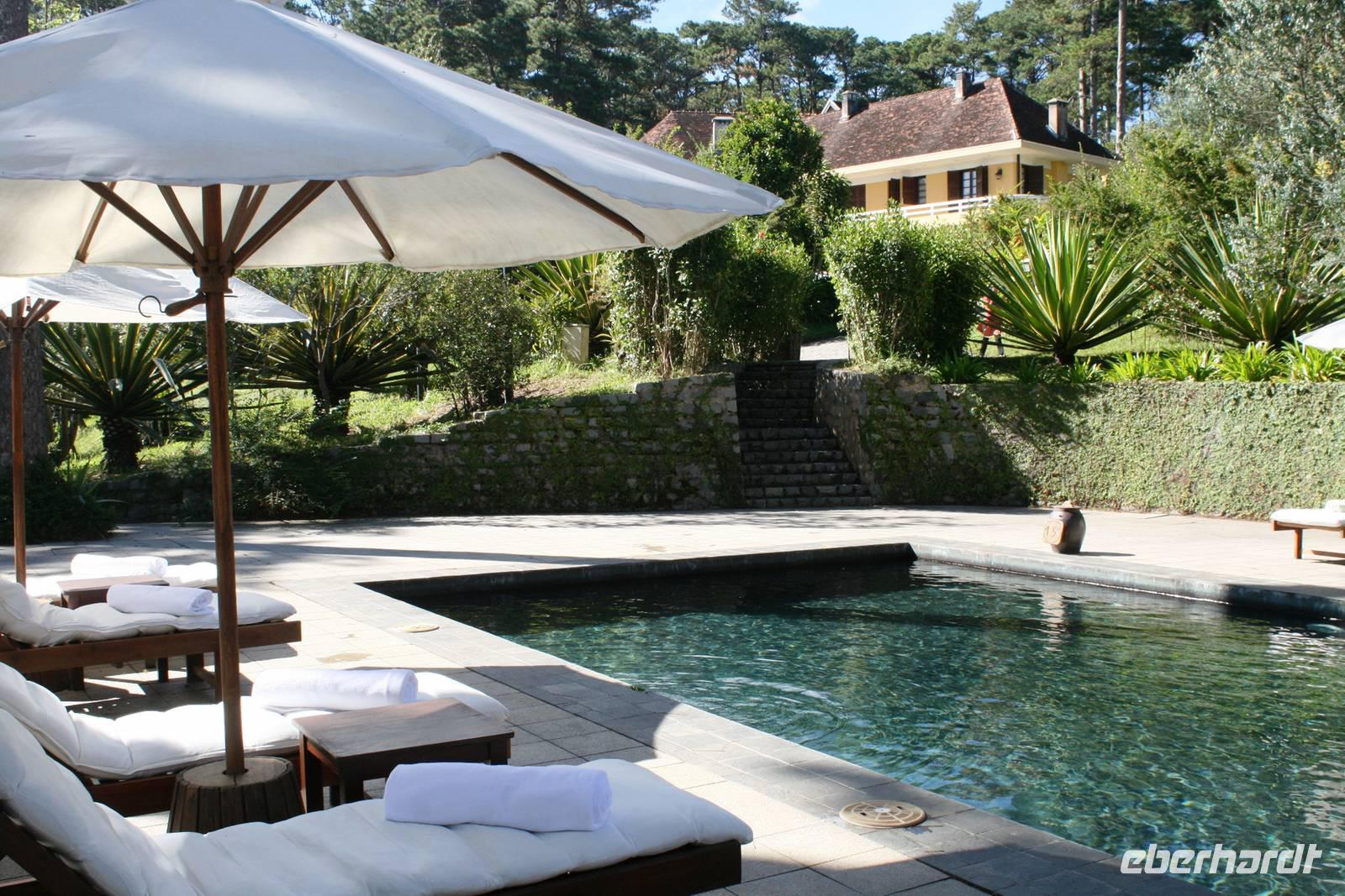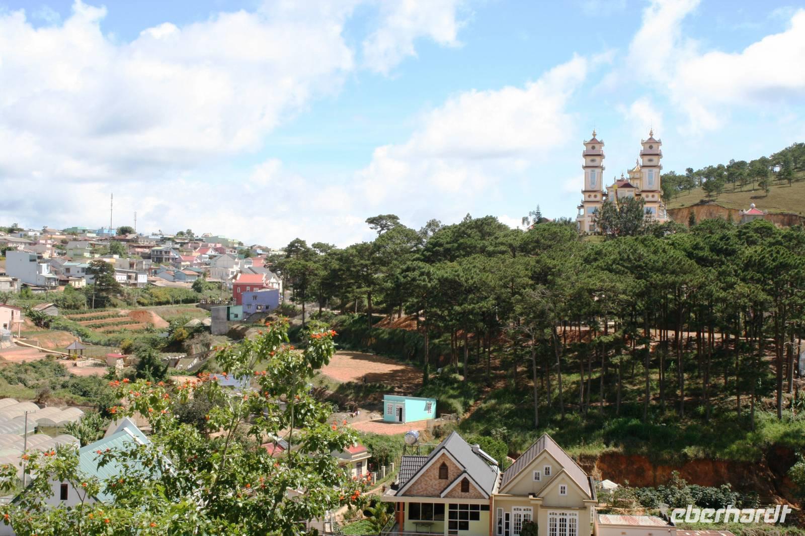 Kurz nach 7 Uhr startete Annett zum "Weckruf". Alle hatten, besser als gedacht, die Nacht überstanden. 8 Uhr fuhren wir in Nha Trang ein und eine strahlende Huong (unsere neue Reiseleiterin) und viel Sonnenschein begrüßten uns. In einem Hotel an der Strandpromenade konnten wir uns ein wenig frisch machen und am großen Buffet bedienen. Der Kaffee war dabei das Wichtigste. Gegenüber befindet sich der lange, belebte Sandstrand, der gesäumt wird von unzähligen Hotels. Irritiert bemerkten wir, dass viele Vietnamesen russisch sprechen. Kein Wunder, Nha Trang ist seit einigen Jahren Badehochburg reicher, russischer Touristen. Gern wären wir mal kurz ins Meer gesprungen, aber unsere Reise ging weiter. Wir besichtigten den berühmten hinduistischen Cham-Tempel Po Nagar, der zwischen 7. und 12. Jhd. erbaut wurde und der Mutter- und Schutzgöttin gewidmet ist. Von hier oben hat man einen schönen Blick auf Nha Trang. Die Hitze machte vielen bereits am Morgen zu schaffen. Von Norden nach Süden wir es ja immer wärmer. Deshalb entschieden wir, auf den Besuch der Long Son Pagode und deren weissen Buddha (der nur über viele, viele Stufen erreichbar ist) zu verzichten und später als Ersatz die Vinh Trang Pagode mit ihren 3 weissen Buddhas in My Tho zu besuchen. So fuhren wir im klimatisierten Bus weiter, denn eine etwas längere Fahrt ins zentrale Hochland in die Heimat des Volkes der Lats, mußte heute noch geschafft werden. Auf der neuen Strasse, deren Strecke kürzer ist, ging es relativ zügig voran. Bis auf ca. 1.600 m mußten wir noch hinauf. Die Vegetation wurde waldreicher und das Klima angenehmer. Unterwegs fuhren wir an Kaffeeplantagen, Pinienwälder und Dörfern ethnischer Minderheiten vorbei und pausierten in einem gemütlichen Cafe am Fluss. Wer wollte, konnte seinen starken Kaffee mit süßer Kondensmilch "hängend" genießen. Da Lat, die „Stadt des ewigen Frühlings" kündigte sich schon von Weitem an: Endlose Gewächshäuser, deren Plastikdächer kaum Platz für anderes lassen. Da Lat ist zweifelsohne DAS Zentrum für Blumen-, Gemüse- und Obstanbau. Am frühen Nachmittag erreichten wir Da Lat und erfreuten uns an den angenehmen Temperaturen. Nach einem späten Mittagessen und ein wenig freier Zeit fuhren wir zum wunderschönen Hotelresort Ana Mandara Da Lat, wo wir durch ein Upgrate in originalen Kolonialvillen die nächsten 2 Tage wohnen durften. Das Resort befindet sich einer weitläufigen, sehr gepflegten Parkanlage an einem Berg. Zu unseren Villen wurden wir wie einst die Kolonialherren chauffiert. Das schmackhafte Abendessen genossen wir im Restaurant des Hotels.