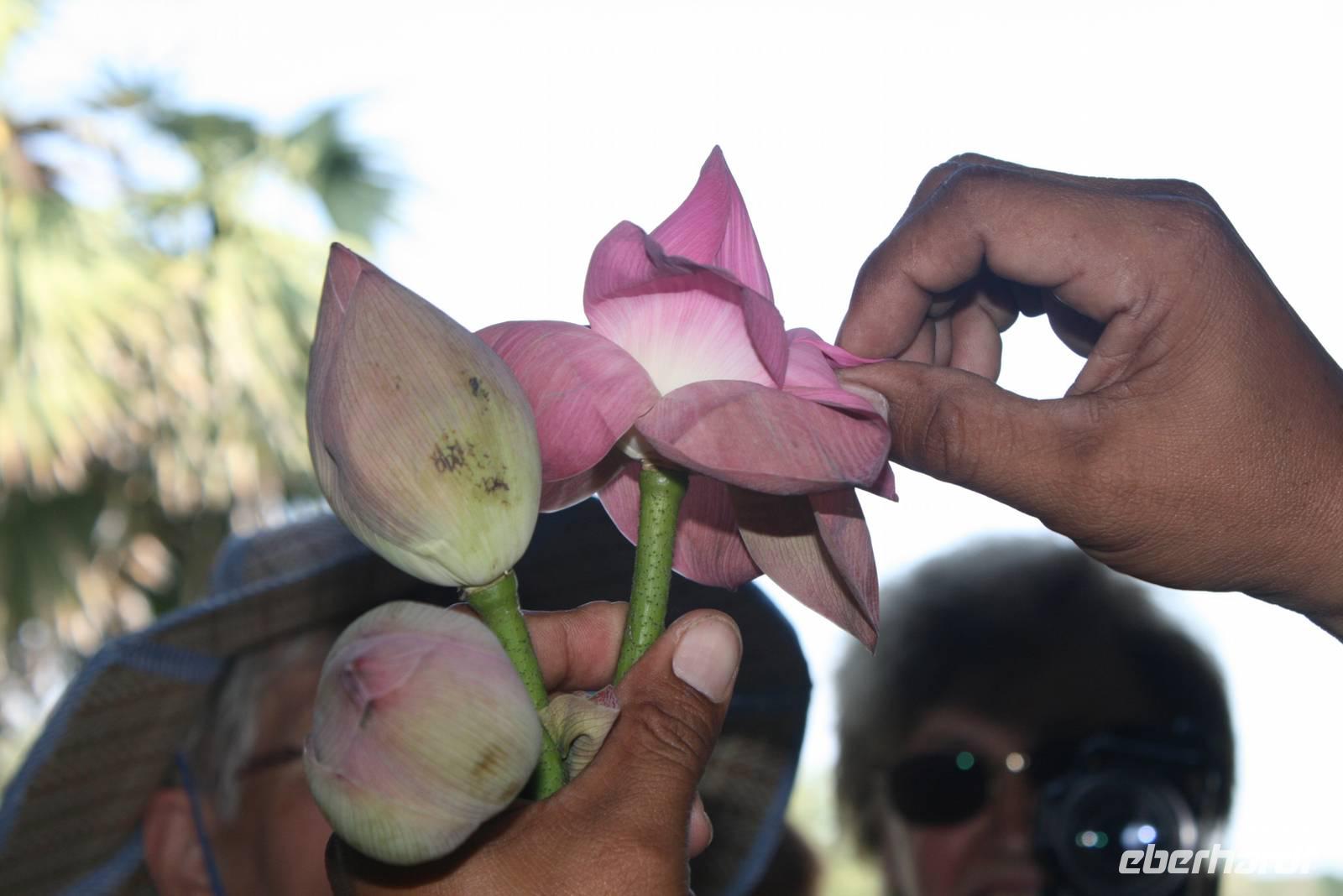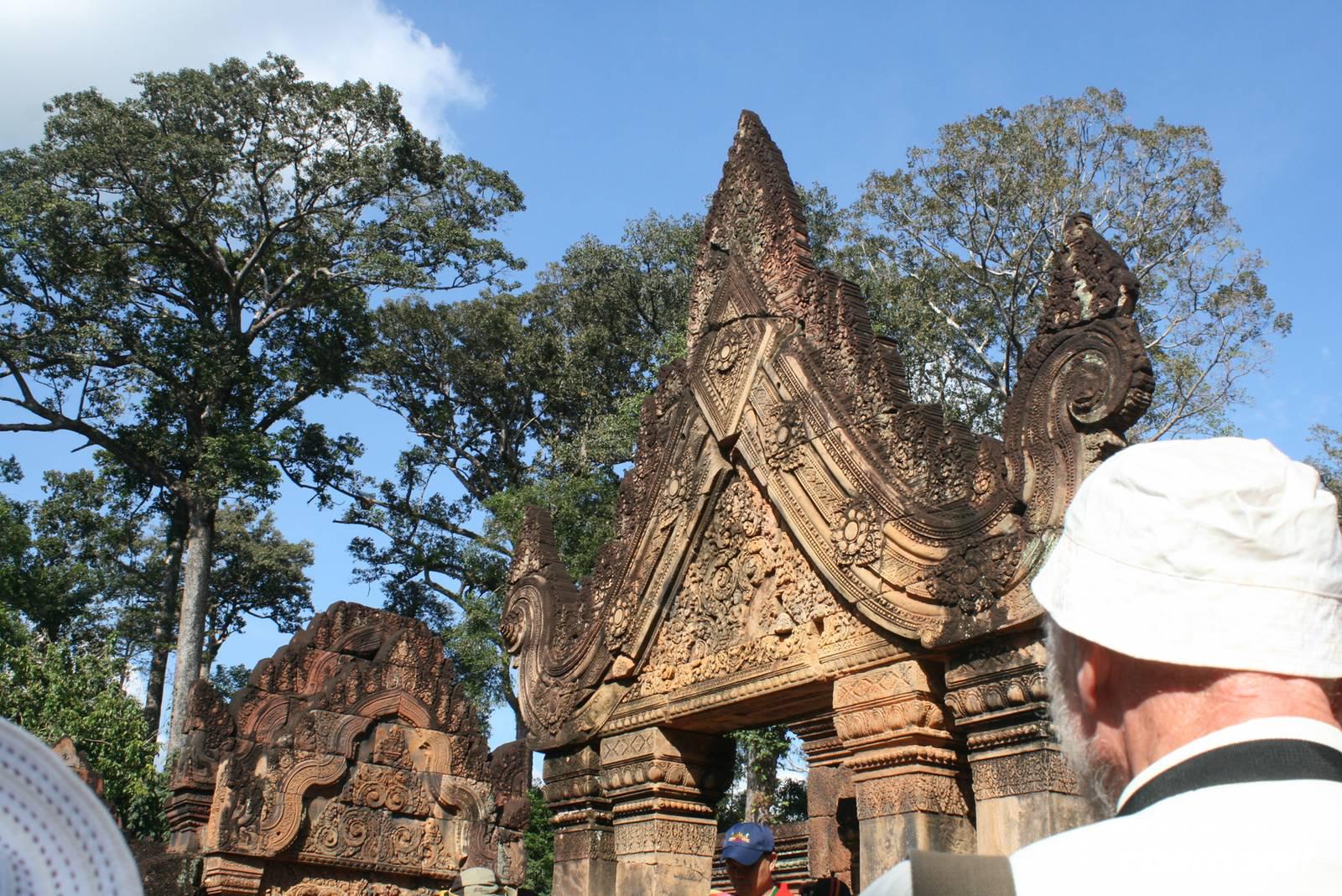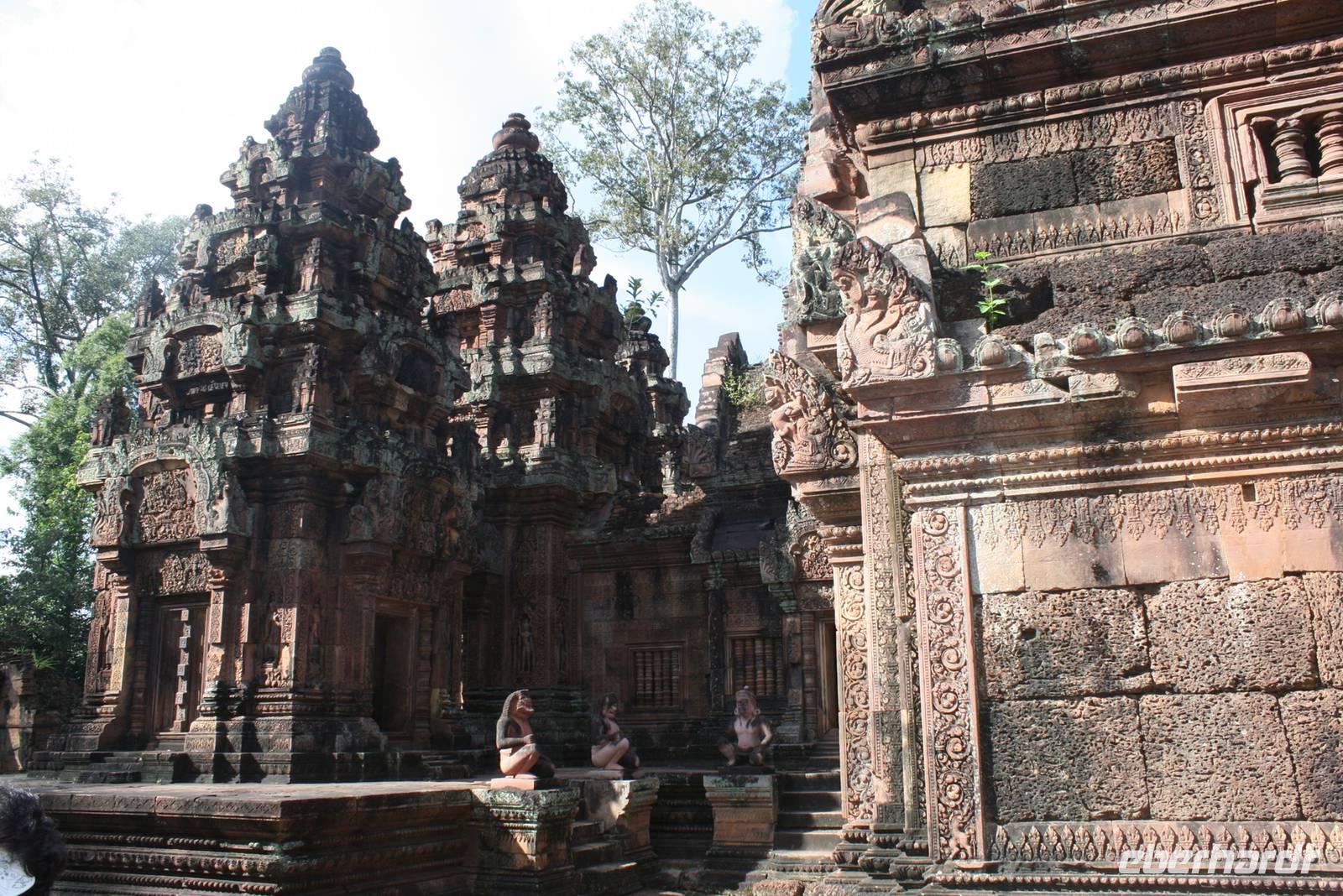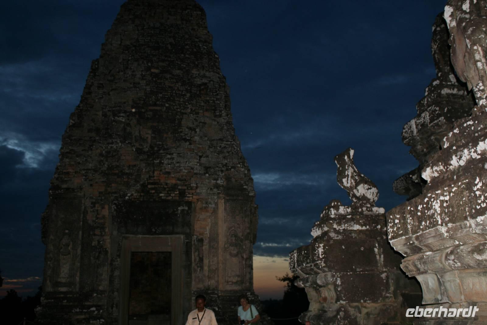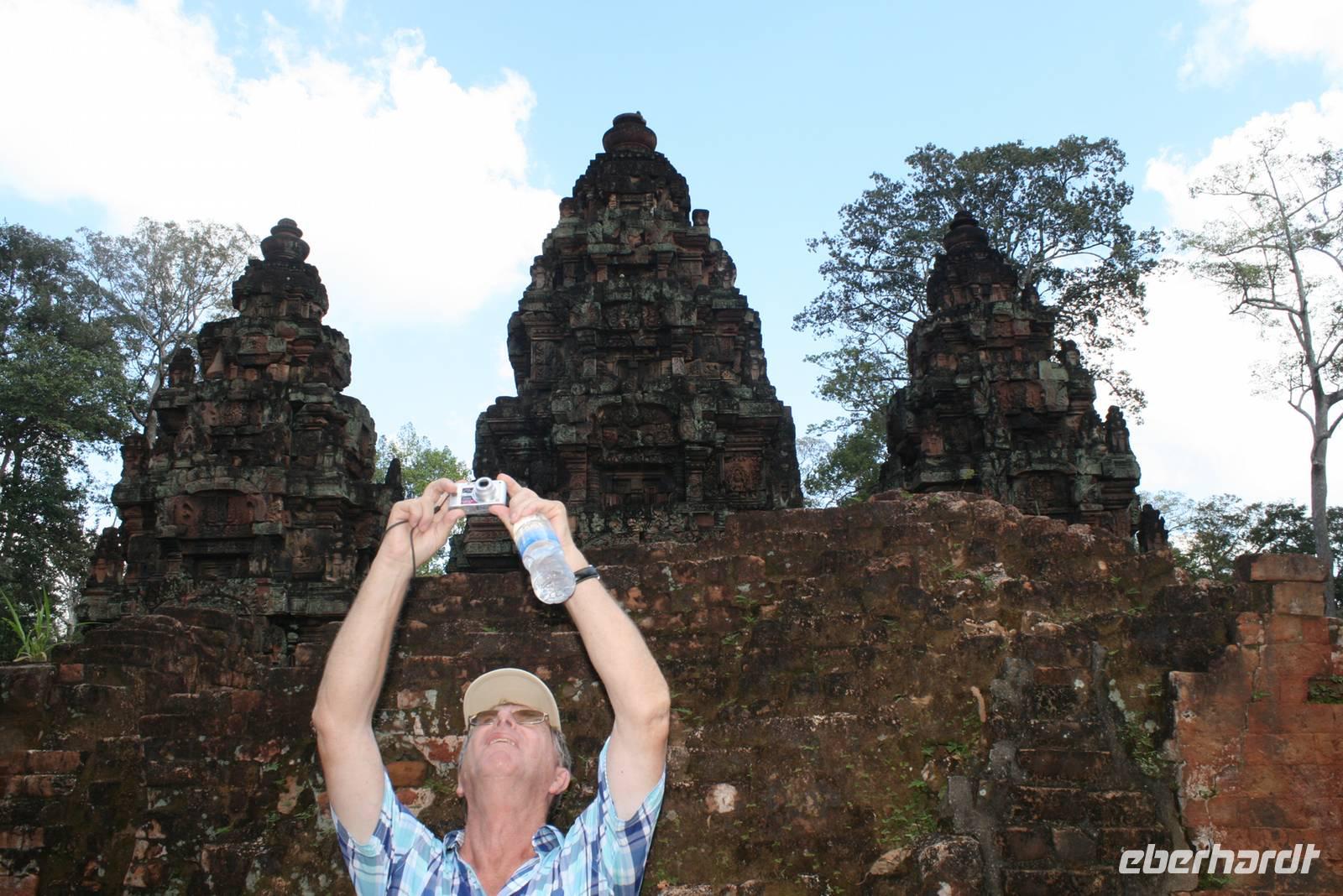Heute stand der berühmte Dschungeltempel Ta Prohm auf unserem Programm. Die Tempelanlage war vom Dschungel völlig überwuchert und wurde so erst ca. 600 Jahre nach ihrer Entstehung von Europäern entdeckt. Überdimensionale Baumwurzeln verschlingen sich mit den wuchtigen Steinmauern und halten diese fest umschlungen, damit sie nicht auseinander fallen. Einfach beeindruckend, unsere Fotoapparate klickten im Dauertakt. Im Sekundentakt strömten dann auch die Touristen in die Anlage. Im Gedränge ging kurzzeitig ein Gast verloren, der aber nach eigenen Entdeckungen wieder wohlbehalten zur Gruppe fand. Übrigens: Wußten Sie schon, dass der Tempel als Kulisse im Tomb Raider Kinohit "Lara Croft" mit Angelina Jolie diente! Anschließend fuhren wir mit dem Bus ca. 30 km zu einem der schönsten Tempelanlagen Banteay Srei, auch Frauentempel genannt. Er ist zwar einer der kleinsten auf dem Gebiet von Angkor, aber der am reich verziertesten Tempel - ein architektonisches Kleinod. Minh Thol verstand es wieder hervorragend, uns die filigranen Ornamente und Relief im rosa schimmernden Gestein zu erklären. Auf unserem Rückweg besuchten wir noch ein kleines Dorf, dessen Bewohner sich mit der Herstellung von Palmzucker ihren Lebensunterhalt verdienten. Minh Thol war auch hier wieder mit seinen Erklärungen und vollem Körpereinsatz dabei, so dass einige Werkzeuge anschließend repariert werden mußten. In der glänzenden Spätnachmittagssonne verabschiedeten wir uns von den Tempeln und fuhren zum Hotel zurück. Eine winzige Schar war noch nicht der Tempel müde und startete noch einmal in Tuk Tuks nach Angkor, um den Sonnenuntergang auf dem Tempel Pre Rup zu erleben. Trotz Erstürmung der hohen Tempelstufen im Speedy-Gonzales-Tempo war die Sonne doch schneller als wir. Oben waren wir dennoch fasziniert von der mystischen Stimmung und Atmosphäre. Das letzte Abendessen wurde uns im Hotel serviert und es gab mal keine asiatische Küche mit Nudeln, Reis und gebratenem Gemüse. Wir speisten europäisch, um uns langsam wieder an zu Hause zu gewöhnen. Unsere erlebnisreiche Reise war nun fast zu Ende, mit einem Eberhardt-Getränk liessen wir sie noch einmal Revue passieren.