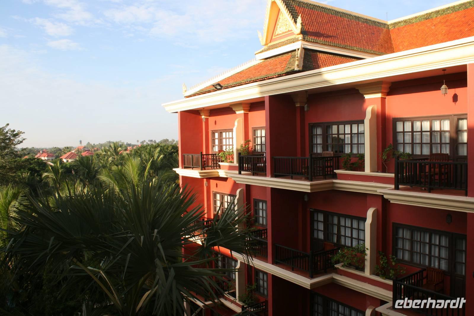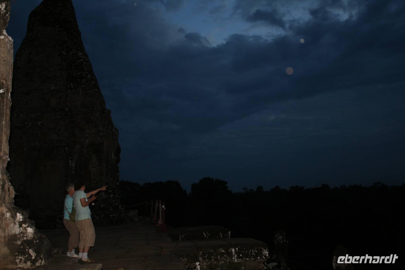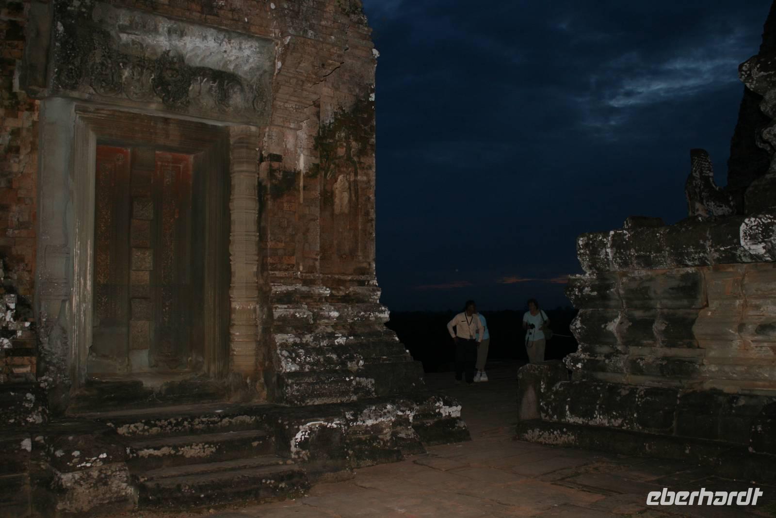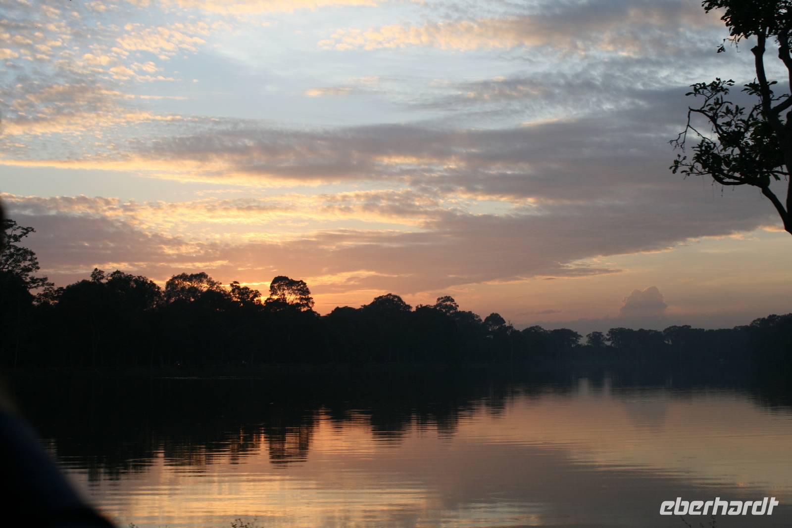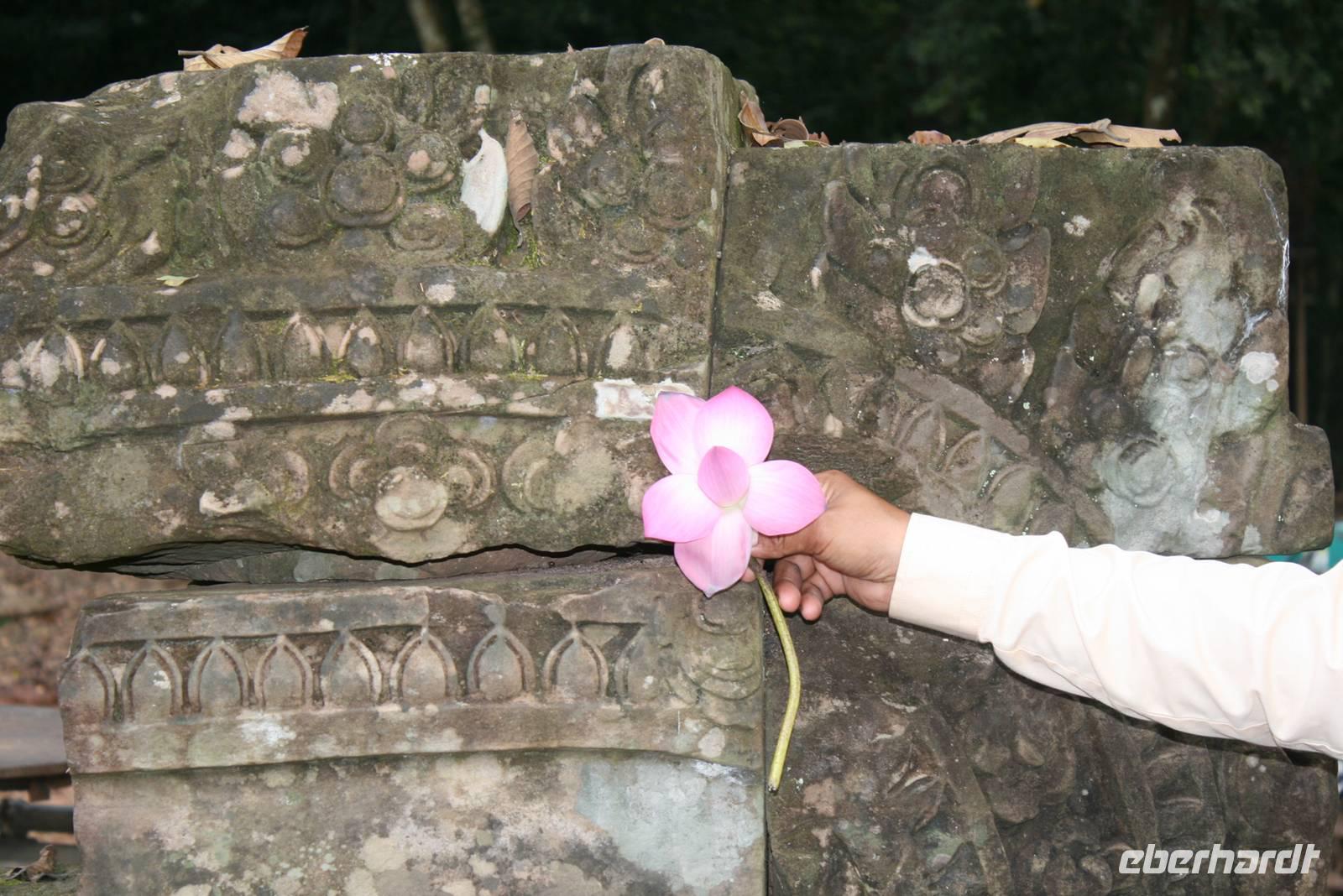 Heute stand der berühmte Dschungeltempel Ta Prohm auf unserem Programm. Die Tempelanlage war vom Dschungel völlig überwuchert und wurde so erst ca. 600 Jahre nach ihrer Entstehung von Europäern entdeckt. Überdimensionale Baumwurzeln verschlingen sich mit den wuchtigen Steinmauern und halten diese fest umschlungen, damit sie nicht auseinander fallen. Einfach beeindruckend, unsere Fotoapparate klickten im Dauertakt. Im Sekundentakt strömten dann auch die Touristen in die Anlage. Im Gedränge ging kurzzeitig ein Gast verloren, der aber nach eigenen Entdeckungen wieder wohlbehalten zur Gruppe fand. Übrigens: Wußten Sie schon, dass der Tempel als Kulisse im Tomb Raider Kinohit "Lara Croft" mit Angelina Jolie diente! Anschließend fuhren wir mit dem Bus ca. 30 km zu einem der schönsten Tempelanlagen Banteay Srei, auch Frauentempel genannt. Er ist zwar einer der kleinsten auf dem Gebiet von Angkor, aber der am reich verziertesten Tempel - ein architektonisches Kleinod. Minh Thol verstand es wieder hervorragend, uns die filigranen Ornamente und Relief im rosa schimmernden Gestein zu erklären. Auf unserem Rückweg besuchten wir noch ein kleines Dorf, dessen Bewohner sich mit der Herstellung von Palmzucker ihren Lebensunterhalt verdienten. Minh Thol war auch hier wieder mit seinen Erklärungen und vollem Körpereinsatz dabei, so dass einige Werkzeuge anschließend repariert werden mußten. In der glänzenden Spätnachmittagssonne verabschiedeten wir uns von den Tempeln und fuhren zum Hotel zurück. Eine winzige Schar war noch nicht der Tempel müde und startete noch einmal in Tuk Tuks nach Angkor, um den Sonnenuntergang auf dem Tempel Pre Rup zu erleben. Trotz Erstürmung der hohen Tempelstufen im Speedy-Gonzales-Tempo war die Sonne doch schneller als wir. Oben waren wir dennoch fasziniert von der mystischen Stimmung und Atmosphäre. Das letzte Abendessen wurde uns im Hotel serviert und es gab mal keine asiatische Küche mit Nudeln, Reis und gebratenem Gemüse. Wir speisten europäisch, um uns langsam wieder an zu Hause zu gewöhnen. Unsere erlebnisreiche Reise war nun fast zu Ende, mit einem Eberhardt-Getränk liessen wir sie noch einmal Revue passieren.