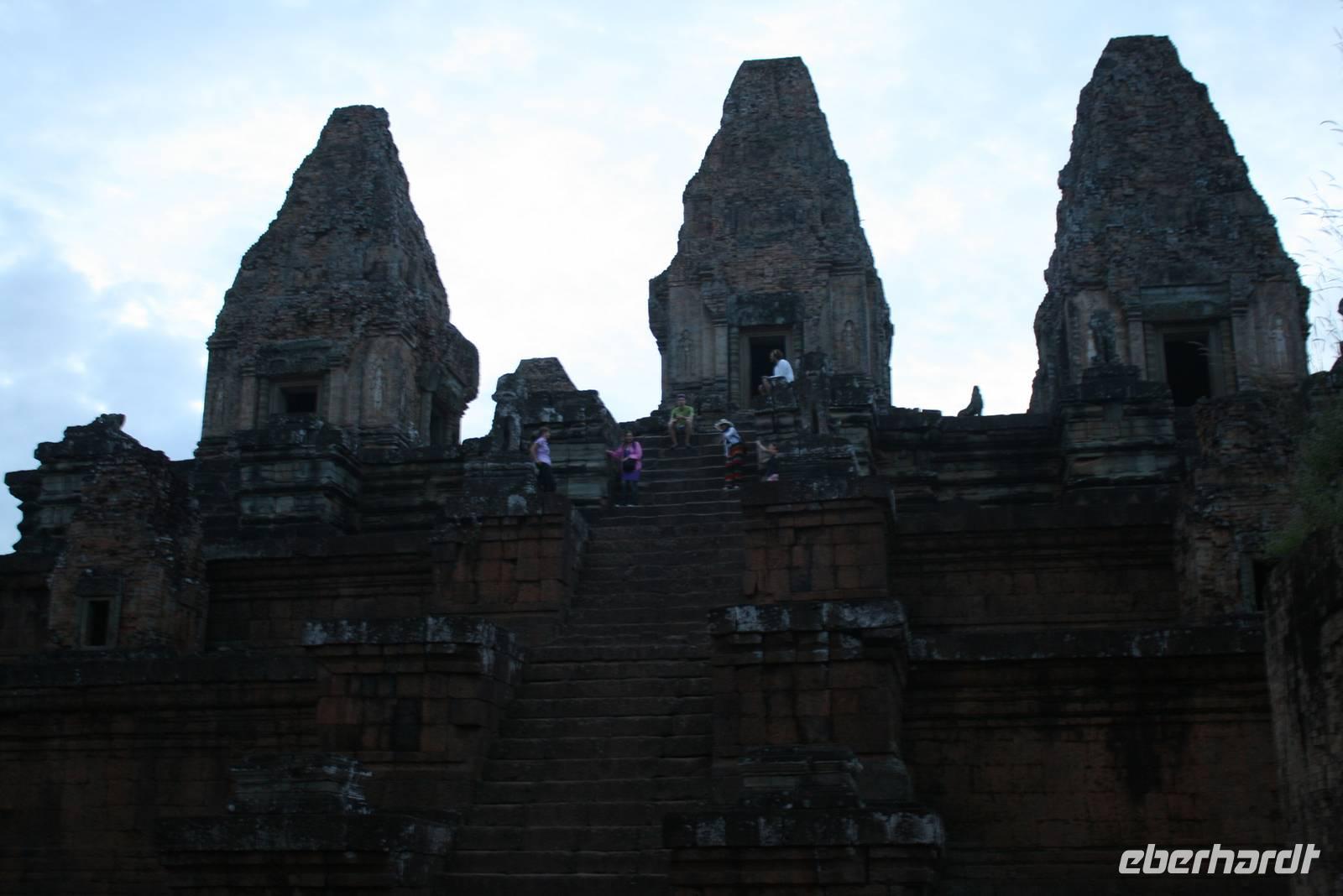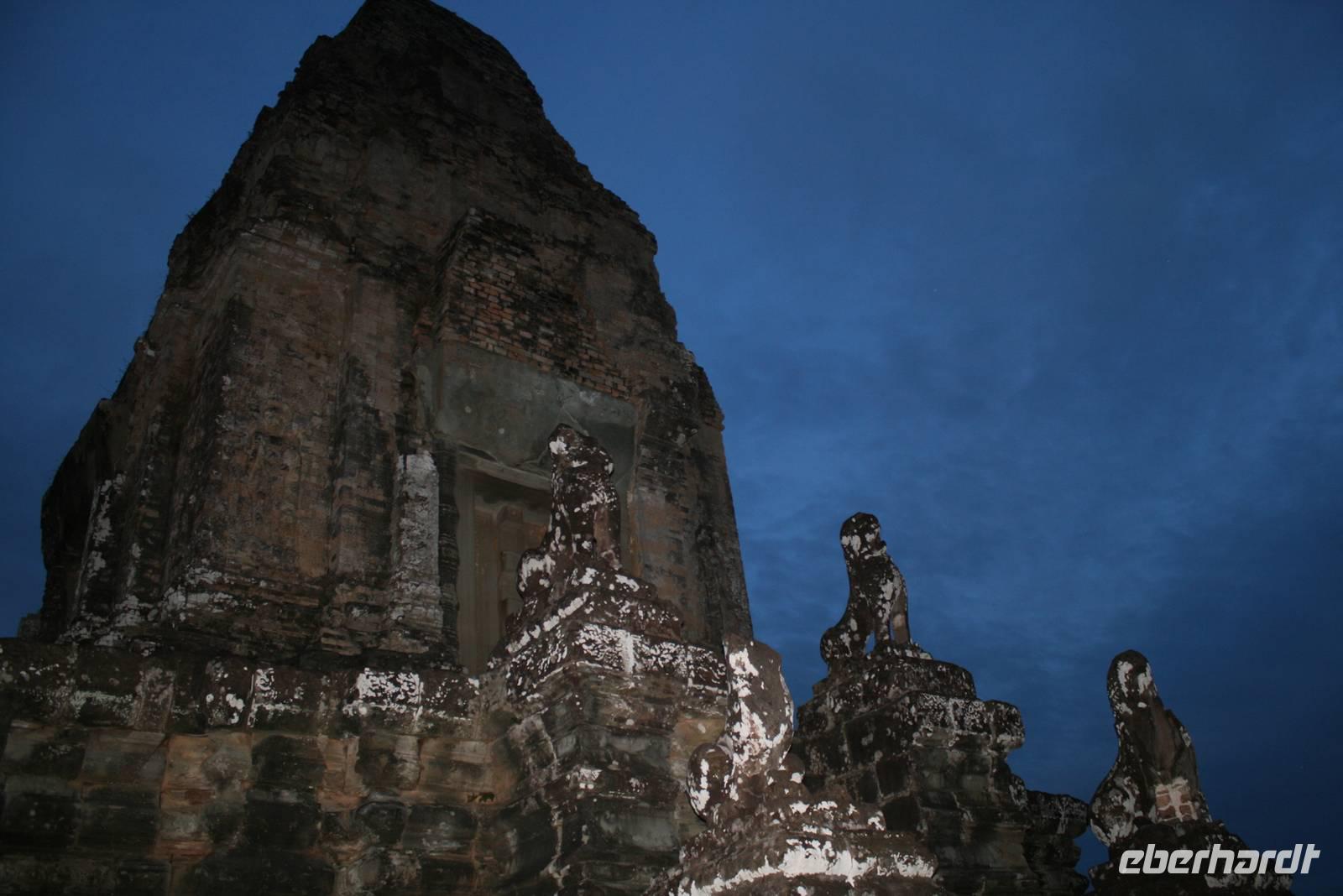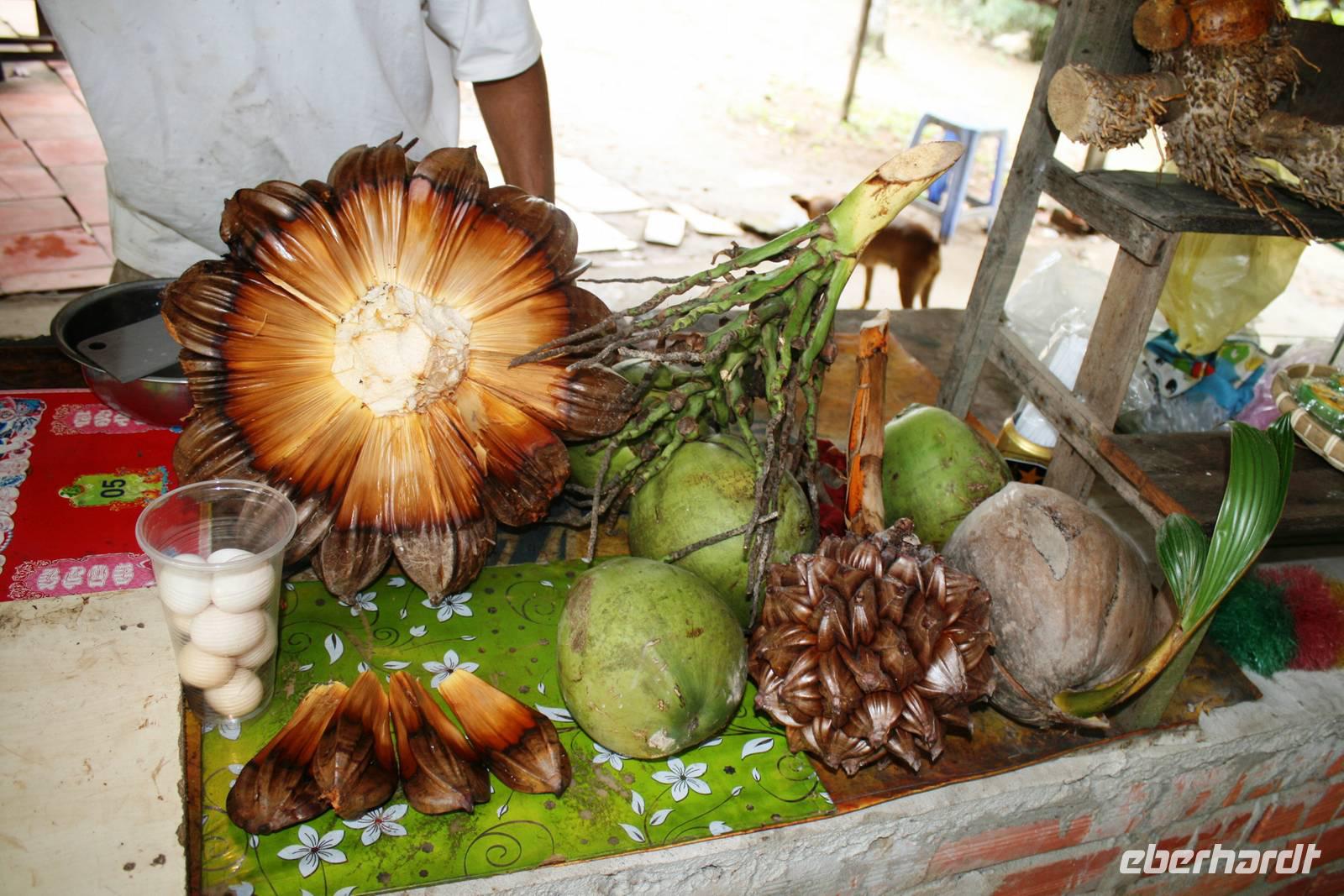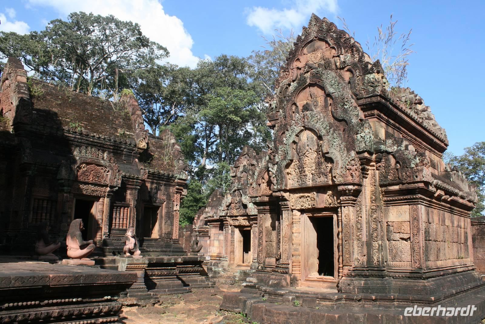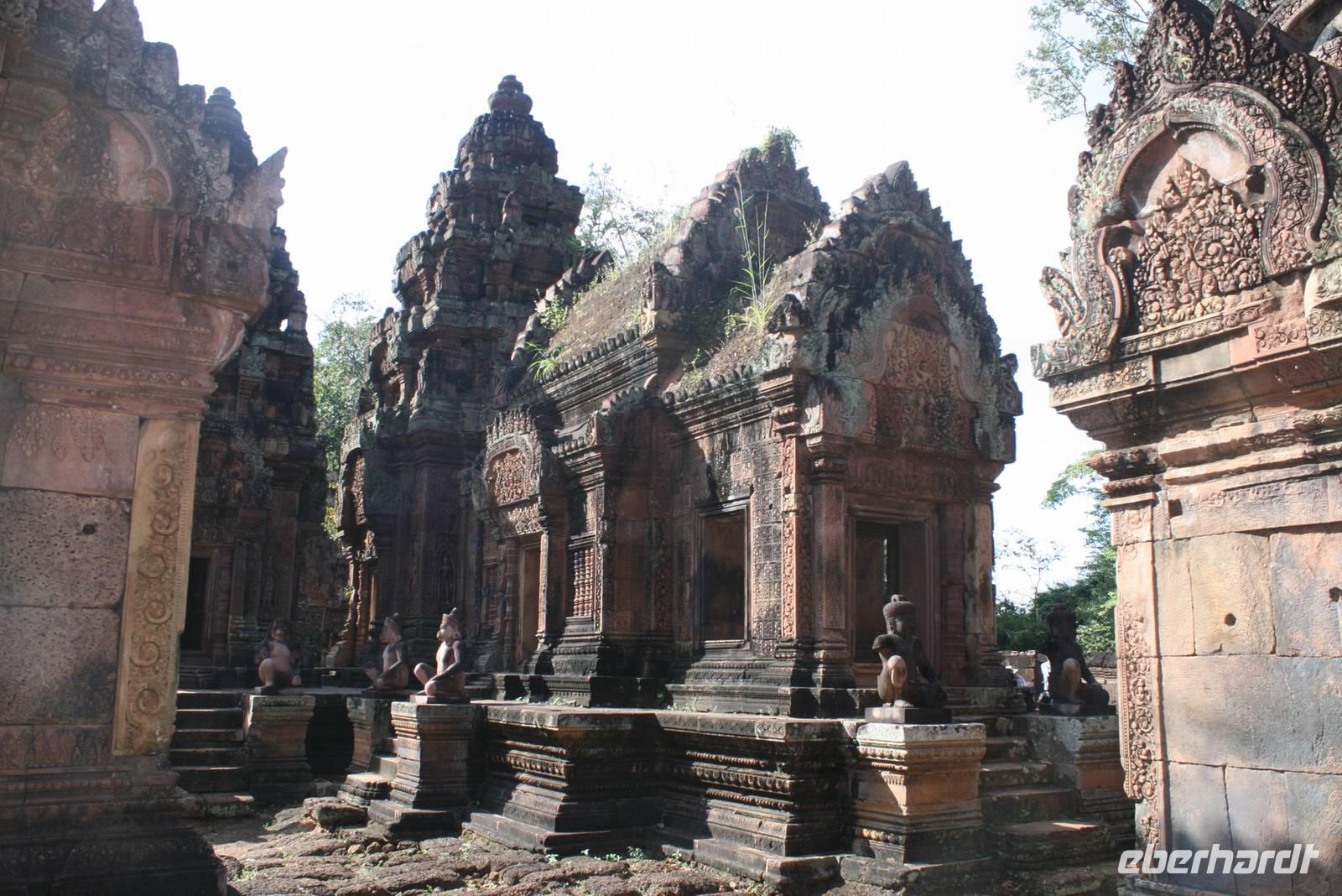Heute stand der berühmte Dschungeltempel Ta Prohm auf unserem Programm. Die Tempelanlage war vom Dschungel völlig überwuchert und wurde so erst ca. 600 Jahre nach ihrer Entstehung von Europäern entdeckt. Überdimensionale Baumwurzeln verschlingen sich mit den wuchtigen Steinmauern und halten diese fest umschlungen, damit sie nicht auseinander fallen. Einfach beeindruckend, unsere Fotoapparate klickten im Dauertakt. Im Sekundentakt strömten dann auch die Touristen in die Anlage. Im Gedränge ging kurzzeitig ein Gast verloren, der aber nach eigenen Entdeckungen wieder wohlbehalten zur Gruppe fand. Übrigens: Wußten Sie schon, dass der Tempel als Kulisse im Tomb Raider Kinohit "Lara Croft" mit Angelina Jolie diente! Anschließend fuhren wir mit dem Bus ca. 30 km zu einem der schönsten Tempelanlagen Banteay Srei, auch Frauentempel genannt. Er ist zwar einer der kleinsten auf dem Gebiet von Angkor, aber der am reich verziertesten Tempel - ein architektonisches Kleinod. Minh Thol verstand es wieder hervorragend, uns die filigranen Ornamente und Relief im rosa schimmernden Gestein zu erklären. Auf unserem Rückweg besuchten wir noch ein kleines Dorf, dessen Bewohner sich mit der Herstellung von Palmzucker ihren Lebensunterhalt verdienten. Minh Thol war auch hier wieder mit seinen Erklärungen und vollem Körpereinsatz dabei, so dass einige Werkzeuge anschließend repariert werden mußten. In der glänzenden Spätnachmittagssonne verabschiedeten wir uns von den Tempeln und fuhren zum Hotel zurück. Eine winzige Schar war noch nicht der Tempel müde und startete noch einmal in Tuk Tuks nach Angkor, um den Sonnenuntergang auf dem Tempel Pre Rup zu erleben. Trotz Erstürmung der hohen Tempelstufen im Speedy-Gonzales-Tempo war die Sonne doch schneller als wir. Oben waren wir dennoch fasziniert von der mystischen Stimmung und Atmosphäre. Das letzte Abendessen wurde uns im Hotel serviert und es gab mal keine asiatische Küche mit Nudeln, Reis und gebratenem Gemüse. Wir speisten europäisch, um uns langsam wieder an zu Hause zu gewöhnen. Unsere erlebnisreiche Reise war nun fast zu Ende, mit einem Eberhardt-Getränk liessen wir sie noch einmal Revue passieren.