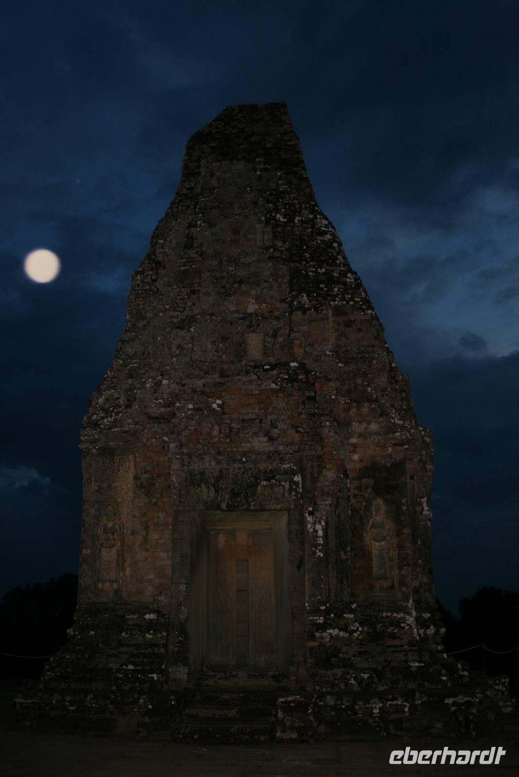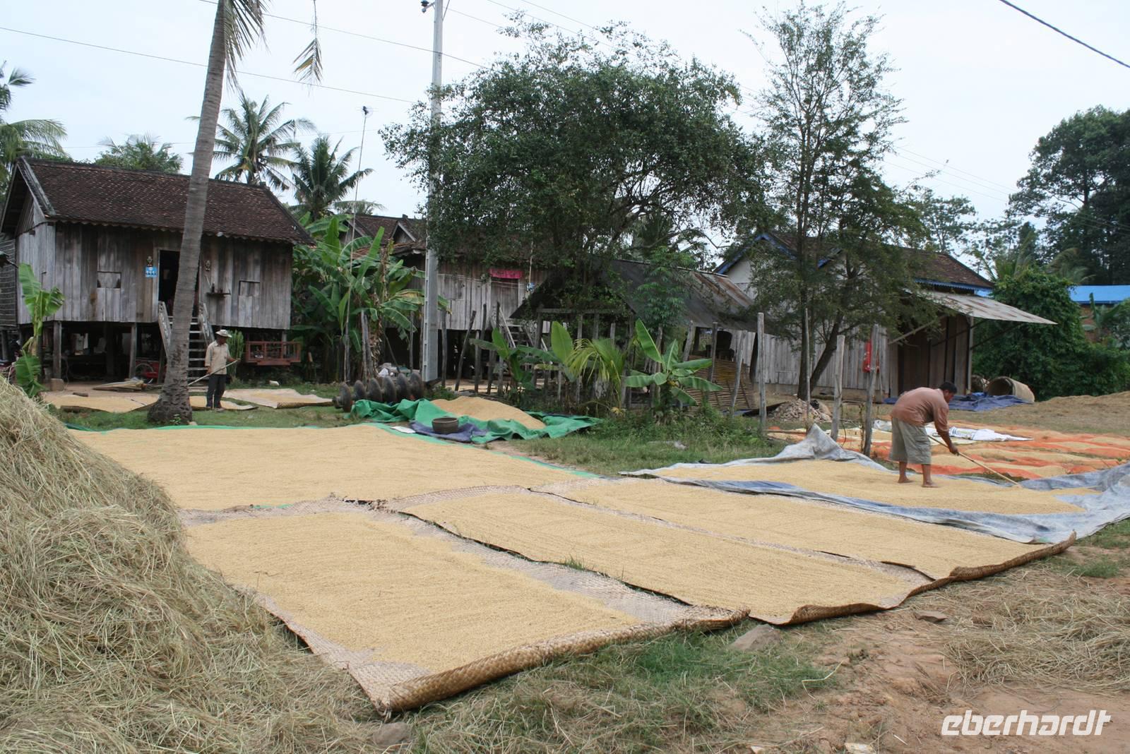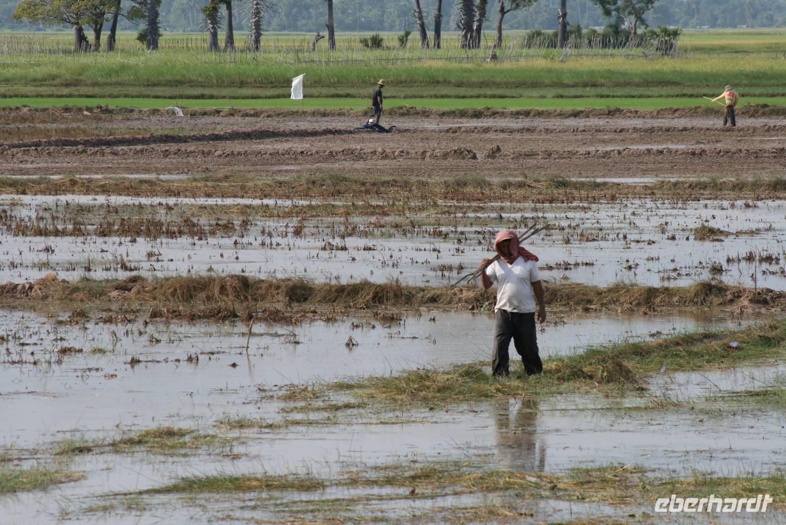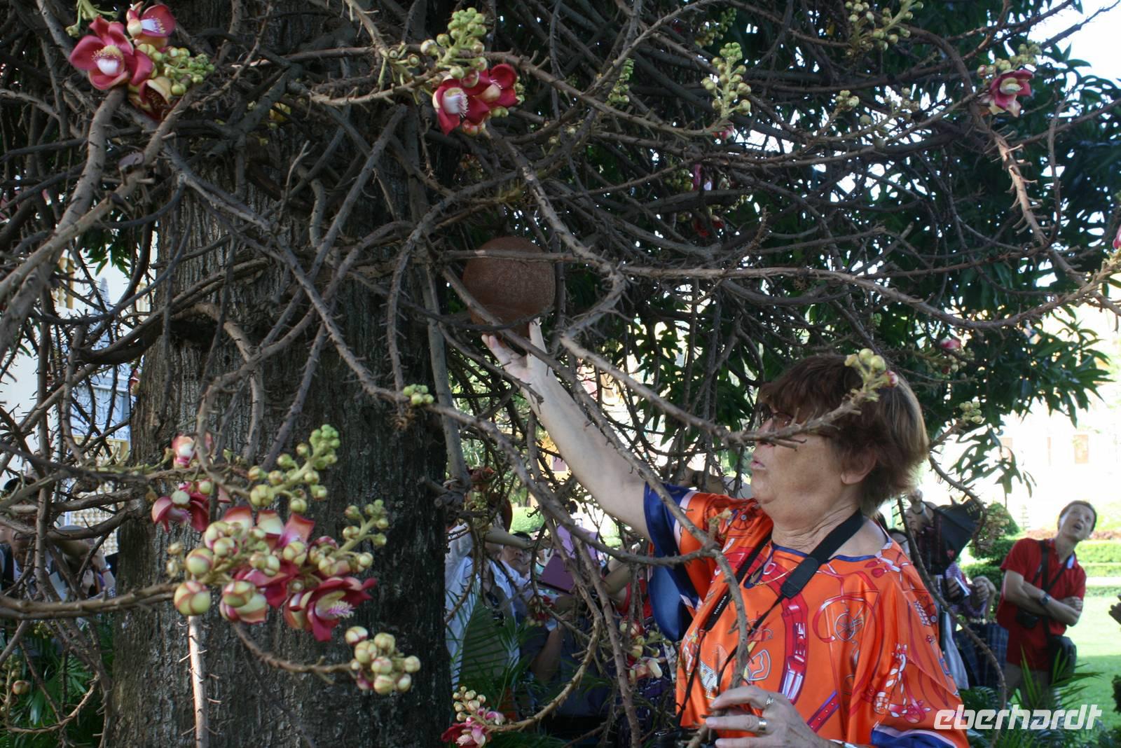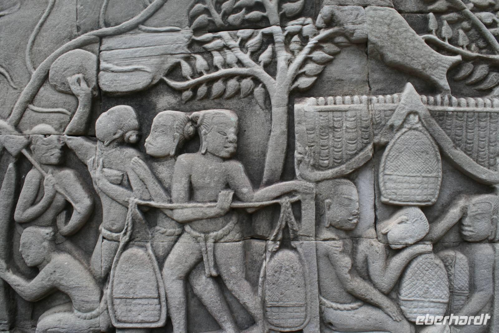 Heute stand der berühmte Dschungeltempel Ta Prohm auf unserem Programm. Die Tempelanlage war vom Dschungel völlig überwuchert und wurde so erst ca. 600 Jahre nach ihrer Entstehung von Europäern entdeckt. Überdimensionale Baumwurzeln verschlingen sich mit den wuchtigen Steinmauern und halten diese fest umschlungen, damit sie nicht auseinander fallen. Einfach beeindruckend, unsere Fotoapparate klickten im Dauertakt. Im Sekundentakt strömten dann auch die Touristen in die Anlage. Im Gedränge ging kurzzeitig ein Gast verloren, der aber nach eigenen Entdeckungen wieder wohlbehalten zur Gruppe fand. Übrigens: Wußten Sie schon, dass der Tempel als Kulisse im Tomb Raider Kinohit "Lara Croft" mit Angelina Jolie diente! Anschließend fuhren wir mit dem Bus ca. 30 km zu einem der schönsten Tempelanlagen Banteay Srei, auch Frauentempel genannt. Er ist zwar einer der kleinsten auf dem Gebiet von Angkor, aber der am reich verziertesten Tempel - ein architektonisches Kleinod. Minh Thol verstand es wieder hervorragend, uns die filigranen Ornamente und Relief im rosa schimmernden Gestein zu erklären. Auf unserem Rückweg besuchten wir noch ein kleines Dorf, dessen Bewohner sich mit der Herstellung von Palmzucker ihren Lebensunterhalt verdienten. Minh Thol war auch hier wieder mit seinen Erklärungen und vollem Körpereinsatz dabei, so dass einige Werkzeuge anschließend repariert werden mußten. In der glänzenden Spätnachmittagssonne verabschiedeten wir uns von den Tempeln und fuhren zum Hotel zurück. Eine winzige Schar war noch nicht der Tempel müde und startete noch einmal in Tuk Tuks nach Angkor, um den Sonnenuntergang auf dem Tempel Pre Rup zu erleben. Trotz Erstürmung der hohen Tempelstufen im Speedy-Gonzales-Tempo war die Sonne doch schneller als wir. Oben waren wir dennoch fasziniert von der mystischen Stimmung und Atmosphäre. Das letzte Abendessen wurde uns im Hotel serviert und es gab mal keine asiatische Küche mit Nudeln, Reis und gebratenem Gemüse. Wir speisten europäisch, um uns langsam wieder an zu Hause zu gewöhnen. Unsere erlebnisreiche Reise war nun fast zu Ende, mit einem Eberhardt-Getränk liessen wir sie noch einmal Revue passieren.