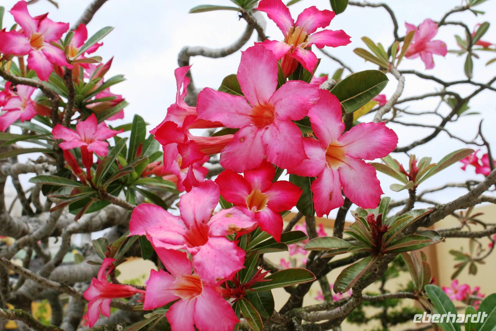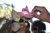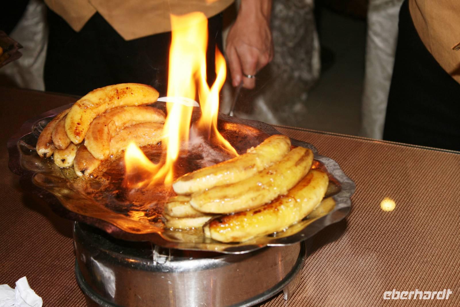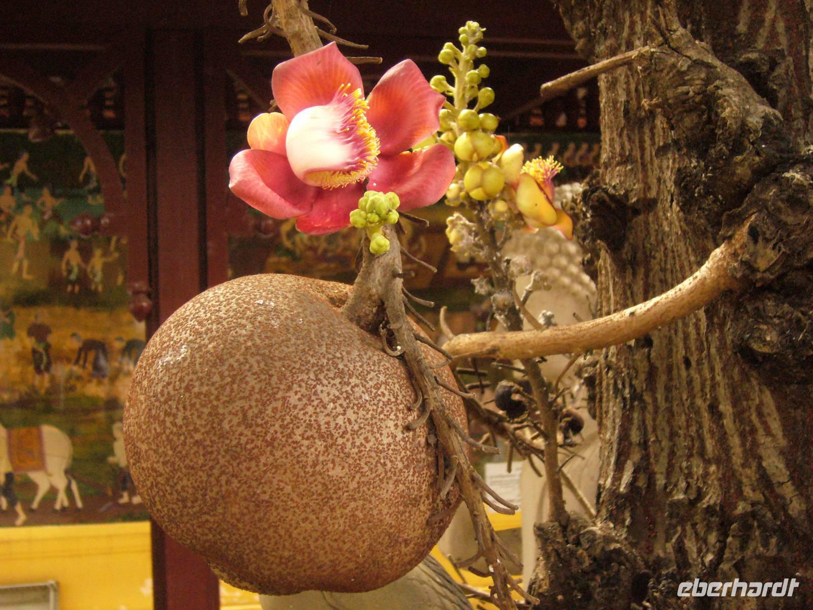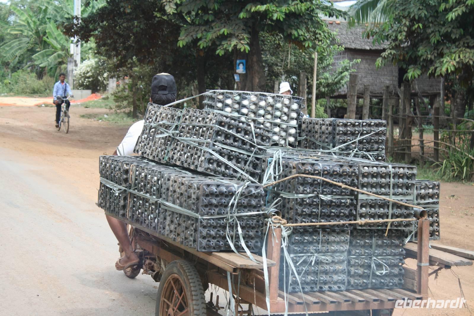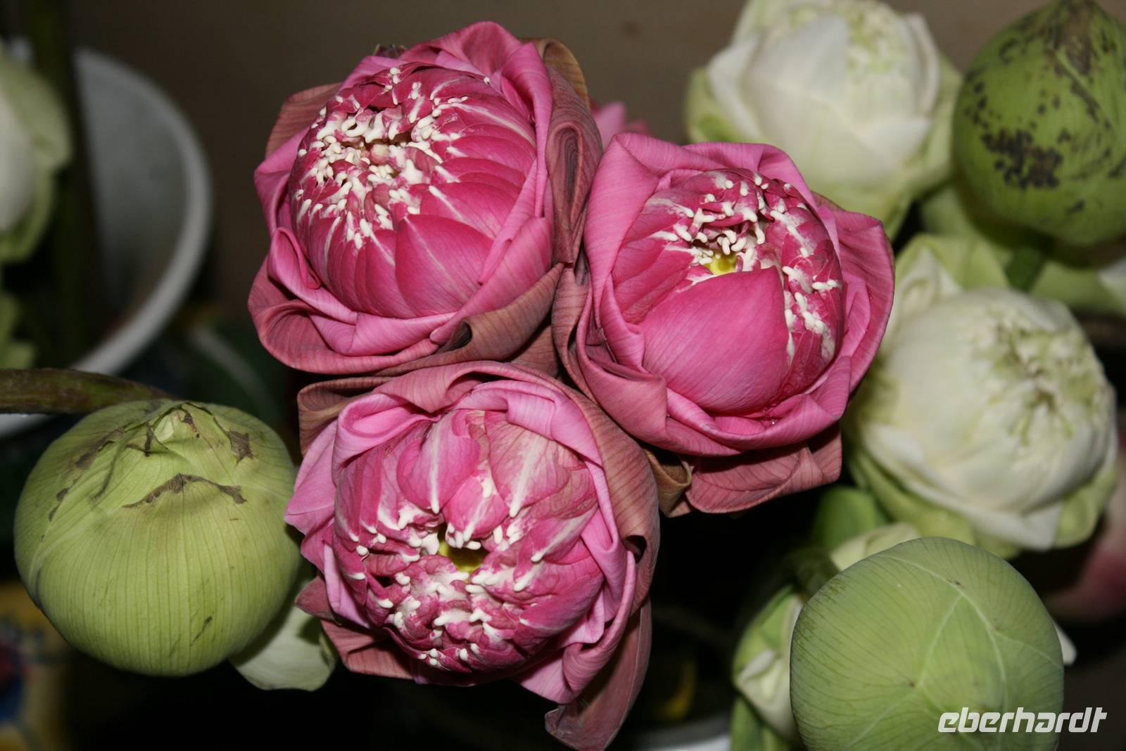 Heute stand der berühmte Dschungeltempel Ta Prohm auf unserem Programm. Die Tempelanlage war vom Dschungel völlig überwuchert und wurde so erst ca. 600 Jahre nach ihrer Entstehung von Europäern entdeckt. Überdimensionale Baumwurzeln verschlingen sich mit den wuchtigen Steinmauern und halten diese fest umschlungen, damit sie nicht auseinander fallen. Einfach beeindruckend, unsere Fotoapparate klickten im Dauertakt. Im Sekundentakt strömten dann auch die Touristen in die Anlage. Im Gedränge ging kurzzeitig ein Gast verloren, der aber nach eigenen Entdeckungen wieder wohlbehalten zur Gruppe fand. Übrigens: Wußten Sie schon, dass der Tempel als Kulisse im Tomb Raider Kinohit "Lara Croft" mit Angelina Jolie diente! Anschließend fuhren wir mit dem Bus ca. 30 km zu einem der schönsten Tempelanlagen Banteay Srei, auch Frauentempel genannt. Er ist zwar einer der kleinsten auf dem Gebiet von Angkor, aber der am reich verziertesten Tempel - ein architektonisches Kleinod. Minh Thol verstand es wieder hervorragend, uns die filigranen Ornamente und Relief im rosa schimmernden Gestein zu erklären. Auf unserem Rückweg besuchten wir noch ein kleines Dorf, dessen Bewohner sich mit der Herstellung von Palmzucker ihren Lebensunterhalt verdienten. Minh Thol war auch hier wieder mit seinen Erklärungen und vollem Körpereinsatz dabei, so dass einige Werkzeuge anschließend repariert werden mußten. In der glänzenden Spätnachmittagssonne verabschiedeten wir uns von den Tempeln und fuhren zum Hotel zurück. Eine winzige Schar war noch nicht der Tempel müde und startete noch einmal in Tuk Tuks nach Angkor, um den Sonnenuntergang auf dem Tempel Pre Rup zu erleben. Trotz Erstürmung der hohen Tempelstufen im Speedy-Gonzales-Tempo war die Sonne doch schneller als wir. Oben waren wir dennoch fasziniert von der mystischen Stimmung und Atmosphäre. Das letzte Abendessen wurde uns im Hotel serviert und es gab mal keine asiatische Küche mit Nudeln, Reis und gebratenem Gemüse. Wir speisten europäisch, um uns langsam wieder an zu Hause zu gewöhnen. Unsere erlebnisreiche Reise war nun fast zu Ende, mit einem Eberhardt-Getränk liessen wir sie noch einmal Revue passieren.