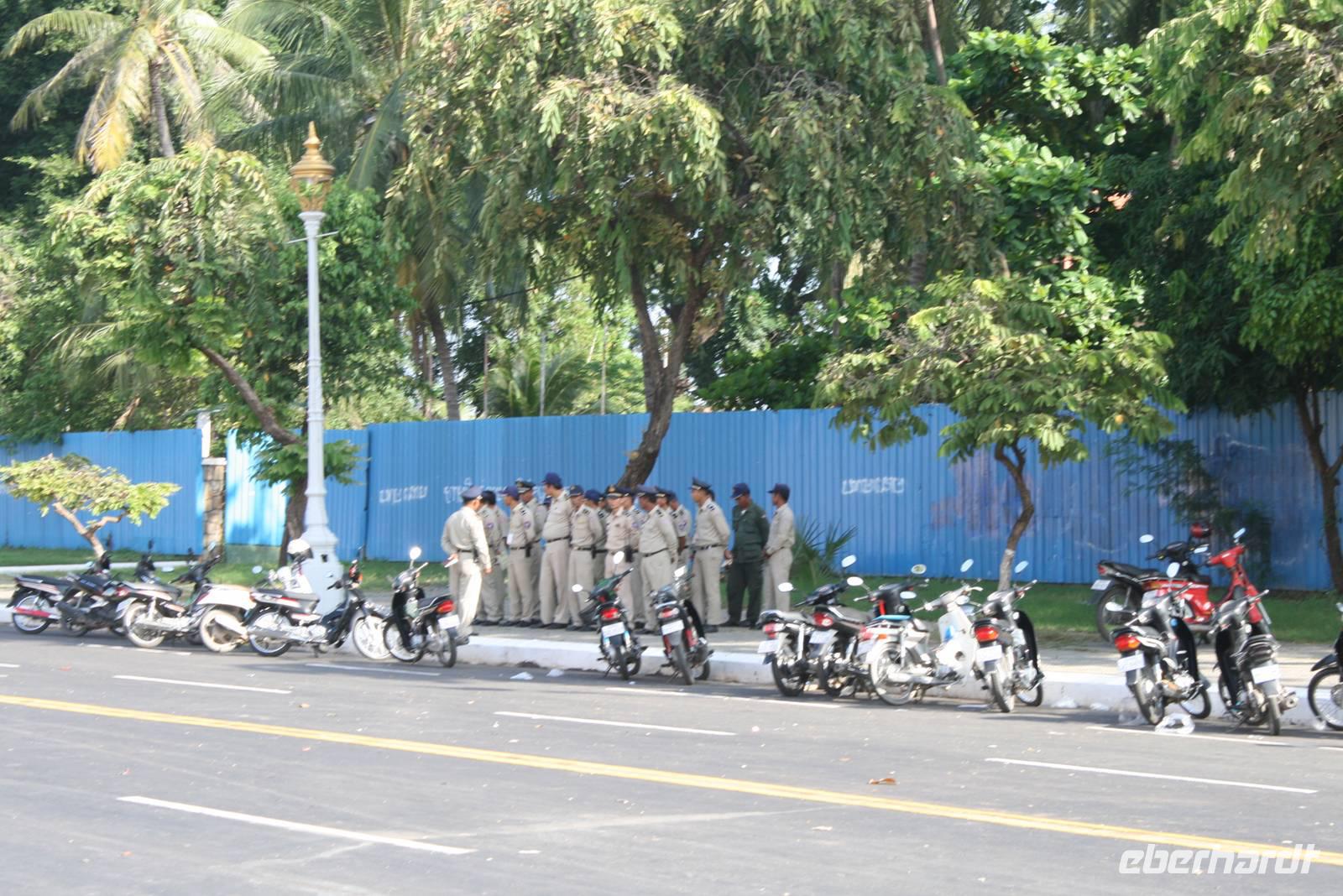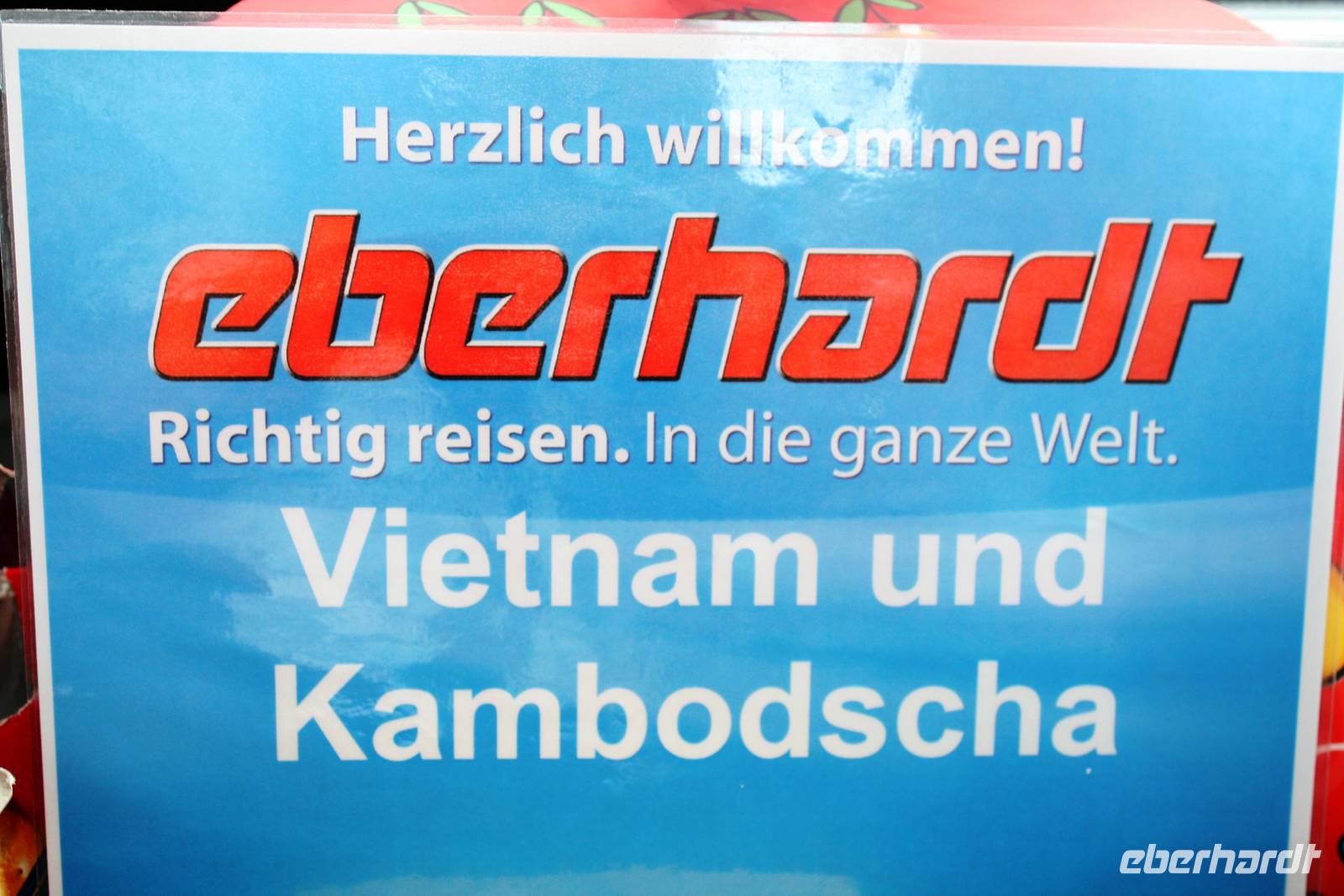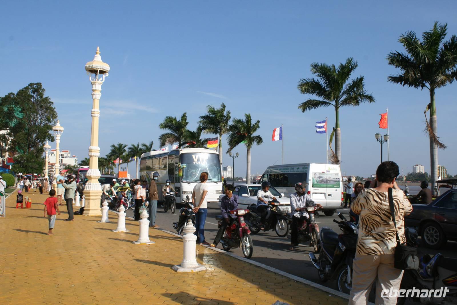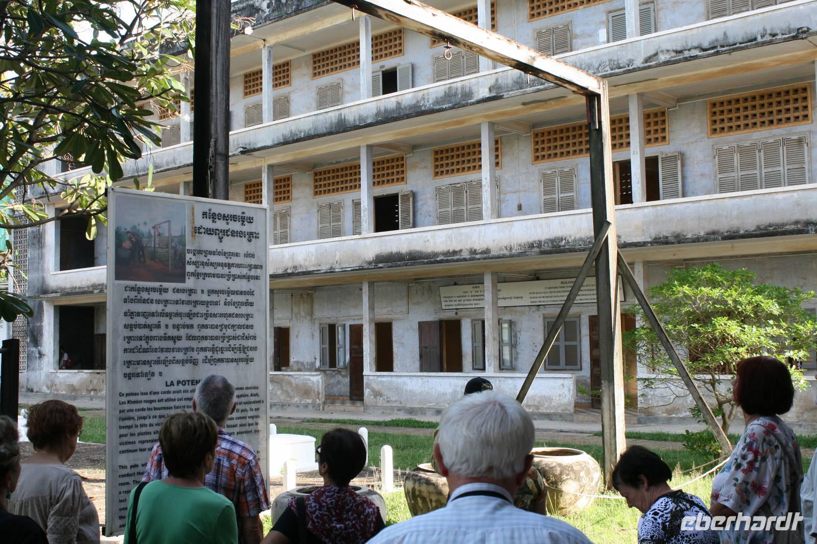 Der frühe Vogel fängt den Wurm - Heute mußten wir zeitig aufstehen, denn wir hatten eine fast 5stündige Fahrt mit dem Schnellboot auf dem Mekong nach Phnom Penh in Kambodscha vor uns. Mit einem musikalischen Ständchen verabschiedeten wir uns offiziell von unserer liebgewonnen Huong und unseren Busfahrern. Dann ging es zum Hafen, wo uns die nette Hang, die uns bis Phnom Penh gegleitete, bereits erwartete und in Schwimmwesten hüllte. Unsere Koffer wurden unter Deck verladen, noch ein kurzes WinkeWinke und schon starteten wir. Ca. 140 km Wasserweg trennten uns von der kambodschanischen Hauptstadt. Das Boot war relativ komfortabel und neben 4 anderen Gästen hatten wir das Schiff fest in Eberhardt-Hand. Dann der Schreck an Deck, ein blass gewordener Reisegast vermisste seine Kamera. Also schnell unsere Huong angerufen, dass sie gleich im Bus und Hotel nachschaute. Danke auch für das Verständnis der Crew, die sofort zum Hafen zurück düste. Am Kai stand eine aufgeregte Huong ohne Kamera. Annett sprang von Bord und überzeugte sich noch einmal selbst im Bus, während dessen Huong noch einmal mit dem Hotel telefonierte. Alles ohne Erfolg. Zurück an Bord sahen wir einen glücklich strahlenden Reisegast mit seiner Kamera, die sich in den Tiefen seiner Hosentasche versteckt hatte. Puh, alles paletti und die bildhaften Urlaubsbilder der vergangenen Tage waren gerettet. Ja, die moderne Technick wird immer kleiner, früher waren die Kameras noch eine zu tragende "Last" und hätten nie in Hosentaschen gepasst! Also nun begann die Fahrt von neuem. Unterwegs wurden wir mit Getränken, Obst und einem leckeren Imbiss bewirtet. Hang und Annett übernahmen den Bordservice. An der vietnamesischen Grenze mußten alle kurz aussteigen, die Pause nutzten wir gleich für einen Besuch in der "Halle der Harmonie". Dann ein kleines Stück zur kambodschanischen Grenze, wo wir Dank der perfekten vorabendlichen Vorbereitungen unser Boot nicht verlassen und nicht an den Schaltern anstehen mußten. Hang holte nur unsere abgestempelten Pässe, die wir dann an Bord verteilten. Kurz nach 12 Uhr erreichten wir Phnom Penh, wo uns unser neuer Guide Chan Thou in Empfang nahm. Nach kurzer Fahrt waren wir bereits in unserem Hotel. Aufgrund der frühen Anreisezeit mußten einige Gäste noch etwas auf ihre Zimmer warten. Bis zum Abendessen hatten wir freie Zeit, die wir auch zum Entspannen am Swimming Pool nutzen konnten. Doch fast die gesamte Gruppe entschied sich, das berüchtigte Völkermordgefängnis Tuol Sleng zu besuchen, wo die für uns nicht vorstellbare Schreckensherrschaft der roten Khmer sehr bildlich dokumentiert ist. Vorher war es eine höhere Schule, bis es Diktator Pol Pot in seinem Wahn zur Folterkammer ausbaute. Unser Guide Chan Tou hat die Schreckensherrschaft der roten Khmer selbst erlebt: schwerste Kinderzwangsarbeit, getrennt von seinen Eltern, leisten müssen und viele Verwandte verloren. Seine authentischen Erzählungen während der Besichtigung gingen uns sehr unter die Haut, ebenso die persönliche Begegnung mit Chum Mey, einem der wenigen Überlebenden des KZs. Was da, Ende der 80er Jahre, keine 15 Jahre vor dem Mauerfall unter dem Deckmantel "Kommunismus" geschah, ist schwer begreifbar. Über 3 Mio Kambodschaner kamen ums Leben. Wir waren tief bewegt. Das Abendessen nahmen wir im bekannten Restaurant "Khmer Surin" ein. Das Essen schmeckte, aber die Getränkepreise gefielen uns weniger. Am Ende des erlebnisreichen Tages stossen wir mit "Bing Bing, Bing" und Mekong Whisky an.