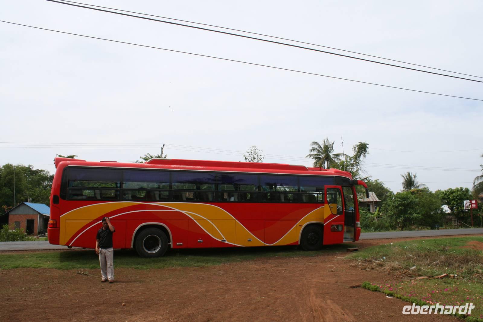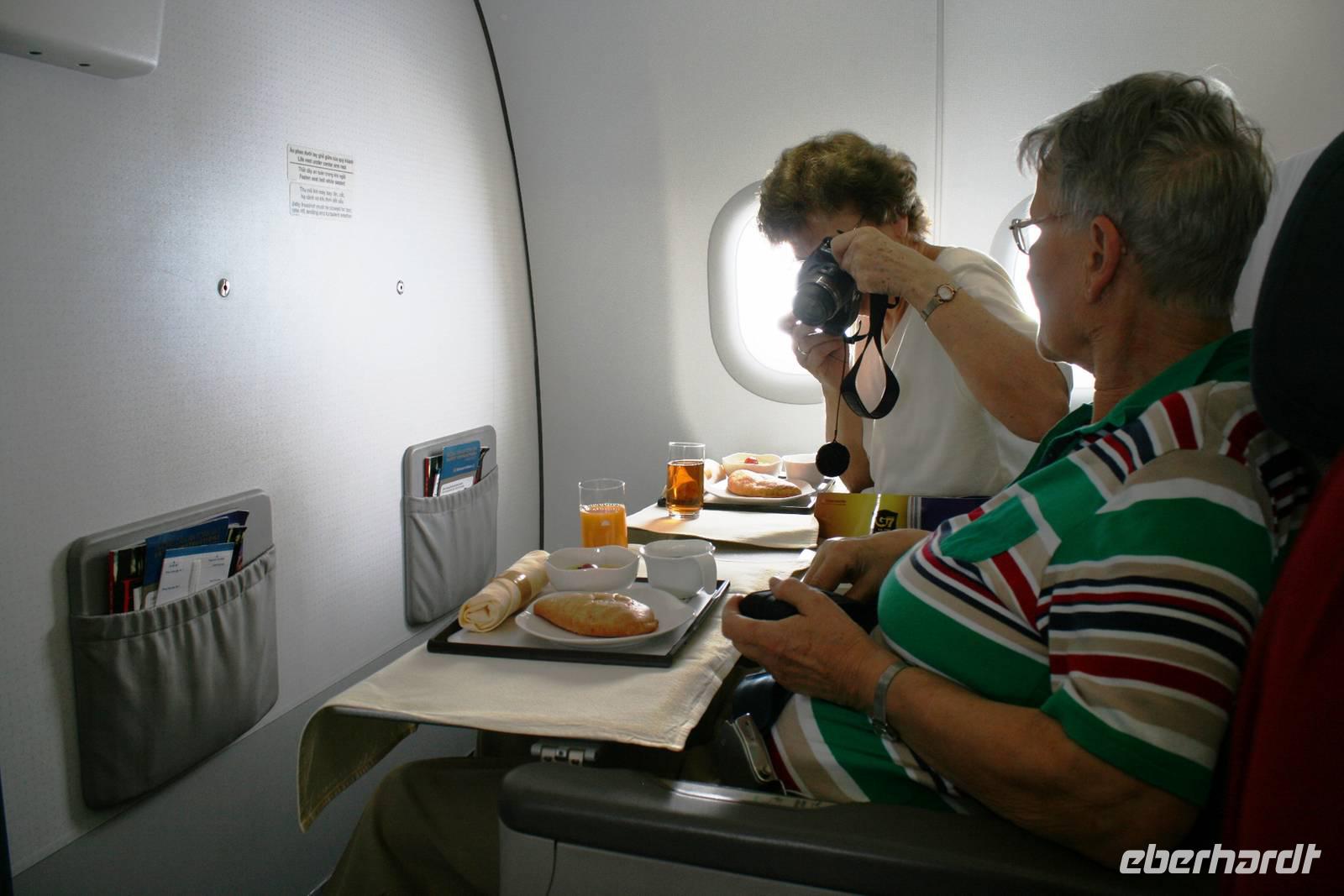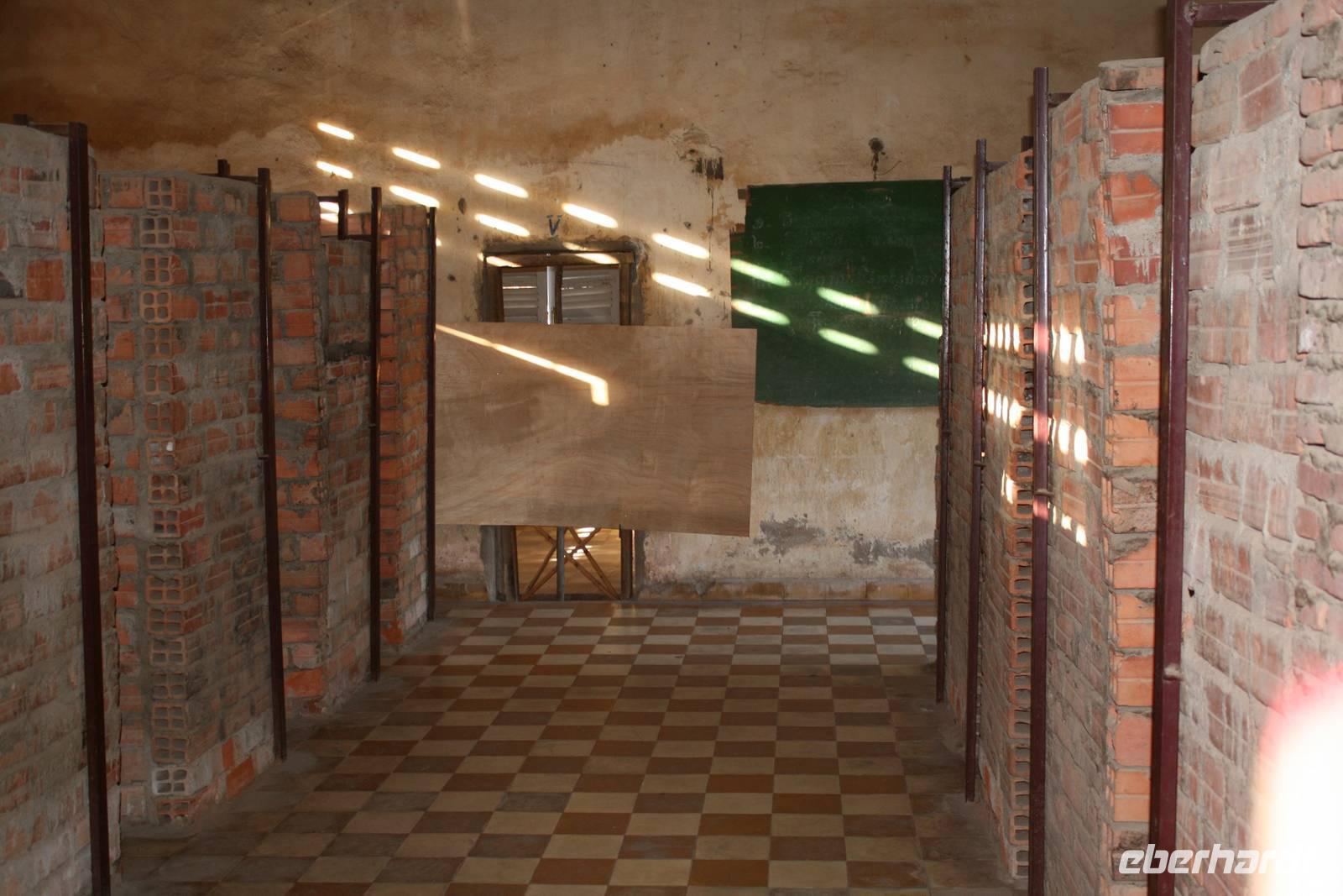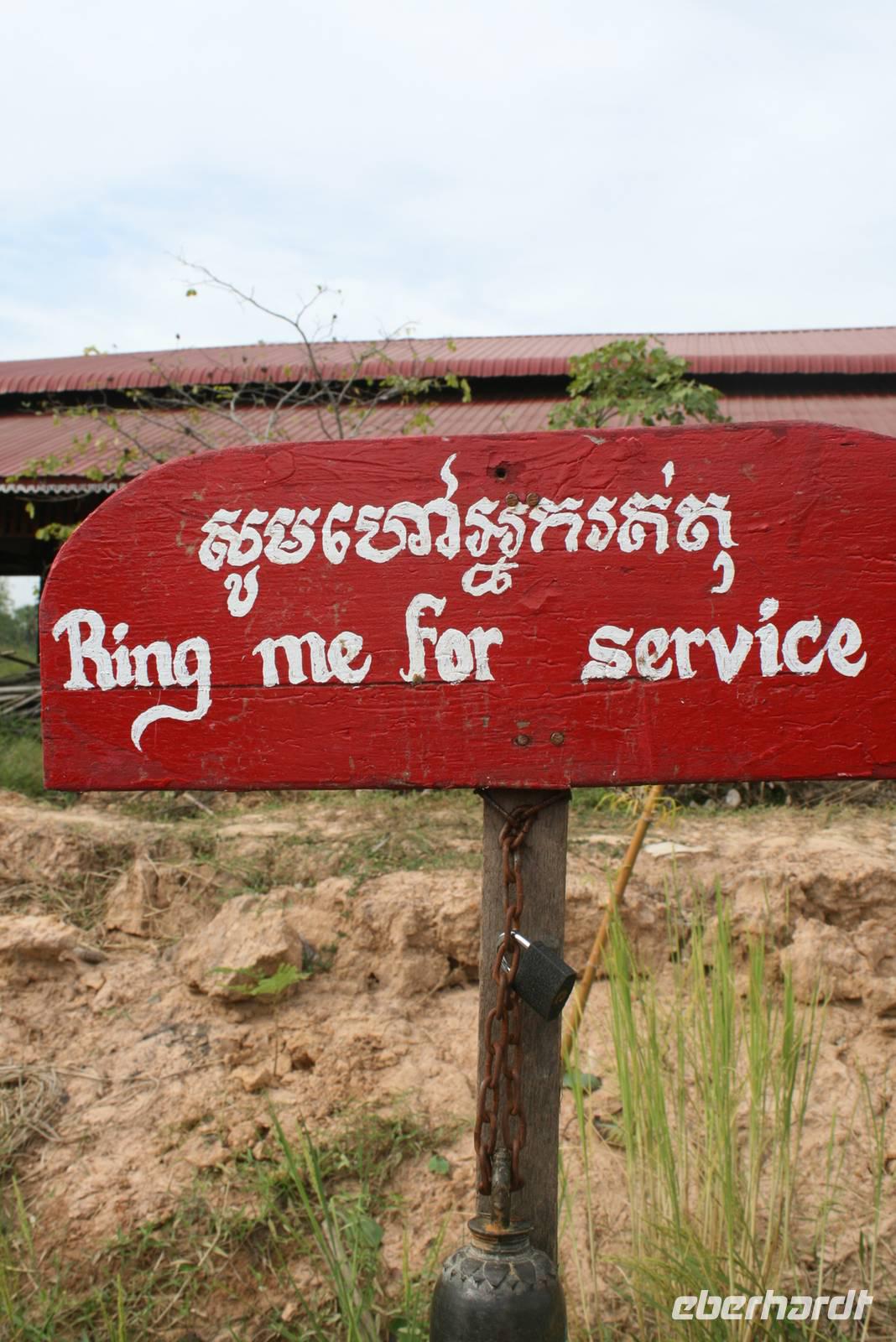 Der frühe Vogel fängt den Wurm - Heute mußten wir zeitig aufstehen, denn wir hatten eine fast 5stündige Fahrt mit dem Schnellboot auf dem Mekong nach Phnom Penh in Kambodscha vor uns. Mit einem musikalischen Ständchen verabschiedeten wir uns offiziell von unserer liebgewonnen Huong und unseren Busfahrern. Dann ging es zum Hafen, wo uns die nette Hang, die uns bis Phnom Penh gegleitete, bereits erwartete und in Schwimmwesten hüllte. Unsere Koffer wurden unter Deck verladen, noch ein kurzes WinkeWinke und schon starteten wir. Ca. 140 km Wasserweg trennten uns von der kambodschanischen Hauptstadt. Das Boot war relativ komfortabel und neben 4 anderen Gästen hatten wir das Schiff fest in Eberhardt-Hand. Dann der Schreck an Deck, ein blass gewordener Reisegast vermisste seine Kamera. Also schnell unsere Huong angerufen, dass sie gleich im Bus und Hotel nachschaute. Danke auch für das Verständnis der Crew, die sofort zum Hafen zurück düste. Am Kai stand eine aufgeregte Huong ohne Kamera. Annett sprang von Bord und überzeugte sich noch einmal selbst im Bus, während dessen Huong noch einmal mit dem Hotel telefonierte. Alles ohne Erfolg. Zurück an Bord sahen wir einen glücklich strahlenden Reisegast mit seiner Kamera, die sich in den Tiefen seiner Hosentasche versteckt hatte. Puh, alles paletti und die bildhaften Urlaubsbilder der vergangenen Tage waren gerettet. Ja, die moderne Technick wird immer kleiner, früher waren die Kameras noch eine zu tragende "Last" und hätten nie in Hosentaschen gepasst! Also nun begann die Fahrt von neuem. Unterwegs wurden wir mit Getränken, Obst und einem leckeren Imbiss bewirtet. Hang und Annett übernahmen den Bordservice. An der vietnamesischen Grenze mußten alle kurz aussteigen, die Pause nutzten wir gleich für einen Besuch in der "Halle der Harmonie". Dann ein kleines Stück zur kambodschanischen Grenze, wo wir Dank der perfekten vorabendlichen Vorbereitungen unser Boot nicht verlassen und nicht an den Schaltern anstehen mußten. Hang holte nur unsere abgestempelten Pässe, die wir dann an Bord verteilten. Kurz nach 12 Uhr erreichten wir Phnom Penh, wo uns unser neuer Guide Chan Thou in Empfang nahm. Nach kurzer Fahrt waren wir bereits in unserem Hotel. Aufgrund der frühen Anreisezeit mußten einige Gäste noch etwas auf ihre Zimmer warten. Bis zum Abendessen hatten wir freie Zeit, die wir auch zum Entspannen am Swimming Pool nutzen konnten. Doch fast die gesamte Gruppe entschied sich, das berüchtigte Völkermordgefängnis Tuol Sleng zu besuchen, wo die für uns nicht vorstellbare Schreckensherrschaft der roten Khmer sehr bildlich dokumentiert ist. Vorher war es eine höhere Schule, bis es Diktator Pol Pot in seinem Wahn zur Folterkammer ausbaute. Unser Guide Chan Tou hat die Schreckensherrschaft der roten Khmer selbst erlebt: schwerste Kinderzwangsarbeit, getrennt von seinen Eltern, leisten müssen und viele Verwandte verloren. Seine authentischen Erzählungen während der Besichtigung gingen uns sehr unter die Haut, ebenso die persönliche Begegnung mit Chum Mey, einem der wenigen Überlebenden des KZs. Was da, Ende der 80er Jahre, keine 15 Jahre vor dem Mauerfall unter dem Deckmantel "Kommunismus" geschah, ist schwer begreifbar. Über 3 Mio Kambodschaner kamen ums Leben. Wir waren tief bewegt. Das Abendessen nahmen wir im bekannten Restaurant "Khmer Surin" ein. Das Essen schmeckte, aber die Getränkepreise gefielen uns weniger. Am Ende des erlebnisreichen Tages stossen wir mit "Bing Bing, Bing" und Mekong Whisky an.