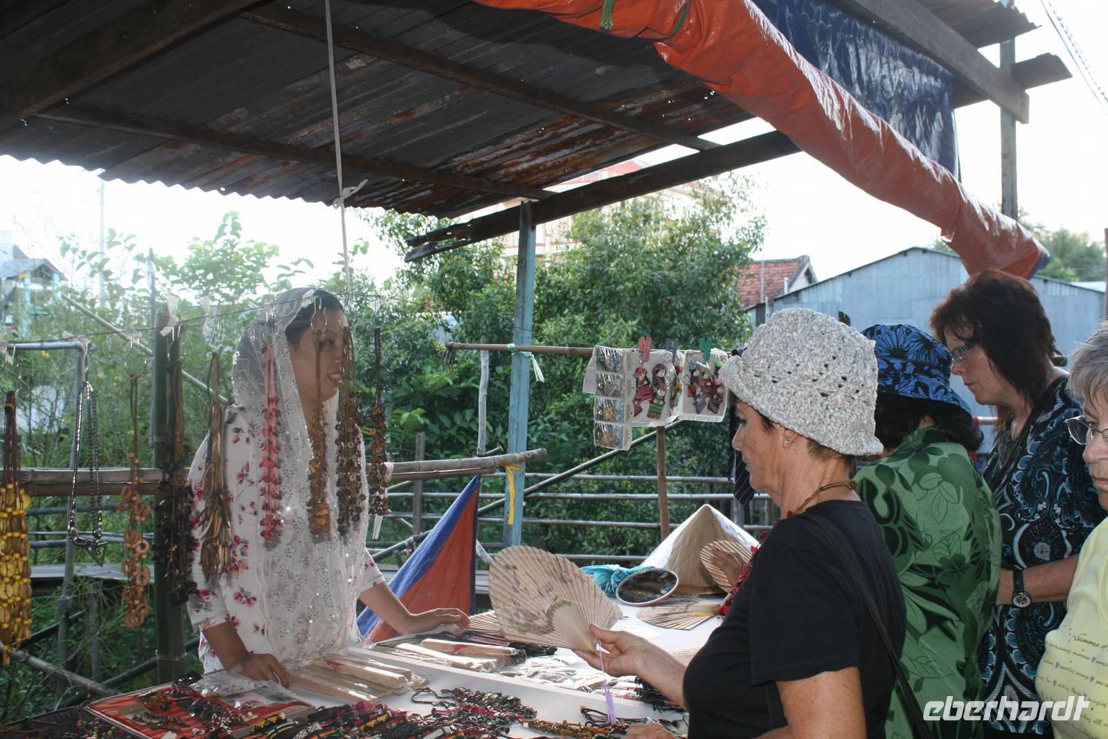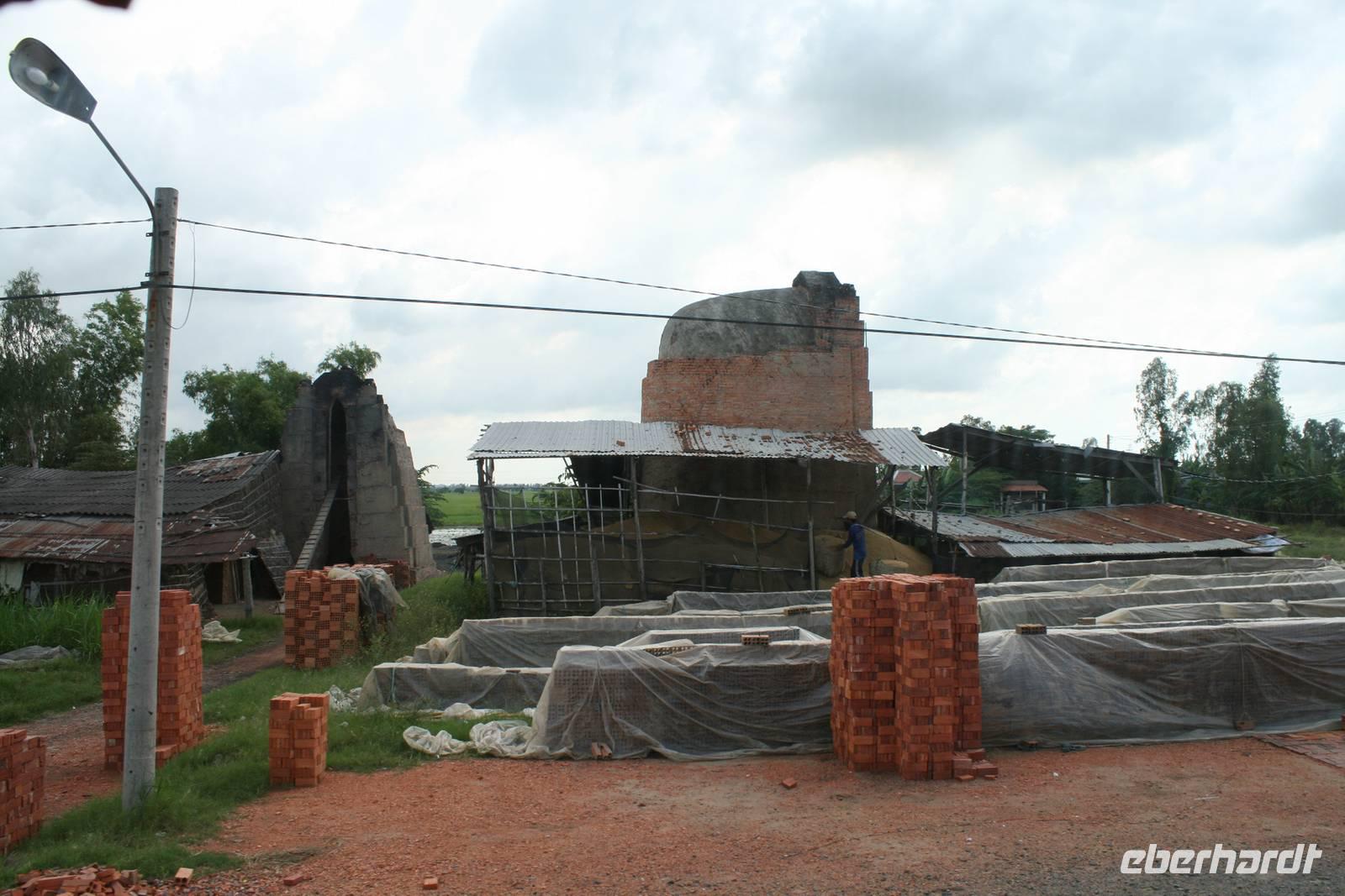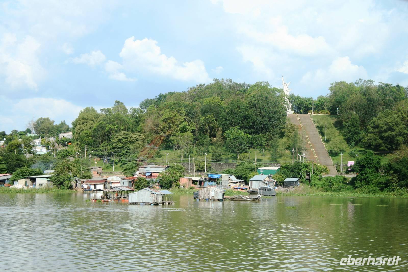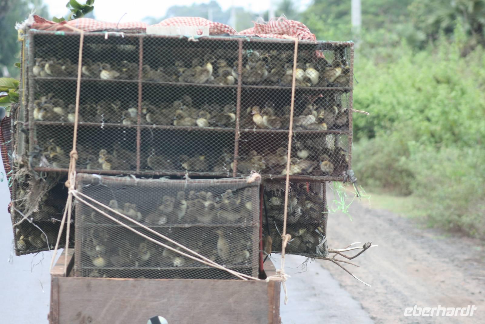 Nach einem relativ zeitigen Frühstück verstauten wir unsere Koffer im Bus und spazierten zum Fluss, von wo wir mit einem Boot zum schwimmenden Markt nach Phung Hiep schipperten. Entspannt beobachteten wir das geschäftige Treiben auf dem Wasser. Groß- und Kleinhändler mit entsprechende Booten verhandelten und verluden ihre Waren: Früchte, Gemüse und Haushaltwaren. Zwischendurch "schwimmende" Kantinen, die für das leibliche Wohl sorgten. Familien, die bereits ihre Geschäfte erledigt hatten und auf ihren Booten frühstückten. Eine herrliche Szenerie. In Cai Rang gingen wir von Bord und durchstöberten den lokalen "Frischemarkt", hier gab es so ziemlich alles: Alles vom Schwein, alles vom Fisch und auch gepellte Frösche. Nach so viel Getümmel am Morgen genossen wir die ruhige Weiterfahrt im Bus. Zur Mittagszeit kehrten wir ins Crocodile Land ein. Nachdem wir die Krokodilfarm unter die Lupe genommen hatten und bei deren Fütterung dabei waren, stand auch unsere "Fütterung" auf dem Programm. Im angeschlossenen Restaurant aßen wir zu Mittag, einige Gäste natürlich Krokodil. Unterwegs hielten wir noch einmal in einem Dorf, das für seine Ziegelbrennerei bekannt ist und durchforsten das "Firmengelände". Am Nachmittag haben wir für unsere Gäste einen zusätzlichen Ausflug organisiert. Zunächst fahren wir zum Lady Xu Tempel. Auf der Fahrt dorthin sehen wir viele Schilder, auf denen mit "Spanferkel" geworben wird. Ja richtig, der Glücksgöttin werden gebratene Schweinchen geopfert, zumindest für ca. 2 h, später isst man sie dann selbst beim Familienpicknick. Chau Doc, unsere letzte Station in Vietnam, lebt von der Fischzucht. Ein großes Pangasius Denkmal steht am Flussufer. Vo da aus begannen wir eine Bootsfahrt zu einer Familie, die diesen Fisch unter ihrem schwimmenden "Grundstück" züchtet, sehr interessant. Danach besuchten wir ein Cham Dorf und waren beim ersten Anblick sichtlich erschrocken über die dürftigen Lebensbedingungen der ethnischen Minderheit islamischen Glaubens. Doch beim weiteren Spaziergang durch das Dorf bis zur Moschee fiel uns auf, dass es auch hier riesengroße Unterschiede zwischen arm und reich gibt. Viele gutgekleidete, lachende Bewohner, die uns von ihren Terassen solider gebauter Häuser zu winkten und die traurig blickenden, bettelnden Kindern am Flussufer. Mit gemischten Gefühlen fuhren wir anschließend zum Hotel in Chau Doc. Während die Gäste ihre Pässe abgaben und ihre Zimmer bezogen, widmete sich Annett mit Unterstützung von der netten Hang dem Papierkram für die Grenzformalitäten. Ausreiseformulare Vietnam geschrieben, Einreiseformulare für Kambodscha ausgefüllt, Passbilder drauf geklebt. Schnell war 1 h vergangen und unsere Hände taten weh. Dank der vorbereiteten Passliste waren fast alle Daten vorhanden, bis auf die Berufe. Kein Problem, aber ich verrate nicht, wem ich zum Papst, Künstler oder Millionär gemacht habe! Die gemeinschaftliche Büroarbeit war eine sehr gute Investition, was sich am nächsten Tag an der Grenze positiv bemerkbar machte. Bis zum Abendessen war alles erledigt und so stießen wir ein letztes Mal in Vietnam an.