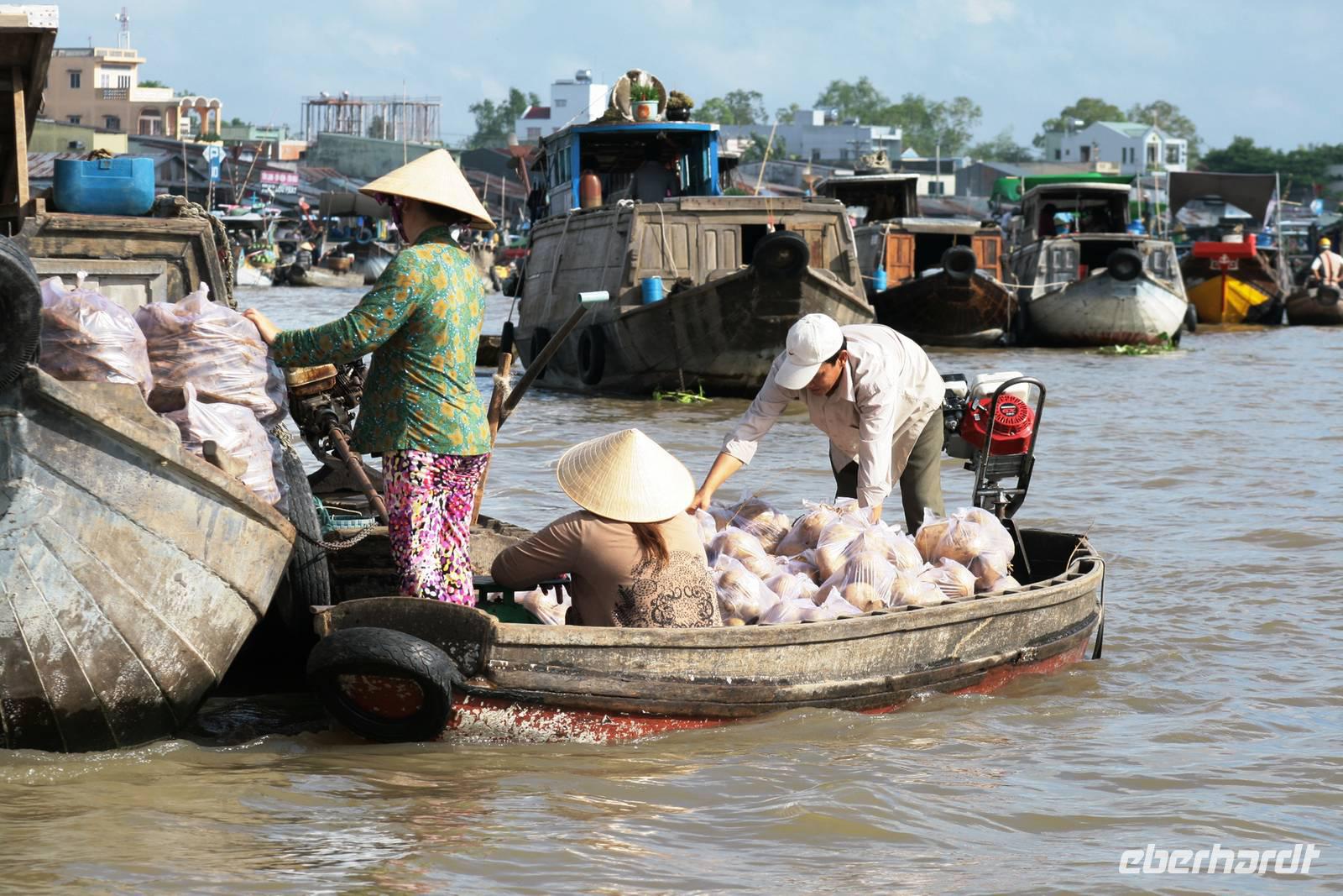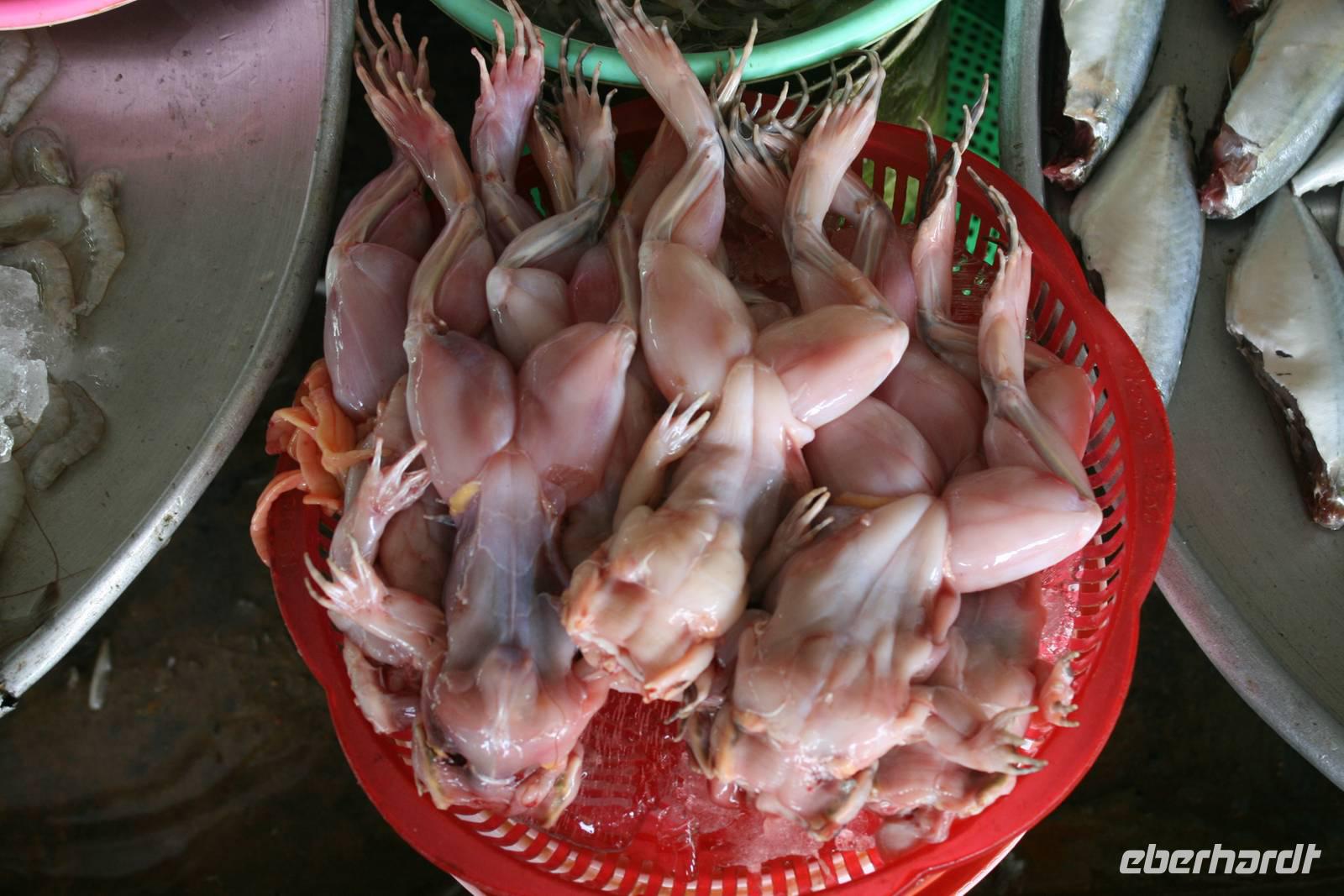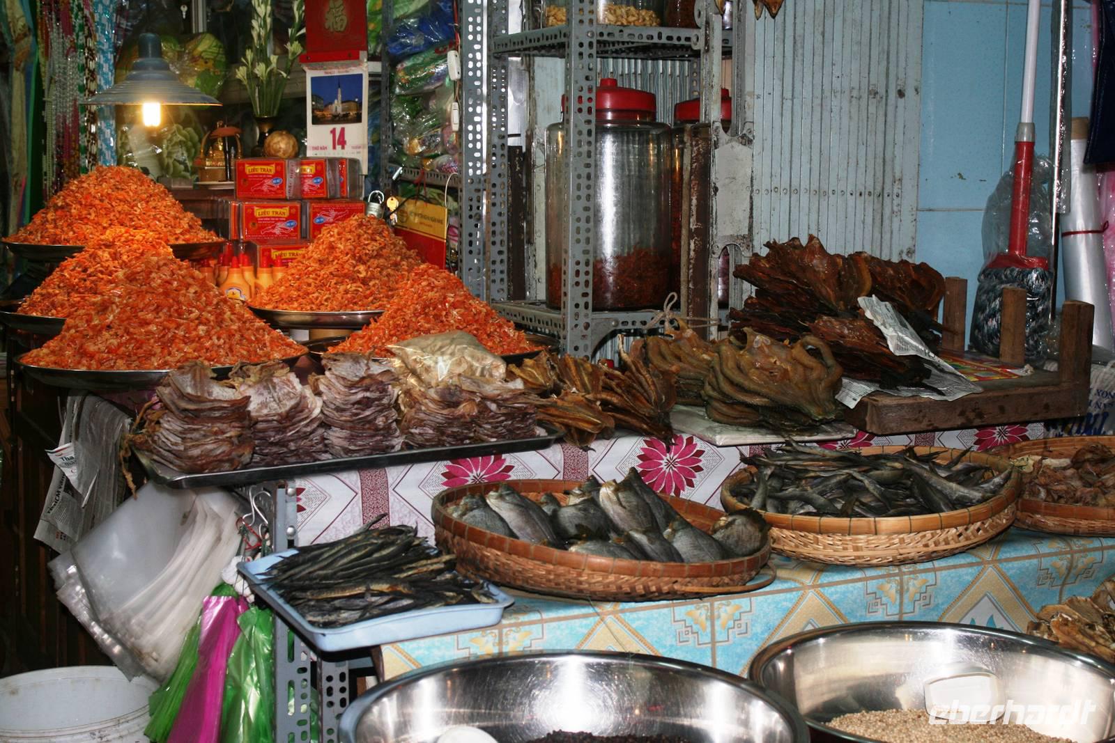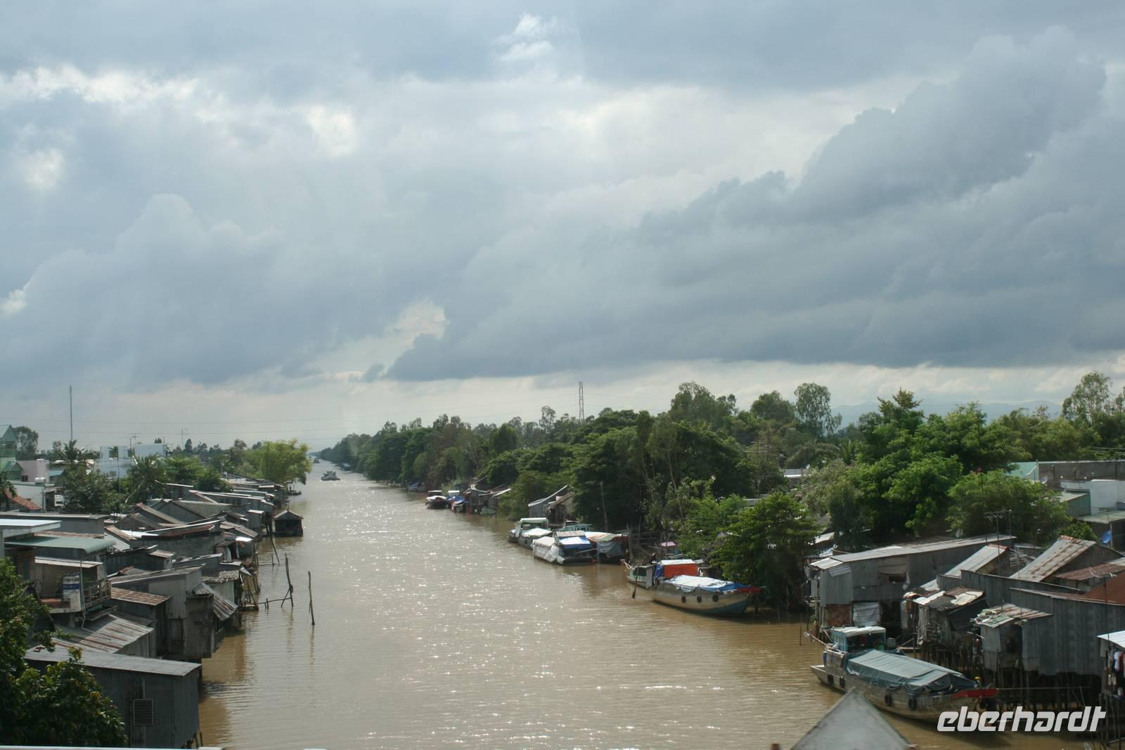 Nach einem relativ zeitigen Frühstück verstauten wir unsere Koffer im Bus und spazierten zum Fluss, von wo wir mit einem Boot zum schwimmenden Markt nach Phung Hiep schipperten. Entspannt beobachteten wir das geschäftige Treiben auf dem Wasser. Groß- und Kleinhändler mit entsprechende Booten verhandelten und verluden ihre Waren: Früchte, Gemüse und Haushaltwaren. Zwischendurch "schwimmende" Kantinen, die für das leibliche Wohl sorgten. Familien, die bereits ihre Geschäfte erledigt hatten und auf ihren Booten frühstückten. Eine herrliche Szenerie. In Cai Rang gingen wir von Bord und durchstöberten den lokalen "Frischemarkt", hier gab es so ziemlich alles: Alles vom Schwein, alles vom Fisch und auch gepellte Frösche. Nach so viel Getümmel am Morgen genossen wir die ruhige Weiterfahrt im Bus. Zur Mittagszeit kehrten wir ins Crocodile Land ein. Nachdem wir die Krokodilfarm unter die Lupe genommen hatten und bei deren Fütterung dabei waren, stand auch unsere "Fütterung" auf dem Programm. Im angeschlossenen Restaurant aßen wir zu Mittag, einige Gäste natürlich Krokodil. Unterwegs hielten wir noch einmal in einem Dorf, das für seine Ziegelbrennerei bekannt ist und durchforsten das "Firmengelände". Am Nachmittag haben wir für unsere Gäste einen zusätzlichen Ausflug organisiert. Zunächst fahren wir zum Lady Xu Tempel. Auf der Fahrt dorthin sehen wir viele Schilder, auf denen mit "Spanferkel" geworben wird. Ja richtig, der Glücksgöttin werden gebratene Schweinchen geopfert, zumindest für ca. 2 h, später isst man sie dann selbst beim Familienpicknick. Chau Doc, unsere letzte Station in Vietnam, lebt von der Fischzucht. Ein großes Pangasius Denkmal steht am Flussufer. Vo da aus begannen wir eine Bootsfahrt zu einer Familie, die diesen Fisch unter ihrem schwimmenden "Grundstück" züchtet, sehr interessant. Danach besuchten wir ein Cham Dorf und waren beim ersten Anblick sichtlich erschrocken über die dürftigen Lebensbedingungen der ethnischen Minderheit islamischen Glaubens. Doch beim weiteren Spaziergang durch das Dorf bis zur Moschee fiel uns auf, dass es auch hier riesengroße Unterschiede zwischen arm und reich gibt. Viele gutgekleidete, lachende Bewohner, die uns von ihren Terassen solider gebauter Häuser zu winkten und die traurig blickenden, bettelnden Kindern am Flussufer. Mit gemischten Gefühlen fuhren wir anschließend zum Hotel in Chau Doc. Während die Gäste ihre Pässe abgaben und ihre Zimmer bezogen, widmete sich Annett mit Unterstützung von der netten Hang dem Papierkram für die Grenzformalitäten. Ausreiseformulare Vietnam geschrieben, Einreiseformulare für Kambodscha ausgefüllt, Passbilder drauf geklebt. Schnell war 1 h vergangen und unsere Hände taten weh. Dank der vorbereiteten Passliste waren fast alle Daten vorhanden, bis auf die Berufe. Kein Problem, aber ich verrate nicht, wem ich zum Papst, Künstler oder Millionär gemacht habe! Die gemeinschaftliche Büroarbeit war eine sehr gute Investition, was sich am nächsten Tag an der Grenze positiv bemerkbar machte. Bis zum Abendessen war alles erledigt und so stießen wir ein letztes Mal in Vietnam an.