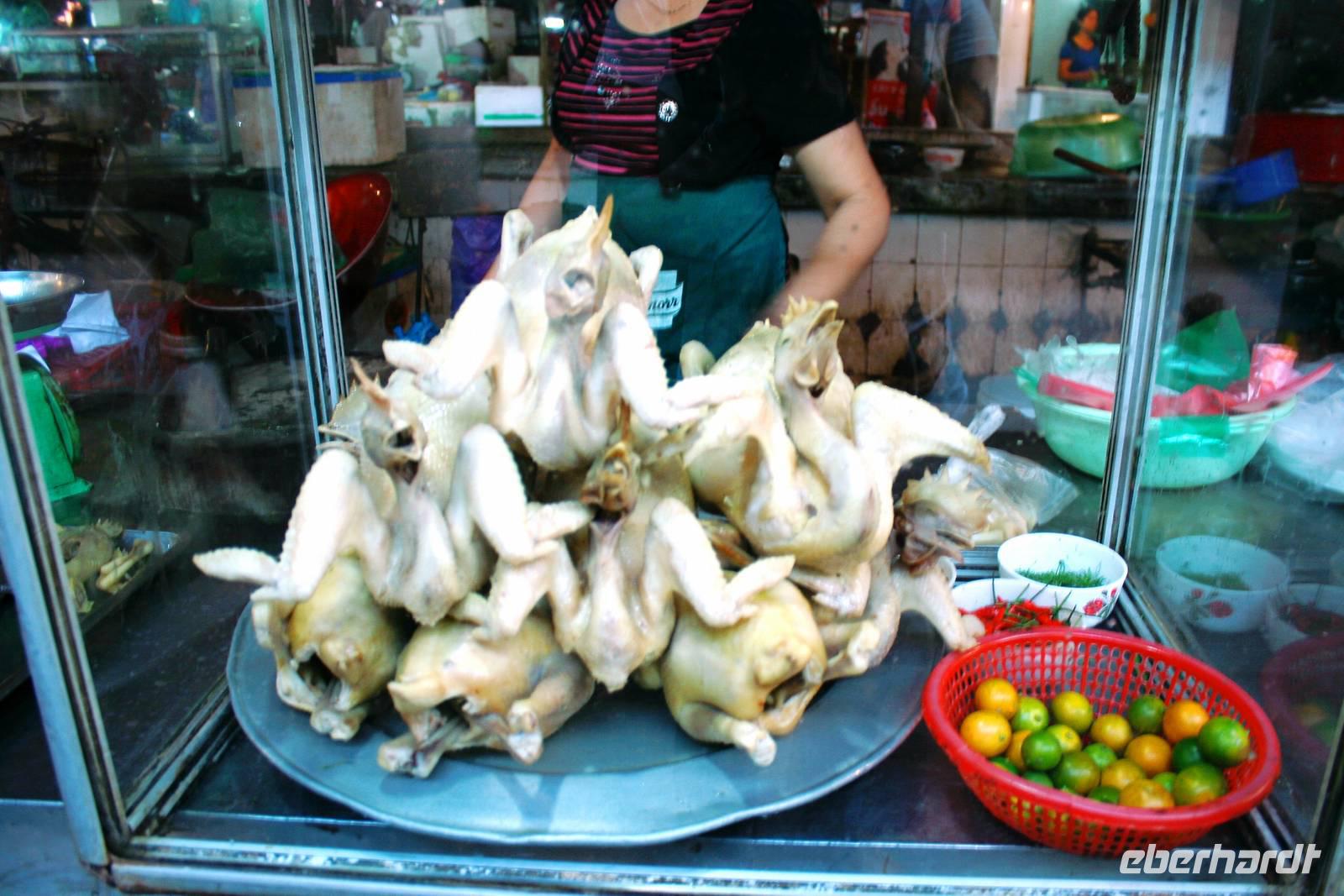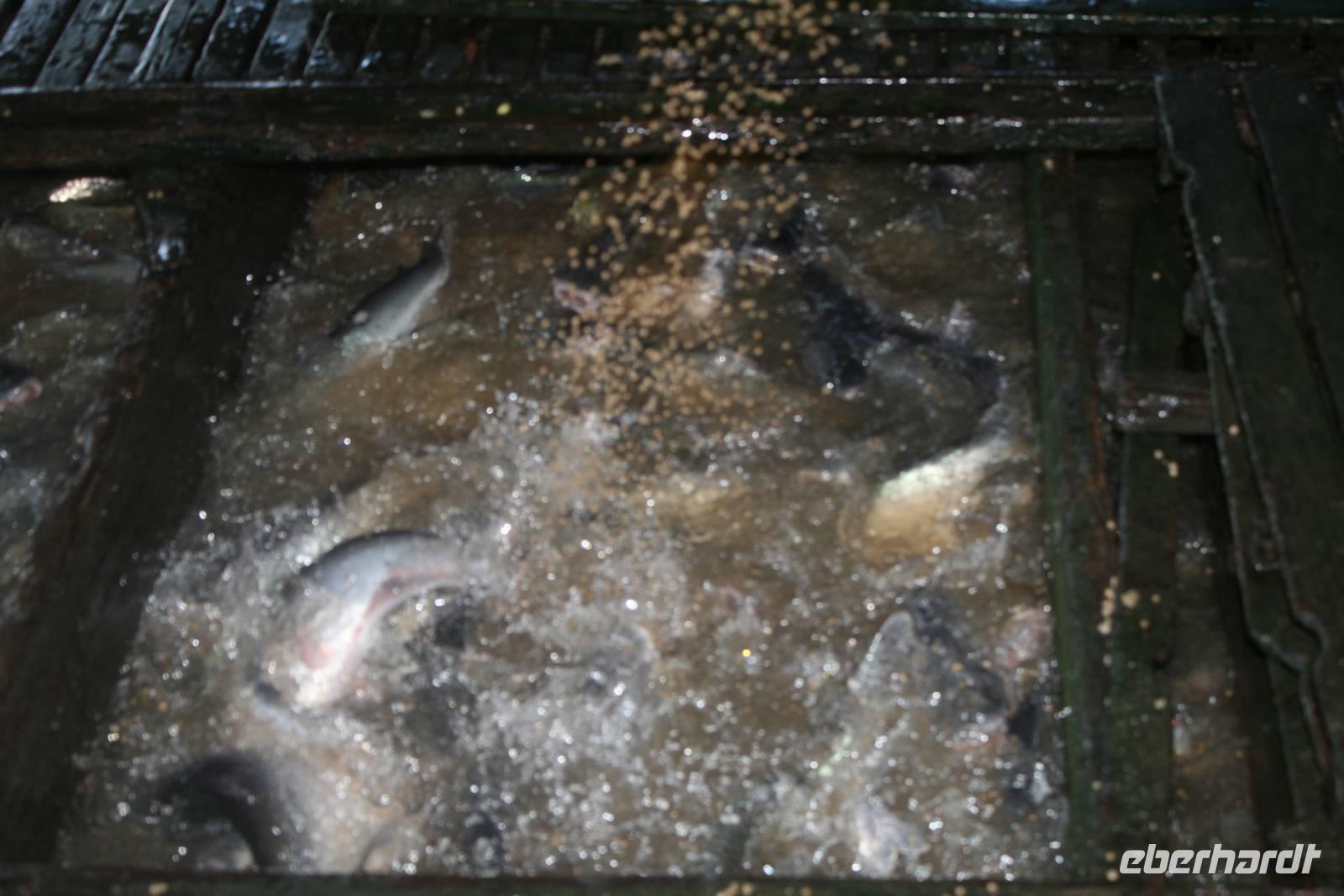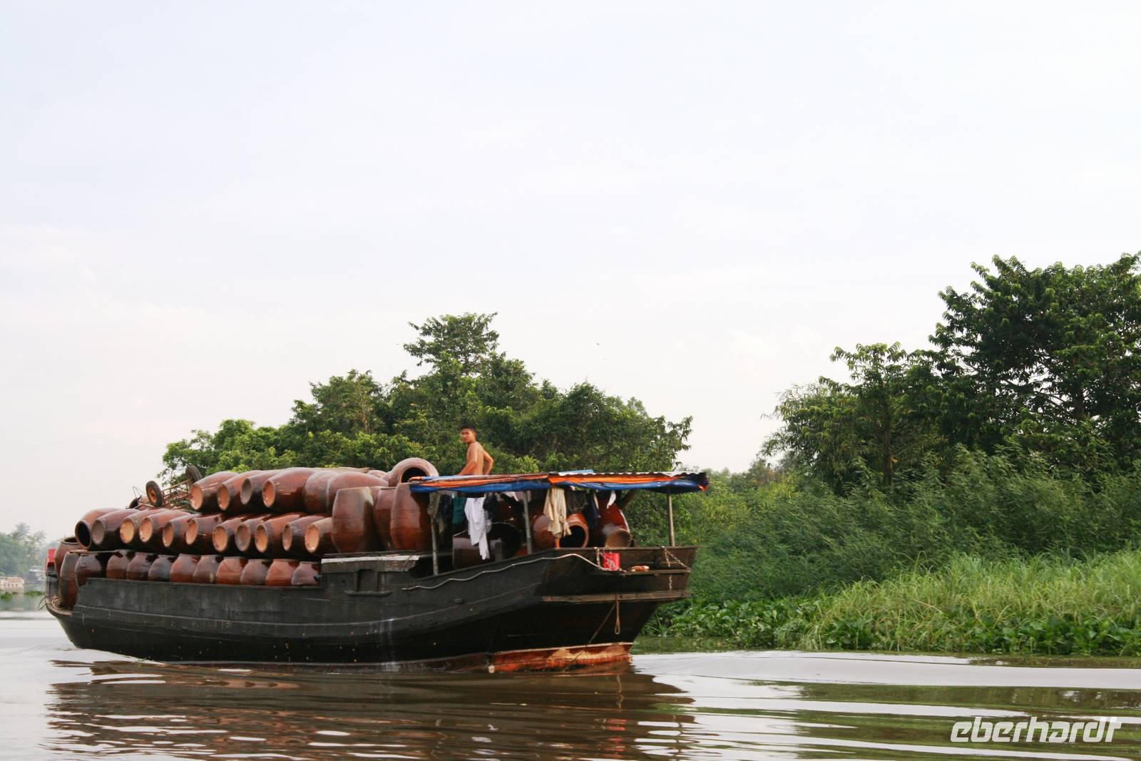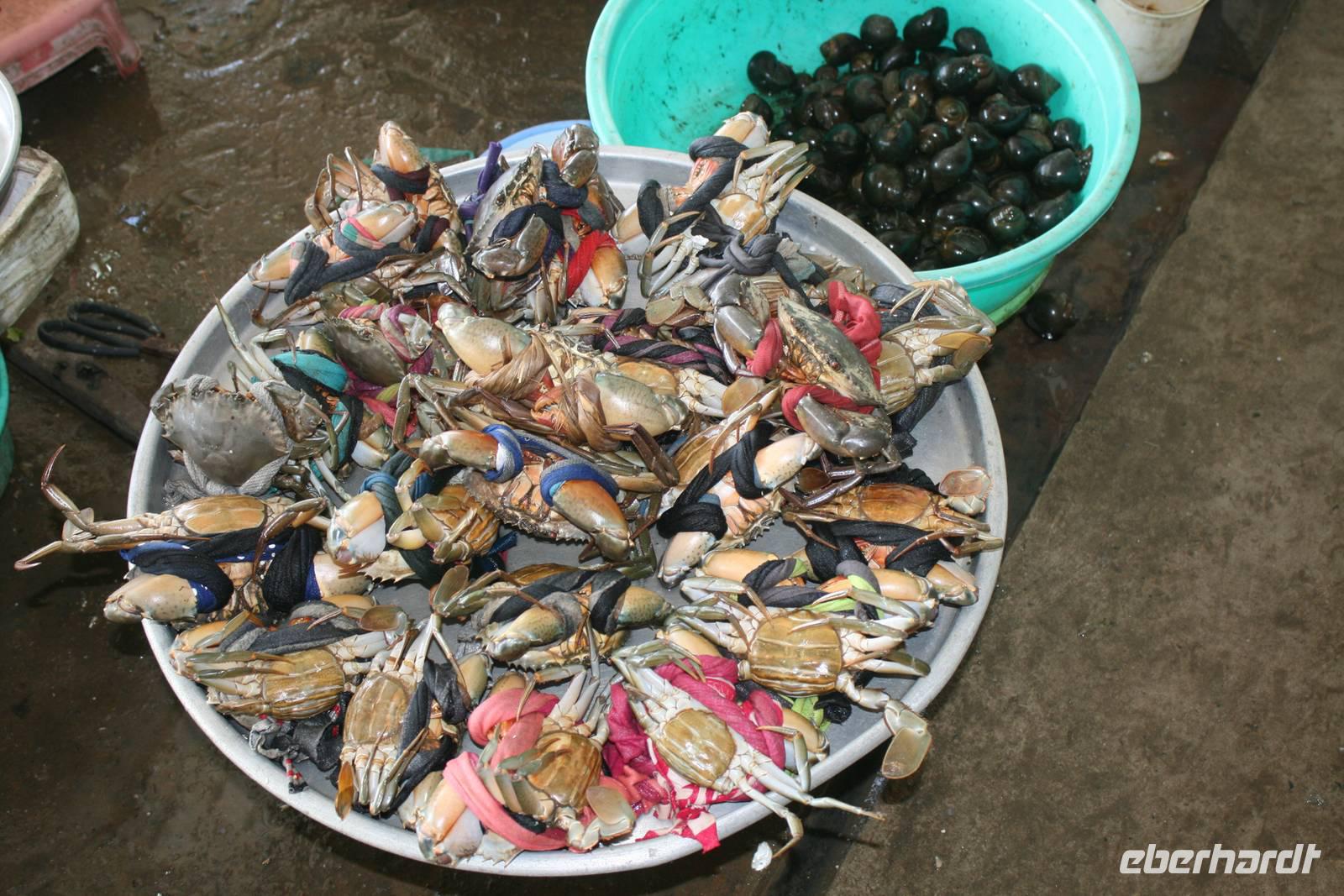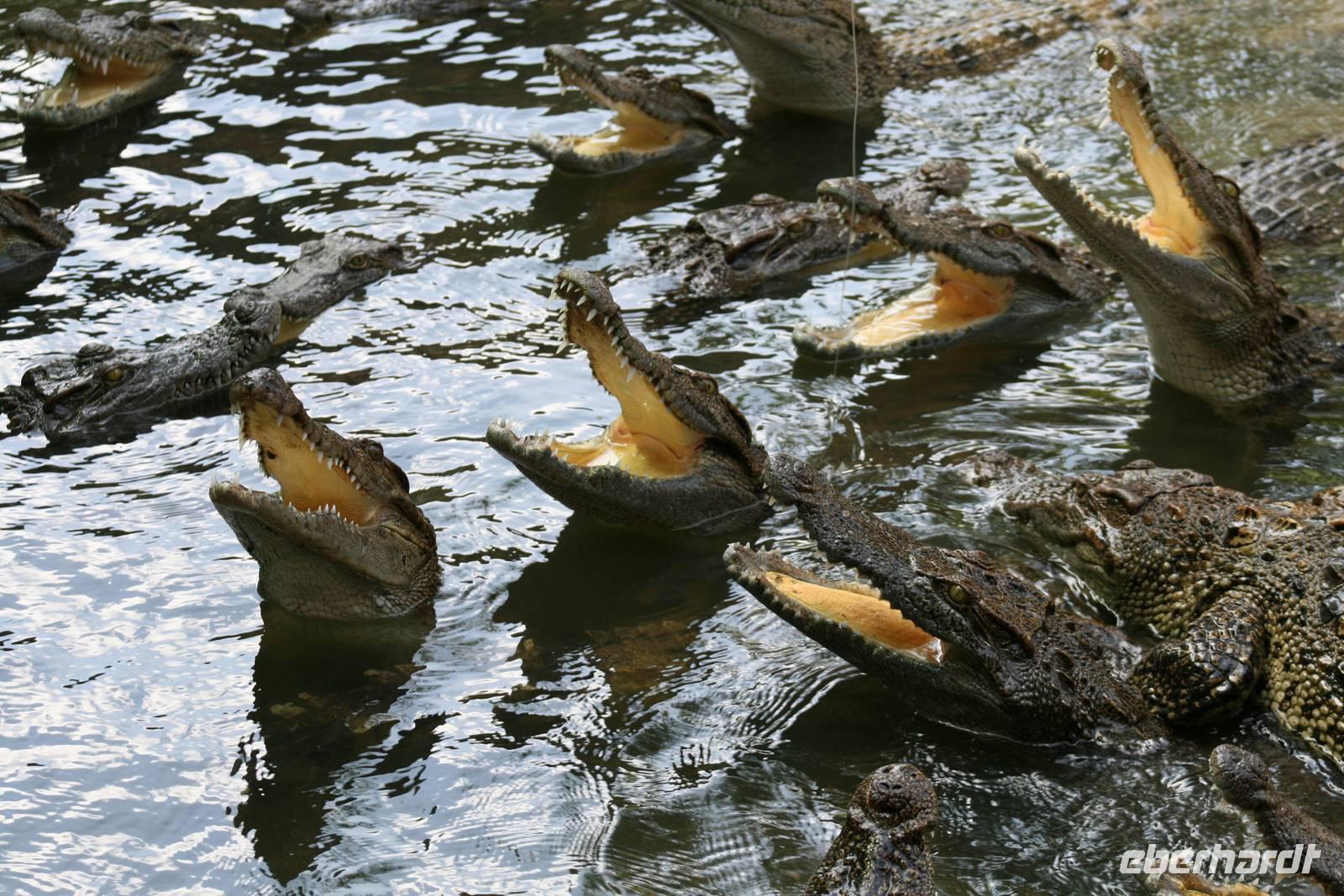 Nach einem relativ zeitigen Frühstück verstauten wir unsere Koffer im Bus und spazierten zum Fluss, von wo wir mit einem Boot zum schwimmenden Markt nach Phung Hiep schipperten. Entspannt beobachteten wir das geschäftige Treiben auf dem Wasser. Groß- und Kleinhändler mit entsprechende Booten verhandelten und verluden ihre Waren: Früchte, Gemüse und Haushaltwaren. Zwischendurch "schwimmende" Kantinen, die für das leibliche Wohl sorgten. Familien, die bereits ihre Geschäfte erledigt hatten und auf ihren Booten frühstückten. Eine herrliche Szenerie. In Cai Rang gingen wir von Bord und durchstöberten den lokalen "Frischemarkt", hier gab es so ziemlich alles: Alles vom Schwein, alles vom Fisch und auch gepellte Frösche. Nach so viel Getümmel am Morgen genossen wir die ruhige Weiterfahrt im Bus. Zur Mittagszeit kehrten wir ins Crocodile Land ein. Nachdem wir die Krokodilfarm unter die Lupe genommen hatten und bei deren Fütterung dabei waren, stand auch unsere "Fütterung" auf dem Programm. Im angeschlossenen Restaurant aßen wir zu Mittag, einige Gäste natürlich Krokodil. Unterwegs hielten wir noch einmal in einem Dorf, das für seine Ziegelbrennerei bekannt ist und durchforsten das "Firmengelände". Am Nachmittag haben wir für unsere Gäste einen zusätzlichen Ausflug organisiert. Zunächst fahren wir zum Lady Xu Tempel. Auf der Fahrt dorthin sehen wir viele Schilder, auf denen mit "Spanferkel" geworben wird. Ja richtig, der Glücksgöttin werden gebratene Schweinchen geopfert, zumindest für ca. 2 h, später isst man sie dann selbst beim Familienpicknick. Chau Doc, unsere letzte Station in Vietnam, lebt von der Fischzucht. Ein großes Pangasius Denkmal steht am Flussufer. Vo da aus begannen wir eine Bootsfahrt zu einer Familie, die diesen Fisch unter ihrem schwimmenden "Grundstück" züchtet, sehr interessant. Danach besuchten wir ein Cham Dorf und waren beim ersten Anblick sichtlich erschrocken über die dürftigen Lebensbedingungen der ethnischen Minderheit islamischen Glaubens. Doch beim weiteren Spaziergang durch das Dorf bis zur Moschee fiel uns auf, dass es auch hier riesengroße Unterschiede zwischen arm und reich gibt. Viele gutgekleidete, lachende Bewohner, die uns von ihren Terassen solider gebauter Häuser zu winkten und die traurig blickenden, bettelnden Kindern am Flussufer. Mit gemischten Gefühlen fuhren wir anschließend zum Hotel in Chau Doc. Während die Gäste ihre Pässe abgaben und ihre Zimmer bezogen, widmete sich Annett mit Unterstützung von der netten Hang dem Papierkram für die Grenzformalitäten. Ausreiseformulare Vietnam geschrieben, Einreiseformulare für Kambodscha ausgefüllt, Passbilder drauf geklebt. Schnell war 1 h vergangen und unsere Hände taten weh. Dank der vorbereiteten Passliste waren fast alle Daten vorhanden, bis auf die Berufe. Kein Problem, aber ich verrate nicht, wem ich zum Papst, Künstler oder Millionär gemacht habe! Die gemeinschaftliche Büroarbeit war eine sehr gute Investition, was sich am nächsten Tag an der Grenze positiv bemerkbar machte. Bis zum Abendessen war alles erledigt und so stießen wir ein letztes Mal in Vietnam an.