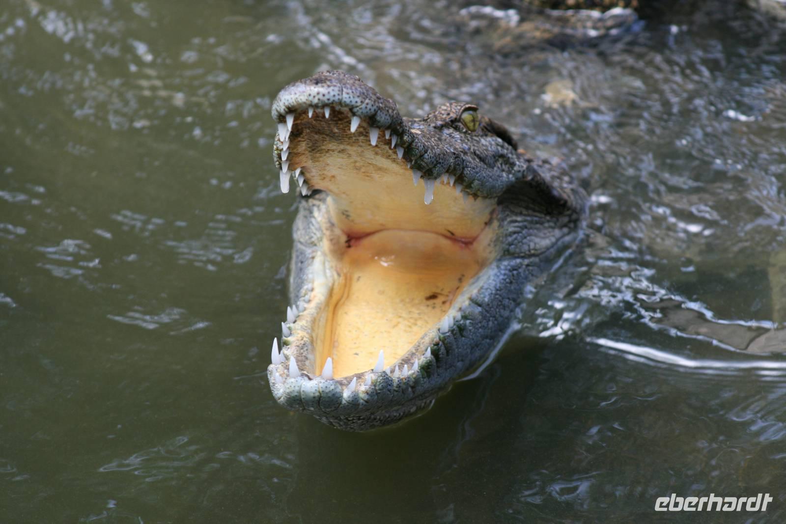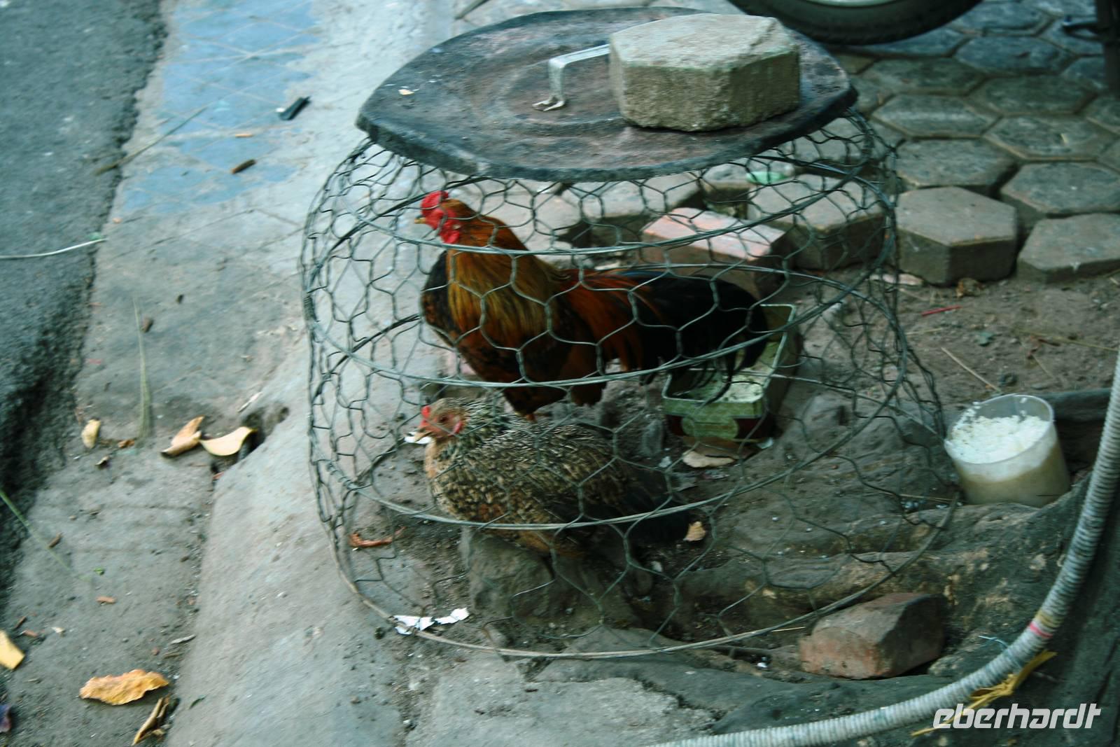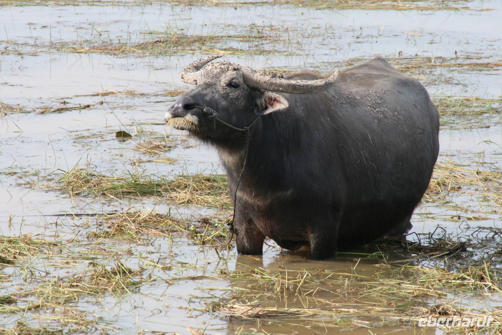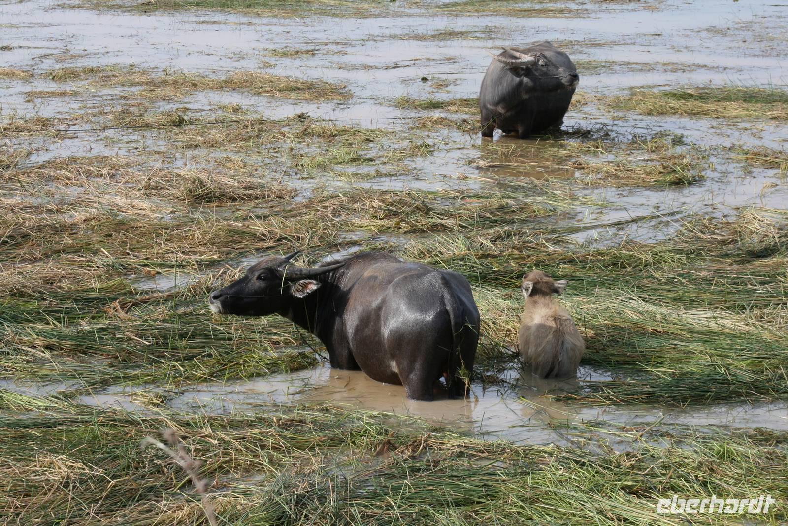 Nach einem relativ zeitigen Frühstück verstauten wir unsere Koffer im Bus und spazierten zum Fluss, von wo wir mit einem Boot zum schwimmenden Markt nach Phung Hiep schipperten. Entspannt beobachteten wir das geschäftige Treiben auf dem Wasser. Groß- und Kleinhändler mit entsprechende Booten verhandelten und verluden ihre Waren: Früchte, Gemüse und Haushaltwaren. Zwischendurch "schwimmende" Kantinen, die für das leibliche Wohl sorgten. Familien, die bereits ihre Geschäfte erledigt hatten und auf ihren Booten frühstückten. Eine herrliche Szenerie. In Cai Rang gingen wir von Bord und durchstöberten den lokalen "Frischemarkt", hier gab es so ziemlich alles: Alles vom Schwein, alles vom Fisch und auch gepellte Frösche. Nach so viel Getümmel am Morgen genossen wir die ruhige Weiterfahrt im Bus. Zur Mittagszeit kehrten wir ins Crocodile Land ein. Nachdem wir die Krokodilfarm unter die Lupe genommen hatten und bei deren Fütterung dabei waren, stand auch unsere "Fütterung" auf dem Programm. Im angeschlossenen Restaurant aßen wir zu Mittag, einige Gäste natürlich Krokodil. Unterwegs hielten wir noch einmal in einem Dorf, das für seine Ziegelbrennerei bekannt ist und durchforsten das "Firmengelände". Am Nachmittag haben wir für unsere Gäste einen zusätzlichen Ausflug organisiert. Zunächst fahren wir zum Lady Xu Tempel. Auf der Fahrt dorthin sehen wir viele Schilder, auf denen mit "Spanferkel" geworben wird. Ja richtig, der Glücksgöttin werden gebratene Schweinchen geopfert, zumindest für ca. 2 h, später isst man sie dann selbst beim Familienpicknick. Chau Doc, unsere letzte Station in Vietnam, lebt von der Fischzucht. Ein großes Pangasius Denkmal steht am Flussufer. Vo da aus begannen wir eine Bootsfahrt zu einer Familie, die diesen Fisch unter ihrem schwimmenden "Grundstück" züchtet, sehr interessant. Danach besuchten wir ein Cham Dorf und waren beim ersten Anblick sichtlich erschrocken über die dürftigen Lebensbedingungen der ethnischen Minderheit islamischen Glaubens. Doch beim weiteren Spaziergang durch das Dorf bis zur Moschee fiel uns auf, dass es auch hier riesengroße Unterschiede zwischen arm und reich gibt. Viele gutgekleidete, lachende Bewohner, die uns von ihren Terassen solider gebauter Häuser zu winkten und die traurig blickenden, bettelnden Kindern am Flussufer. Mit gemischten Gefühlen fuhren wir anschließend zum Hotel in Chau Doc. Während die Gäste ihre Pässe abgaben und ihre Zimmer bezogen, widmete sich Annett mit Unterstützung von der netten Hang dem Papierkram für die Grenzformalitäten. Ausreiseformulare Vietnam geschrieben, Einreiseformulare für Kambodscha ausgefüllt, Passbilder drauf geklebt. Schnell war 1 h vergangen und unsere Hände taten weh. Dank der vorbereiteten Passliste waren fast alle Daten vorhanden, bis auf die Berufe. Kein Problem, aber ich verrate nicht, wem ich zum Papst, Künstler oder Millionär gemacht habe! Die gemeinschaftliche Büroarbeit war eine sehr gute Investition, was sich am nächsten Tag an der Grenze positiv bemerkbar machte. Bis zum Abendessen war alles erledigt und so stießen wir ein letztes Mal in Vietnam an.