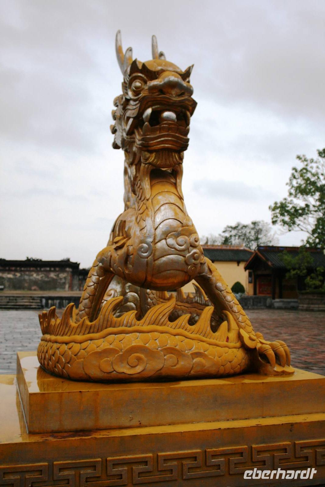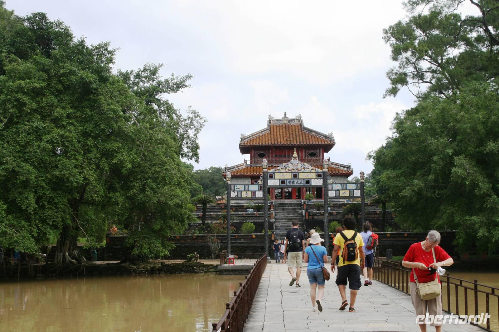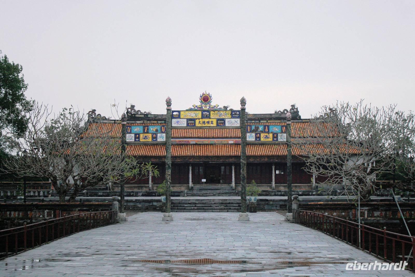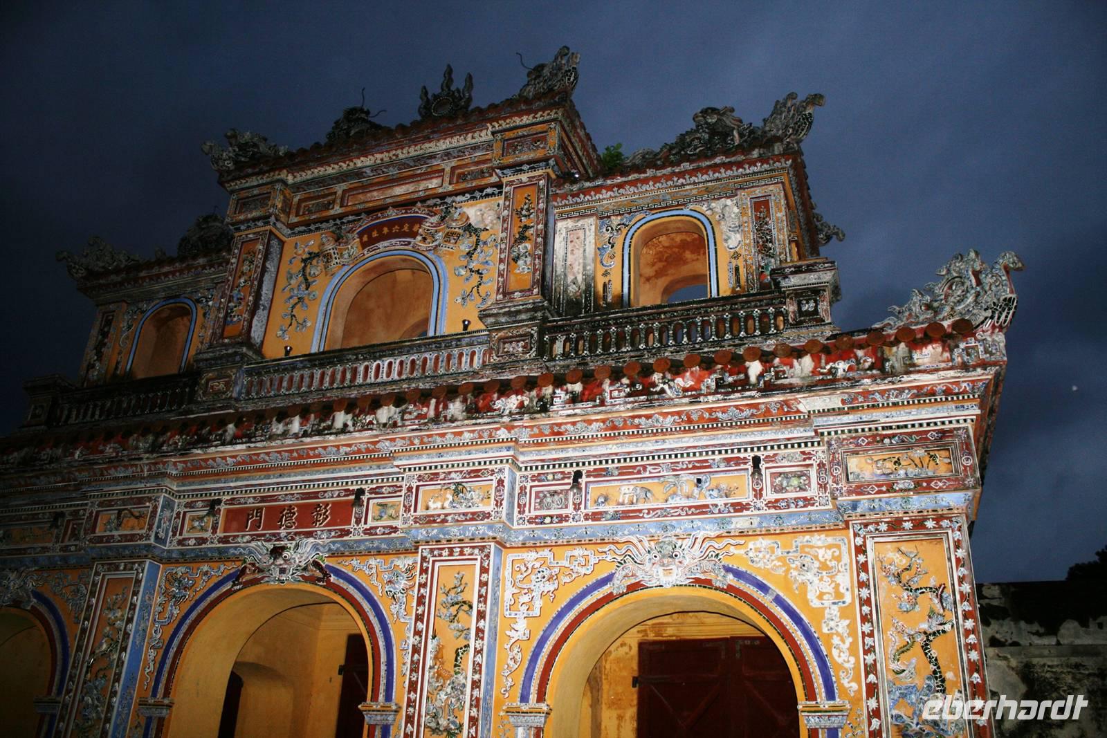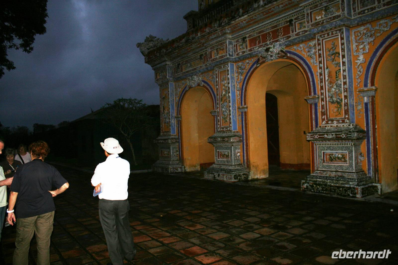 Die Nacht war kurz. Dank des Hotels konnten wir mit einem richtigen Frühstück im Magen 6 Uhr das Hotel verlassen und fuhren zum Flughafen, um eine der ersten zu sein. Bisher gab es noch keine verbindliche Info zum Flug nach Hue. Am Flughafen erwartete uns totales Chaos: überfordertes Personal und gestrandete, verärgerte Flugwillige. Vietnam Airlines hatte keinen Plan, keiner wußte was, wie, wann, wo! Spontan wurde die Fluggesellschaft von uns in Banana Airlines umbenannt. Danke noch mal an die EHT-Gruppe, die trotz der unangenehmen Situation cool blieb. Das Boarding für die 8:50 Uhr Maschine hatte längst begonnen, da tat sich endlich was Verbindliches: Der Manager bestätigte uns, dass noch 17 Personen unserer Gruppe mit der jetzigen Maschine fliegen konnten und der Rest mit der Maschine am Mittag. Die Entscheidung war schnell gefallen, denn das Risiko am Flughafen Hanoi hängen zu bleiben, war zu hoch (es warteten noch viele andere!). Die ersten 16 Personen und Annett legten einen Blitz Check In hin und die anderen Gäste wurden in die Hände von Ot übergeben. Um 9:40 Uhr hob die erste Maschine ab. Nach einem wiederholten Landemanöver auf Hue hatten wir dann am Mittag endlich wieder festen Boden unter den Füssen. Hue und unser neuer Reiseleiter Ngoc empfingen uns mit Regen und schwülwarmen Temperaturen, der Parfümfluss war über seine Ufer getreten. Kurz nach 15 Uhr konnten wir dann auch den 2. Teil unserer Reisegruppe in Hue begrüßen und waren nun wieder komplett. Kurz darauf starteten wir zur Besichtigung des Kaiserpalastes. Es regnete nur noch leicht. Die mittlerweile von der UNESCO als Weltkulturerbe anerkannte Palastanlage mit seinen wuchtigen Mauern entstand zu Beginn des 19. Jahrhunderts und ist verschiedene "Städte" geteilt. Hier residierten die Herrscher der Nguyen Dynastie von 1802-1945. Vieles ist im Vietnamkrieg zerstört worden, doch es wird an allen Ecken und Enden restauriert. Durch das Mittagstor, dem Haupteingangsgtor, betraten wir den Palast. Über eine kleine Brücke, die früher nur dem Kaiser vorbehalten war, gelangten wir dann zum Hof der Riten und zur Halle der höchsten Harmonie. Was wir sahen war sehr prächtig und verbreitete in der beginnenden Abenddämmerung eine gewisse mystische Stimmung. Im Dunkeln verliessen wir das Areal und fuhren zum Abendessen in das Y Thao Garden Restaurant, wo wir mit lokaler Küche bewirtet und traditioneller Musik unterhalten wurden. Anschließend fielen alle müde in ihre Betten.