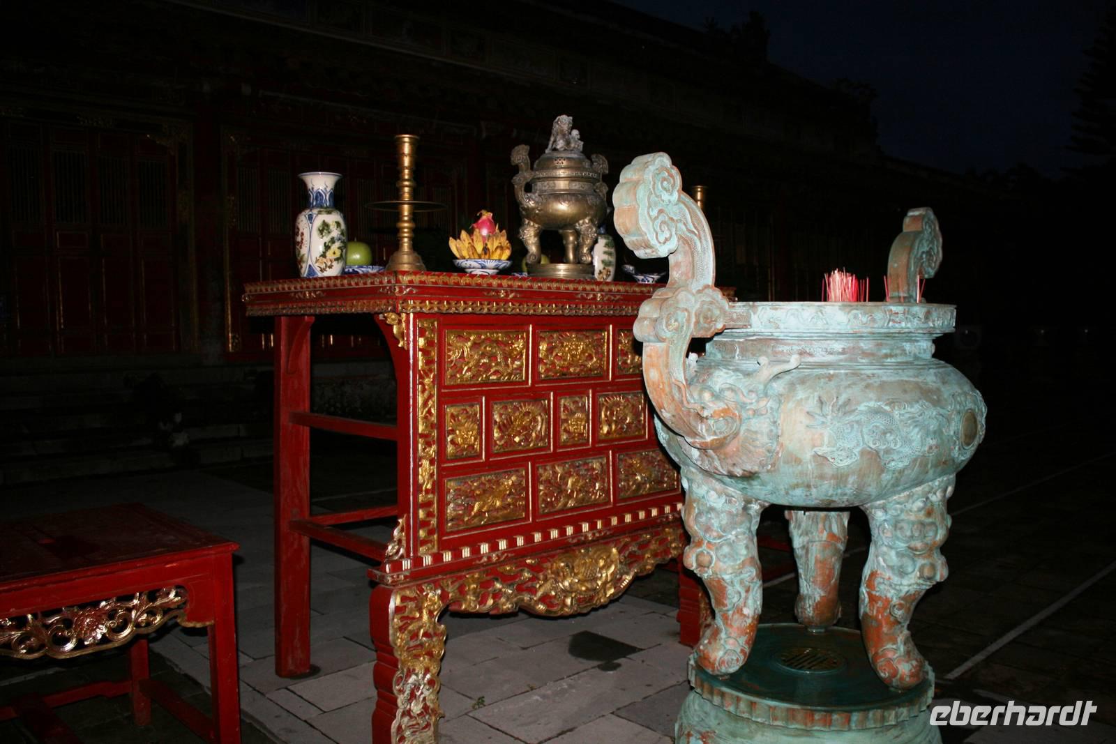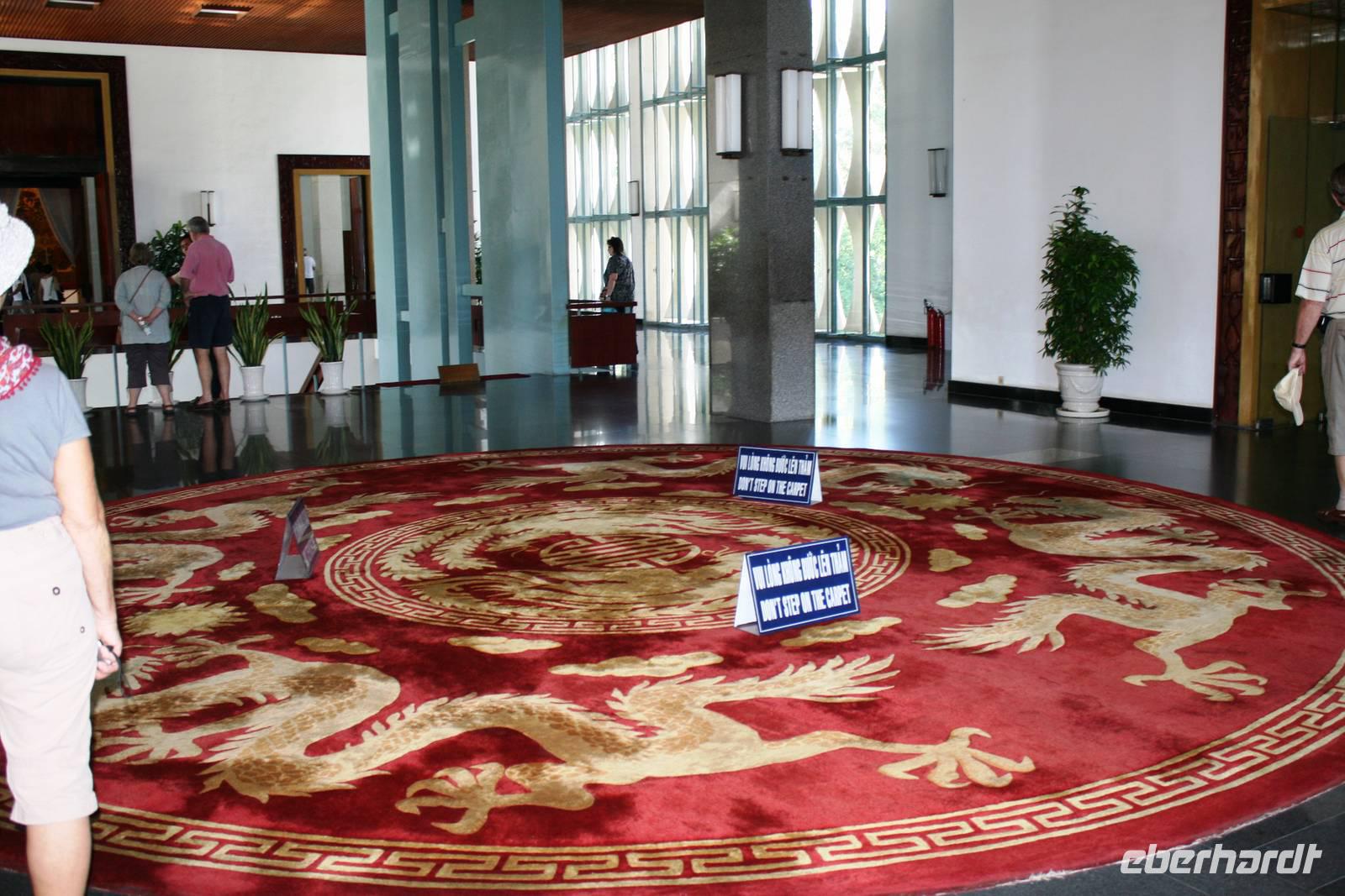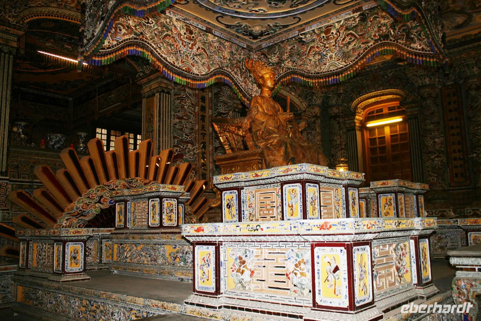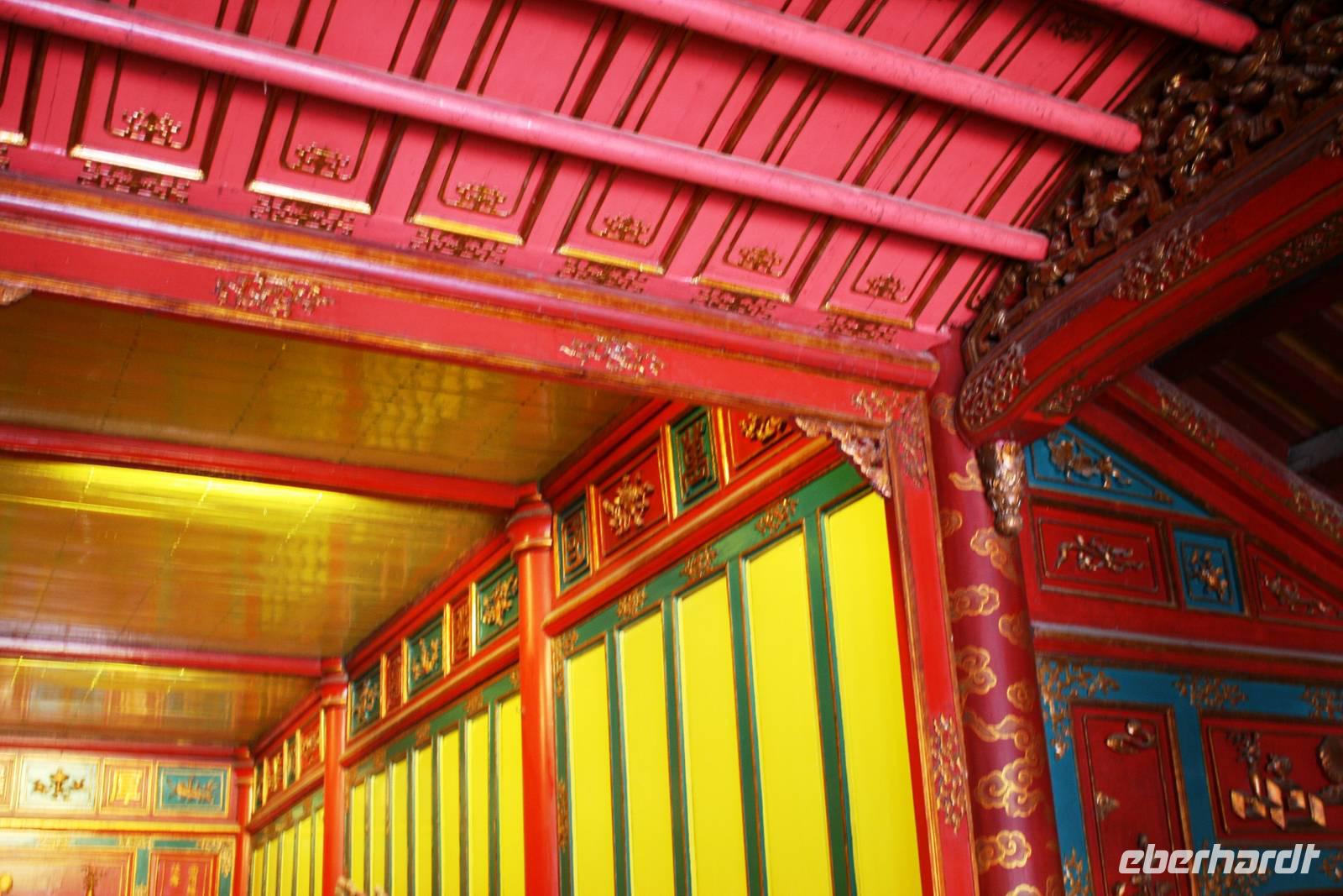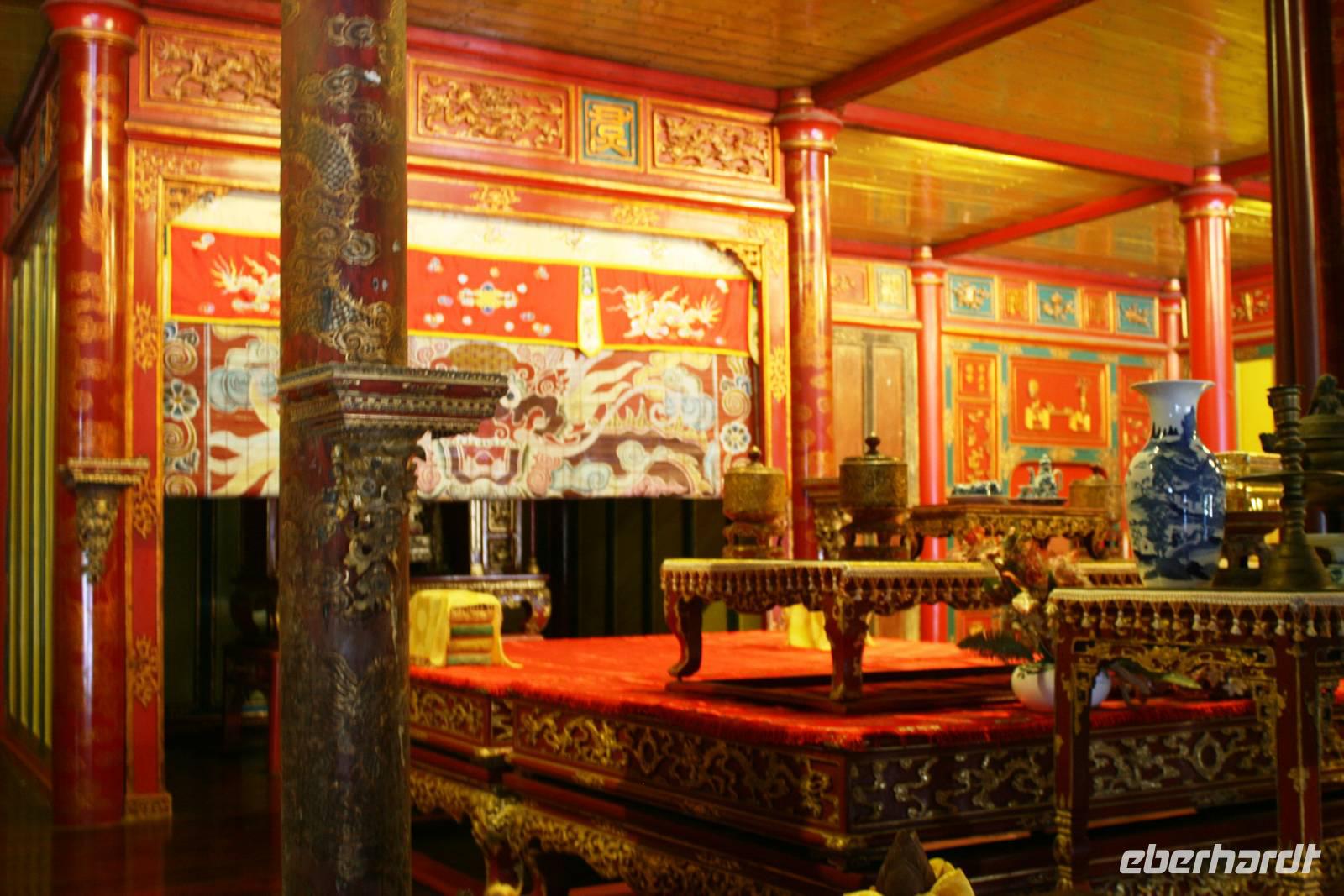Die Nacht war kurz. Dank des Hotels konnten wir mit einem richtigen Frühstück im Magen 6 Uhr das Hotel verlassen und fuhren zum Flughafen, um eine der ersten zu sein. Bisher gab es noch keine verbindliche Info zum Flug nach Hue. Am Flughafen erwartete uns totales Chaos: überfordertes Personal und gestrandete, verärgerte Flugwillige. Vietnam Airlines hatte keinen Plan, keiner wußte was, wie, wann, wo! Spontan wurde die Fluggesellschaft von uns in Banana Airlines umbenannt. Danke noch mal an die EHT-Gruppe, die trotz der unangenehmen Situation cool blieb. Das Boarding für die 8:50 Uhr Maschine hatte längst begonnen, da tat sich endlich was Verbindliches: Der Manager bestätigte uns, dass noch 17 Personen unserer Gruppe mit der jetzigen Maschine fliegen konnten und der Rest mit der Maschine am Mittag. Die Entscheidung war schnell gefallen, denn das Risiko am Flughafen Hanoi hängen zu bleiben, war zu hoch (es warteten noch viele andere!). Die ersten 16 Personen und Annett legten einen Blitz Check In hin und die anderen Gäste wurden in die Hände von Ot übergeben. Um 9:40 Uhr hob die erste Maschine ab. Nach einem wiederholten Landemanöver auf Hue hatten wir dann am Mittag endlich wieder festen Boden unter den Füssen. Hue und unser neuer Reiseleiter Ngoc empfingen uns mit Regen und schwülwarmen Temperaturen, der Parfümfluss war über seine Ufer getreten. Kurz nach 15 Uhr konnten wir dann auch den 2. Teil unserer Reisegruppe in Hue begrüßen und waren nun wieder komplett. Kurz darauf starteten wir zur Besichtigung des Kaiserpalastes. Es regnete nur noch leicht. Die mittlerweile von der UNESCO als Weltkulturerbe anerkannte Palastanlage mit seinen wuchtigen Mauern entstand zu Beginn des 19. Jahrhunderts und ist verschiedene "Städte" geteilt. Hier residierten die Herrscher der Nguyen Dynastie von 1802-1945. Vieles ist im Vietnamkrieg zerstört worden, doch es wird an allen Ecken und Enden restauriert. Durch das Mittagstor, dem Haupteingangsgtor, betraten wir den Palast. Über eine kleine Brücke, die früher nur dem Kaiser vorbehalten war, gelangten wir dann zum Hof der Riten und zur Halle der höchsten Harmonie. Was wir sahen war sehr prächtig und verbreitete in der beginnenden Abenddämmerung eine gewisse mystische Stimmung. Im Dunkeln verliessen wir das Areal und fuhren zum Abendessen in das Y Thao Garden Restaurant, wo wir mit lokaler Küche bewirtet und traditioneller Musik unterhalten wurden. Anschließend fielen alle müde in ihre Betten.