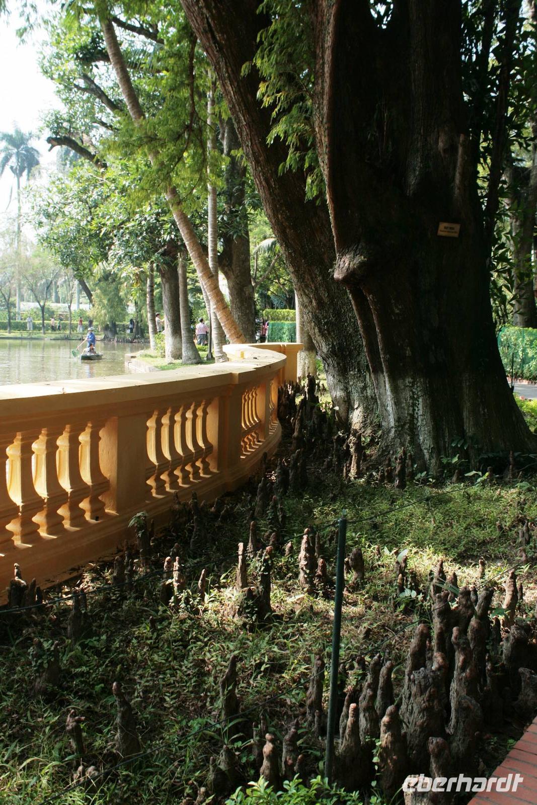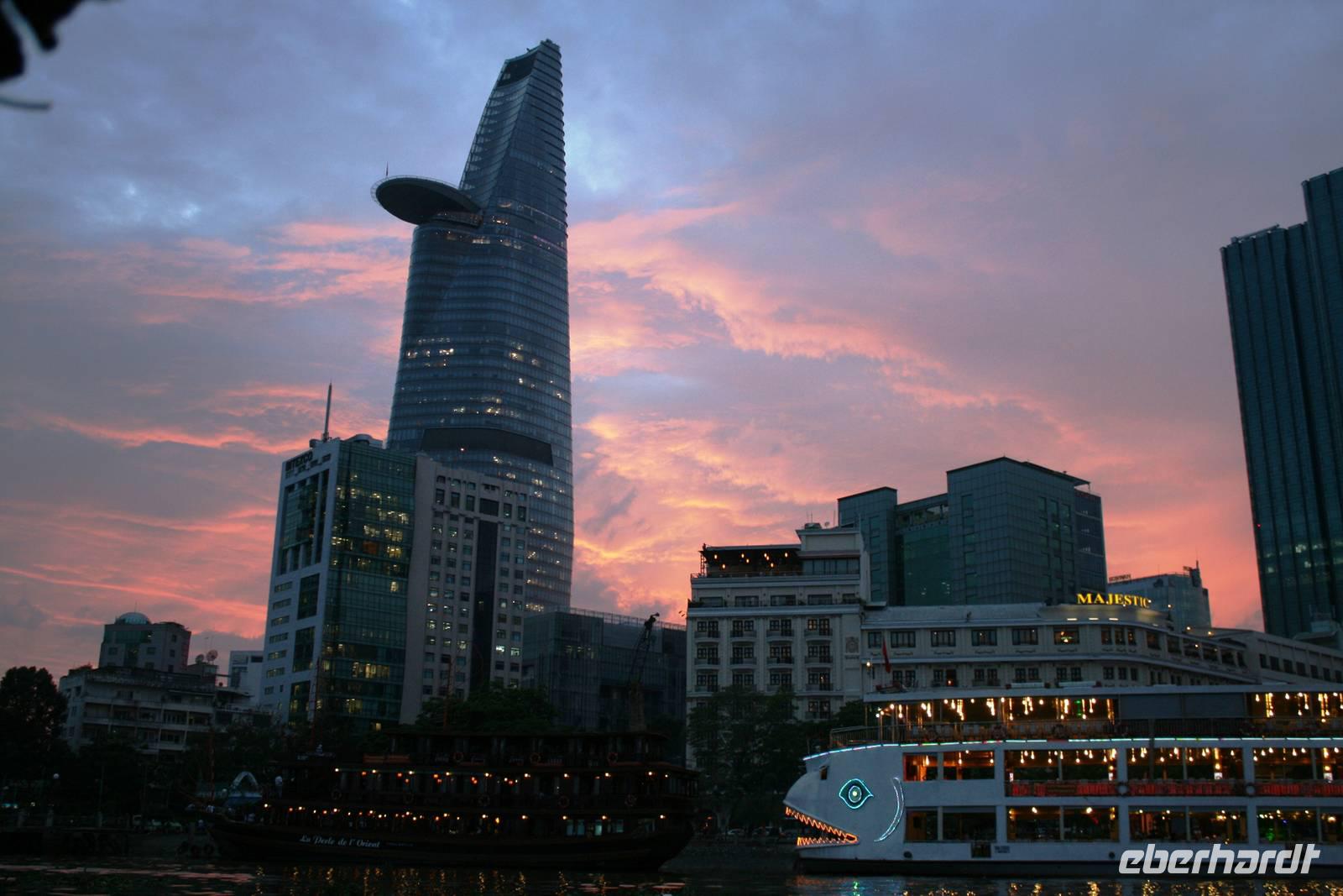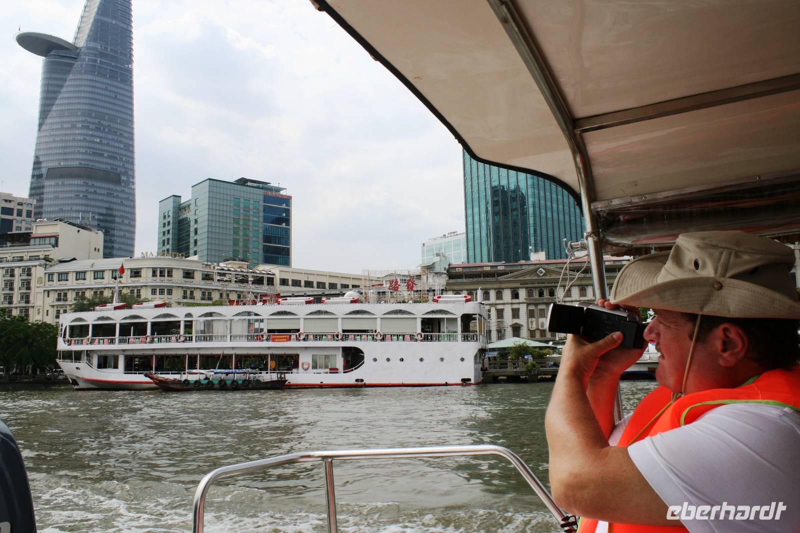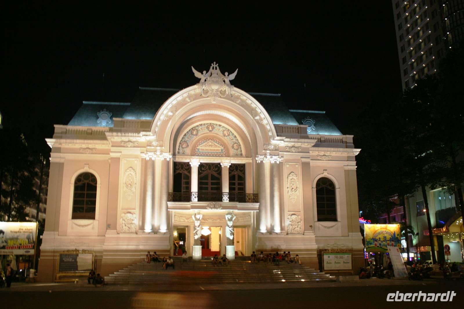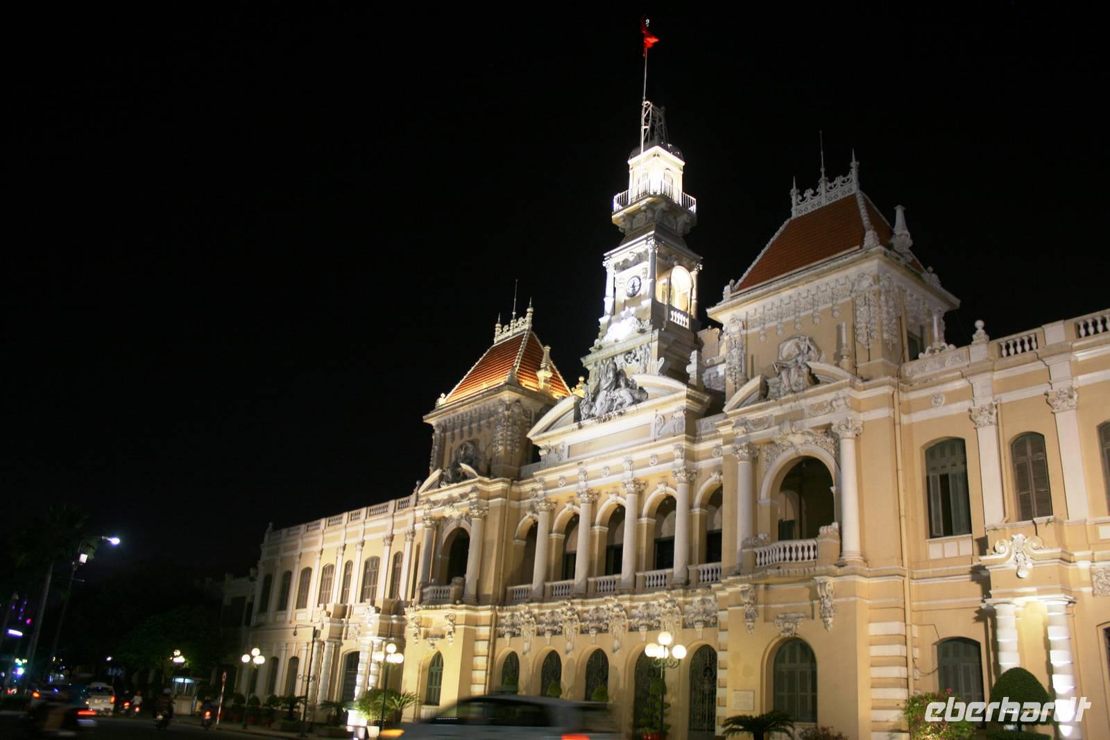 Am frühen Nachmittag rasten wir mit Schnellbooten auf dem Saigon River in das 70 km entfernte Cu Chi. Auf der Fahrt wurden wir mit kühlen Getränken und Obst bewirtet. Von den Guerillas angelegt und wurden die Tunnel von Cu Chi ständig erweitert. In den 60er Jahren nutzten die Partisanen das mittlerweile ca. 250 km verzweigte Tunnelsystem als getarnten Weg für den Vietkong, aber auch zum Schutz der Bevölkerung vor den Bombenangriffen der US Army. Nach einem Film begaben wir uns auf den Rundweg, wo uns Huong das Leben im Tunnel, Fallen und Belüftungskanäle näher erklärte. Trotz der gefühlten, schwülwarmen 35 ° C krochen einige Gäste in den Tunnel. Am anderen Ende nahmen wir sie alle vollzählig in Empfang. Zum Abschluss probierten wir gekochten Maniok mit Chilisalz und tranken Tee, bevor wir mit den Schnellbooten wieder nach Saigon zurück düsten. Das Abendessen wurde uns im angenehmen Ambiente des Restaurants Batalis serviert, welches sich direkt am Nationalmuseum befindet. Das Essen war sehr gut und die Getränke auch. Ganz lieben Dank noch einmal an unsere edle Spenderin in der Gruppe. Zu später Stunde stürzten sich einige Gäste mit Annett ins Nachtleben der Metropole. Der abendliche Spaziergang führte durch die belebten Straßen zur Nationaloper und zum Rathaus, die herrlich beleuchtet waren. Vorbei am berühmten Hotel Rex bummelten wir zum Hotel zurück.