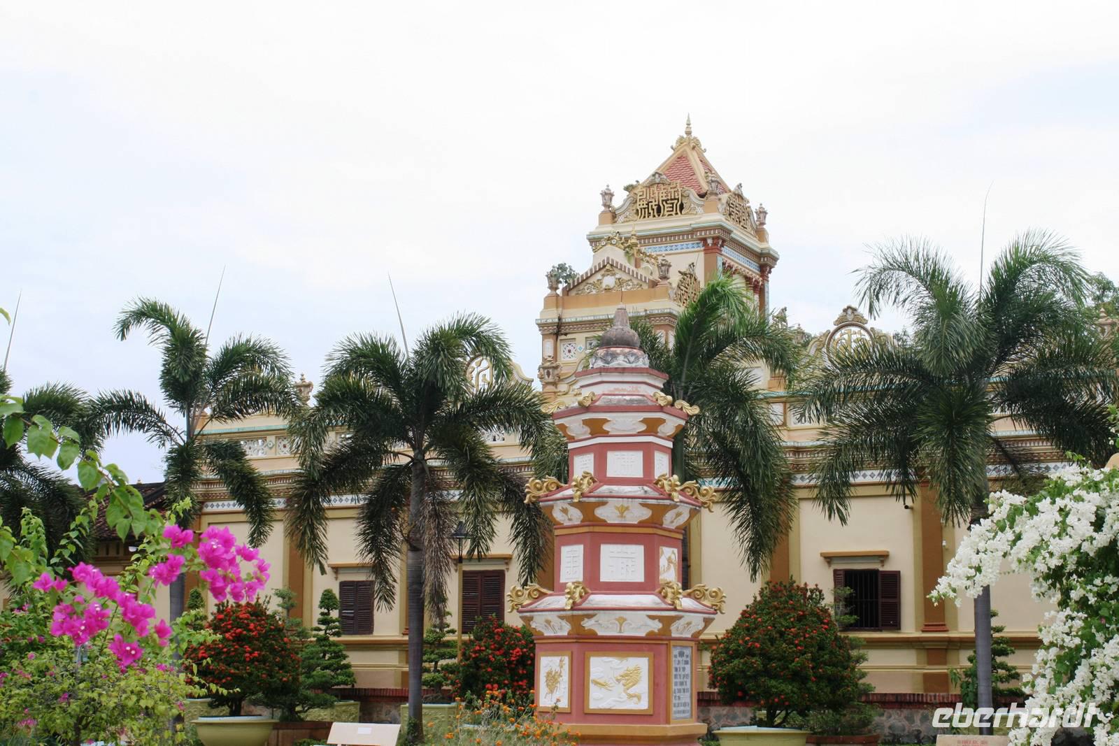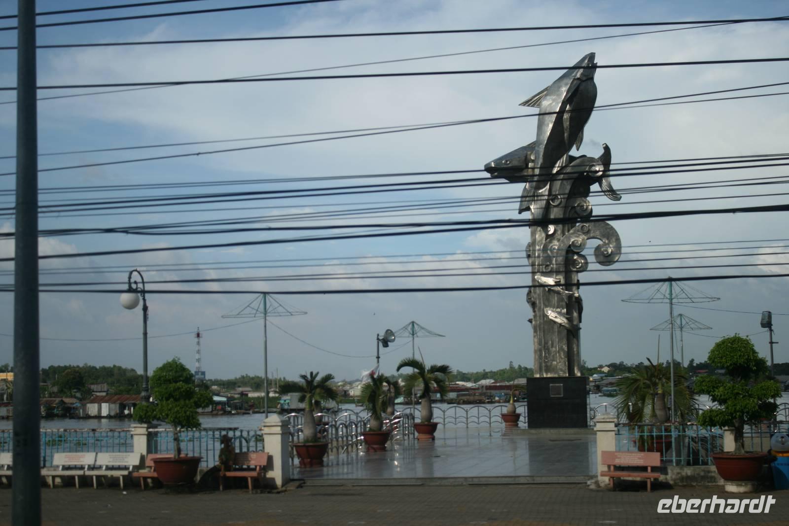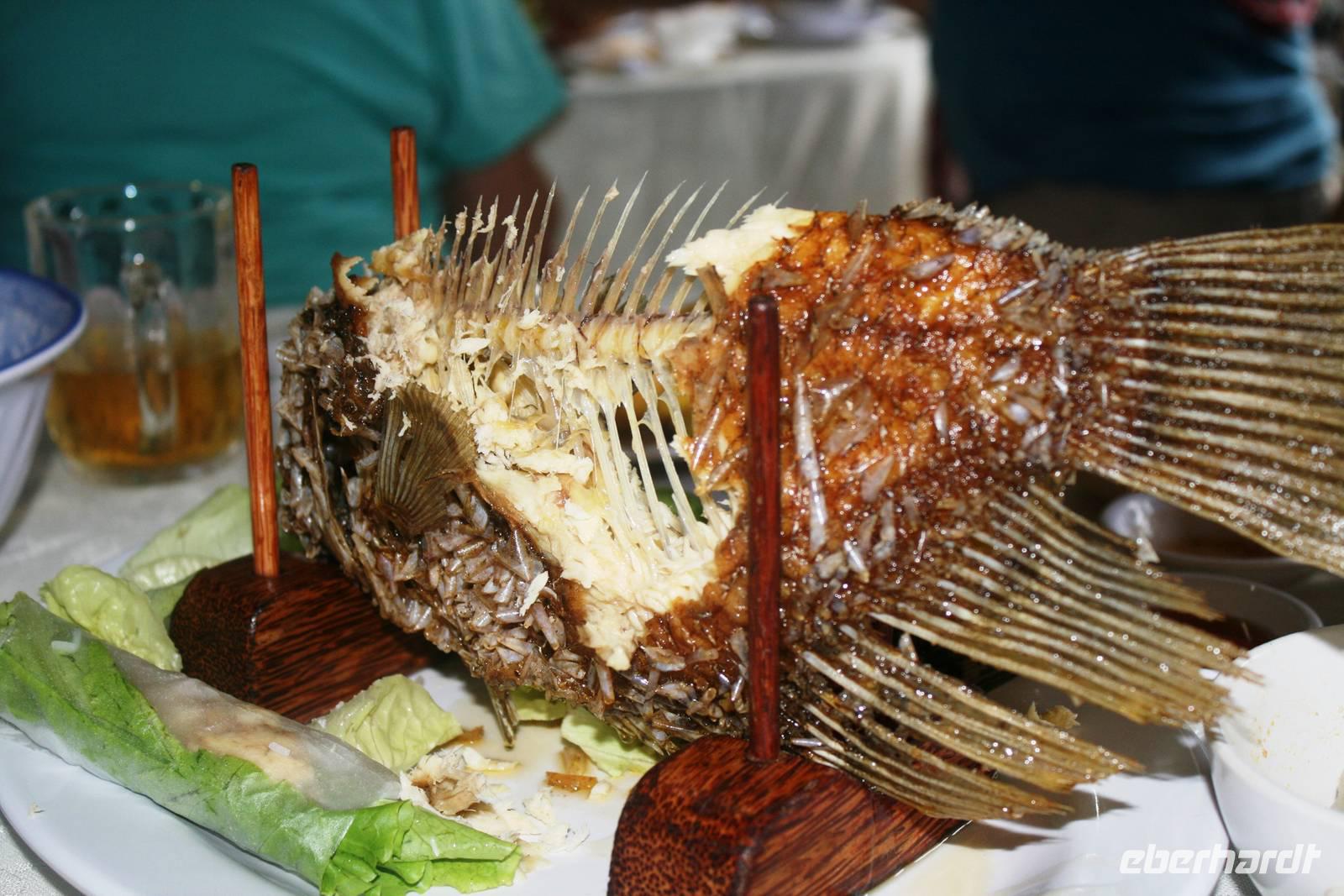 Bevor wir unsere Reise in Mekong Delta fortsetzten, drehten wir noch eine Runde durch Saigon. Wir besichtigten das alte Rathaus und die Oper im Tageslicht. Ein junges Brautpaar nahm ganz verlegen unsere Glückwünsche an. Vorbei am Ben Thanh Markt fuhren wir in den quirligen Stadtteil Cho Lon, besser bekannt als China Town. Durch die engen, mit Verkaufsständen vollgestopften Gassen zwängten sich Menschen, Tiere, Mopeds, Autos und auch wir. Aber alles kein Problem, wir bewunderten die asiatische Gelassenheit. In Deutschland wäre der ein oder andere Verkehrsteilnehmer schon längst "ausgerastet" und hätte auf sein "Recht" bestanden. Auf der Nationalstrasse 1 ging es dann schnell voran. Viel zu schnell, ein unplanmässiger Stopp folgte. Bereits am frühen Mittag erreichten wir My Tho, der Pforte zum Mekong Delta. Hier teilt sich der Mekong in mehrere Seitenarme, bevor er ins südchinesische Meer fliesst. Zunächst besichtigten wir die Vinh Trang Pagode mit ihren 3 weissen Buddhas, der eine sitzend, der andere liegend und der 3. stehend. Nicht nur überdimensionalen Buddha-Statuen faszinierten uns, sondern auch die wunderschöne, blumige Klosteranlage. Ein sehr guter Ersatz für den einzelnen weissen Buddha in Nha Trang. Im Hafen von My Tho bestiegen wir ein Boot und setzten über. Unterwegs beobachteten wir Fischerboote und vollbepackte Fähren, während wir genüsslich den frischen Saft einer Kokosnuss schlürften. Später verliessen wir das Boot und besuchten eine kleine Obstplantage, wo wir mit frischen Früchten wie Drachenfrucht, Ananas, Babybanane, Melone und Pomelo sowie grünen Tee mit selbstgemachten Honog bewirtet wurden. Dabei wurden wir mit heimischer Musik und "Python Schlangentanz" bestens unterhalten. Anschließend wurde uns die Herstellung von süßen Kokosbonbons schmackhaft gemacht. Natürlich durften wir auch reichlich naschen. Wir spazierten zu einem Dorf, wo auf kleine Kutschen mit klapprigen Pferden umsatteltet wurde. Auf "verwunschenen" Wasserwegen durchstreiften wir danach in hölzernen Sampas das Dickicht des Deltas und bewunderten die üppige Natur. Besonders gefielen uns die riesigen Früchte der Wasserpalmen. Mit dem großen Boot fuhren wir zur Phönixinsel, wo wir bei einer Bauernfamilie zum "Elefantenohrfischessen) eingeladen waren. Nach dem Essen verabschiedeten wir uns vom Mekong Delta und fuhren mit dem Bus nach Can Tho, wo wir am Abend ankamen. Nachdem wir unsere Hotelzimmer bezogen hatten, unternahmen wir einen Spaziergang zum Fluss. Im Restaurant "Sao Cho", wo wir vorher Plätze reserviert hatten, speisten wir a la carte. Annett bestellte die versprochenen Froschschenkel und stellte nach einem ersten vorsichtigen Testhappen fest, dass sie gar nicht so schlecht schmecken. Schnell fanden die äußerst strammen 5 Froschschenkel weitere mutige Abnehmer.