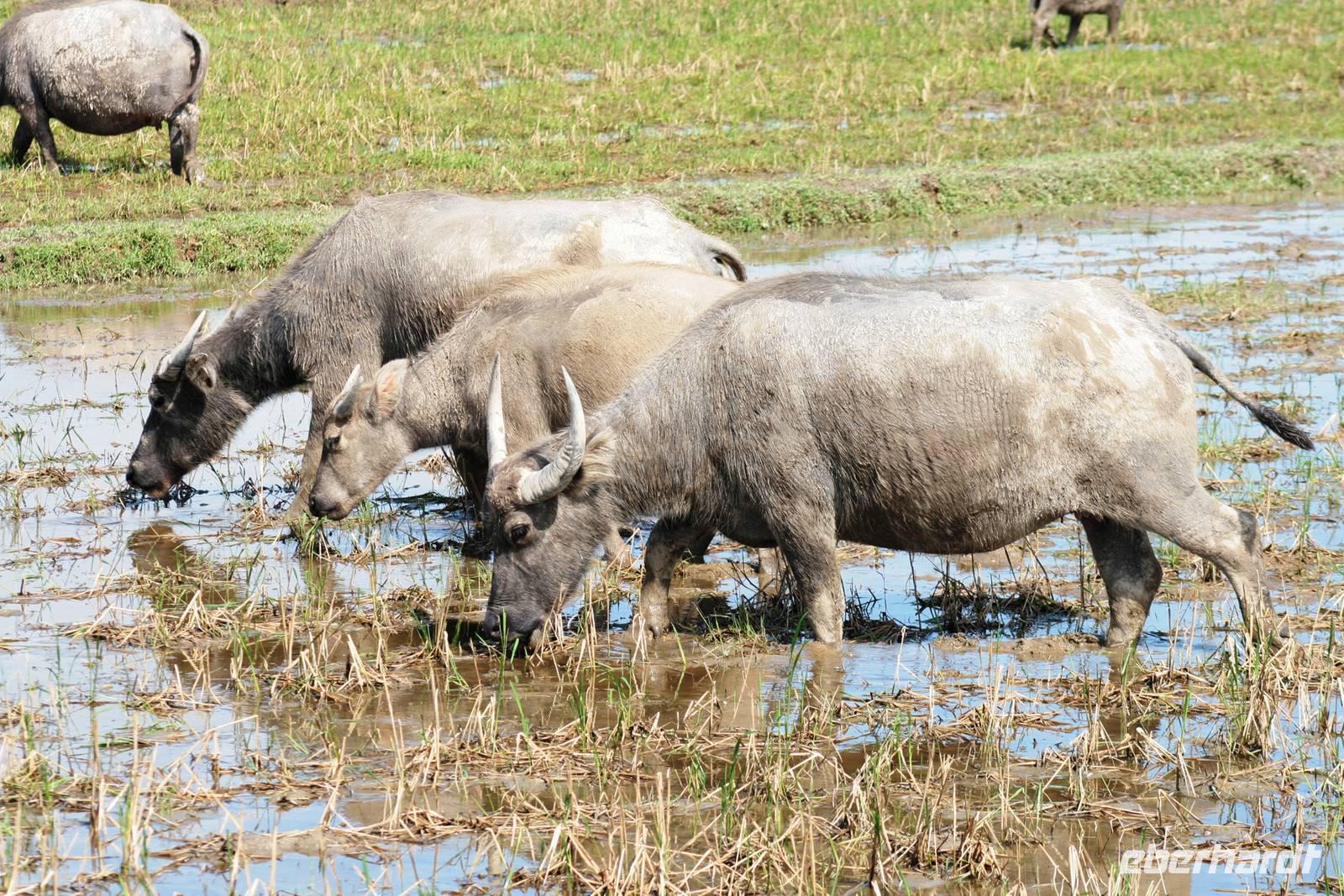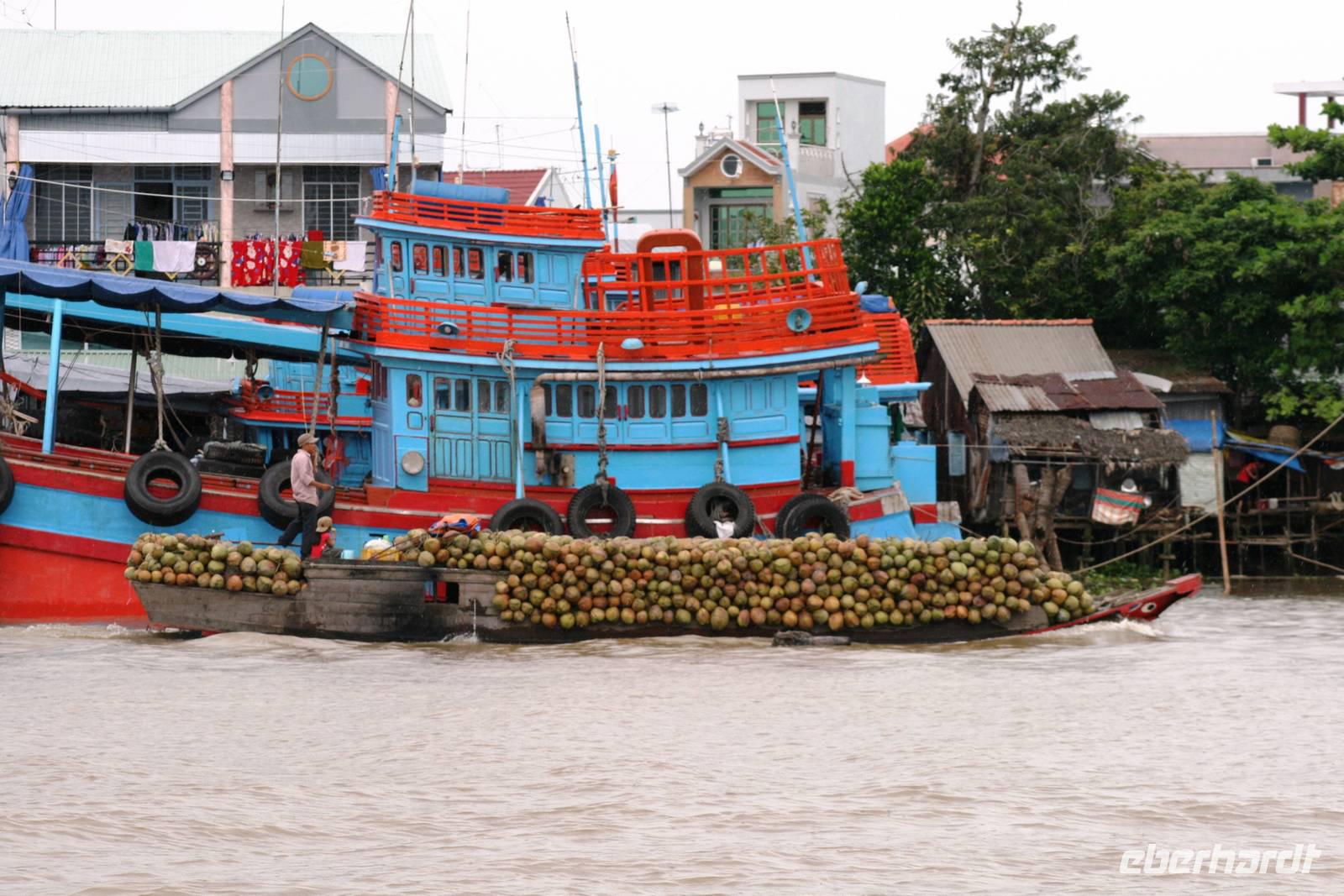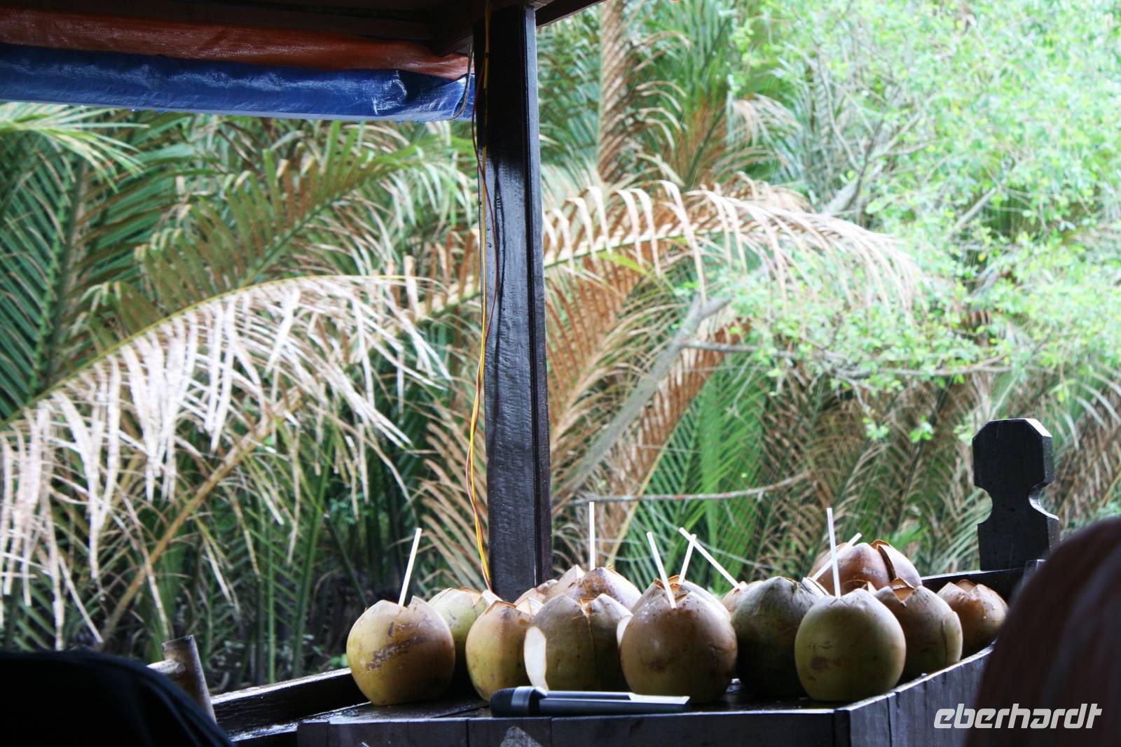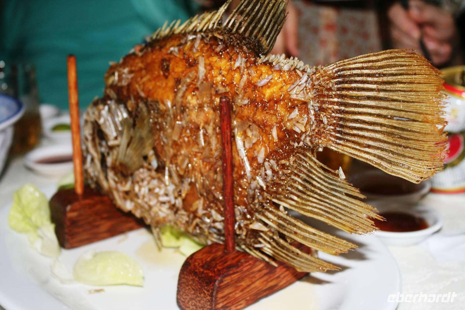 Bevor wir unsere Reise in Mekong Delta fortsetzten, drehten wir noch eine Runde durch Saigon. Wir besichtigten das alte Rathaus und die Oper im Tageslicht. Ein junges Brautpaar nahm ganz verlegen unsere Glückwünsche an. Vorbei am Ben Thanh Markt fuhren wir in den quirligen Stadtteil Cho Lon, besser bekannt als China Town. Durch die engen, mit Verkaufsständen vollgestopften Gassen zwängten sich Menschen, Tiere, Mopeds, Autos und auch wir. Aber alles kein Problem, wir bewunderten die asiatische Gelassenheit. In Deutschland wäre der ein oder andere Verkehrsteilnehmer schon längst "ausgerastet" und hätte auf sein "Recht" bestanden. Auf der Nationalstrasse 1 ging es dann schnell voran. Viel zu schnell, ein unplanmässiger Stopp folgte. Bereits am frühen Mittag erreichten wir My Tho, der Pforte zum Mekong Delta. Hier teilt sich der Mekong in mehrere Seitenarme, bevor er ins südchinesische Meer fliesst. Zunächst besichtigten wir die Vinh Trang Pagode mit ihren 3 weissen Buddhas, der eine sitzend, der andere liegend und der 3. stehend. Nicht nur überdimensionalen Buddha-Statuen faszinierten uns, sondern auch die wunderschöne, blumige Klosteranlage. Ein sehr guter Ersatz für den einzelnen weissen Buddha in Nha Trang. Im Hafen von My Tho bestiegen wir ein Boot und setzten über. Unterwegs beobachteten wir Fischerboote und vollbepackte Fähren, während wir genüsslich den frischen Saft einer Kokosnuss schlürften. Später verliessen wir das Boot und besuchten eine kleine Obstplantage, wo wir mit frischen Früchten wie Drachenfrucht, Ananas, Babybanane, Melone und Pomelo sowie grünen Tee mit selbstgemachten Honog bewirtet wurden. Dabei wurden wir mit heimischer Musik und "Python Schlangentanz" bestens unterhalten. Anschließend wurde uns die Herstellung von süßen Kokosbonbons schmackhaft gemacht. Natürlich durften wir auch reichlich naschen. Wir spazierten zu einem Dorf, wo auf kleine Kutschen mit klapprigen Pferden umsatteltet wurde. Auf "verwunschenen" Wasserwegen durchstreiften wir danach in hölzernen Sampas das Dickicht des Deltas und bewunderten die üppige Natur. Besonders gefielen uns die riesigen Früchte der Wasserpalmen. Mit dem großen Boot fuhren wir zur Phönixinsel, wo wir bei einer Bauernfamilie zum "Elefantenohrfischessen) eingeladen waren. Nach dem Essen verabschiedeten wir uns vom Mekong Delta und fuhren mit dem Bus nach Can Tho, wo wir am Abend ankamen. Nachdem wir unsere Hotelzimmer bezogen hatten, unternahmen wir einen Spaziergang zum Fluss. Im Restaurant "Sao Cho", wo wir vorher Plätze reserviert hatten, speisten wir a la carte. Annett bestellte die versprochenen Froschschenkel und stellte nach einem ersten vorsichtigen Testhappen fest, dass sie gar nicht so schlecht schmecken. Schnell fanden die äußerst strammen 5 Froschschenkel weitere mutige Abnehmer.