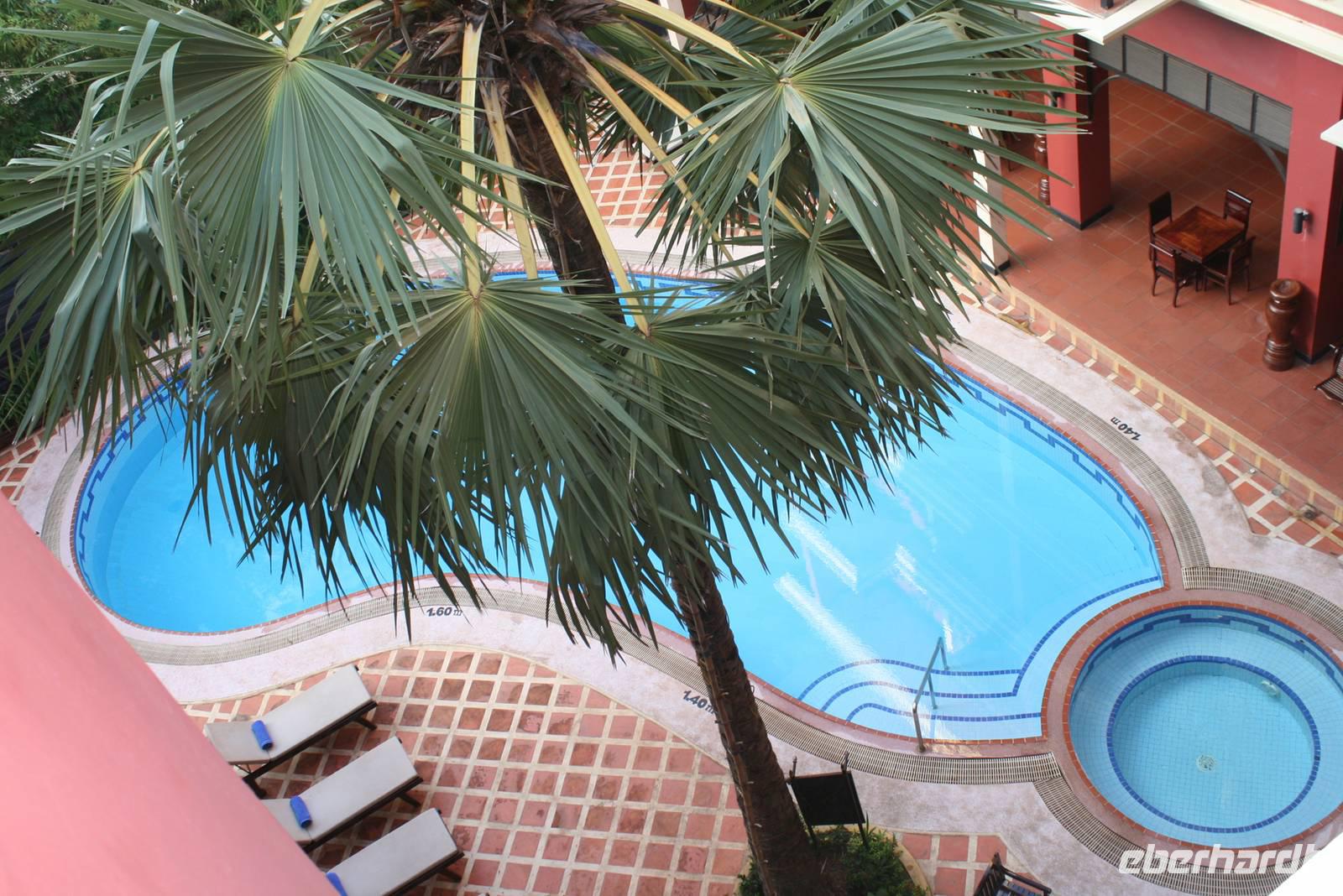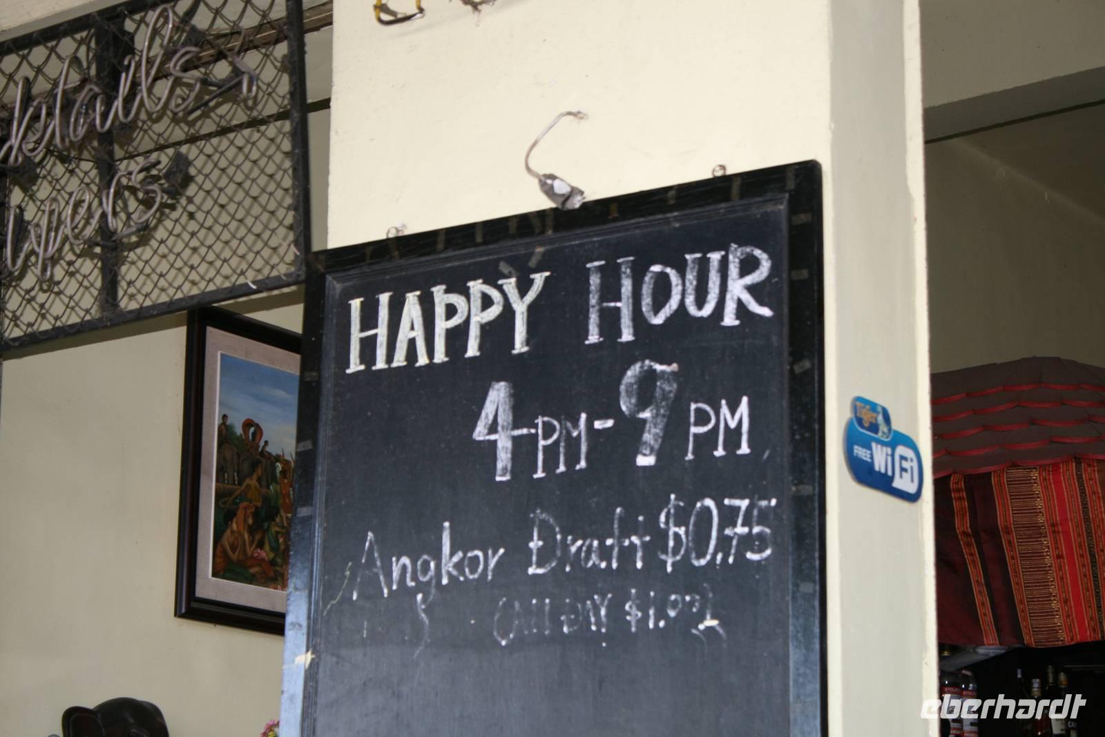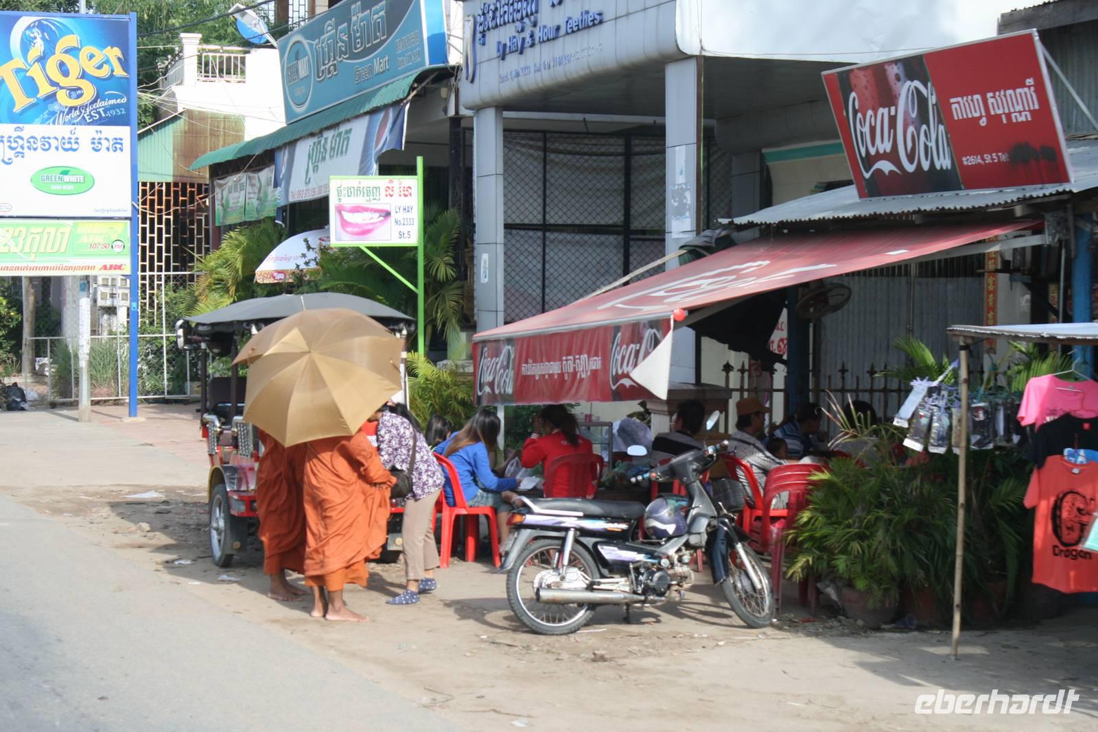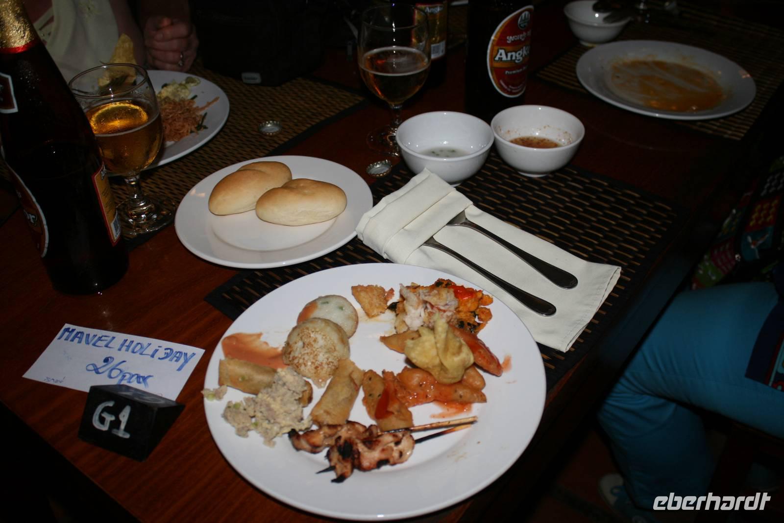 Ausgeschlafen und gut gefrühstückt fuhren wir mit dem Bus zum Königspalast. Alle waren, trotz der heissen Temperaturen, "sittlich" gekleidet (Knie und Schulter bedeckt). Die Palastanlage mit ihren wunderschön angelegten Gärten wurde 1886 zunächst aus Holz und später aus Stein gebaut. Zunächst bewundern wir den "Kanonenkugelbaum" am Eingang und später den Thronsaal, wo 2004 König Sihamoni, der Sohn des verehrten, 2012 verstorbenen "Gottkönig" Sihanouk gekrönt wurde. Der neue König ist längst nicht so verehrt wie sein Vater. Er hat nichts zu sagen, die politischen Geschäfte führen andere. Er widmet sich eher der Kunst, denn er studierte Tanz in der damaligen Tschechoslowakei, wo er über 10 Jahre verbrachte. Man munkelt sogar, dass er mit einer hübschen Tschechin ein Kind hat (das war übrigens auch Gesprächstthema Nr. 1 mit dem netten Ehepaar aus Brno, später auf dem Flug von Siem Reap nach Bangkok). Anschließend spazierten wir zur Silberpagode, die leider seit 3 Jahren nur noch durch die offenen Fenster besichtigt werden darf. Über 5.000 Silberfließen bedecken den Fußboden und im Inneren steht eine smaragde Buddhafigur aus Kristallen sowie ein ca. 90 kg schwerer, echt goldener Buddha, der mit über 2.000 Edelsteinen (meist 25 Karat) verziert ist, WOW! In der Nähe des Königspalastes befindet sich das Nationalmuseum, im offenen Khmer Stil erbaut, welches wir im Anschluss besuchten. Die Räume sind in verschiedene Epochen unterteilt. Besonders interessierte uns natürlich Angkor-Zeit, da uns der Besuch von Angkor als Höhepunkt am Ende unserer Reise noch bevor stand. Nun war noch der Besuch des Wat Phnom Penh auf unserem Plan, dem Hauptheilgtum der Stadt. Die Entstehung der Pagode ist eng mit der Gründungslegende der Stadt verbunden, als die Dame Penh in einem Baustamm Buddhastatuen fand. Nach der Besichtigungstour bei Sonnenschein und hitzigen Temperaturen waren alle pflastermüde und hungrig. So kehrten wir auf Empfehlung von Chan Thou in ein heimisches Straßenrestaurant ein und liessen uns vom freundlichen Personal kulinarisch verwöhnen und mit deren guter Laune unterhalten. Der weitere Nachmittag stand zur freien Verfügung. Unser netter "Bussicoach" chauffierte uns noch zum Zentralmarkt, wo wir dann auf eigene Faust die Stadt erkundeten: Bummeln, Shoppen, Tuk Tuk fahren und vieles mehr. Zum Abendessen fuhren wir in das neu eröffnete, lokale Restaurant "333", wo wir mit Livemusik (wer wollte, konnte mitsingen) unterhalten wurden. Auf unser Essen mußten wir zwar etwas warten, aber die frisch von Mama zubereiteten Speisen schmeckten fast allen sehr gut und auch über die Getränkepreise konnten wir uns nicht beklagen. Auf der Rückfahrt zum Hotel verabschiedeten wir uns von Chan Thou, denn am nächsten Tag ging unsere Reise weiter.