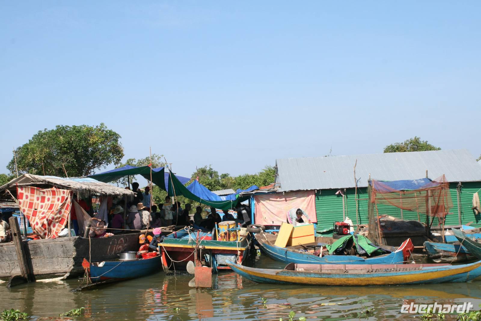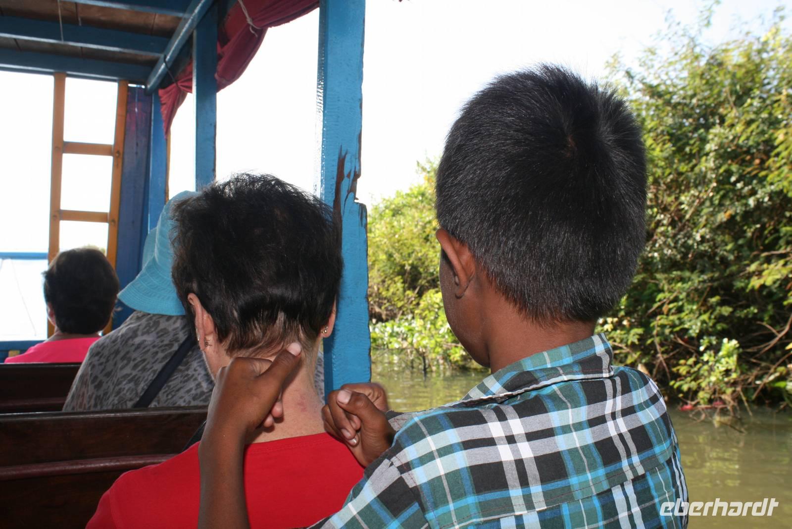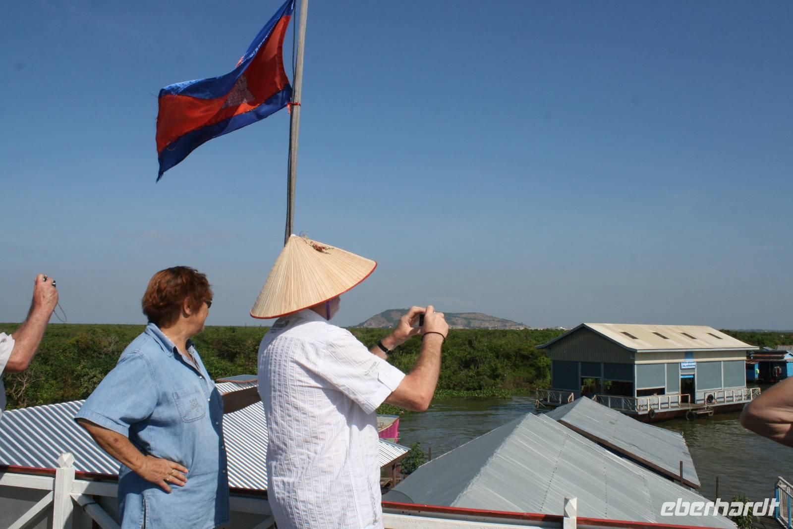 Nach dem Frühstück stand ein letzter Ausflug auf dem Programm. Mit dem Bus fuhren wir, vorbei an Stelzenhäuschen und Fischerdörfern, zum Tonle Sap, wo wir auf ein Boot umstiegen. Der Tonle Sap ist Rückhalte- bzw. Sammelbecken für den Mekong. Die meisten Bewohner dieser Region ernähren vom Fischfang. Kein Wunder, denn der Tonle Sap ist sehr arten- und fischreich, wie uns Minh Thol informierte. Krokodile soll es hier auch geben, an uns vorbei geschwommen ist aber keines. Wir schipperten auf den offenen See und besuchten ein schwimmendes Dorf mit ebenso schwimmender Kirche und Schule. Zurück im Hotel hiess es Koffer packen. Da wir erst am Abend flogen, hatten wir noch genügend Zeit. Gestärkt nach einem leckeren Khmer-Kitchen-Mittagessen stürmten wir den Alten Markt im französischen Viertel und gaben unser letztes Geld aus. Am Abend fuhren zum Flughafen und verabschiedeten uns herzlich von Minh Thol und unserem Bussicoach. Gern nahmen wir die Einladung der Thai an, die Wartezeit bis zum verspäteten Abflug nach Bangkok mit kleinen Snacks und Getränken in der Lounge zu verkürzen. In Bangkok hoben wir mit dem A380 der Thai in die Lüfte ab und landeten am nächsten Tag wohlbehalten in Frankfurt, wo wir uns verabschiedeten und sich unsere Wege trennten. Unsere Umsteigezeit war relativ knapp, aber alle Gäste erreichten ohne Probleme die Zubringerflüge. Über das etwas schlecht gelaunte Bodenpersonal der LH (wahrscheinlich mit dem verkehrten Bein aufgestanden) lächelten wir einfach müde hinweg.