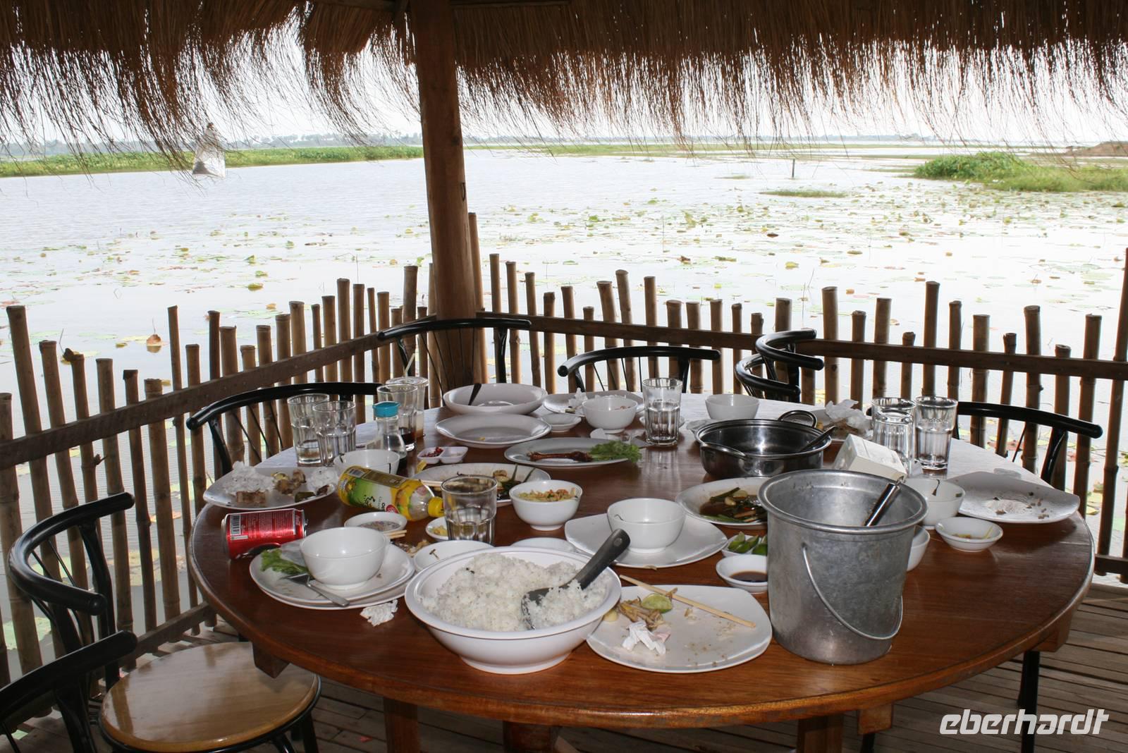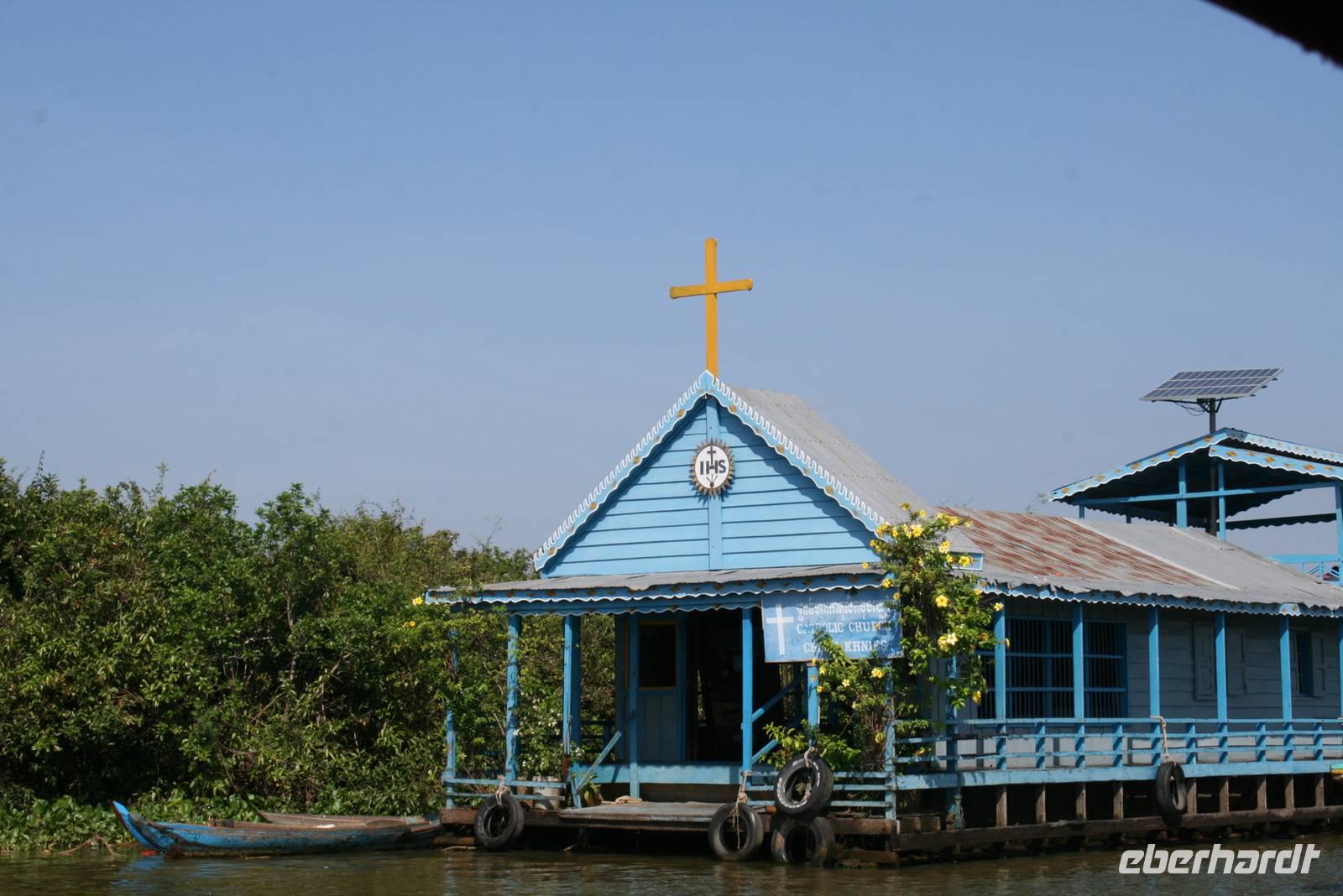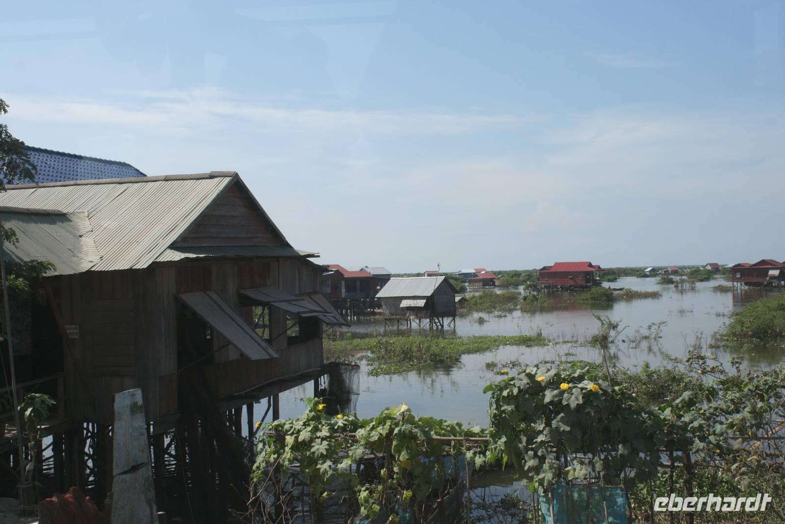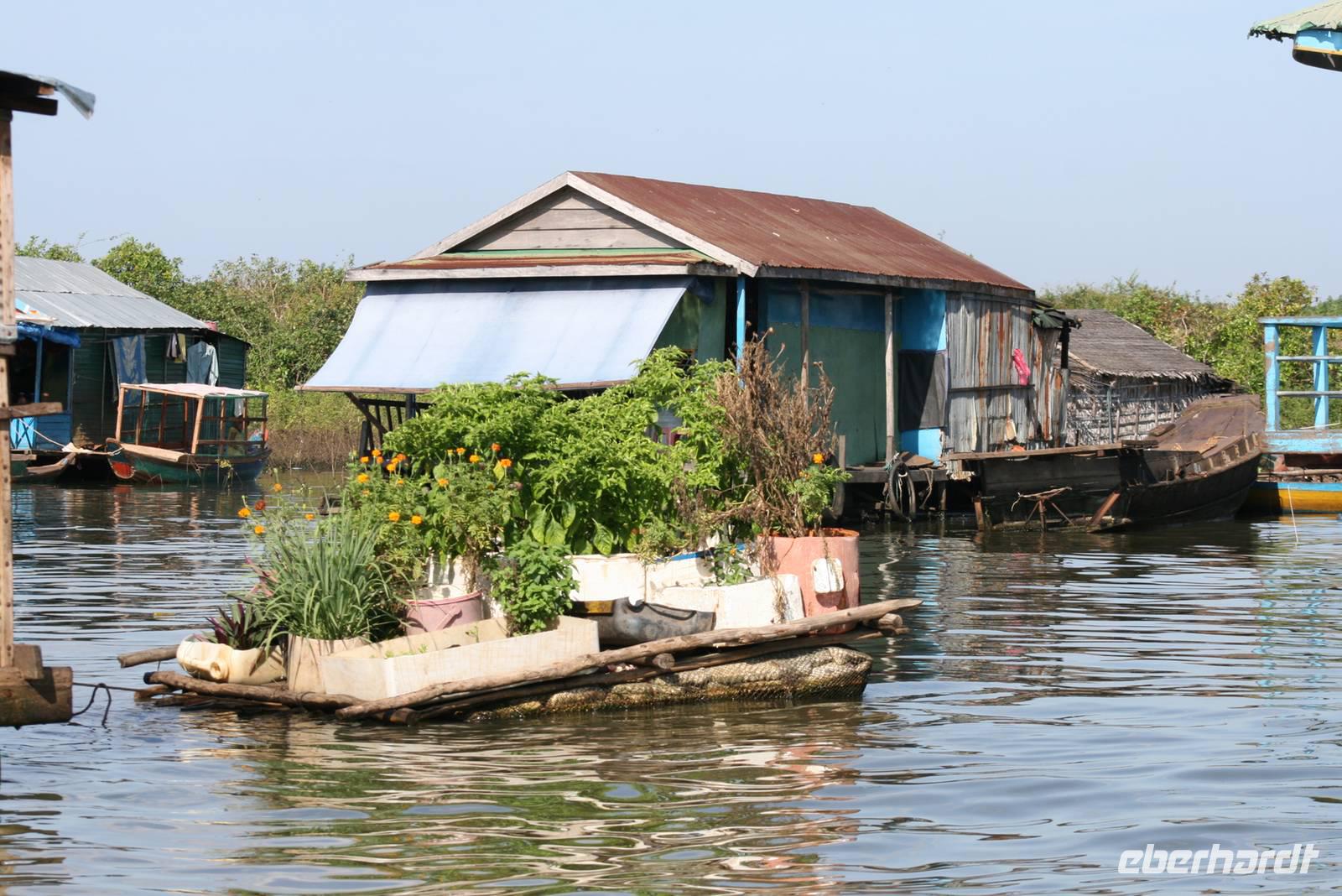 Nach dem Frühstück stand ein letzter Ausflug auf dem Programm. Mit dem Bus fuhren wir, vorbei an Stelzenhäuschen und Fischerdörfern, zum Tonle Sap, wo wir auf ein Boot umstiegen. Der Tonle Sap ist Rückhalte- bzw. Sammelbecken für den Mekong. Die meisten Bewohner dieser Region ernähren vom Fischfang. Kein Wunder, denn der Tonle Sap ist sehr arten- und fischreich, wie uns Minh Thol informierte. Krokodile soll es hier auch geben, an uns vorbei geschwommen ist aber keines. Wir schipperten auf den offenen See und besuchten ein schwimmendes Dorf mit ebenso schwimmender Kirche und Schule. Zurück im Hotel hiess es Koffer packen. Da wir erst am Abend flogen, hatten wir noch genügend Zeit. Gestärkt nach einem leckeren Khmer-Kitchen-Mittagessen stürmten wir den Alten Markt im französischen Viertel und gaben unser letztes Geld aus. Am Abend fuhren zum Flughafen und verabschiedeten uns herzlich von Minh Thol und unserem Bussicoach. Gern nahmen wir die Einladung der Thai an, die Wartezeit bis zum verspäteten Abflug nach Bangkok mit kleinen Snacks und Getränken in der Lounge zu verkürzen. In Bangkok hoben wir mit dem A380 der Thai in die Lüfte ab und landeten am nächsten Tag wohlbehalten in Frankfurt, wo wir uns verabschiedeten und sich unsere Wege trennten. Unsere Umsteigezeit war relativ knapp, aber alle Gäste erreichten ohne Probleme die Zubringerflüge. Über das etwas schlecht gelaunte Bodenpersonal der LH (wahrscheinlich mit dem verkehrten Bein aufgestanden) lächelten wir einfach müde hinweg.