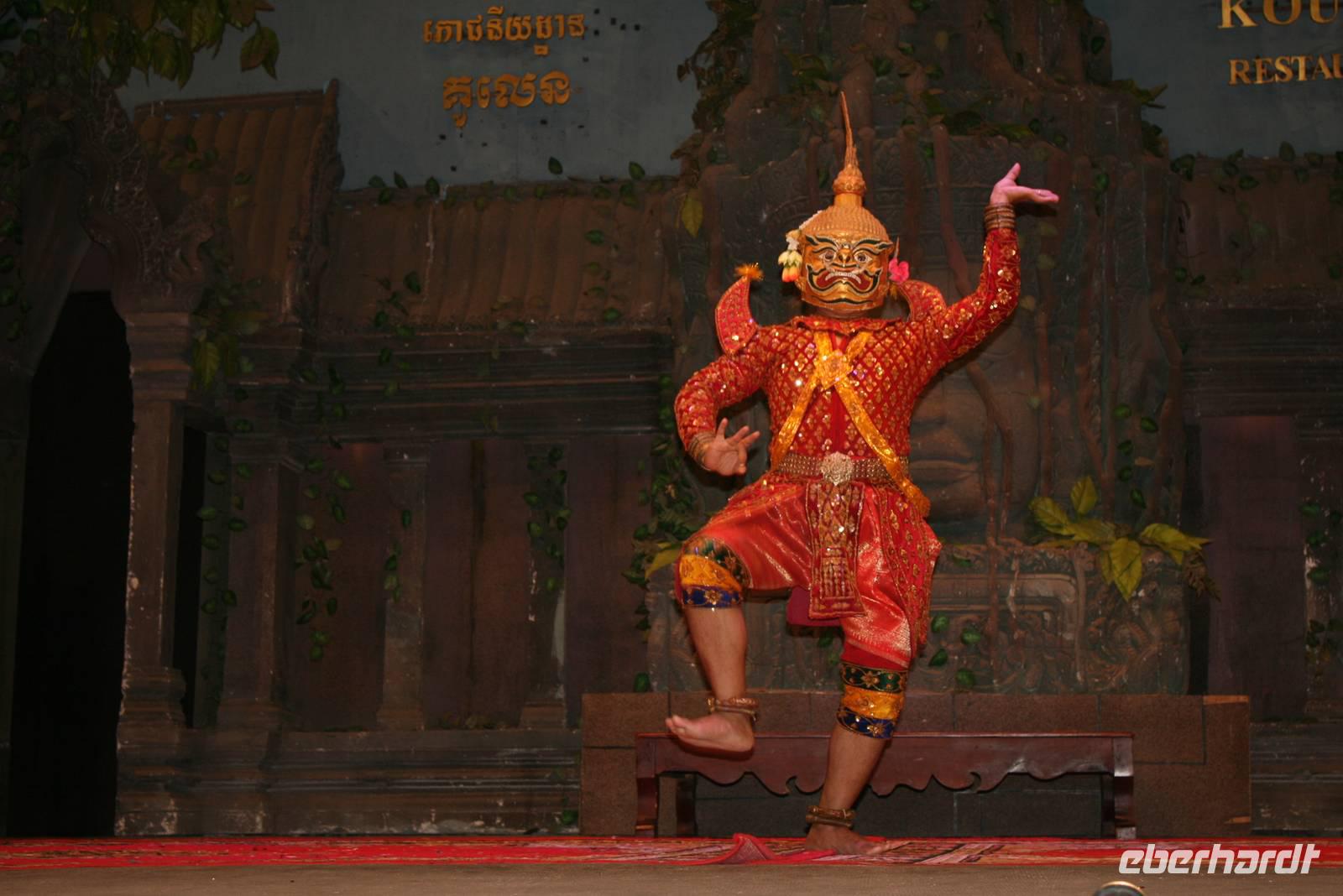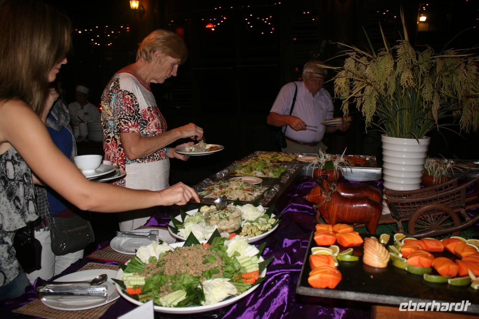 Alle fieberten den Besuch von Angkor entgegen. Am Eingang zur Königsstadt wurden wir fotografiert und erhielten unseren Besucherpass. Angkor erfasst ein riesiges Areal von über 350 Tempeln, die wir leider nicht alle besichtigen konnten. Die aufgeteilten Tempelbezirke aus verschiedenen Jahrhunderten waren gleichzeitig Städte/Reiche und Tempel die zentralen Mittelpunkte. Angkor Wat, das größte Sakralbauwerk der Welt hat als einziger viele Jahrhunderte als buddhistisches Kloster und Heiligtum überdauert. Bevor wir zur Besichtigung starteten, begrüßten wir noch unsere Frühaufsteher, die auf Elefanten in Angkor Thom unterwegs waren. Minh Thol ist ein wahrer Experte in Sachen Khmer Kultur und kennt fast jeden Stein, jedes Relief und die besondere Bedeutung der Lotusblume. Seine Ausführungen und Erklärungen begeistern, trotz der steigenden Temperaturen. Trotzdem schafften es viele bis zur 3. Ebene, die wir über eine neue, dennoch steile Treppe erreichten. Vor einigen Jahren konnte man diese Ebene nur über die originale Steintreppe erklettern, die nun nicht mehr zugänglich ist. Nach über 3 h intensiver Führung, die schon einer Studienreise glich, hatten wir uns unsere Mittagspause redlich verdient und tankten Kraft für die Besichtigung von Angkor Thom. Um in diesen Tempelbezirk zu gelangen, mußten wir auf kleine Shuttlebusse, die durch die alten, engen Stadttore passen, umsatteln. Aber besser schlecht gefahren, als bei 35° C gelaufen! Im Mittelpunkt Angkor Thoms, auch ehemals eine eigene Tempelstadt, steht der Bayon Tempel. Fasziniert schauten wir auf dessen Türme mit den riesigen, aus Steinblöcken gemeiselten Gesichtern (oder schauten diese uns an?), die den Tempel so einzigartig machen. Anschließend liefen wir zur Elefantenterrasse, wo wir bei gefühlten Temperaturen um die 40° C und extrem hoher Luftfeuchtigkeit froh waren, wieder in den Bus steigen zu können. Die Pause im Hotel tat allen gut. Am Abend erwartete uns eine Apsara Tanzshow im Restaurant "Koulen". Bevor diese begann, bedienten wir uns am Riesenbuffet, was keine Wünsche offen liess. Von unserem Tisch in der ersten Reihe hatten wir einen guten Blick: Getanzte Szenen aus dem Leben und der Mythologie, begleitet von traditioneller Musik wurden auf der Bühne präsentiert. Höhepunkt der Show war sicher für viele der Tempeltanz der anmutenden, reizenden Apsara Tänzerinnen.