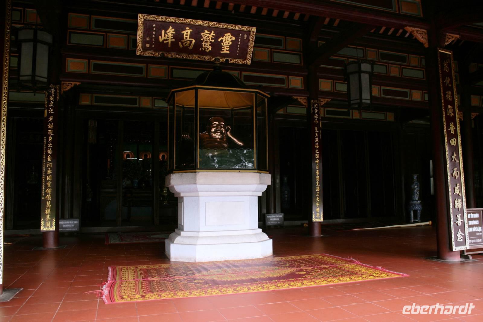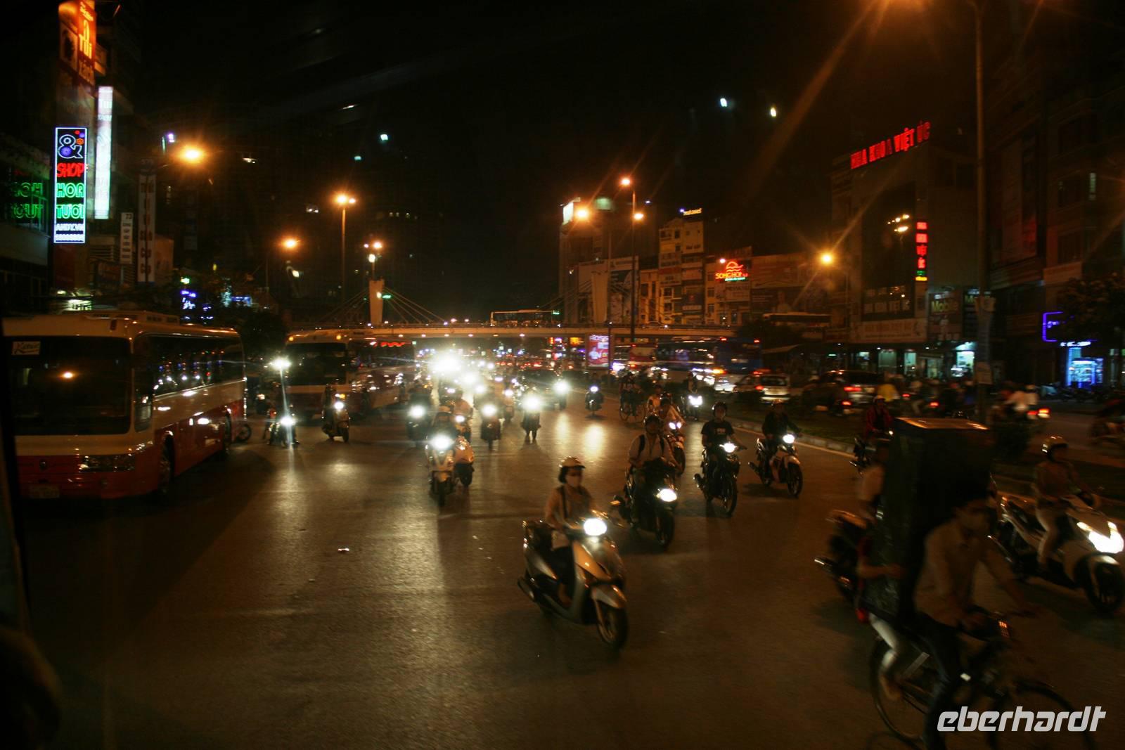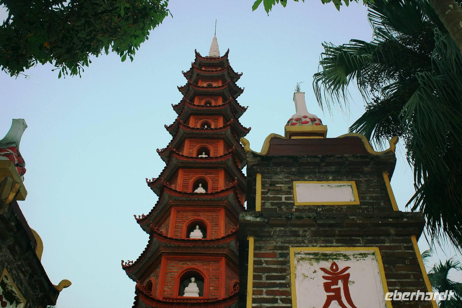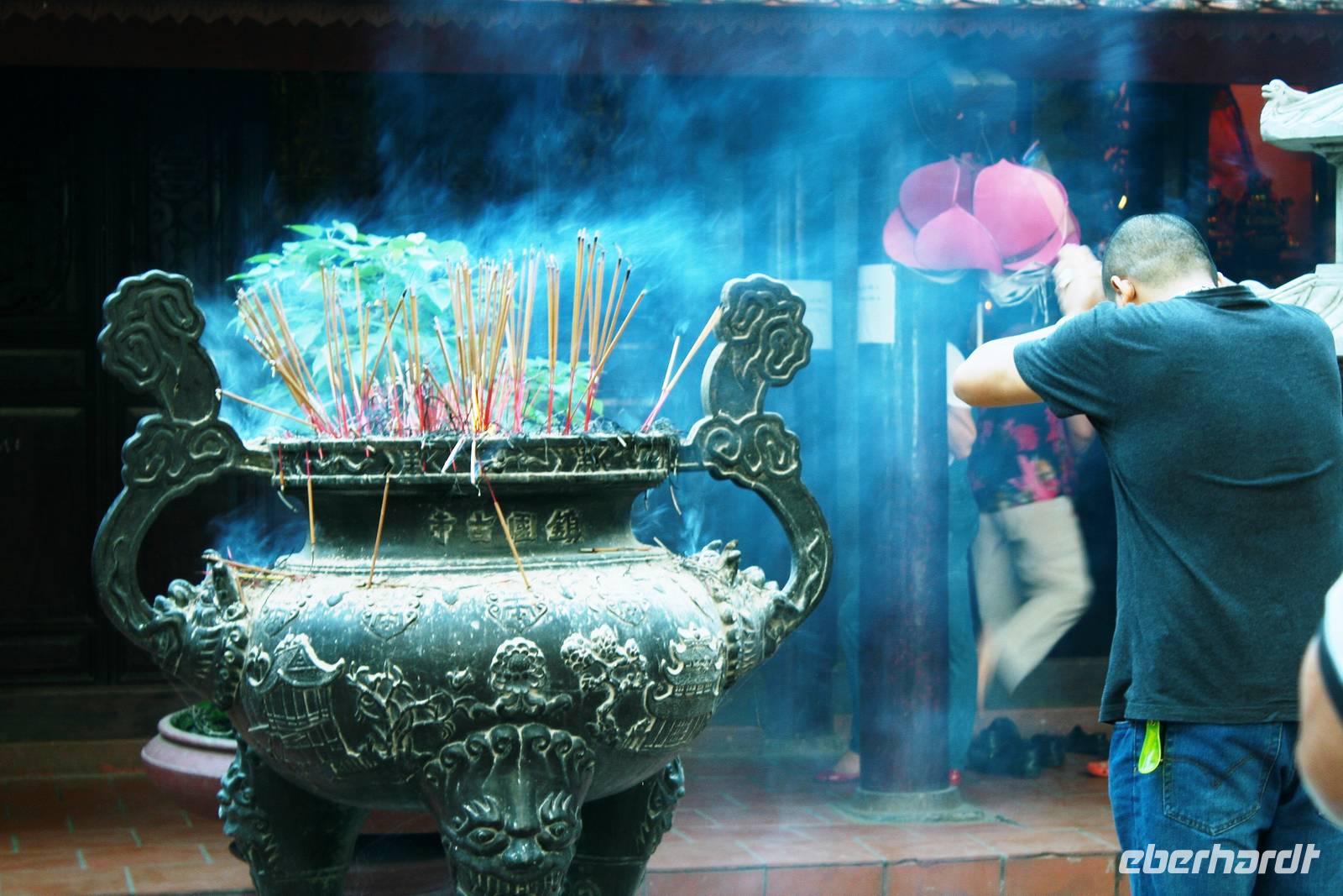 Am Flughafen Frankfurt/Main war unsere 25köpfige Reisegruppe komplett. Alle Zubringerflüge von den Heimatflughäfen TXL, LEJ und DRS waren pünktlich. Am Gate der Thai mußten alle Bordkarten getauscht werden, da die Systeme der Lufthansa und der Thai nicht kompatibel sind. Mit etwas Verspätung flogen wir mit dem A380 nach Bangkok, wo wir am nächsten Morgen landeten und auf den "Laufbändern" noch ein paar Kilometer zum nächsten Gate zurück legen mußten. Trotz der knappen Umsteigezeit und strenger Sicherheitskontrolle erreichten wir unseren Flieger und starteten nach Hanoi, wo unser Reiseleiter Ot uns am Mittag in Empfang nahm. Plus 6 h und 25° C wärmer, an diese Unterschiede zu Deutschland mußten wir uns erst mal gewöhnen. Die lange Reise steckte uns noch in den "Knochen" und so waren wir froh, dass wir gleich unsere Zimmer im Hotel beziehen konnten. Nach einer Frischmachpause bummelten wir am Nachmittag mit Ot durch die belebten Gassen Hanois um den Truc Bach See. An der Uferpromenade lag das Geld auf der Strasse. Leider nur Falschgeld, welches gläubige Vietnamesen als Opfergabe für ihre Ahnen verbrennen. Die Gegend um den West See wird auch als "Hanois Beverly Hills" bezeichnet. In den letzten Jahren entwickelte sich der Stadtteil zu einem Villenviertel der Reichen. Auch die Hanoier verbringen gern ihre Freizeit am West See. Zahlreiche Cafes, Parkanlagen und Verkaufsstände säumen den schmalen Damm, der den Truc Bach See vom West See trennt. Auf einer kleinen Halbinsel befindet sich die Chua Tran Quoc Pagode, Hanois ältestes Heiligtum. Nach der Besichtigung schlenderten wir zurück und fuhren zum Abendessen in ein Restaurant. Zum Abschluss des Tages erhielten alle Gäste eine kleines Reisschnapsschälchen aus Porzellan, welches ab sofort am Mann/Frau zu tragen war. Wir stießen mit einem guten Reisschnaps auf den ersten Tag an und verabschiedeten uns in unsere weichen Betten.