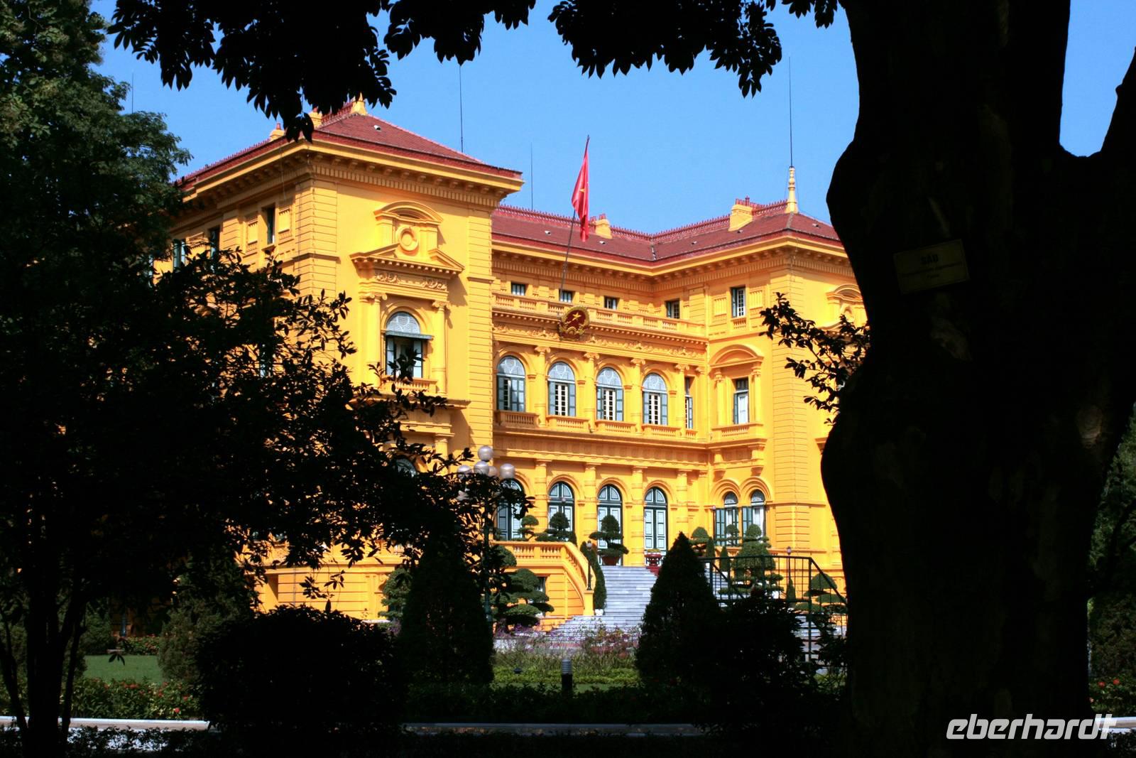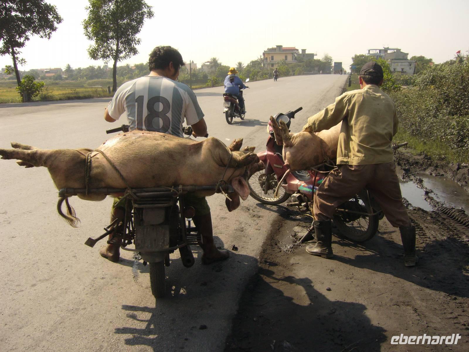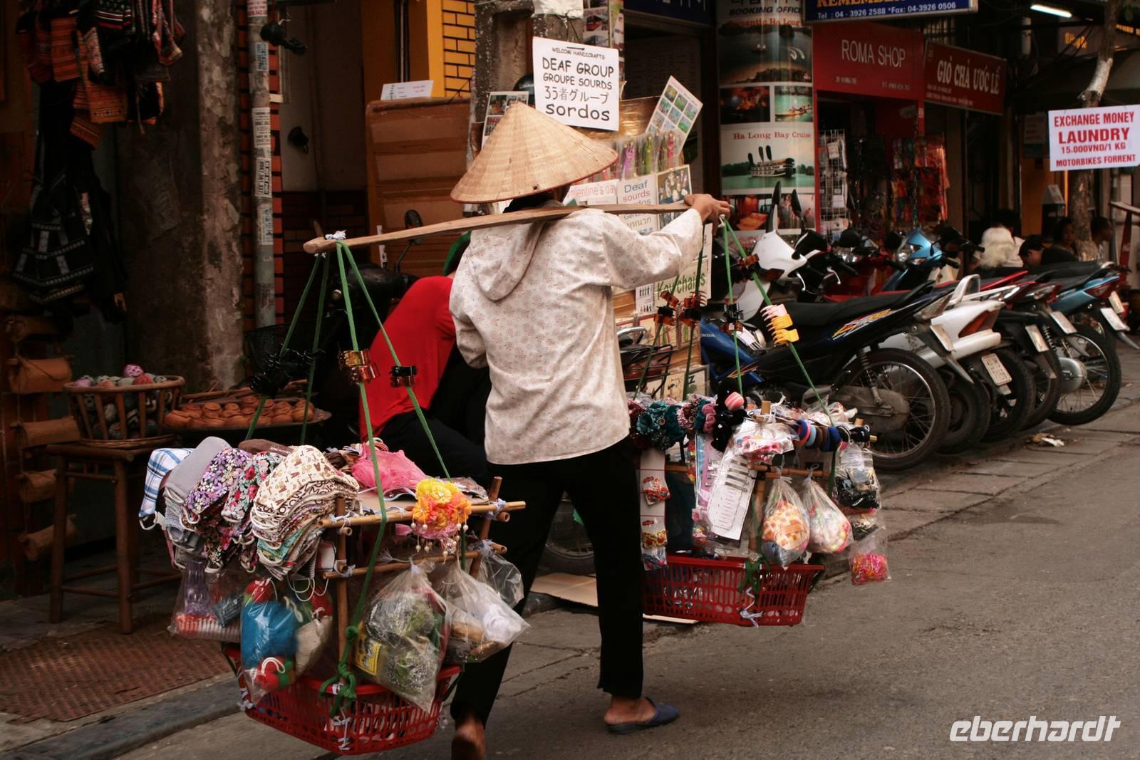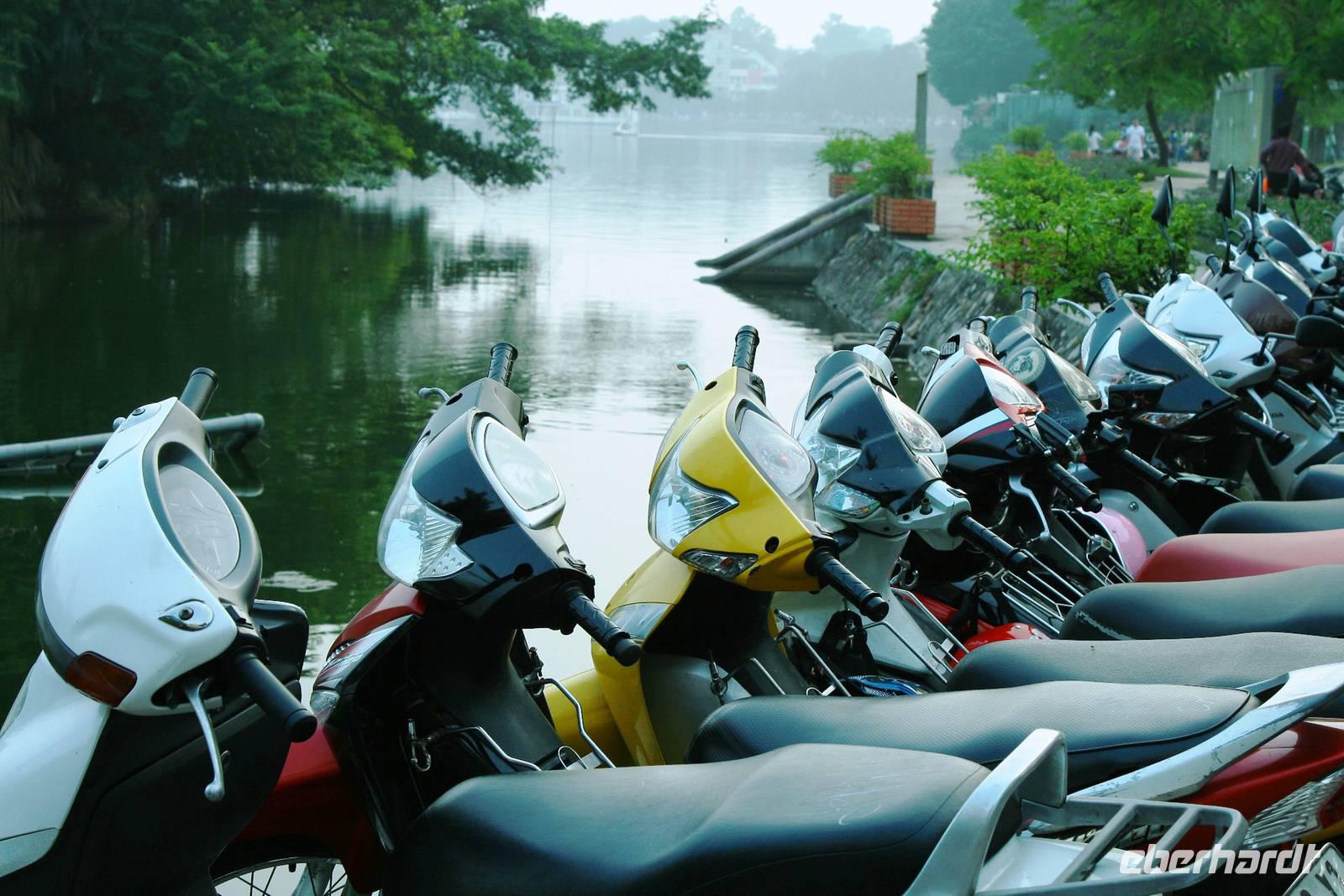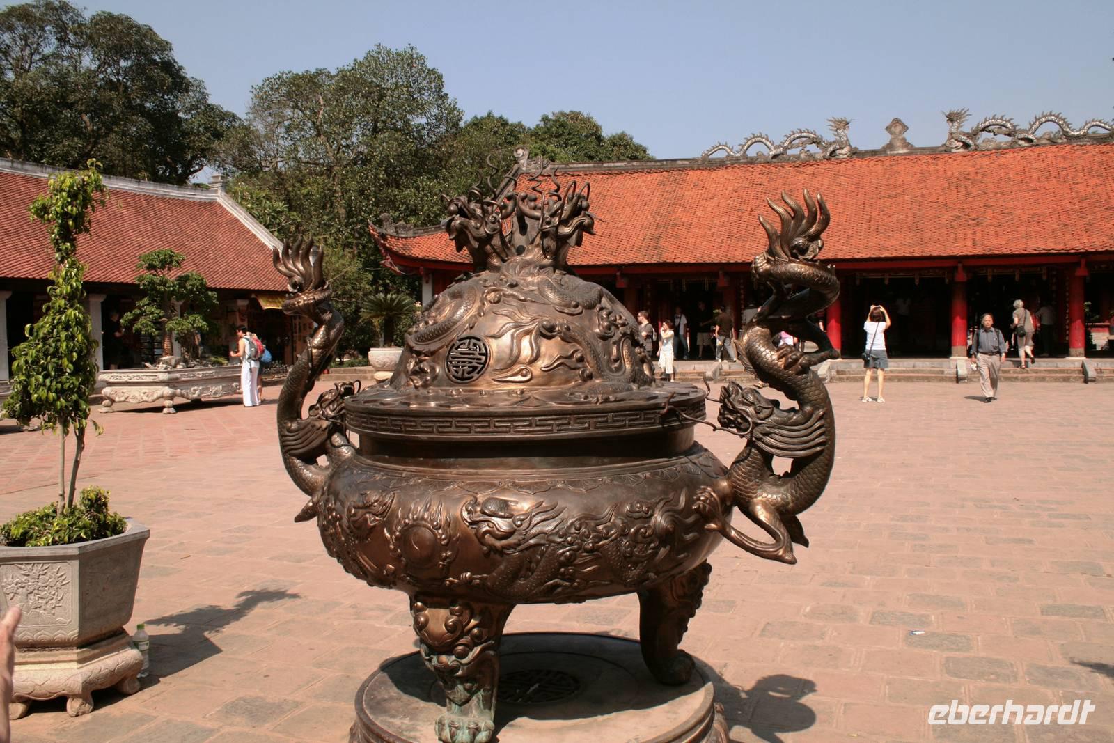 Am Flughafen Frankfurt/Main war unsere 25köpfige Reisegruppe komplett. Alle Zubringerflüge von den Heimatflughäfen TXL, LEJ und DRS waren pünktlich. Am Gate der Thai mußten alle Bordkarten getauscht werden, da die Systeme der Lufthansa und der Thai nicht kompatibel sind. Mit etwas Verspätung flogen wir mit dem A380 nach Bangkok, wo wir am nächsten Morgen landeten und auf den "Laufbändern" noch ein paar Kilometer zum nächsten Gate zurück legen mußten. Trotz der knappen Umsteigezeit und strenger Sicherheitskontrolle erreichten wir unseren Flieger und starteten nach Hanoi, wo unser Reiseleiter Ot uns am Mittag in Empfang nahm. Plus 6 h und 25° C wärmer, an diese Unterschiede zu Deutschland mußten wir uns erst mal gewöhnen. Die lange Reise steckte uns noch in den "Knochen" und so waren wir froh, dass wir gleich unsere Zimmer im Hotel beziehen konnten. Nach einer Frischmachpause bummelten wir am Nachmittag mit Ot durch die belebten Gassen Hanois um den Truc Bach See. An der Uferpromenade lag das Geld auf der Strasse. Leider nur Falschgeld, welches gläubige Vietnamesen als Opfergabe für ihre Ahnen verbrennen. Die Gegend um den West See wird auch als "Hanois Beverly Hills" bezeichnet. In den letzten Jahren entwickelte sich der Stadtteil zu einem Villenviertel der Reichen. Auch die Hanoier verbringen gern ihre Freizeit am West See. Zahlreiche Cafes, Parkanlagen und Verkaufsstände säumen den schmalen Damm, der den Truc Bach See vom West See trennt. Auf einer kleinen Halbinsel befindet sich die Chua Tran Quoc Pagode, Hanois ältestes Heiligtum. Nach der Besichtigung schlenderten wir zurück und fuhren zum Abendessen in ein Restaurant. Zum Abschluss des Tages erhielten alle Gäste eine kleines Reisschnapsschälchen aus Porzellan, welches ab sofort am Mann/Frau zu tragen war. Wir stießen mit einem guten Reisschnaps auf den ersten Tag an und verabschiedeten uns in unsere weichen Betten.