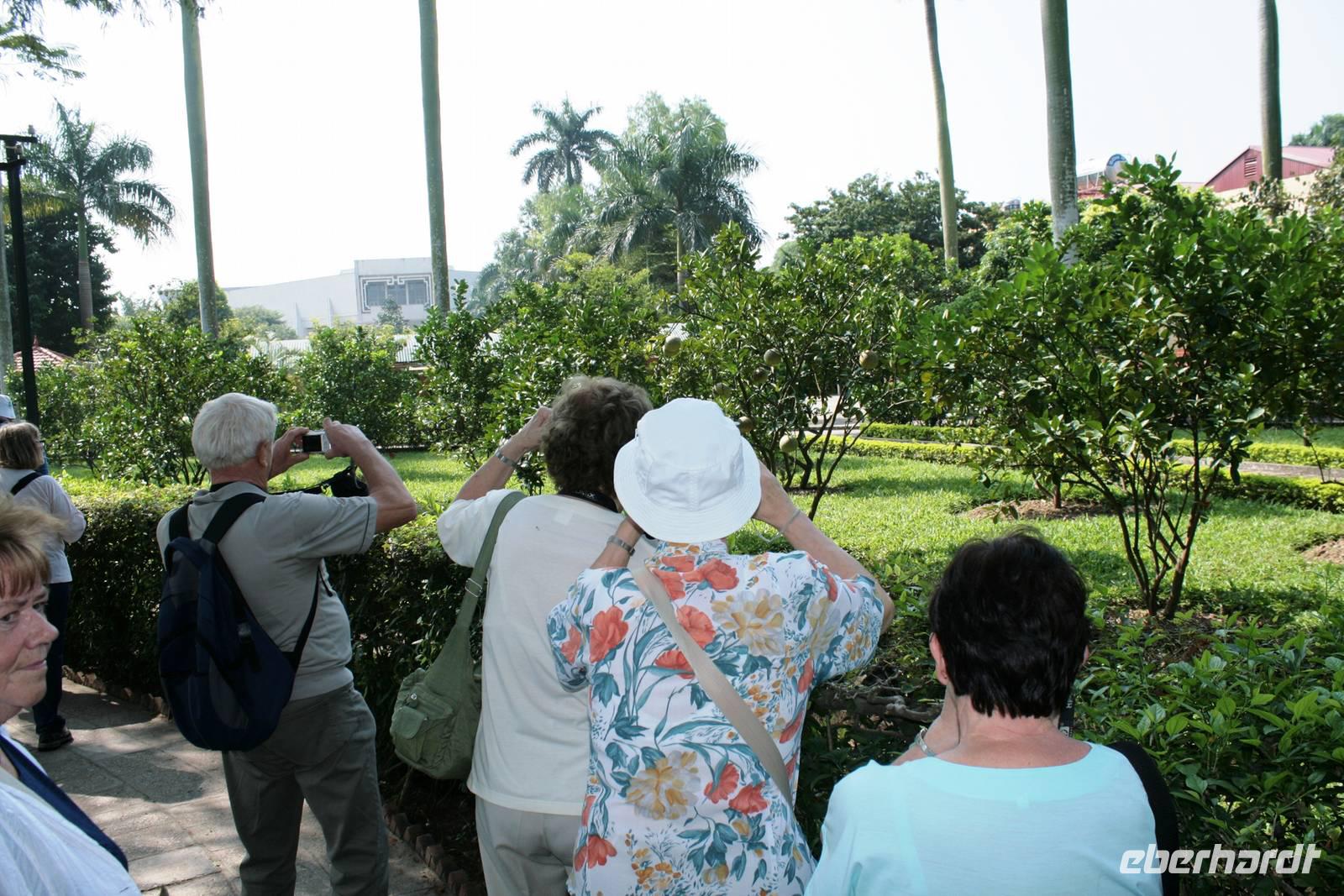 Wir verabschiedeten uns vom angenehm kühlen Da Lat und begannen eine längere Fahrt in weitaus wärmere Gefilde nach Saigon, alias Ho Chi Minh City. Zusätzlich zum Programm wollten wir uns den romantischen Wasserfall Thoc Gougah ansehen, der aber aufgrund der starken Überschwemmungen in den letzten Wochen in diesem Gebiet, verschlammt und uneinsehbar war. So erfreuten wir uns an der üppigen Flora, bevor wir das Bergland endgültig verliessen. Aus unserem Bus betrachten wir die vorbei ziehenden Landschaften: Kaffee- und Teeplantagen (leider wurde nicht geerntet), später Kautschuk- und Teakholzhainen, die von Maniokgewächsen gesäumt wurden. Fotostopps unterbrachen unsere Fahrt, so bei einem Kaffeebauern, der uns stolz seinen "Reichtum" präsentierte. Huong zeigte uns dabei mit sichtlichem Spass, wie Kaffee auf traditionelle Weise getrocknet wird. In einem Restaurant am Fluss, der ebenfalls reichlich Wasser führte, verbrachten wir die Mittagszeit und sättigten unsere Mägen natürlich wieder mit Gemüsesuppe oder gebratenen Nudeln. Je näher wir Saigon kamen, wurden die Strassen schlechter, hatten geschlagene Löcher (Originaltext Huong) und der Verkehr wurde dichter. Doch unser Busfahrer versuchte auf Umwegen das Ziel schneller zu erreichen. In der Abenddämmerung erblickten wir die beeindruckende Silhouette von Saigon, das sich modern und hoch präsentierte, ganz anders als in Hanoi. Doch bevor wir zum Hotel fuhren, hatten wir noch eine Überraschung parat: Von der Agenturchefin Hang waren wir zum vietnamesischen "Oktoberfest" in ihr Beerhouse eingeladen. Von ihr und Christian wurden wir bereits erwartet und mit leckeren Bratwürstchen sowie hellem und dunklem Bier aus der hauseigenen Brauerei bewirtet. Und das ohne Limit: mehrere 5-Liter-Pitcher wurden an unsere Tische gebracht und wir konnten selber zapfen. Der lustige Abend wurde dann doch etwas länger als geplant. Nach einer herzlichen Verabschiedung und einem riesigen Dankeschön stiegen wir gut gelaunt in den Bus und fuhren sofort zum Restaurant Indochine, wo wir im lauschigen Garten zu Abend speisten. Danach ging`s zum Hotel, wo wir satt und müde in unsere Betten fielen.
