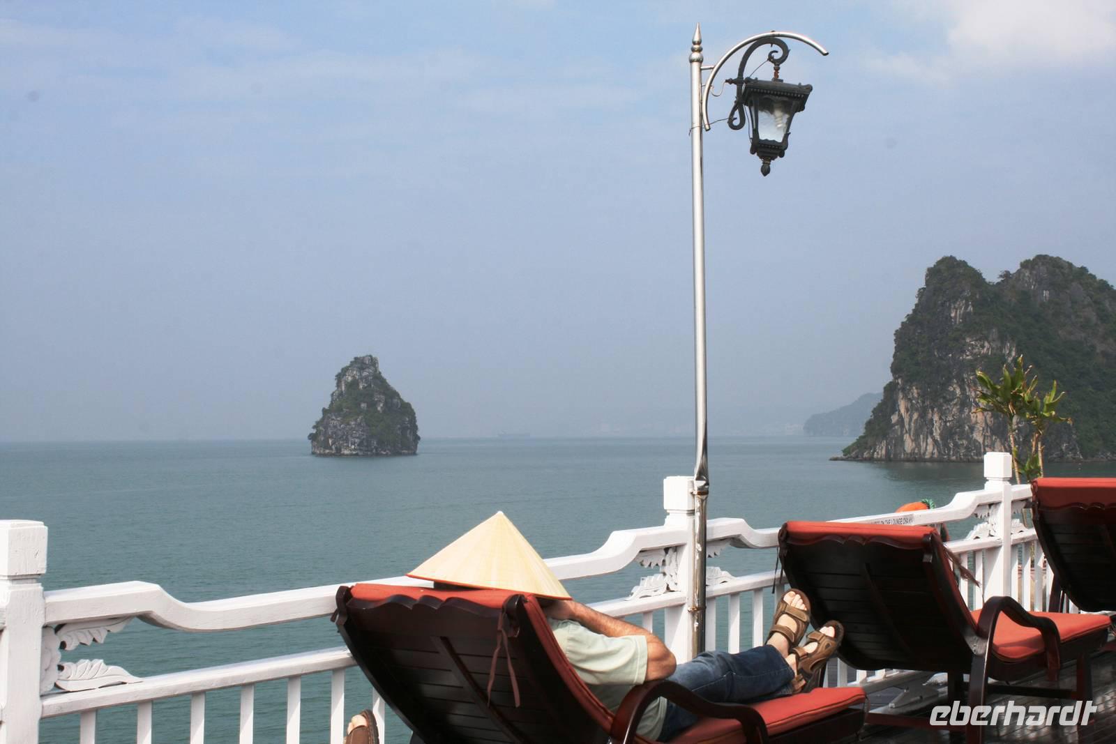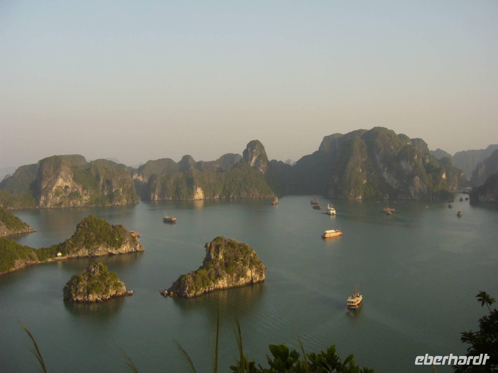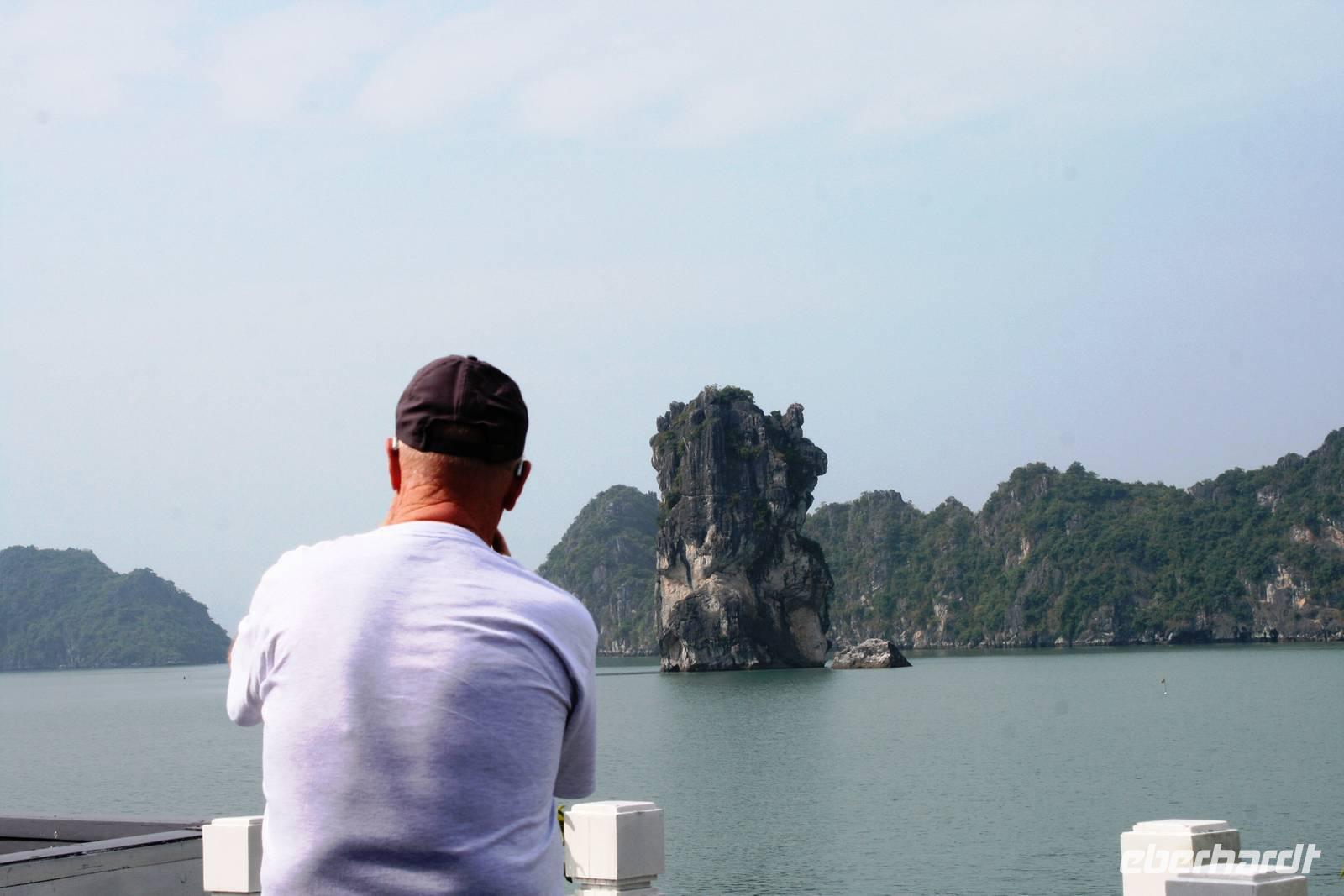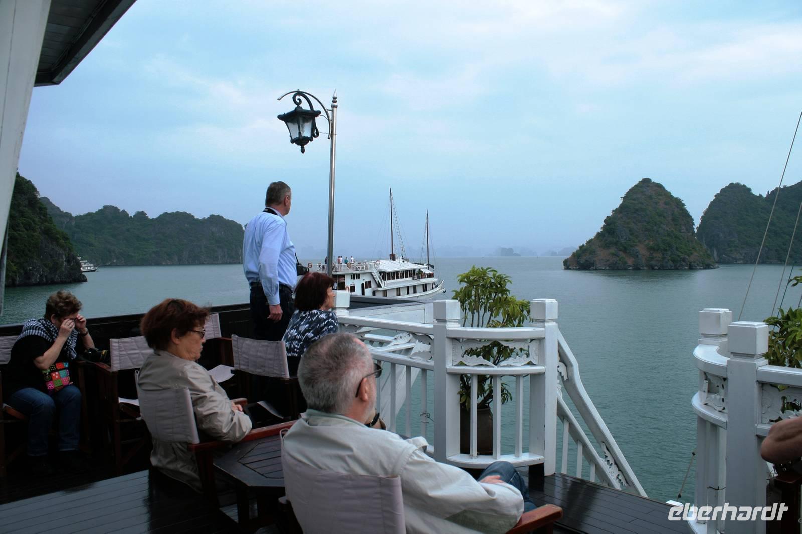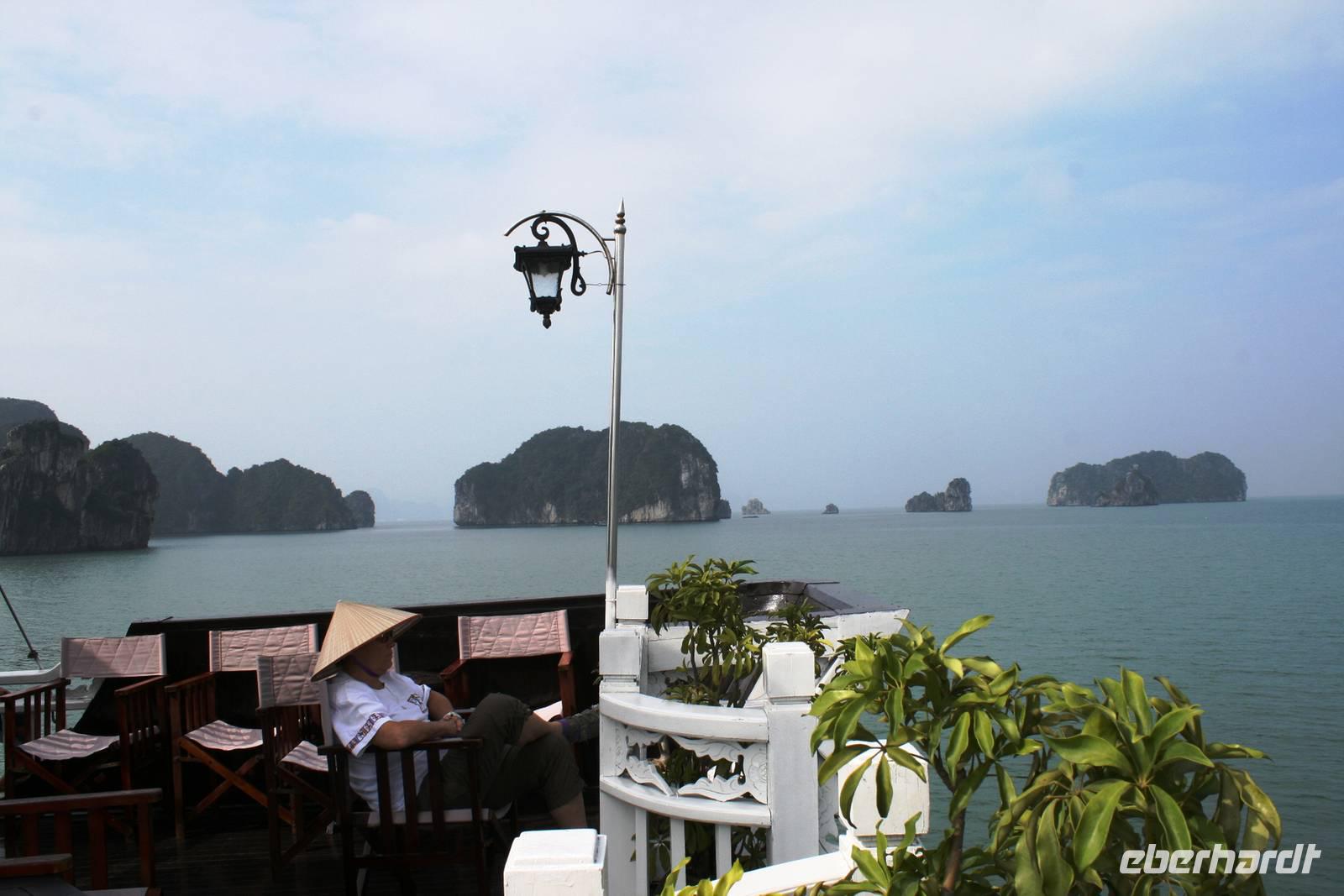 Eine etwas längere Fahrt führte uns heute in Richtung Norden. Ca. 180 km trennten uns von unserem Tagesziel Ha Long. Wir gewöhnten uns schnell an den Umstand, dass es auf vietnamesischen Strassen nicht so schnell vorwärts geht, wie in Europa. Wir überquerten die neue Brücke über den roten Fluss und kamen zunächst schnell voran, bevor einige Baustellen die Fahrt verlangsamten. Dennoch wurde die Fahrt nicht langweilig. Wir beoachteten viele Szenerien, die uns das tägliche Leben auf eigene Art und Weise näher brachten, Onkel Ot kommentierte auf lustige Weise. Gegen Mittag erreichten wir den Hafen von Ha Long und setzten, einheitlich in Orange (Schwimmwesten) gekleidet, mit dem Tender zu unserer Dschunke "Victory" über. An Bord, das Schiff hatten wir für uns alleine, wurden wir freundlich begrüßt und bezogen unsere kleinen, aber feinen Kabinen. Während die Anker gelichtet wurden, speisten wir zu Mittag (natürlich mit viel Fisch und Meeresfrüchten), und sprachen das weitere Programm ab. Das Wetter war etwas diesig. Die bizzaren Karstberge, die aus dem Wasser ragen, verbreiteten eine mystische Stimmung. Onkel Ot erzählte uns eine der Legenden zur Entstehung der Ha Long Bucht, die vom "herabsteigenden Drachen". Am Nachmittag besichtigten wir auf einem befestigten Rundweg die Grotte Sung Sot, eine riesige, beleuchtete Karsthöhle. Der Aufstieg zur Grotte war etwas anstrengend, aber das Innere faszinierte. Onkel Ot zeigte uns seine Lieblingsformation und stellte dabei außerirdische Vergleiche an. Weiter schipperten wir zur nahegelegenen Ti Top Insel. Hier befindet sich Onkel Hos Lieblingsbadestrand. Nur wenige Mutige stürzten sich in die warmen Fluten, während die Sonne langsam untergang. Andere bezwangen ca. 400 Stufen zum Aussichtspunkt der Insel. An Bord erwarteten uns festlich gedeckte Tische und ein schmackhaftes Abendessen. Beim Portionieren und Auseinandernehmen der fangfrischen und dekorativ angerichteten Garnelen war uns das Personal behilflich. Mittlerweile hatte unsere Dschunke in einer Bucht, neben vielen anderen, Anker geworfen. Zum obligatorischen "Sundowner" trafen wir uns auf Deck und verabschiedeten uns in die Nacht.