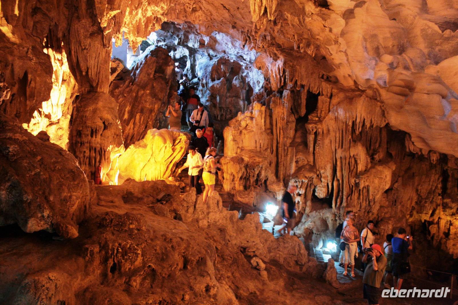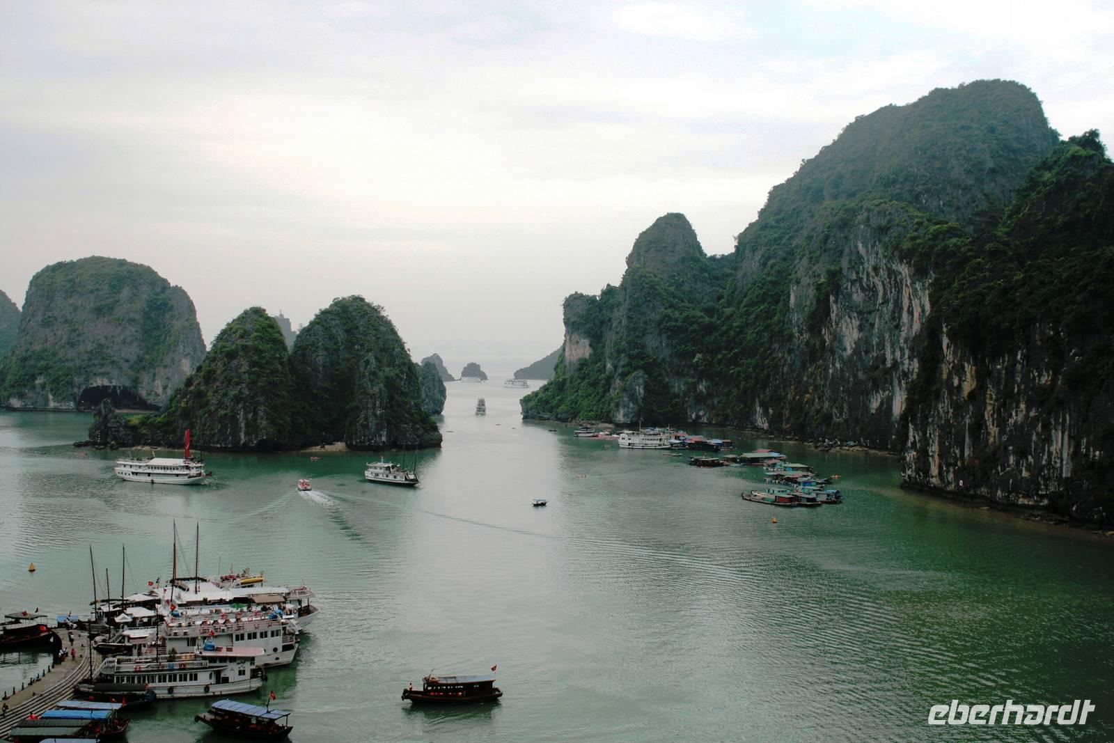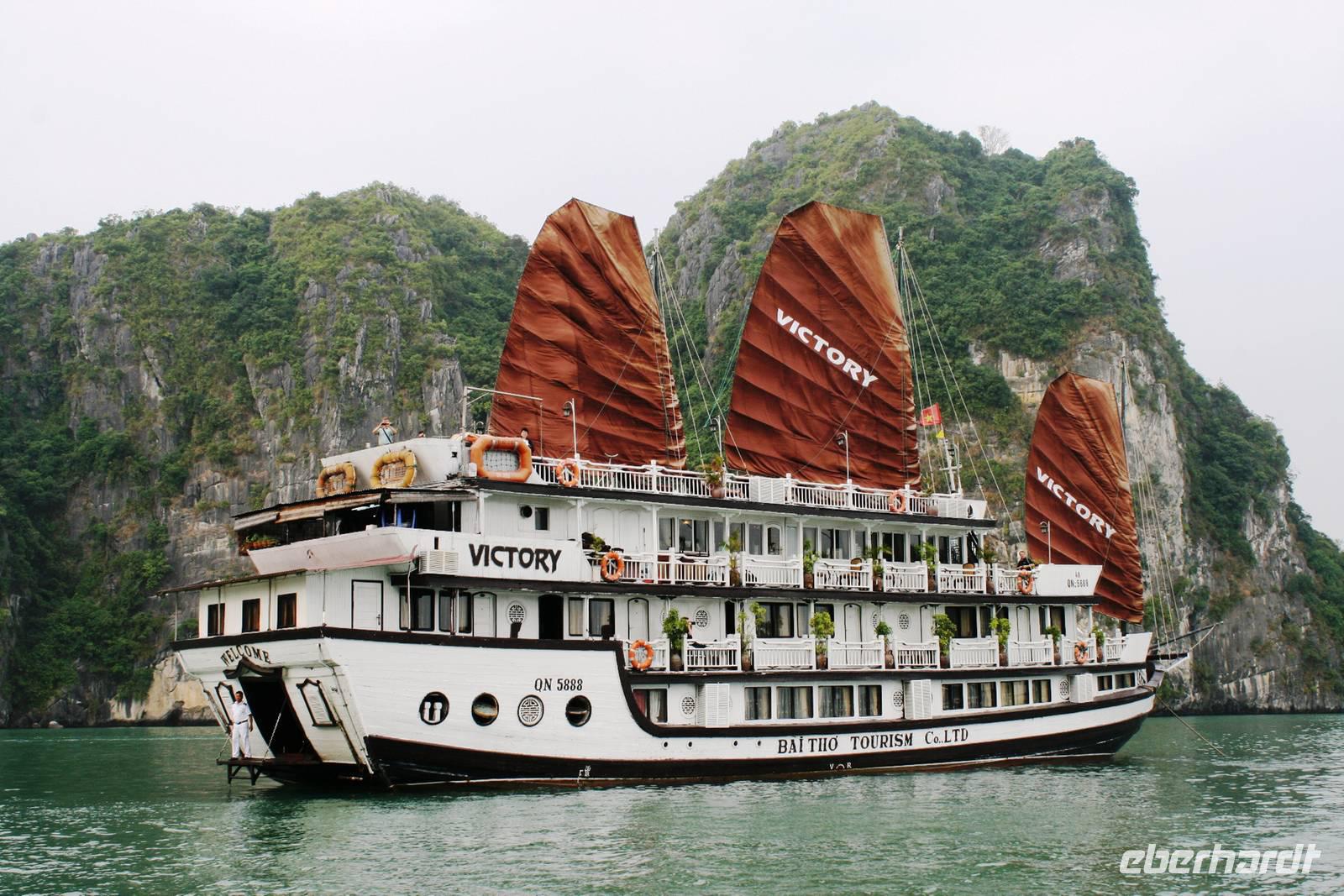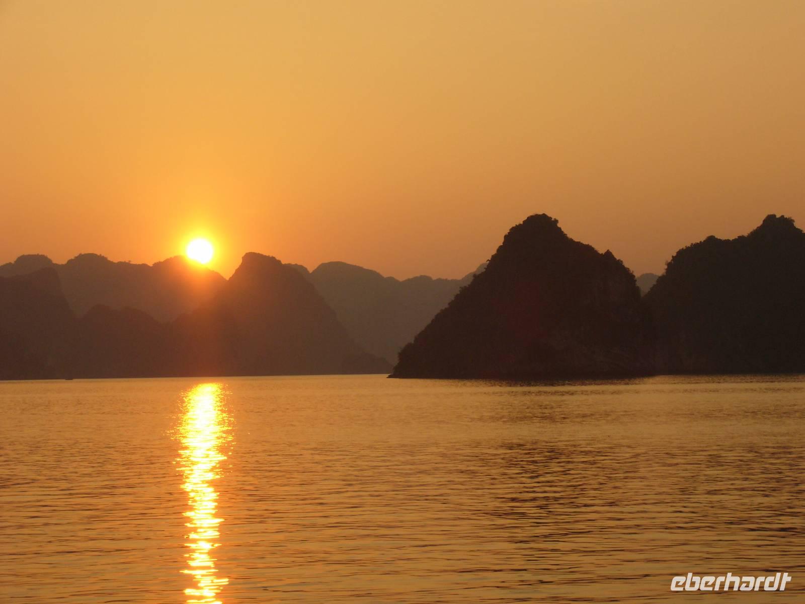 Eine etwas längere Fahrt führte uns heute in Richtung Norden. Ca. 180 km trennten uns von unserem Tagesziel Ha Long. Wir gewöhnten uns schnell an den Umstand, dass es auf vietnamesischen Strassen nicht so schnell vorwärts geht, wie in Europa. Wir überquerten die neue Brücke über den roten Fluss und kamen zunächst schnell voran, bevor einige Baustellen die Fahrt verlangsamten. Dennoch wurde die Fahrt nicht langweilig. Wir beoachteten viele Szenerien, die uns das tägliche Leben auf eigene Art und Weise näher brachten, Onkel Ot kommentierte auf lustige Weise. Gegen Mittag erreichten wir den Hafen von Ha Long und setzten, einheitlich in Orange (Schwimmwesten) gekleidet, mit dem Tender zu unserer Dschunke "Victory" über. An Bord, das Schiff hatten wir für uns alleine, wurden wir freundlich begrüßt und bezogen unsere kleinen, aber feinen Kabinen. Während die Anker gelichtet wurden, speisten wir zu Mittag (natürlich mit viel Fisch und Meeresfrüchten), und sprachen das weitere Programm ab. Das Wetter war etwas diesig. Die bizzaren Karstberge, die aus dem Wasser ragen, verbreiteten eine mystische Stimmung. Onkel Ot erzählte uns eine der Legenden zur Entstehung der Ha Long Bucht, die vom "herabsteigenden Drachen". Am Nachmittag besichtigten wir auf einem befestigten Rundweg die Grotte Sung Sot, eine riesige, beleuchtete Karsthöhle. Der Aufstieg zur Grotte war etwas anstrengend, aber das Innere faszinierte. Onkel Ot zeigte uns seine Lieblingsformation und stellte dabei außerirdische Vergleiche an. Weiter schipperten wir zur nahegelegenen Ti Top Insel. Hier befindet sich Onkel Hos Lieblingsbadestrand. Nur wenige Mutige stürzten sich in die warmen Fluten, während die Sonne langsam untergang. Andere bezwangen ca. 400 Stufen zum Aussichtspunkt der Insel. An Bord erwarteten uns festlich gedeckte Tische und ein schmackhaftes Abendessen. Beim Portionieren und Auseinandernehmen der fangfrischen und dekorativ angerichteten Garnelen war uns das Personal behilflich. Mittlerweile hatte unsere Dschunke in einer Bucht, neben vielen anderen, Anker geworfen. Zum obligatorischen "Sundowner" trafen wir uns auf Deck und verabschiedeten uns in die Nacht.