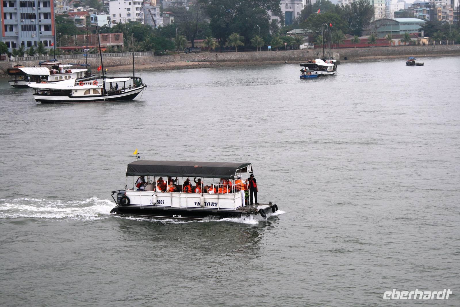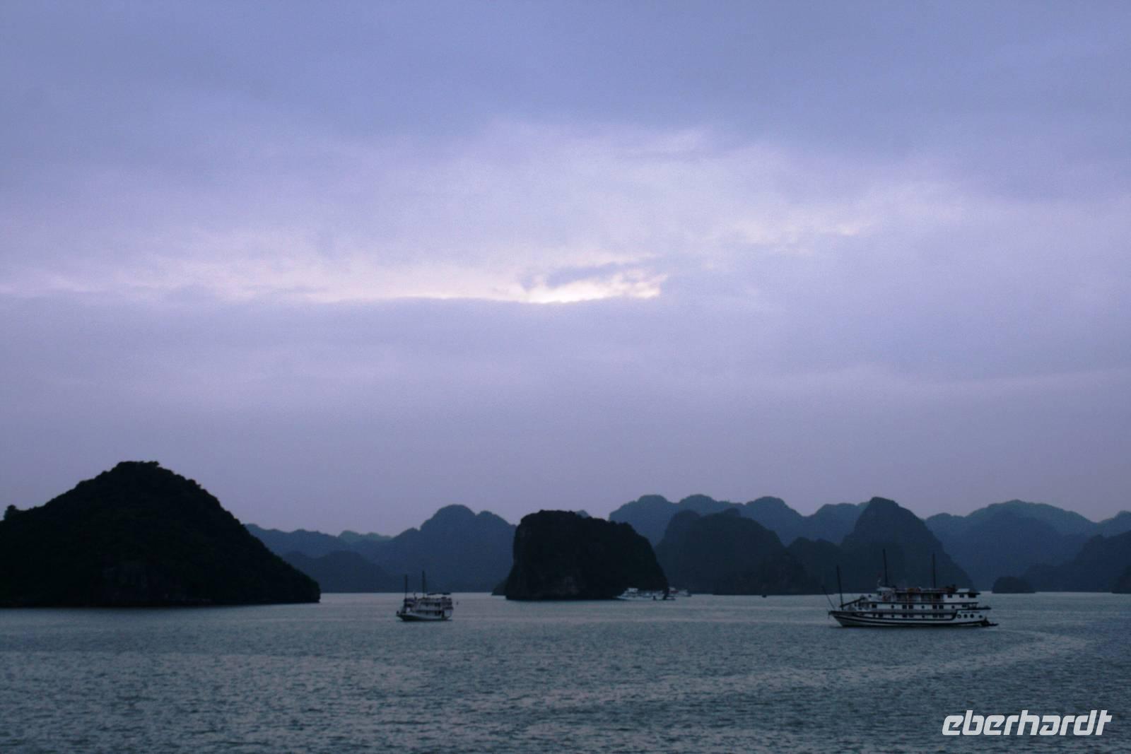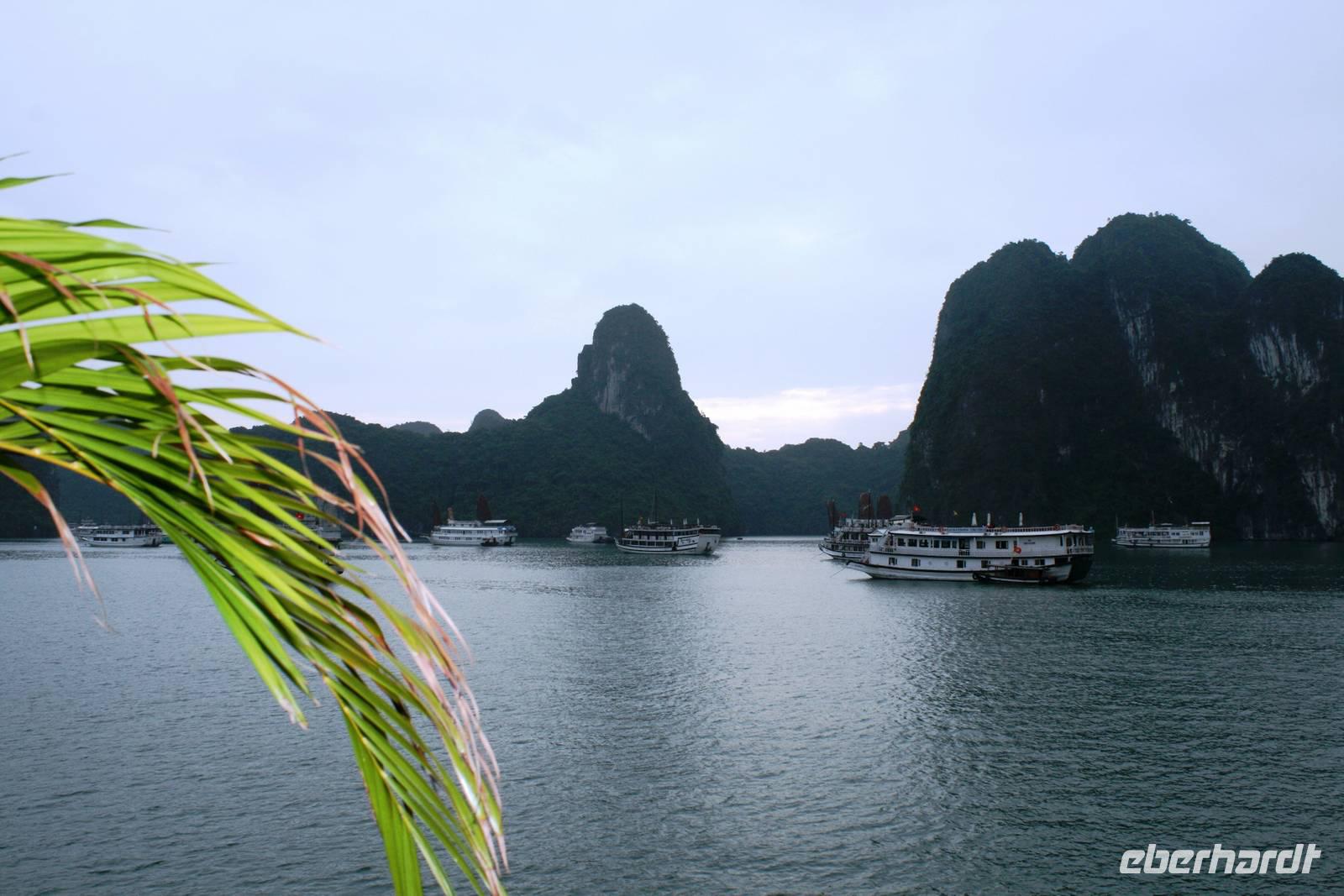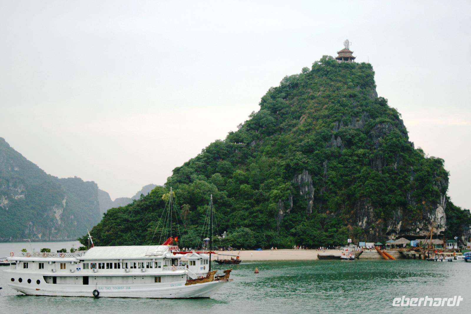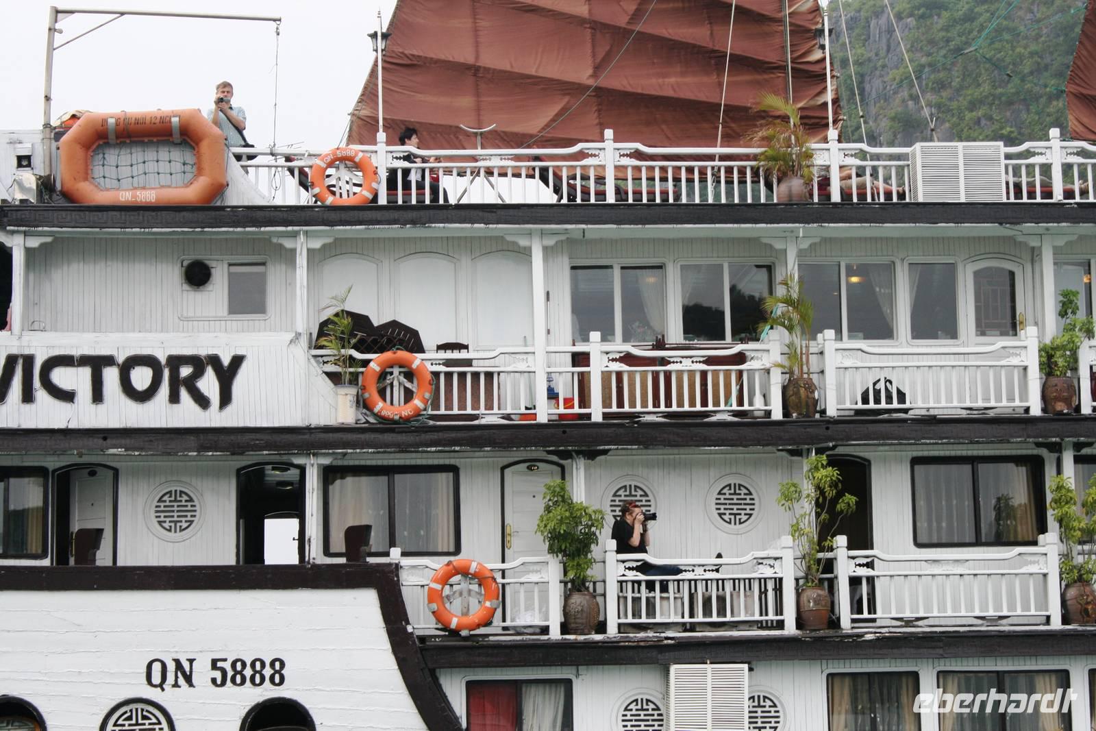 Eine etwas längere Fahrt führte uns heute in Richtung Norden. Ca. 180 km trennten uns von unserem Tagesziel Ha Long. Wir gewöhnten uns schnell an den Umstand, dass es auf vietnamesischen Strassen nicht so schnell vorwärts geht, wie in Europa. Wir überquerten die neue Brücke über den roten Fluss und kamen zunächst schnell voran, bevor einige Baustellen die Fahrt verlangsamten. Dennoch wurde die Fahrt nicht langweilig. Wir beoachteten viele Szenerien, die uns das tägliche Leben auf eigene Art und Weise näher brachten, Onkel Ot kommentierte auf lustige Weise. Gegen Mittag erreichten wir den Hafen von Ha Long und setzten, einheitlich in Orange (Schwimmwesten) gekleidet, mit dem Tender zu unserer Dschunke "Victory" über. An Bord, das Schiff hatten wir für uns alleine, wurden wir freundlich begrüßt und bezogen unsere kleinen, aber feinen Kabinen. Während die Anker gelichtet wurden, speisten wir zu Mittag (natürlich mit viel Fisch und Meeresfrüchten), und sprachen das weitere Programm ab. Das Wetter war etwas diesig. Die bizzaren Karstberge, die aus dem Wasser ragen, verbreiteten eine mystische Stimmung. Onkel Ot erzählte uns eine der Legenden zur Entstehung der Ha Long Bucht, die vom "herabsteigenden Drachen". Am Nachmittag besichtigten wir auf einem befestigten Rundweg die Grotte Sung Sot, eine riesige, beleuchtete Karsthöhle. Der Aufstieg zur Grotte war etwas anstrengend, aber das Innere faszinierte. Onkel Ot zeigte uns seine Lieblingsformation und stellte dabei außerirdische Vergleiche an. Weiter schipperten wir zur nahegelegenen Ti Top Insel. Hier befindet sich Onkel Hos Lieblingsbadestrand. Nur wenige Mutige stürzten sich in die warmen Fluten, während die Sonne langsam untergang. Andere bezwangen ca. 400 Stufen zum Aussichtspunkt der Insel. An Bord erwarteten uns festlich gedeckte Tische und ein schmackhaftes Abendessen. Beim Portionieren und Auseinandernehmen der fangfrischen und dekorativ angerichteten Garnelen war uns das Personal behilflich. Mittlerweile hatte unsere Dschunke in einer Bucht, neben vielen anderen, Anker geworfen. Zum obligatorischen "Sundowner" trafen wir uns auf Deck und verabschiedeten uns in die Nacht.