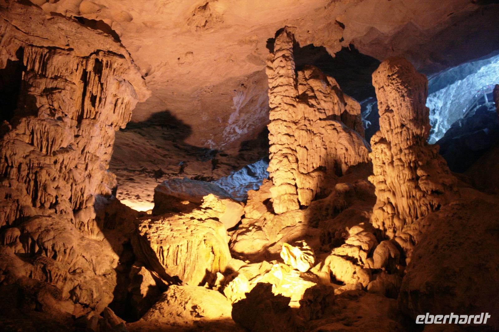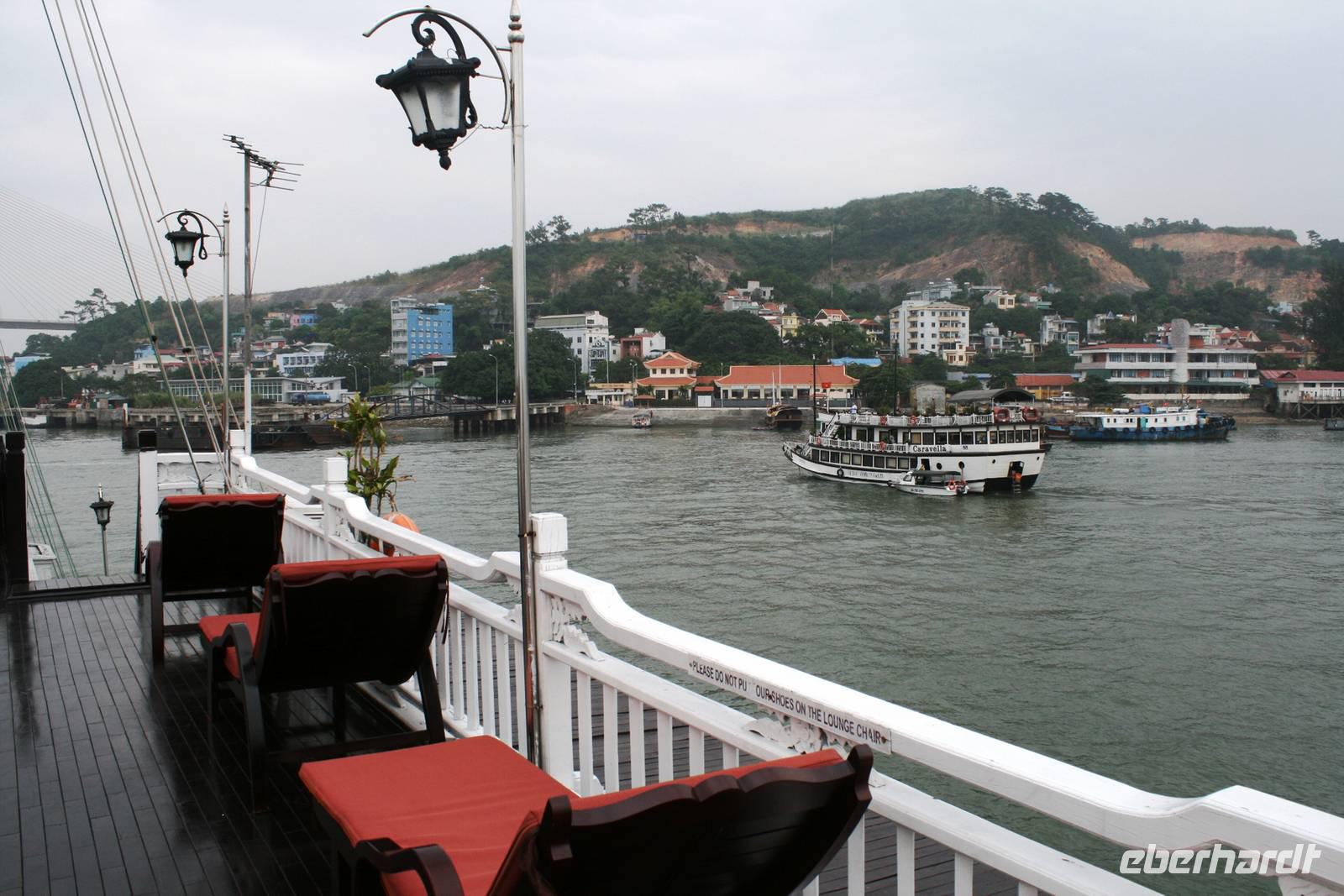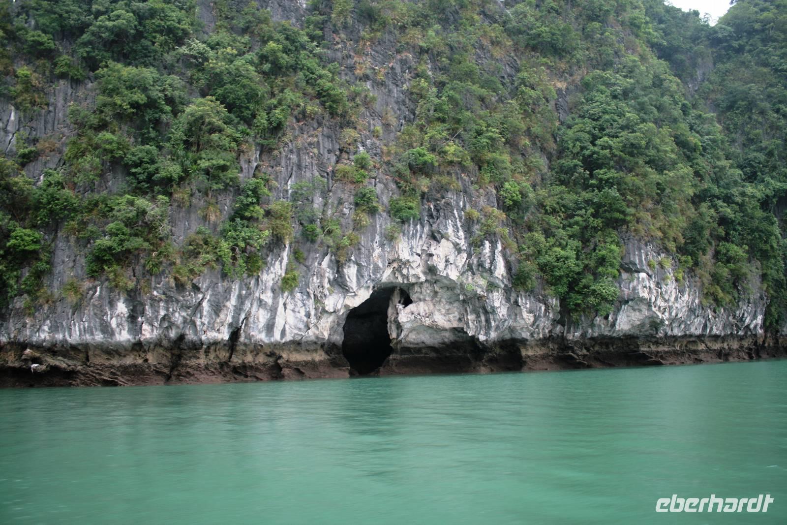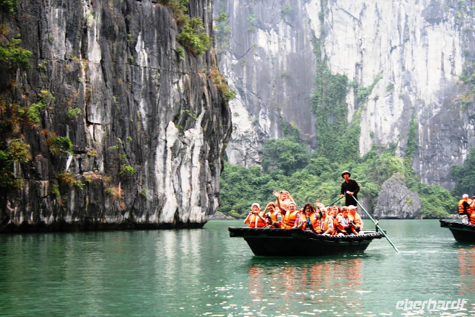 Eine etwas längere Fahrt führte uns heute in Richtung Norden. Ca. 180 km trennten uns von unserem Tagesziel Ha Long. Wir gewöhnten uns schnell an den Umstand, dass es auf vietnamesischen Strassen nicht so schnell vorwärts geht, wie in Europa. Wir überquerten die neue Brücke über den roten Fluss und kamen zunächst schnell voran, bevor einige Baustellen die Fahrt verlangsamten. Dennoch wurde die Fahrt nicht langweilig. Wir beoachteten viele Szenerien, die uns das tägliche Leben auf eigene Art und Weise näher brachten, Onkel Ot kommentierte auf lustige Weise. Gegen Mittag erreichten wir den Hafen von Ha Long und setzten, einheitlich in Orange (Schwimmwesten) gekleidet, mit dem Tender zu unserer Dschunke "Victory" über. An Bord, das Schiff hatten wir für uns alleine, wurden wir freundlich begrüßt und bezogen unsere kleinen, aber feinen Kabinen. Während die Anker gelichtet wurden, speisten wir zu Mittag (natürlich mit viel Fisch und Meeresfrüchten), und sprachen das weitere Programm ab. Das Wetter war etwas diesig. Die bizzaren Karstberge, die aus dem Wasser ragen, verbreiteten eine mystische Stimmung. Onkel Ot erzählte uns eine der Legenden zur Entstehung der Ha Long Bucht, die vom "herabsteigenden Drachen". Am Nachmittag besichtigten wir auf einem befestigten Rundweg die Grotte Sung Sot, eine riesige, beleuchtete Karsthöhle. Der Aufstieg zur Grotte war etwas anstrengend, aber das Innere faszinierte. Onkel Ot zeigte uns seine Lieblingsformation und stellte dabei außerirdische Vergleiche an. Weiter schipperten wir zur nahegelegenen Ti Top Insel. Hier befindet sich Onkel Hos Lieblingsbadestrand. Nur wenige Mutige stürzten sich in die warmen Fluten, während die Sonne langsam untergang. Andere bezwangen ca. 400 Stufen zum Aussichtspunkt der Insel. An Bord erwarteten uns festlich gedeckte Tische und ein schmackhaftes Abendessen. Beim Portionieren und Auseinandernehmen der fangfrischen und dekorativ angerichteten Garnelen war uns das Personal behilflich. Mittlerweile hatte unsere Dschunke in einer Bucht, neben vielen anderen, Anker geworfen. Zum obligatorischen "Sundowner" trafen wir uns auf Deck und verabschiedeten uns in die Nacht.
