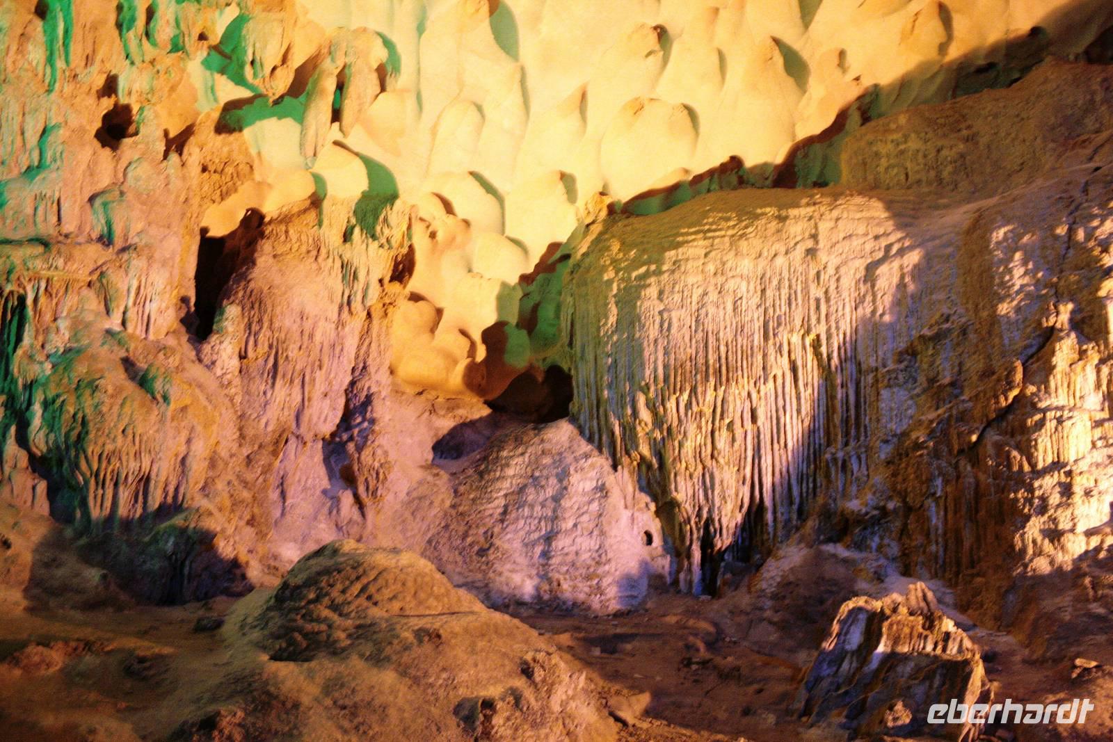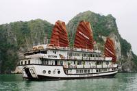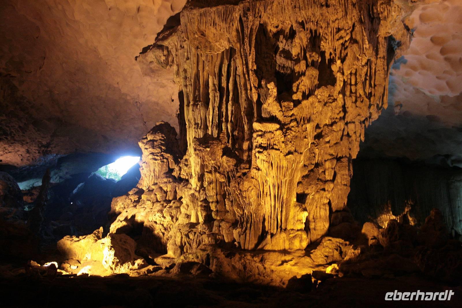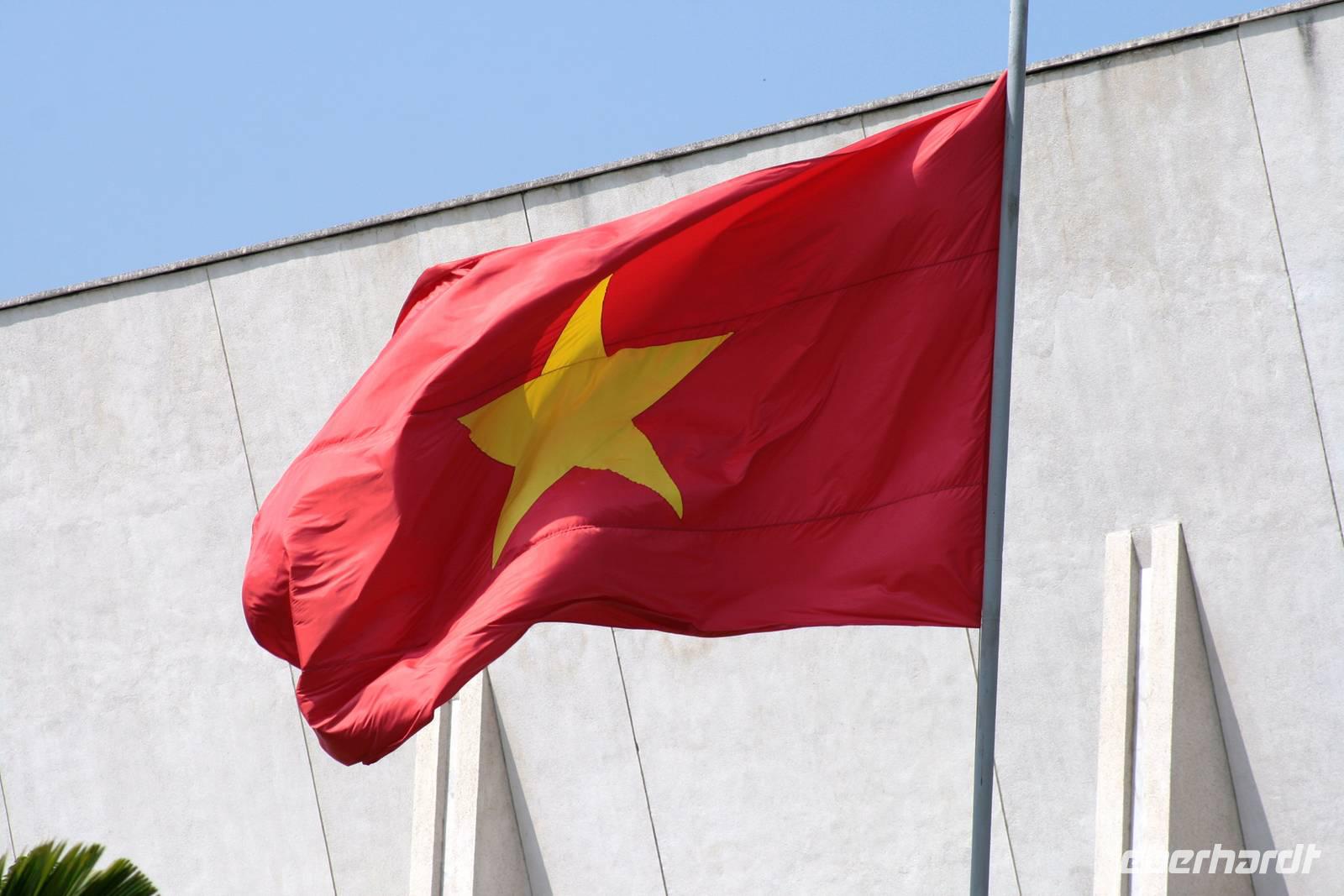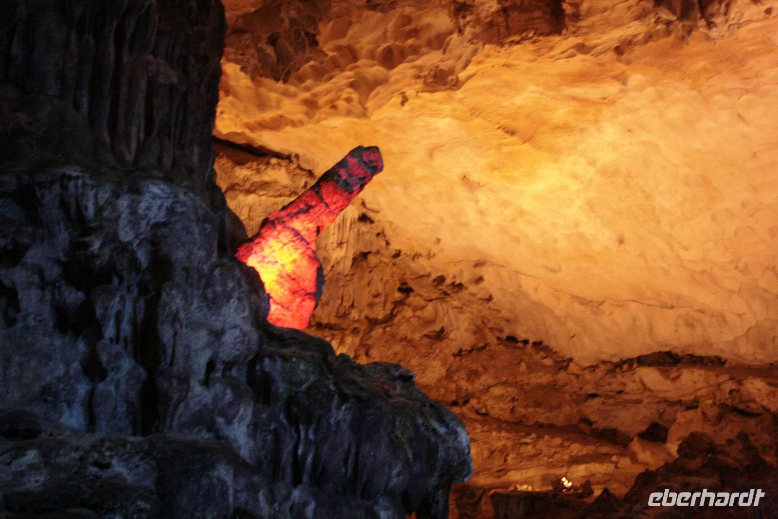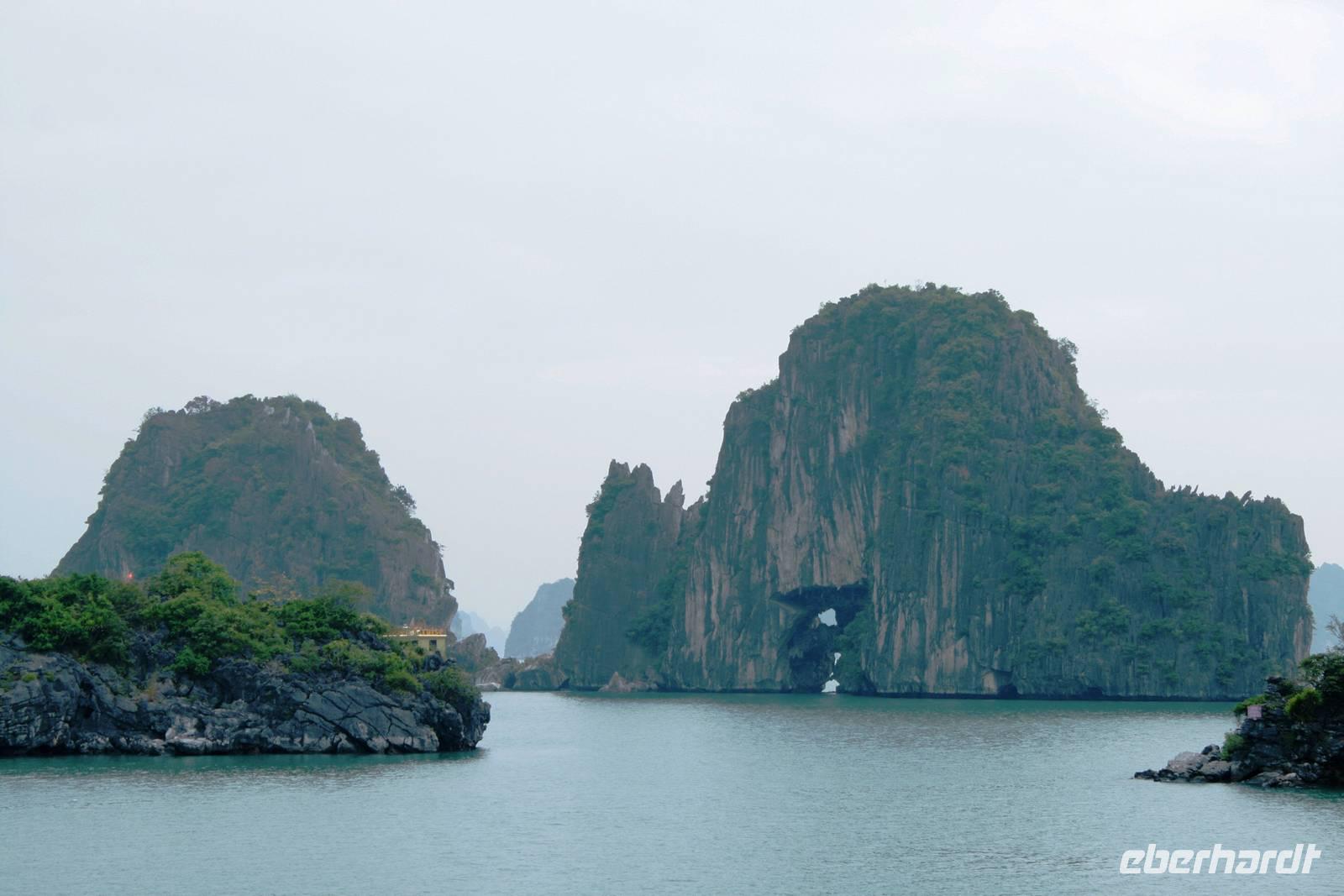 Eine etwas längere Fahrt führte uns heute in Richtung Norden. Ca. 180 km trennten uns von unserem Tagesziel Ha Long. Wir gewöhnten uns schnell an den Umstand, dass es auf vietnamesischen Strassen nicht so schnell vorwärts geht, wie in Europa. Wir überquerten die neue Brücke über den roten Fluss und kamen zunächst schnell voran, bevor einige Baustellen die Fahrt verlangsamten. Dennoch wurde die Fahrt nicht langweilig. Wir beoachteten viele Szenerien, die uns das tägliche Leben auf eigene Art und Weise näher brachten, Onkel Ot kommentierte auf lustige Weise. Gegen Mittag erreichten wir den Hafen von Ha Long und setzten, einheitlich in Orange (Schwimmwesten) gekleidet, mit dem Tender zu unserer Dschunke "Victory" über. An Bord, das Schiff hatten wir für uns alleine, wurden wir freundlich begrüßt und bezogen unsere kleinen, aber feinen Kabinen. Während die Anker gelichtet wurden, speisten wir zu Mittag (natürlich mit viel Fisch und Meeresfrüchten), und sprachen das weitere Programm ab. Das Wetter war etwas diesig. Die bizzaren Karstberge, die aus dem Wasser ragen, verbreiteten eine mystische Stimmung. Onkel Ot erzählte uns eine der Legenden zur Entstehung der Ha Long Bucht, die vom "herabsteigenden Drachen". Am Nachmittag besichtigten wir auf einem befestigten Rundweg die Grotte Sung Sot, eine riesige, beleuchtete Karsthöhle. Der Aufstieg zur Grotte war etwas anstrengend, aber das Innere faszinierte. Onkel Ot zeigte uns seine Lieblingsformation und stellte dabei außerirdische Vergleiche an. Weiter schipperten wir zur nahegelegenen Ti Top Insel. Hier befindet sich Onkel Hos Lieblingsbadestrand. Nur wenige Mutige stürzten sich in die warmen Fluten, während die Sonne langsam untergang. Andere bezwangen ca. 400 Stufen zum Aussichtspunkt der Insel. An Bord erwarteten uns festlich gedeckte Tische und ein schmackhaftes Abendessen. Beim Portionieren und Auseinandernehmen der fangfrischen und dekorativ angerichteten Garnelen war uns das Personal behilflich. Mittlerweile hatte unsere Dschunke in einer Bucht, neben vielen anderen, Anker geworfen. Zum obligatorischen "Sundowner" trafen wir uns auf Deck und verabschiedeten uns in die Nacht.