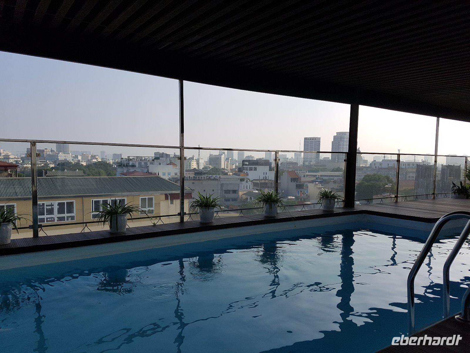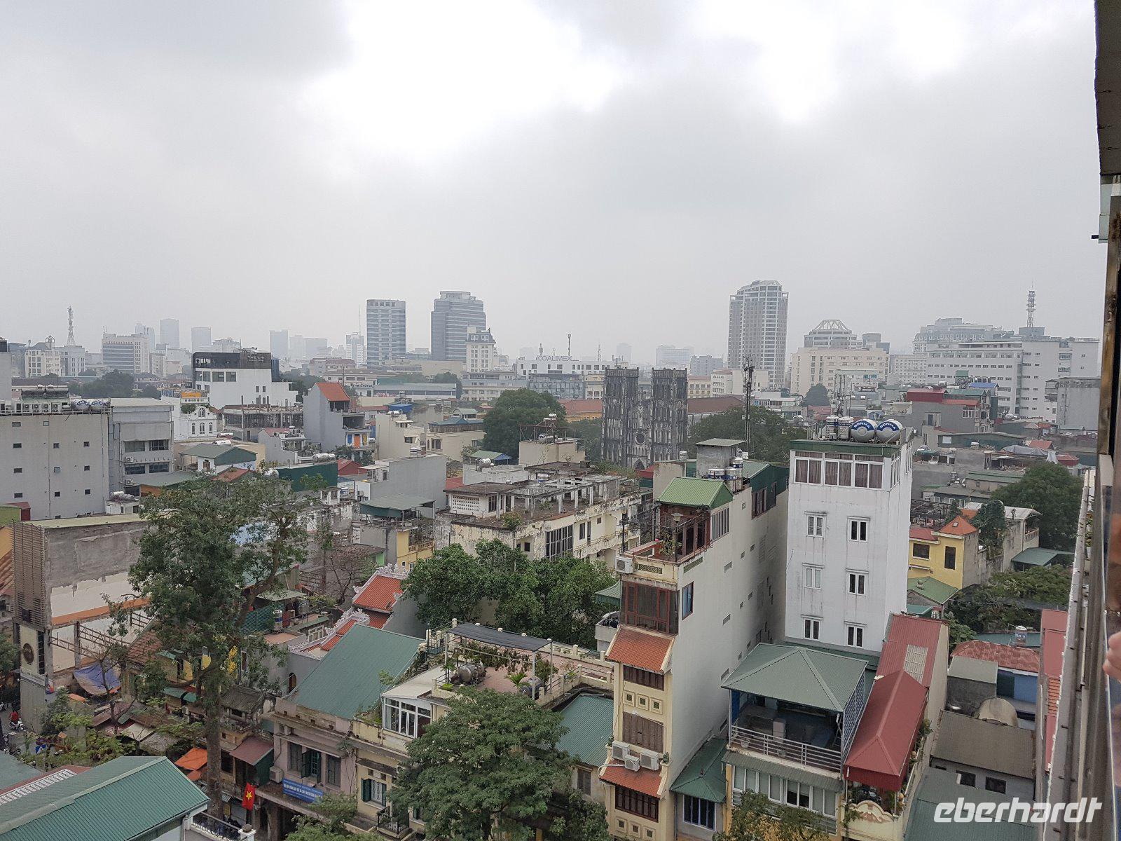 Da wir etwas weniger buddhistisch geprägt sind trifft sich die Gruppe dann doch noch auf der schönen Dachterrasse des Hotels, wir trinken mit Panoramablick über die Stadt ein gut gekühltes Hanoier Bier...