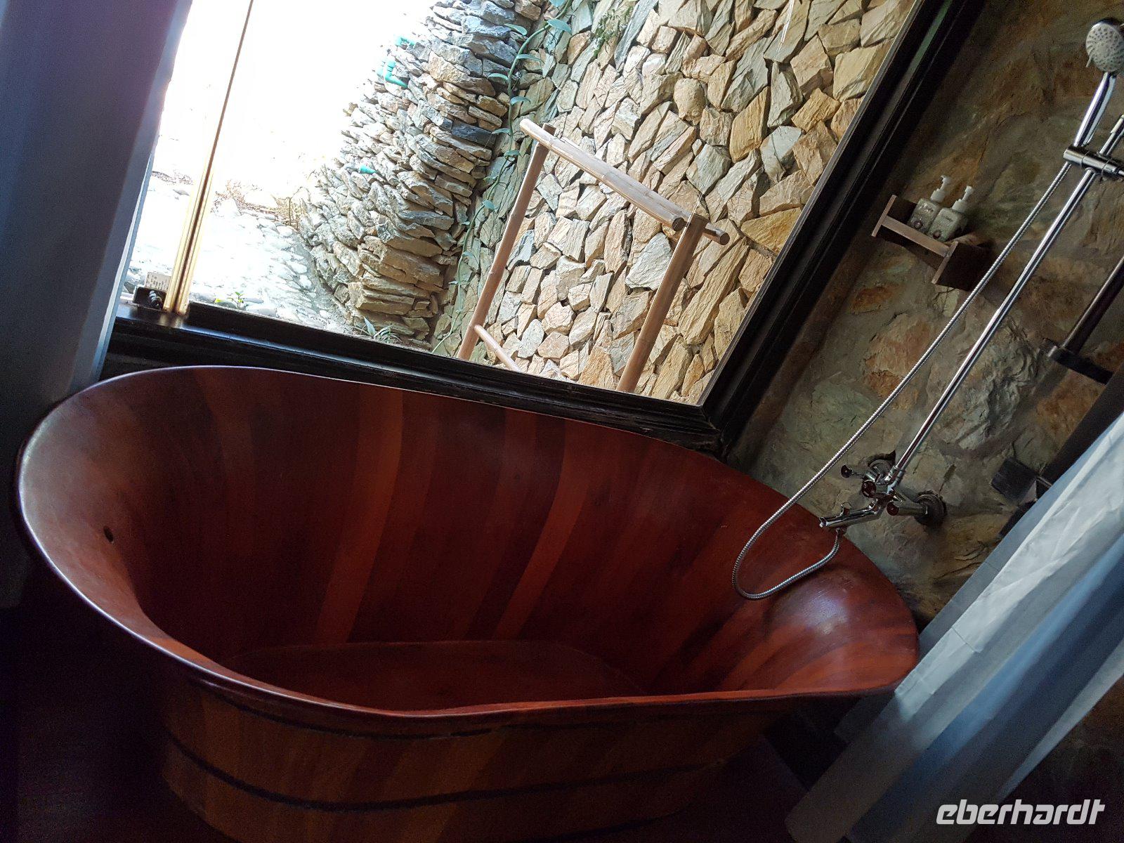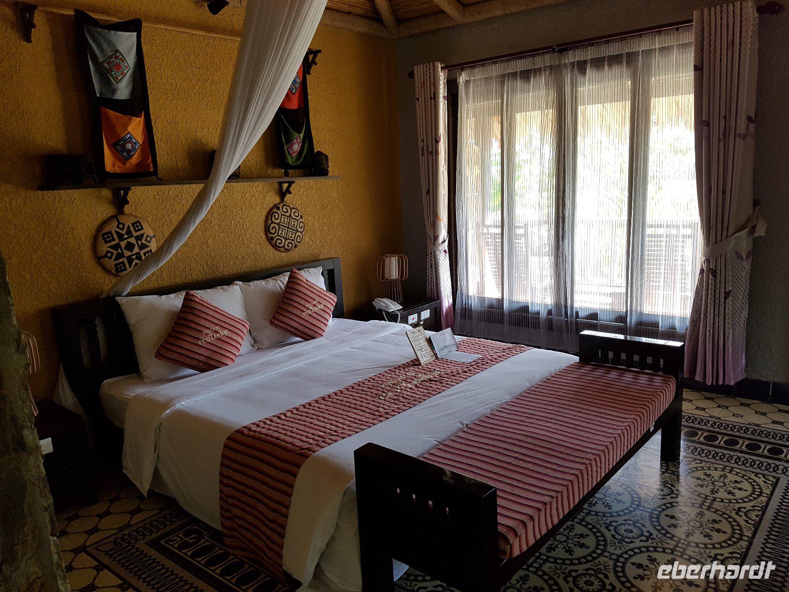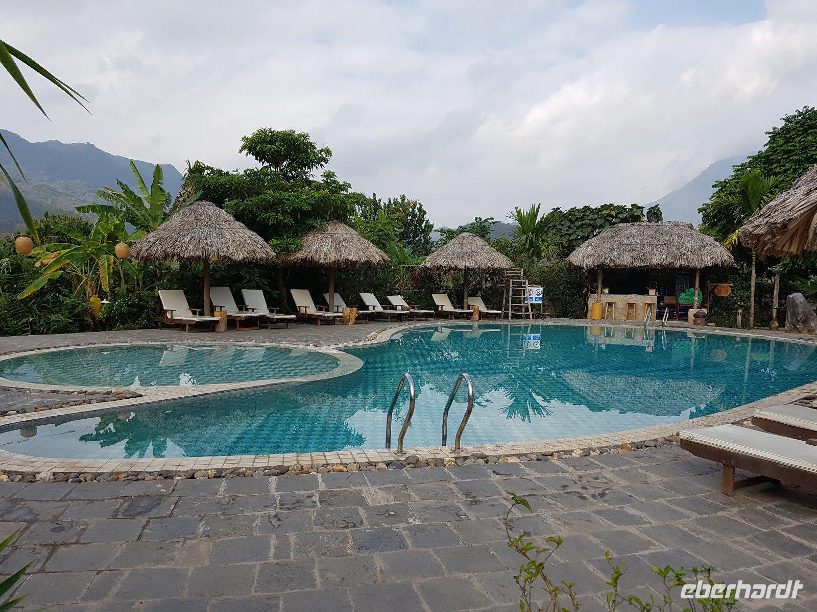 In der Mai Châu Ecolodge angekommen beziehen wir zunächst die luxuriös ausgestatteten Bungalows, dann aber sofort in den Pool.