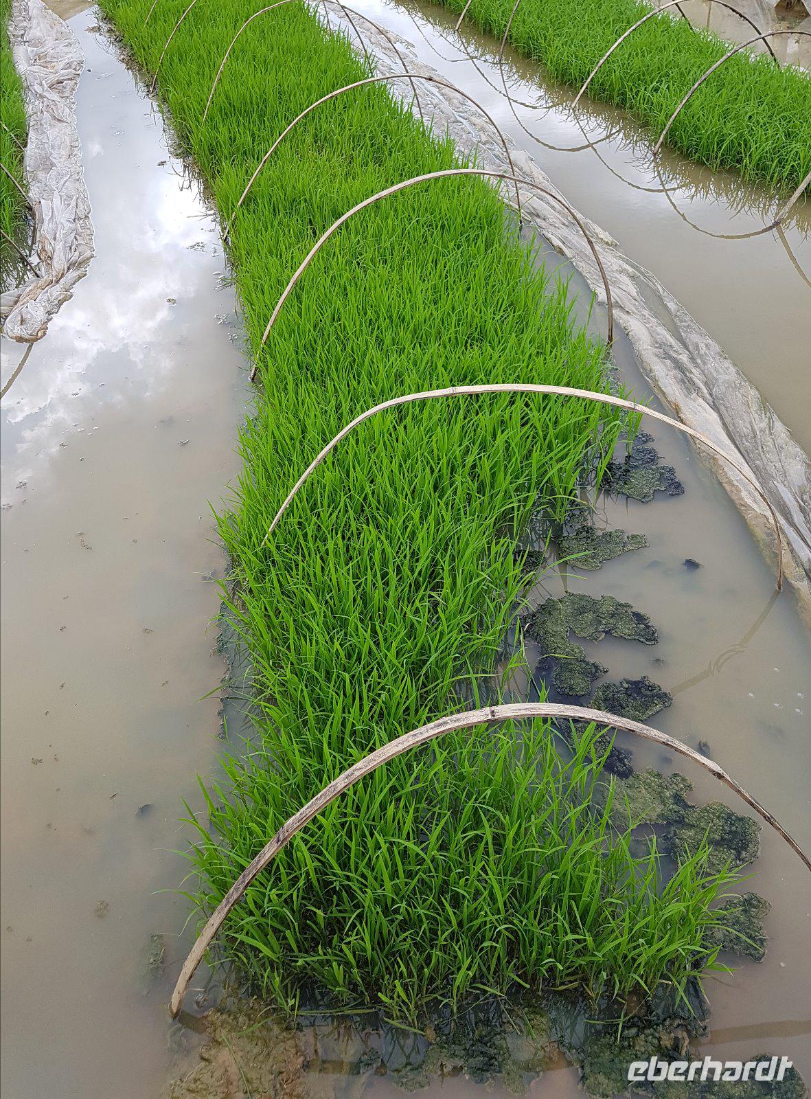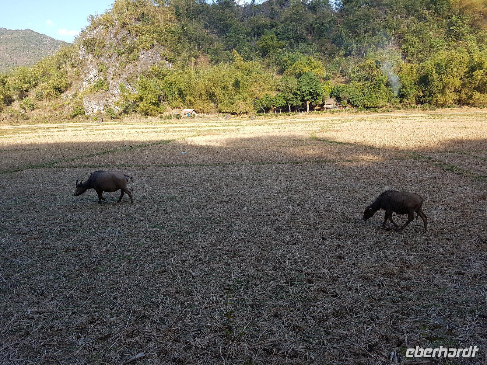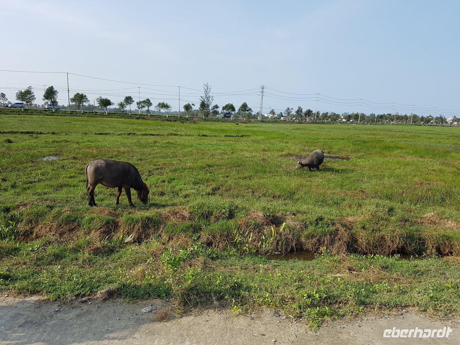 Vorbei an Reisfeldern mit fotogen platzierten Wasserbüffeln ist ein Ökohof unser Ziel.