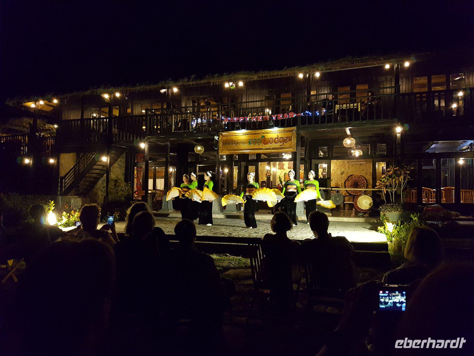 Im Restaurant der Mai Châu Ecolodge erwartet uns dann ein wunderbares vielgängiges Abendmenu bevor wir im Freibereich am Pool die Präsentation regionaler Tänze erleben. Schön, wenngleich wir uns beim abschließenden Integrieren der Gäste in die Tanzdarbietung doch schon eher Richtung Poolbar orientieren. Entspannt werden die Eindrücke des erlebnisreichen Tages ausgetauscht...