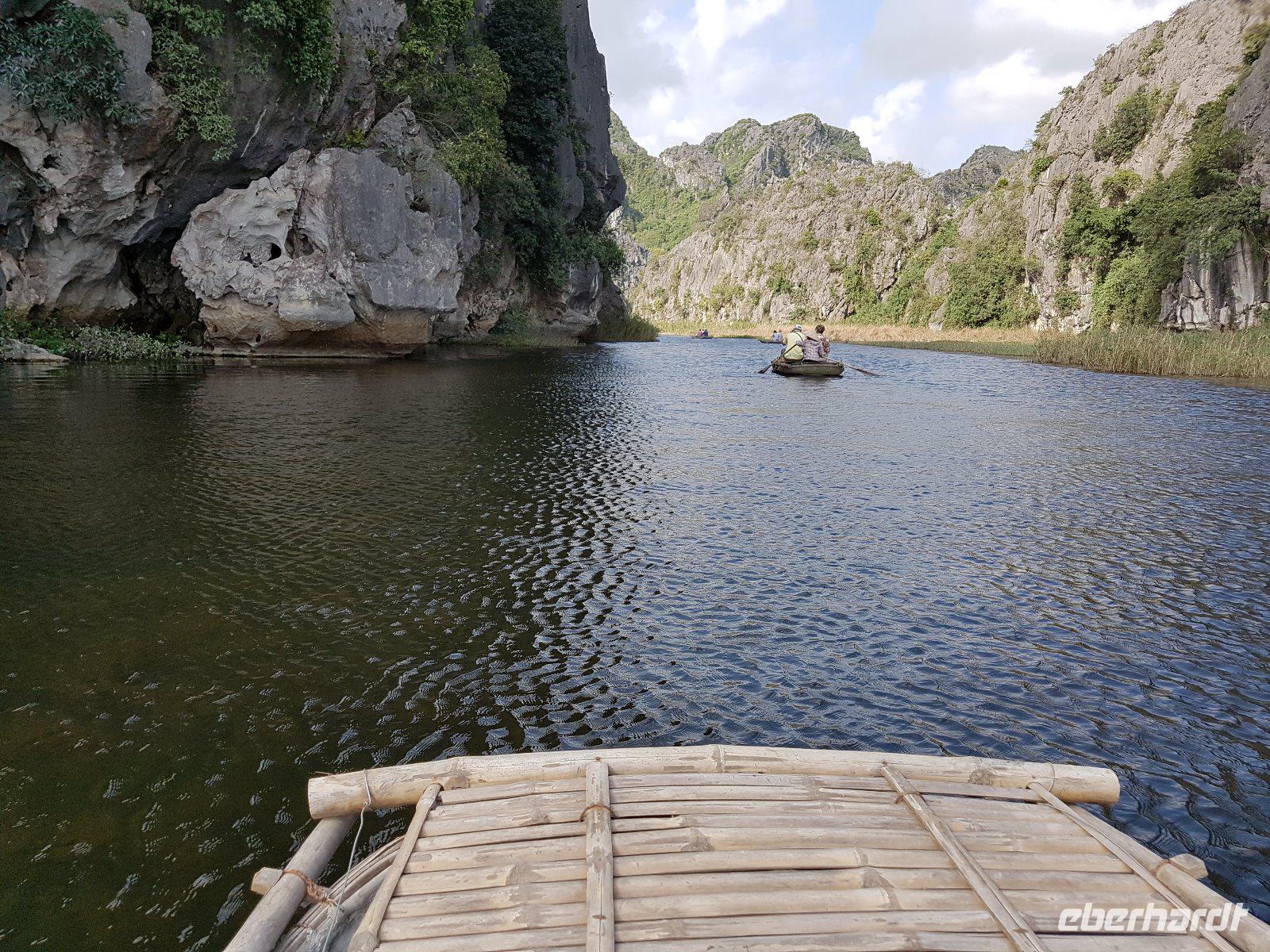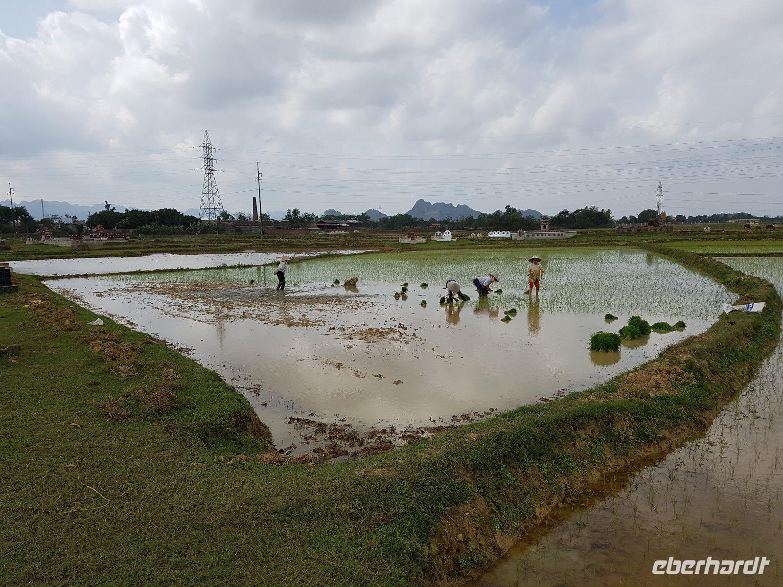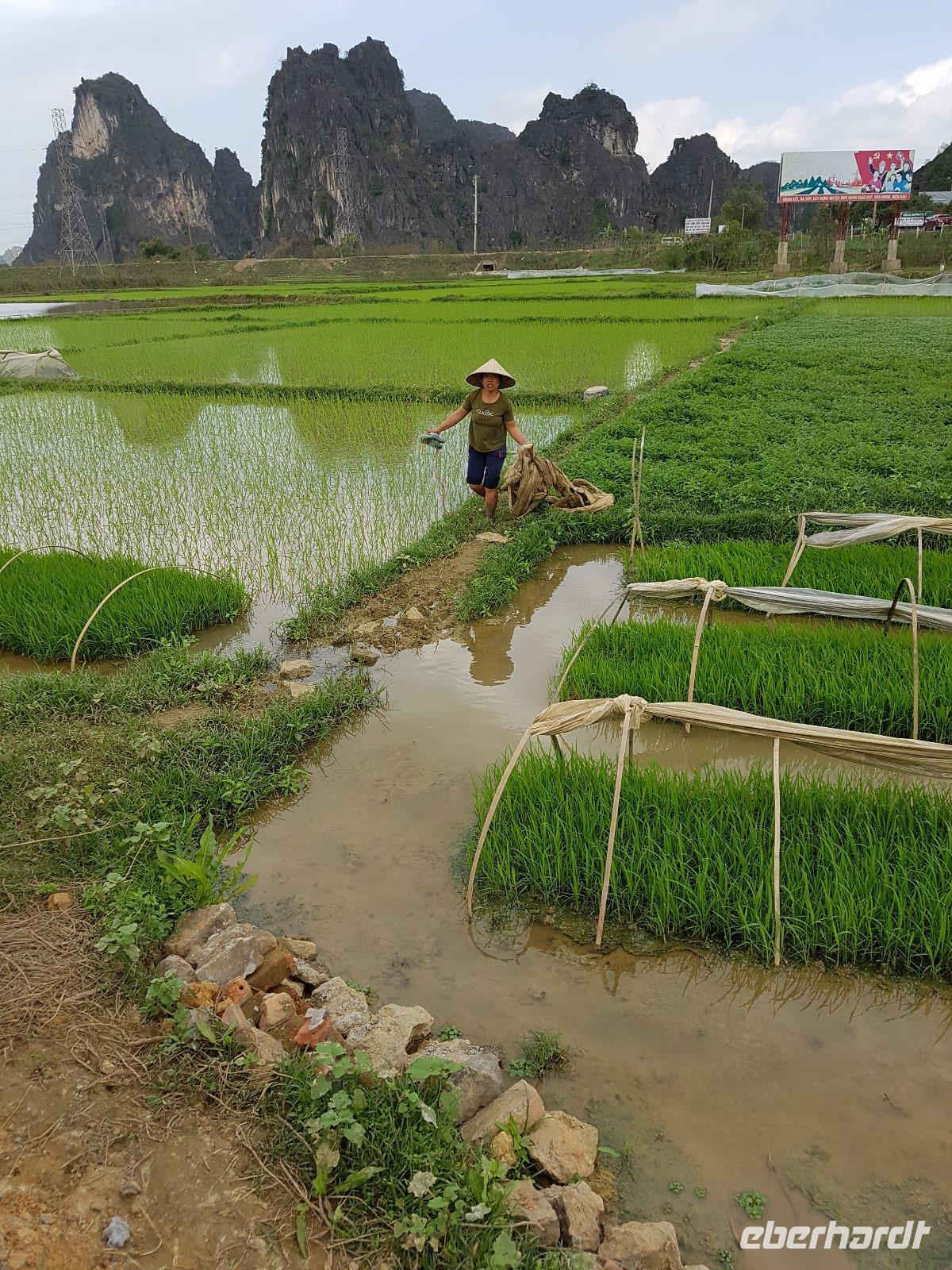 So erreichen wir die Region Van Long. Sie überzeugt mit ebenso hohen wie schroffen Karstbergen. Im Gegensatz zur nassen Ha Long-Bucht, befinden sich hier zwischen den Felsformationen viele kleine Reisfelder am Fluss.
