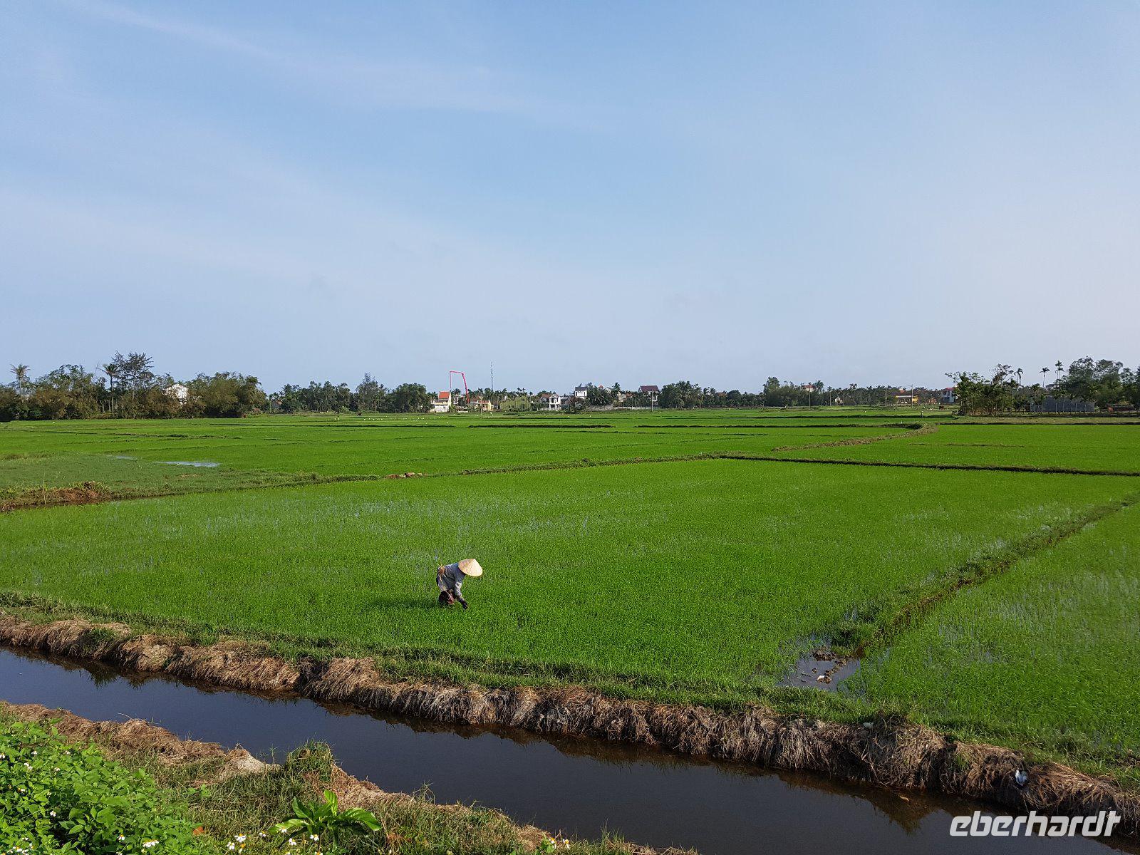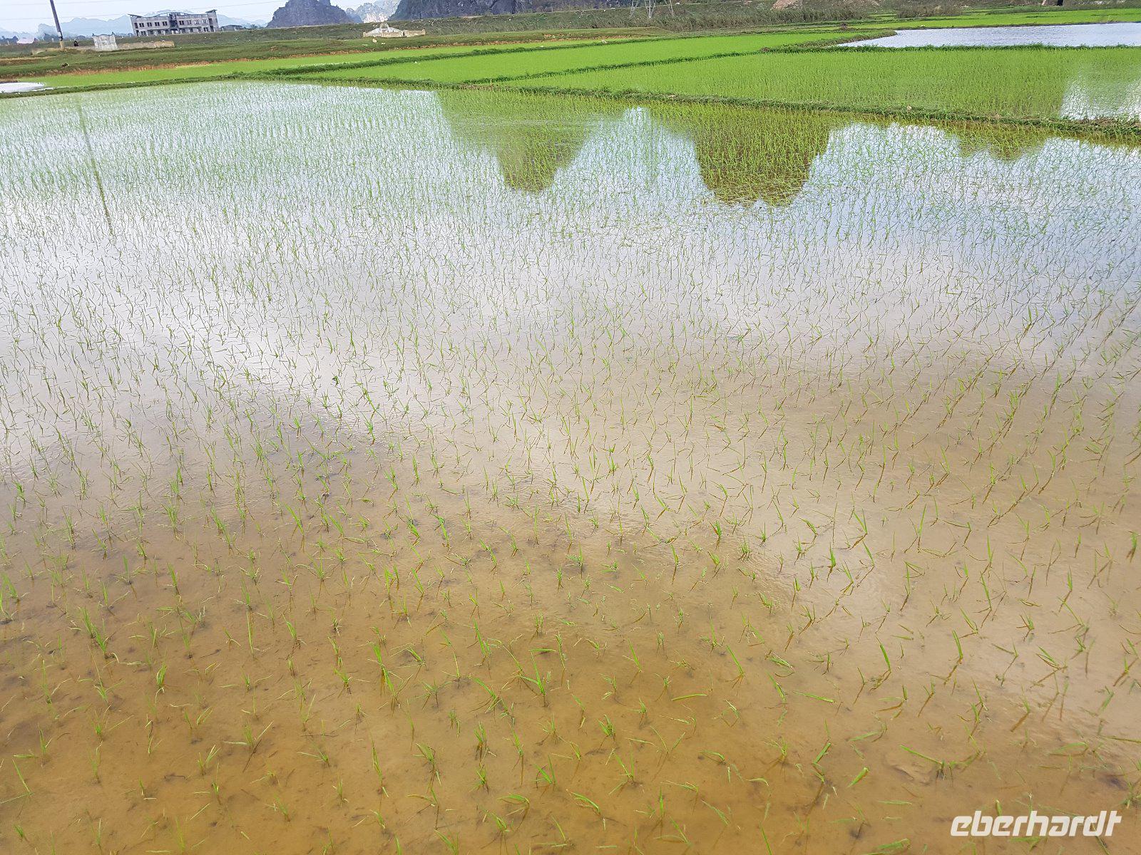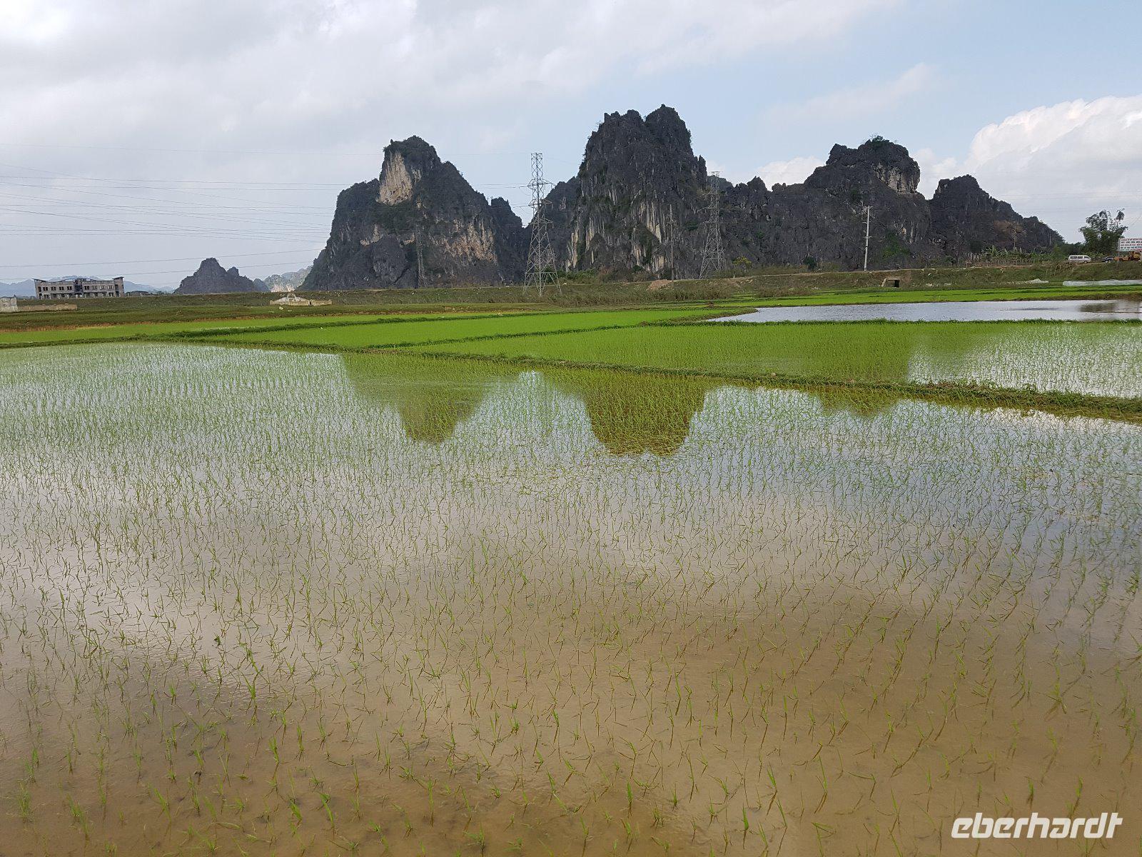 So erreichen wir die Region Van Long. Sie überzeugt mit ebenso hohen wie schroffen Karstbergen. Im Gegensatz zur nassen Ha Long-Bucht, befinden sich hier zwischen den Felsformationen viele kleine Reisfelder am Fluss.