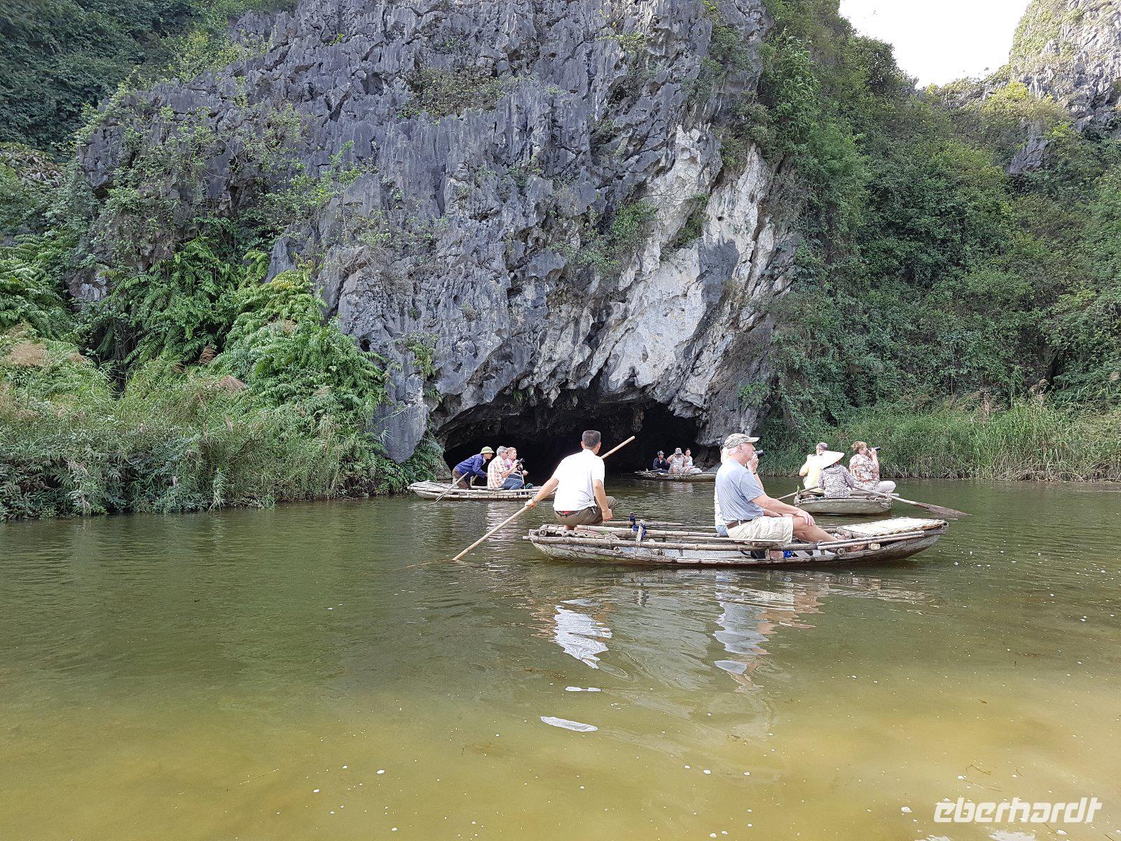 In kleinen Fahrzeugen lassen wir uns durch die herrliche Landschaft staken, durchfahren dabei sogar eine größere Karsthöhle. Wir haben auch das große Glück Delacour-Schwarzlangure, eine sehr seltene endemische vietnamesische Affenart beobachten zu können.