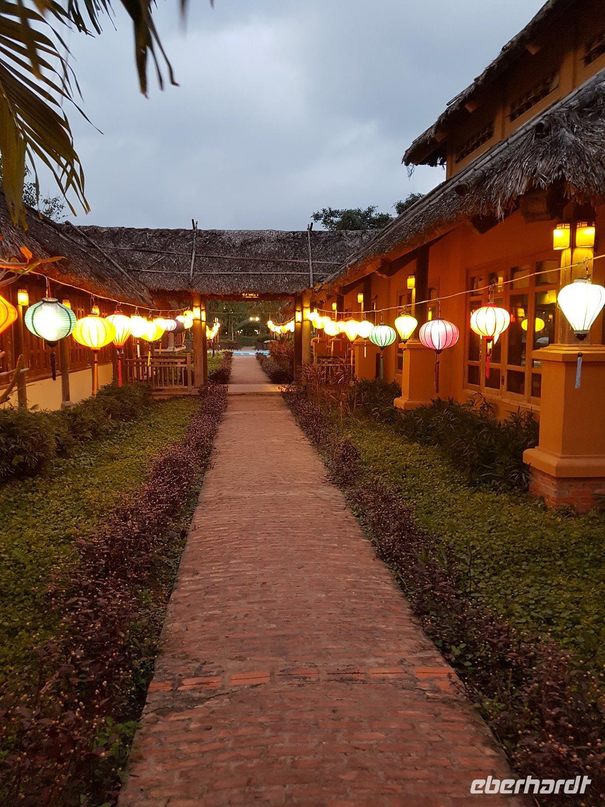 Während des Transfers nach Hoi An wird es schon allmählich dunkel, so dass uns das Ðào Tiên Gartenrestaurant schön mit Lampions beleuchtet erwartet.