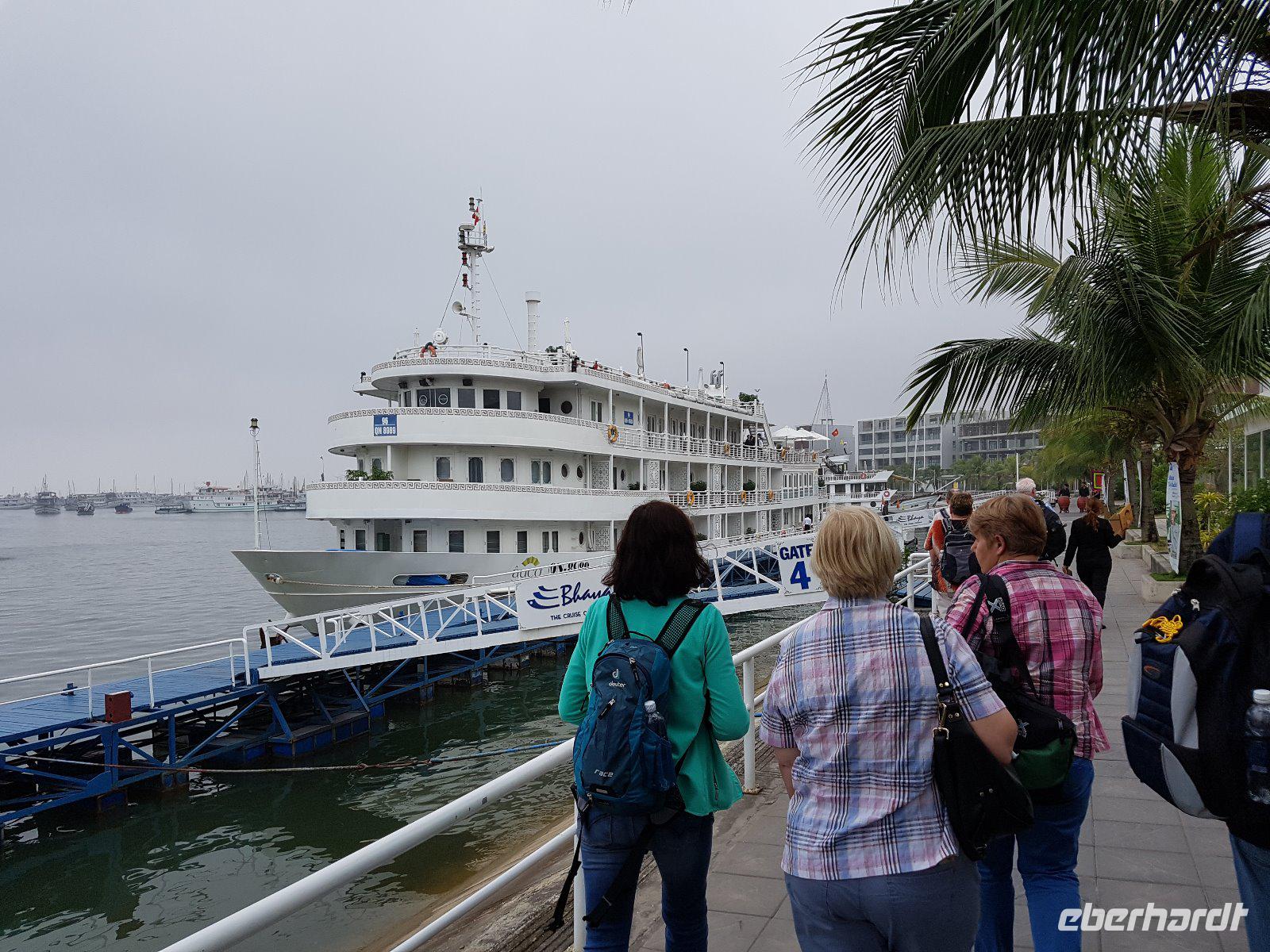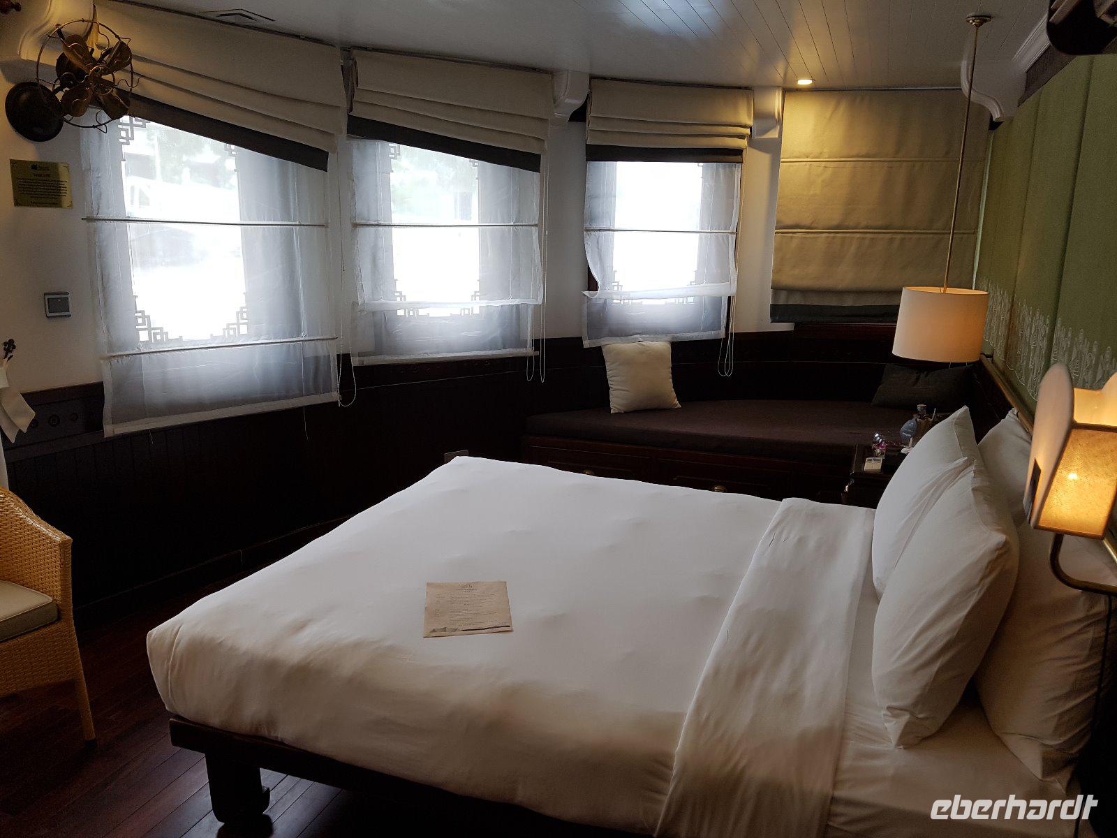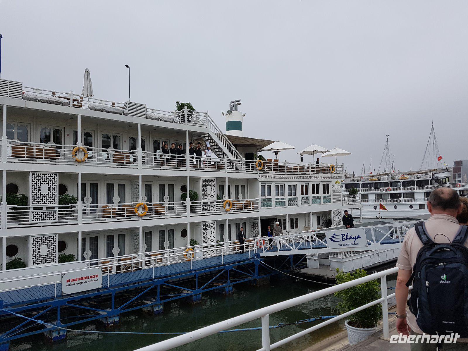 Am Mittag gehen wir an Bord unseres schwimmenden Hotels - einer Dschunke. Alt ist dort nur die Bezeichnung; die „Auco2" besticht mit edel ausgestatteten und geräumigen Kabinen.