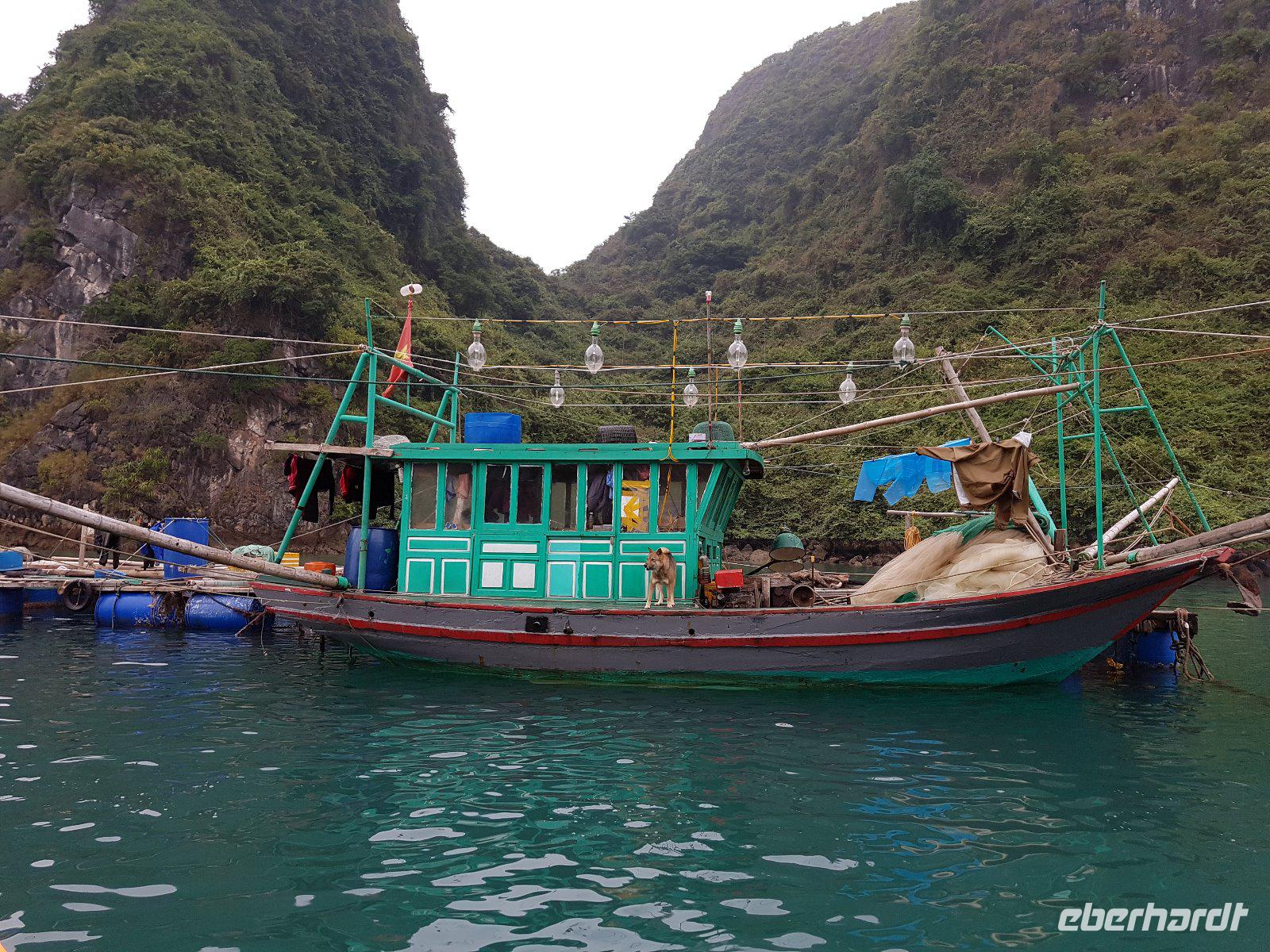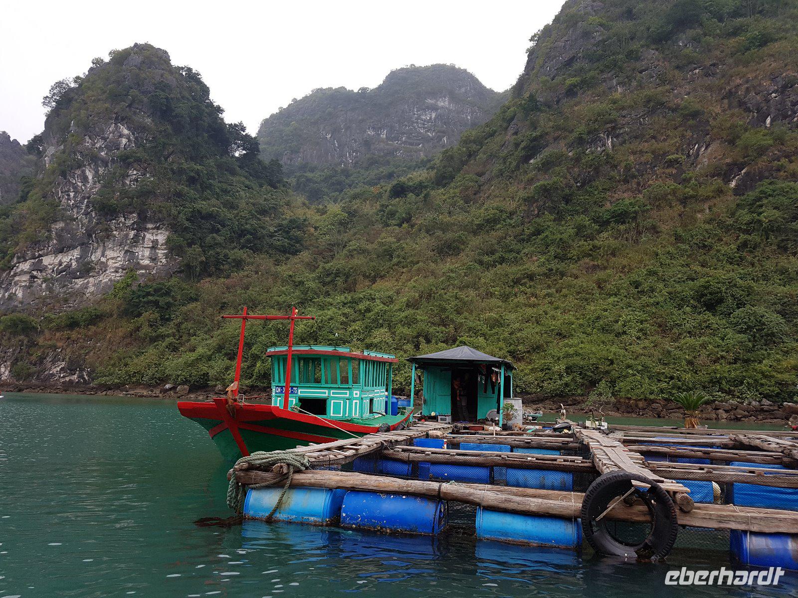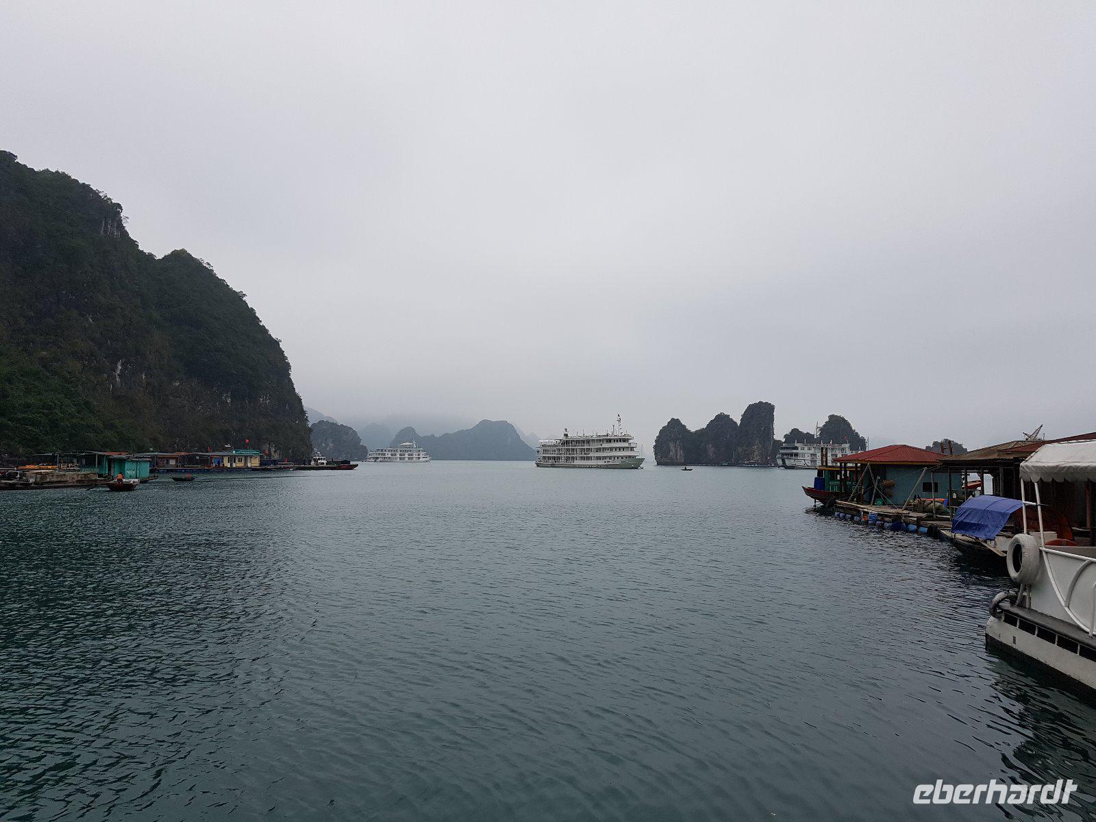 Als diese bezogen sind, heißt es Leinen los, und wir genießen ein fantastisches Meeresfrüchteessen. Am Nachmittag bringen uns die Begleitboote zum schwimmenden Fischerdorf Vung Vieng, welches wir nach erneuten Umstieg in Ruderboote sowohl vom Wasser aus besichtigen, als auch bei einem Ausstieg noch mehr über die Arbeit der Fischer erfahren. Am Abend ankert die Dschunke in einer ruhigen Bucht gerahmt von pittoresken Felsen.