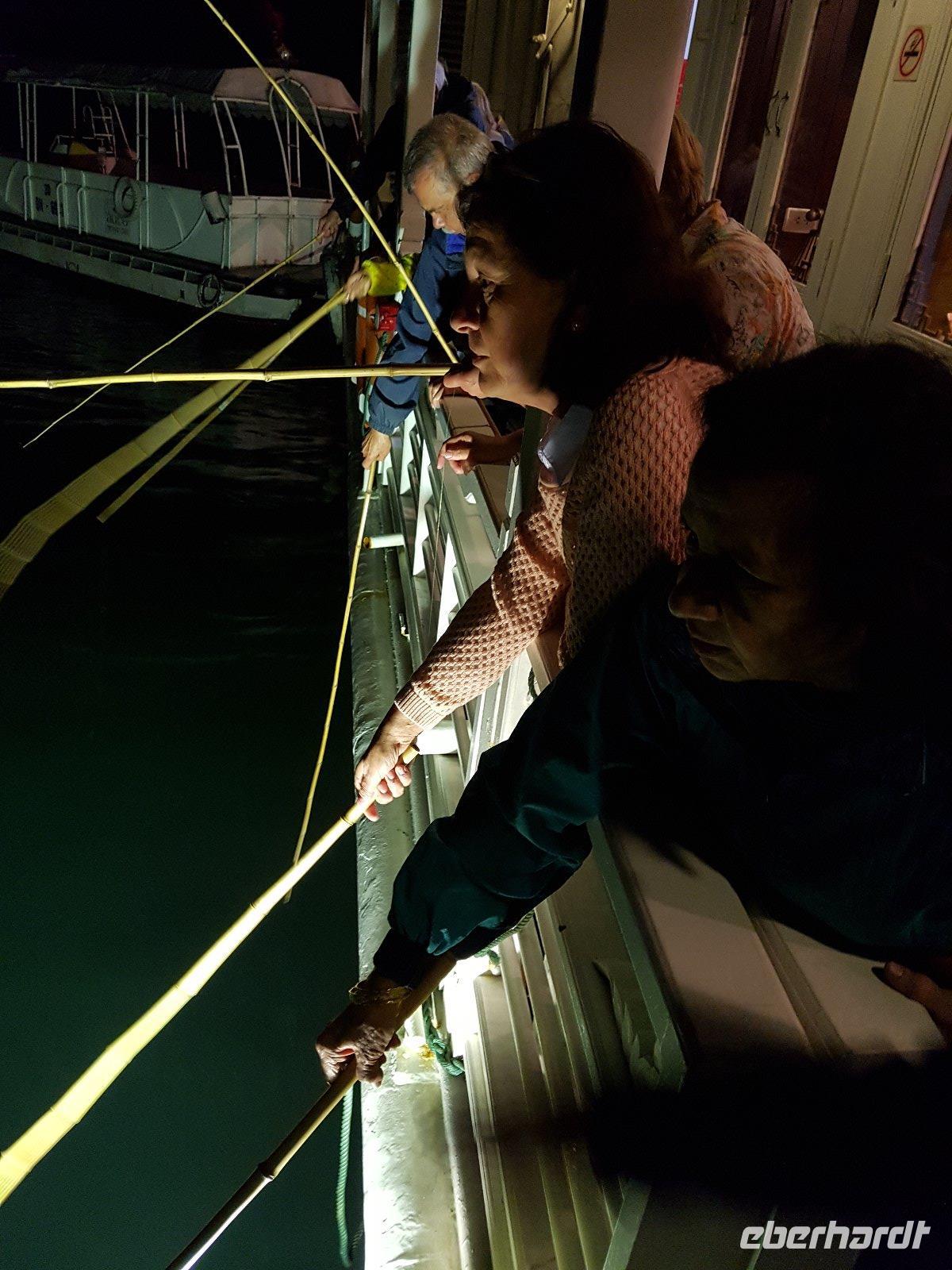 Wir erleben an Bord eine Teezeremonie, ein wiederum üppiges Abendessen und im Anschluss kann man sich sogar beim Nachtfischen versuchen.