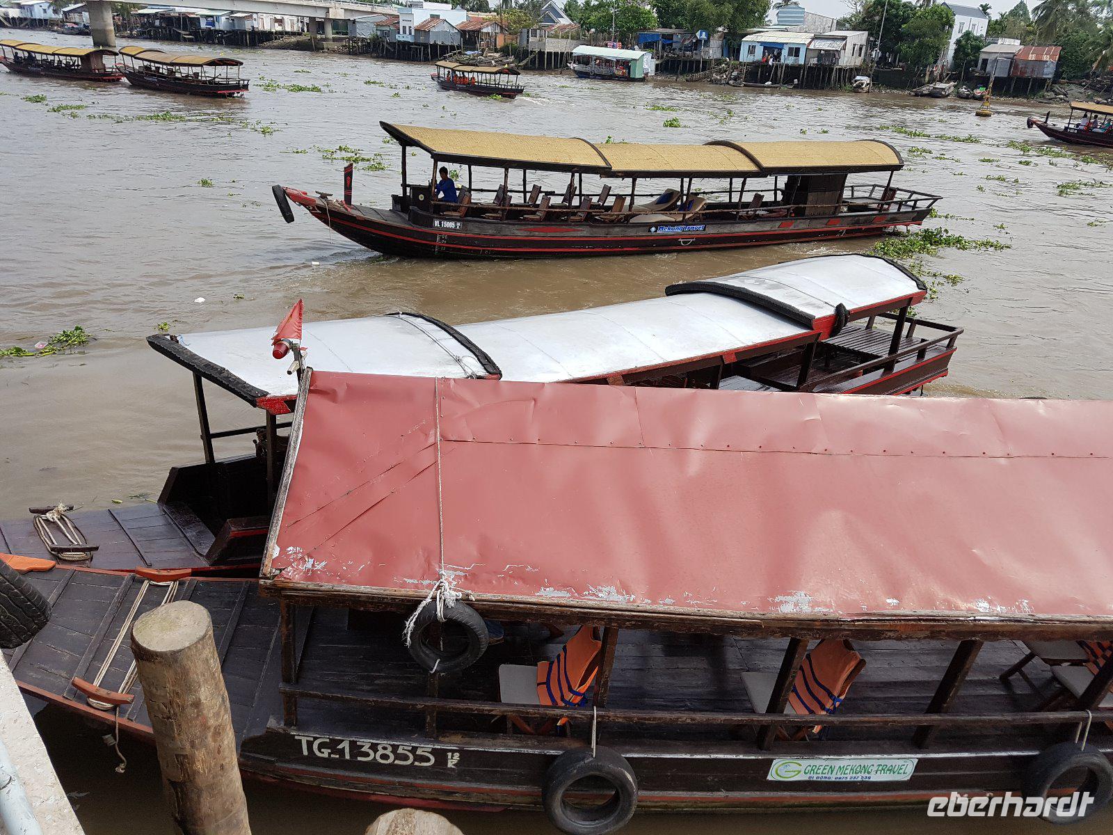 Auf kleinen Sampans, den traditionellen Holzruderbooten, passieren wir dann schmale, mit Palmen gesäumte Flussarme bevor uns nach erneutem Umsetzen das Motorboot zum Ende der Tour nach Vinh Long bringt.